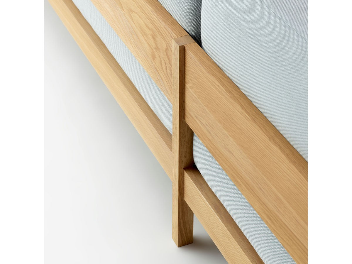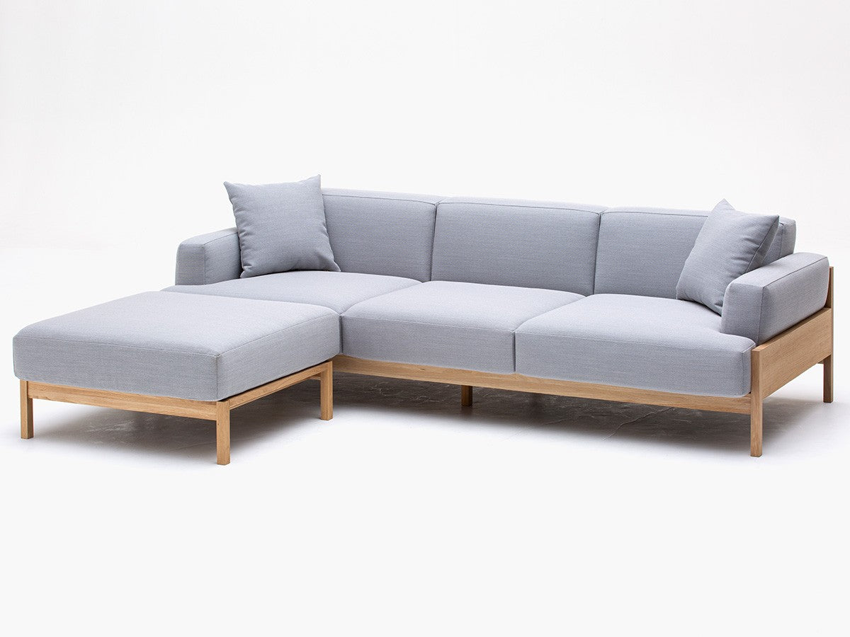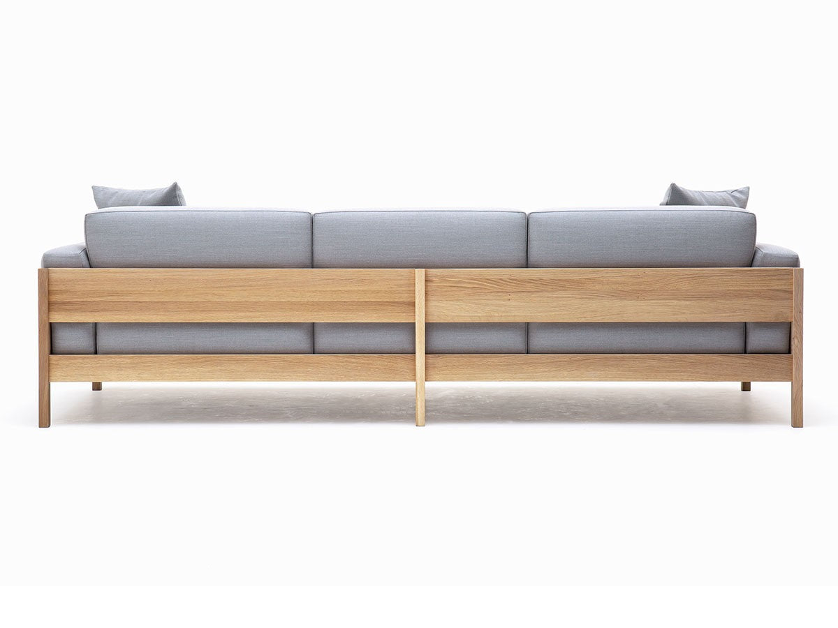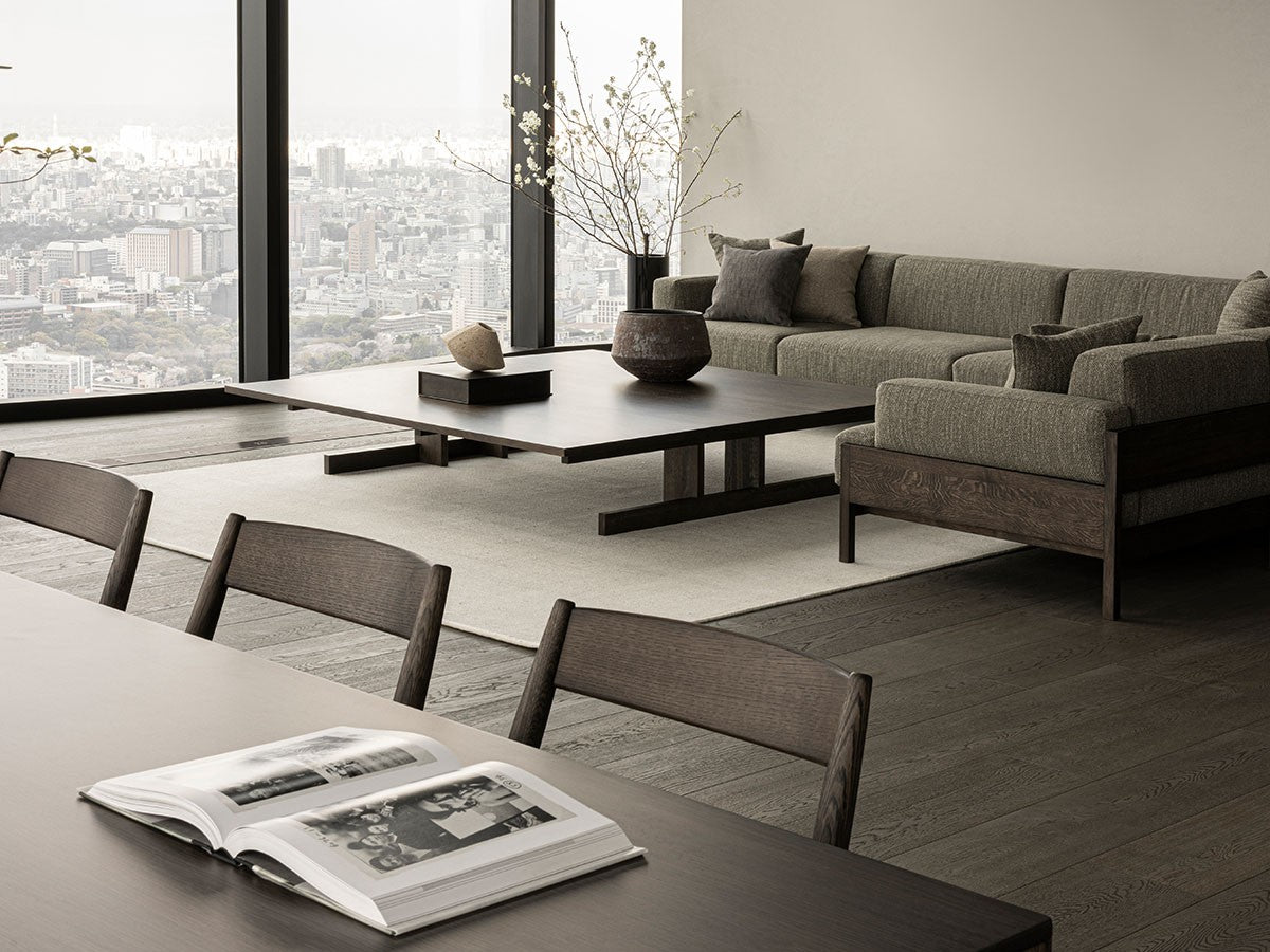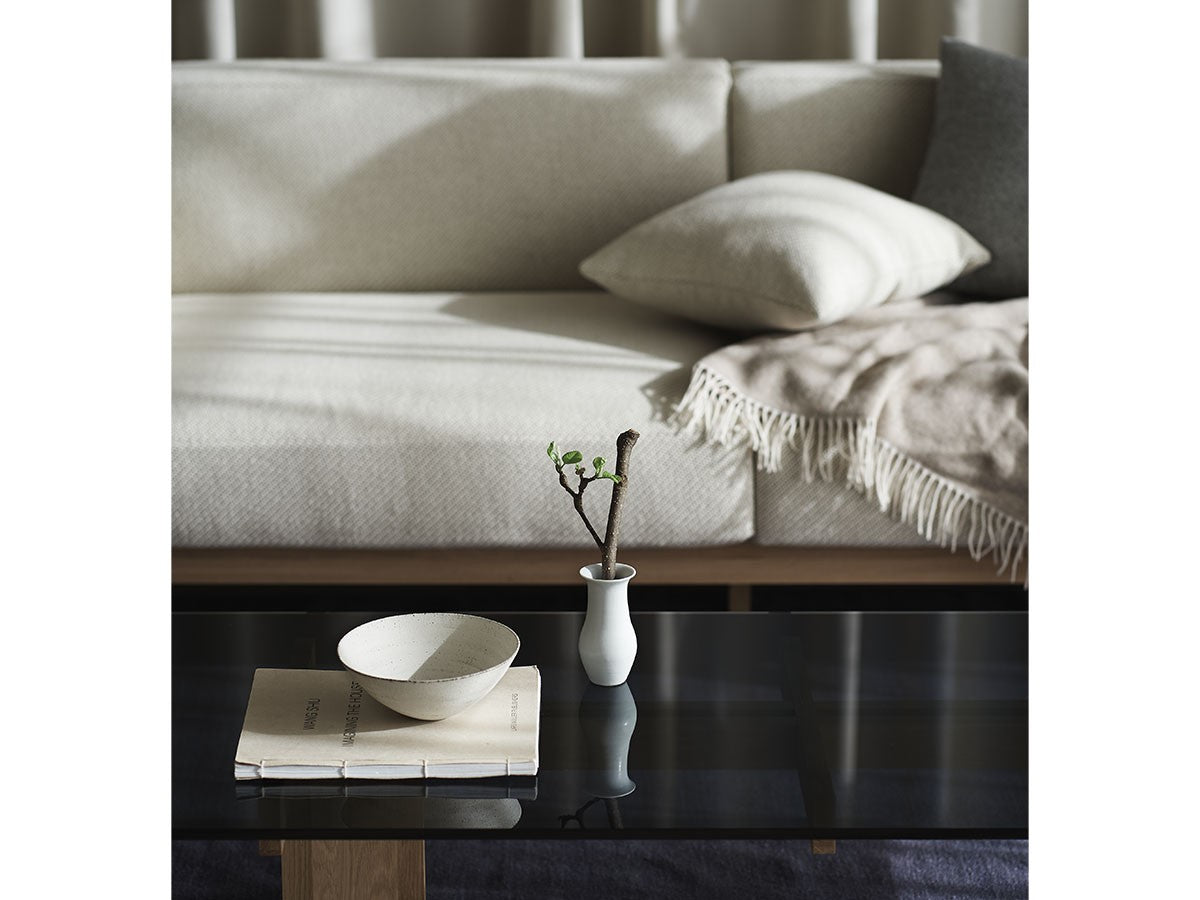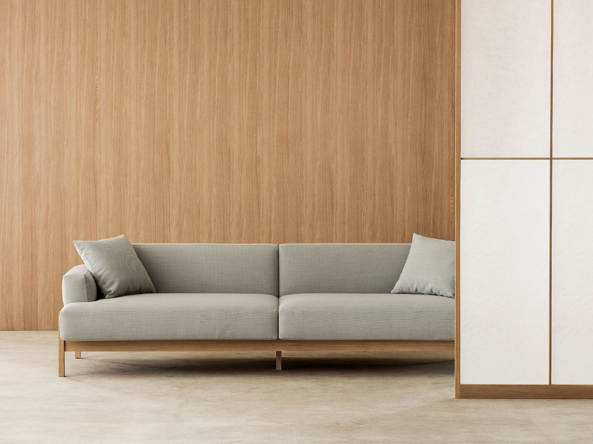 日本建築に見られる水平と垂直のラインをデザインに活かしたロー&ワイドソファ。テーブルと同じ構造をソファにも活用し、彫刻的な美しさとリラックスした雰囲気を持たせています。ハイテクな木工技術と職人の手仕事との融合が水平ラインと垂直ラインの美をより際立たせます。座面クッション下の木桟は積層巾剥集成材を採用し、縦継ぎ目のない美しい素材使いです。高さを空間にあわせて低めに設定しているため、圧迫感を感じさせません。座面は、着座時の感触にもこだわったウレタンフォーム・綿の6層構造。メンテナンスが可能なカバーリング仕様です。アームレストは枕としても使用でき、快適なデイベッドとしても利用できる多機能性を誇ります。