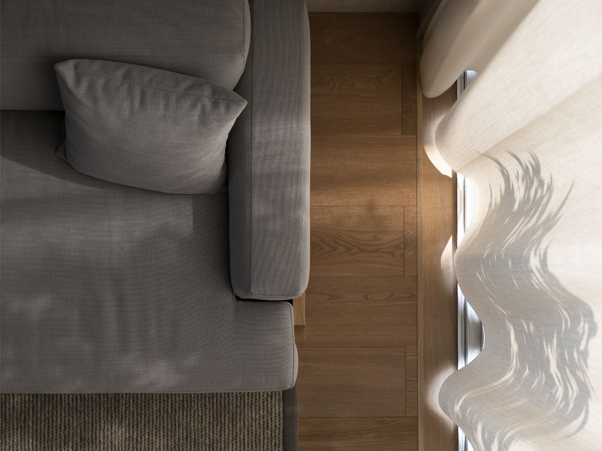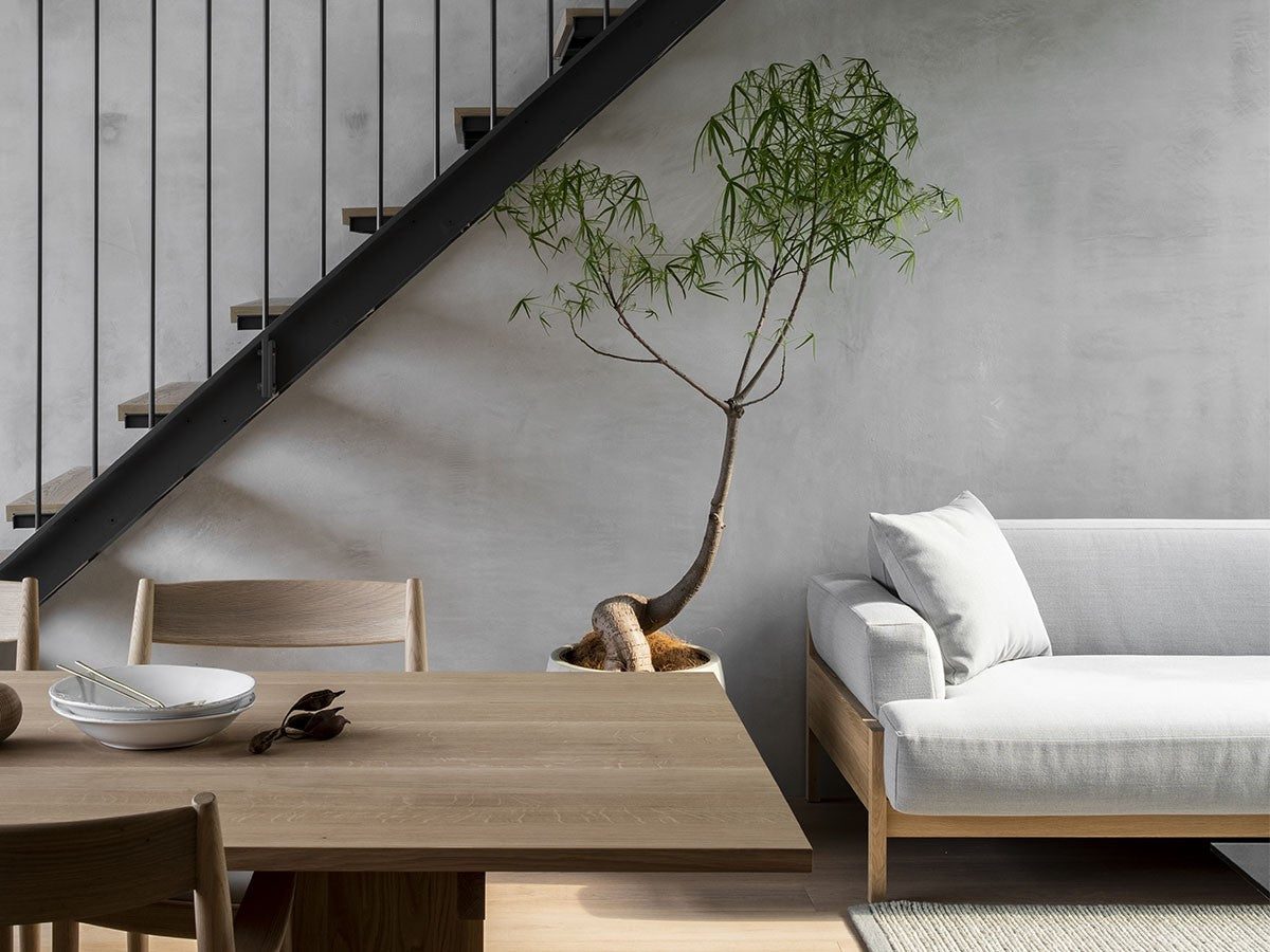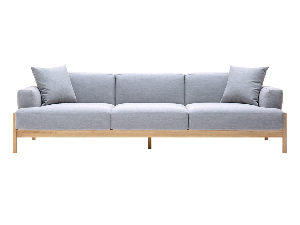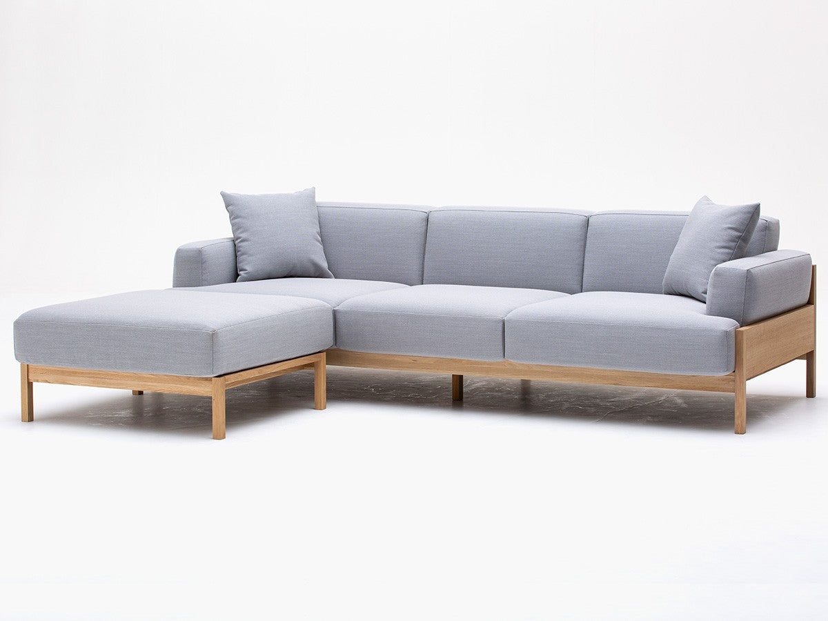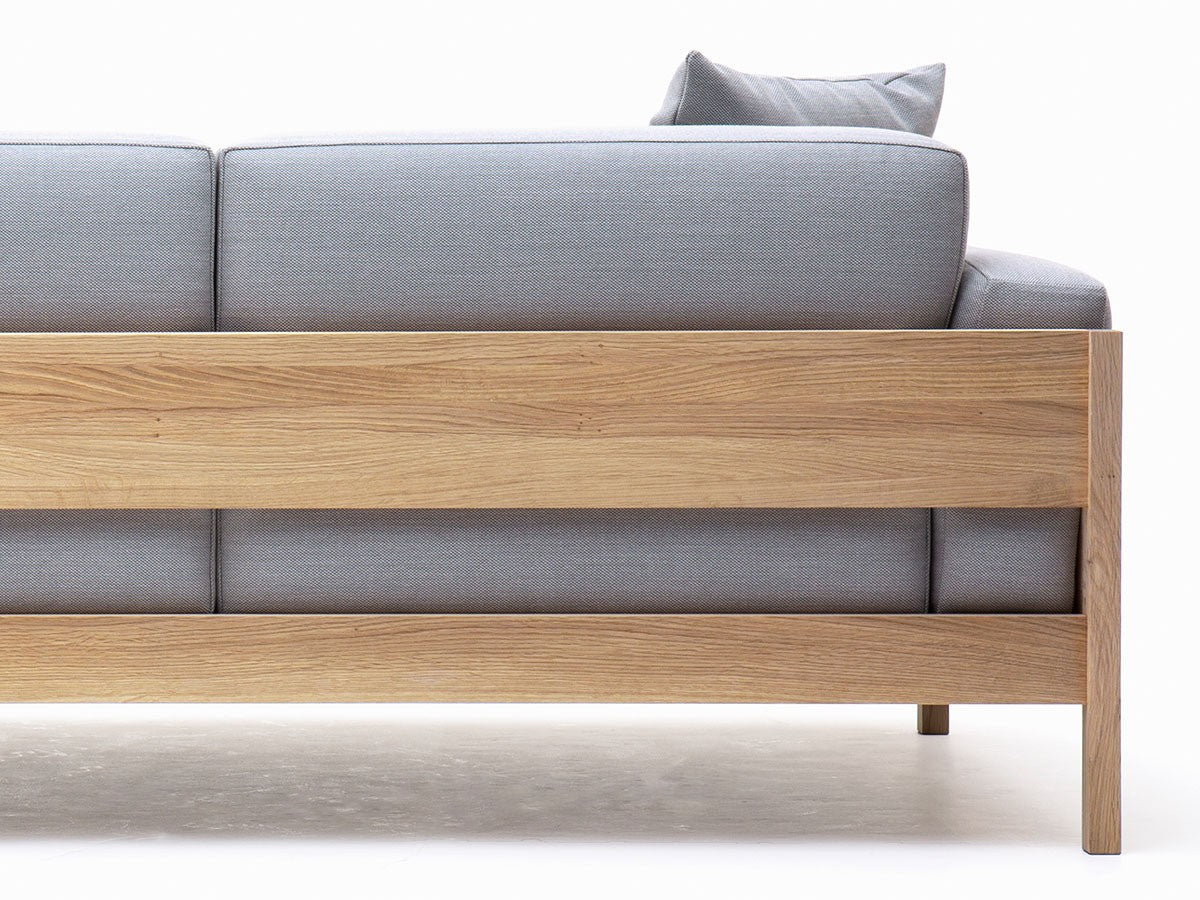 日本建築に見られる水平と垂直のラインをデザインに活かしたロー&ワイドソファ。テーブルと同じ構造をソファにも活用し、彫刻的な美しさとリラックスした雰囲気を持たせています。ハイテクな木工技術と職人の手仕事との融合が水平ラインと垂直ラインの美をより際立たせます。座面クッション下の木桟は積層巾剥集成材を採用し、縦継ぎ目のない美しい素材使いです。高さを空間にあわせて低めに設定しているため、圧迫感を感じさせません。座面は、着座時の感触にもこだわったウレタンフォーム・綿の6層構造。メンテナンスが可能なカバーリング仕様です。アームレストは枕としても使用でき、快適なデイベッドとしても利用できる多機能性を誇ります。