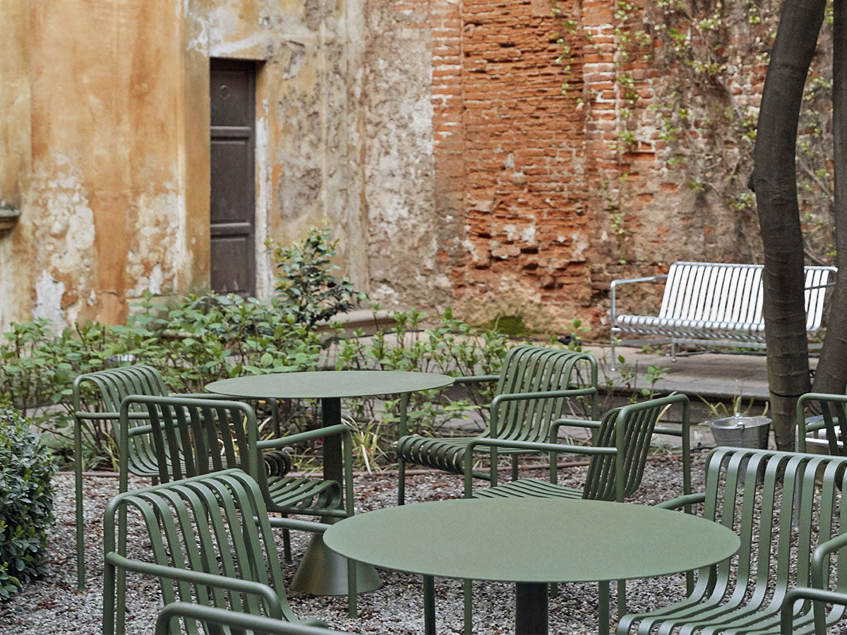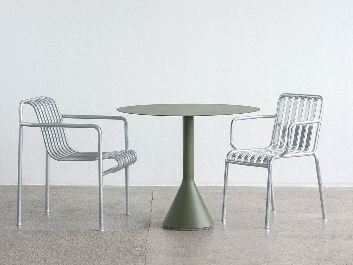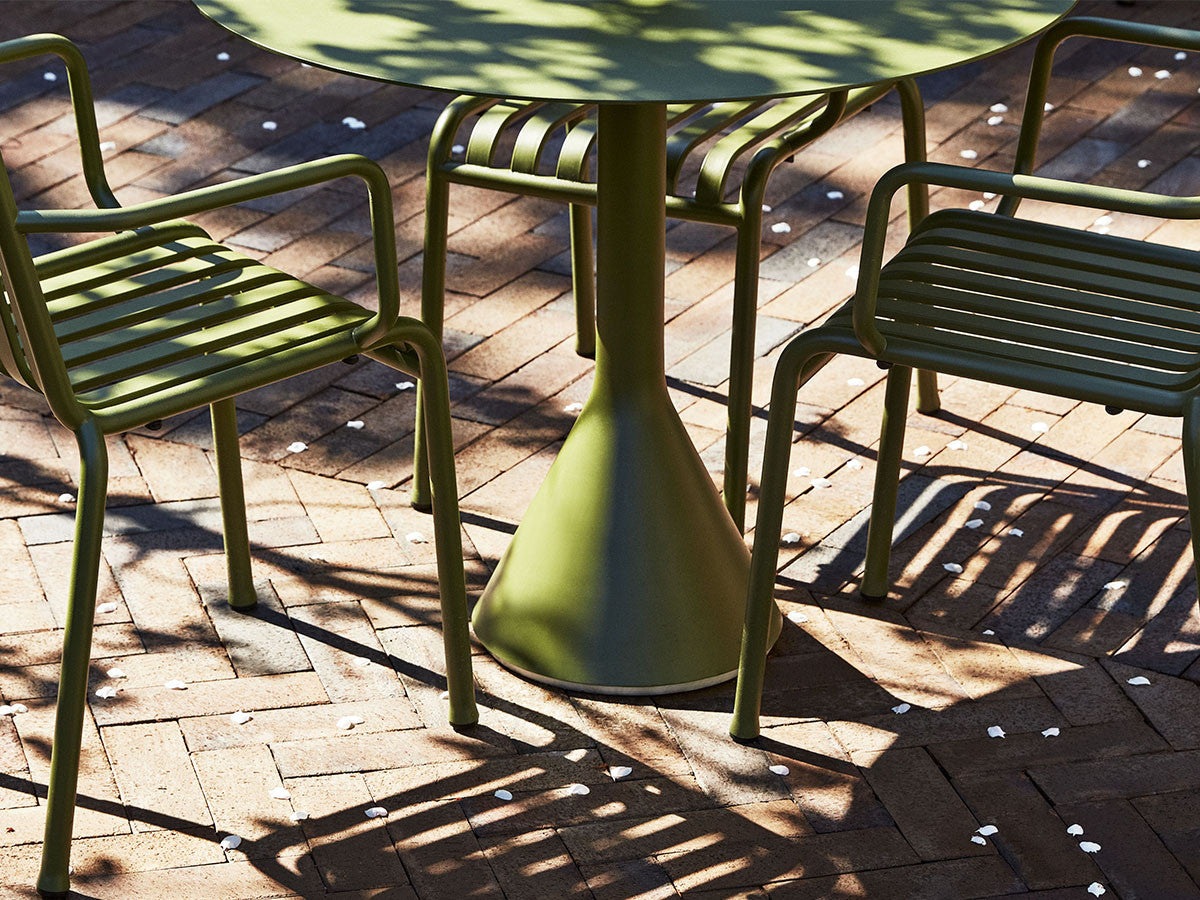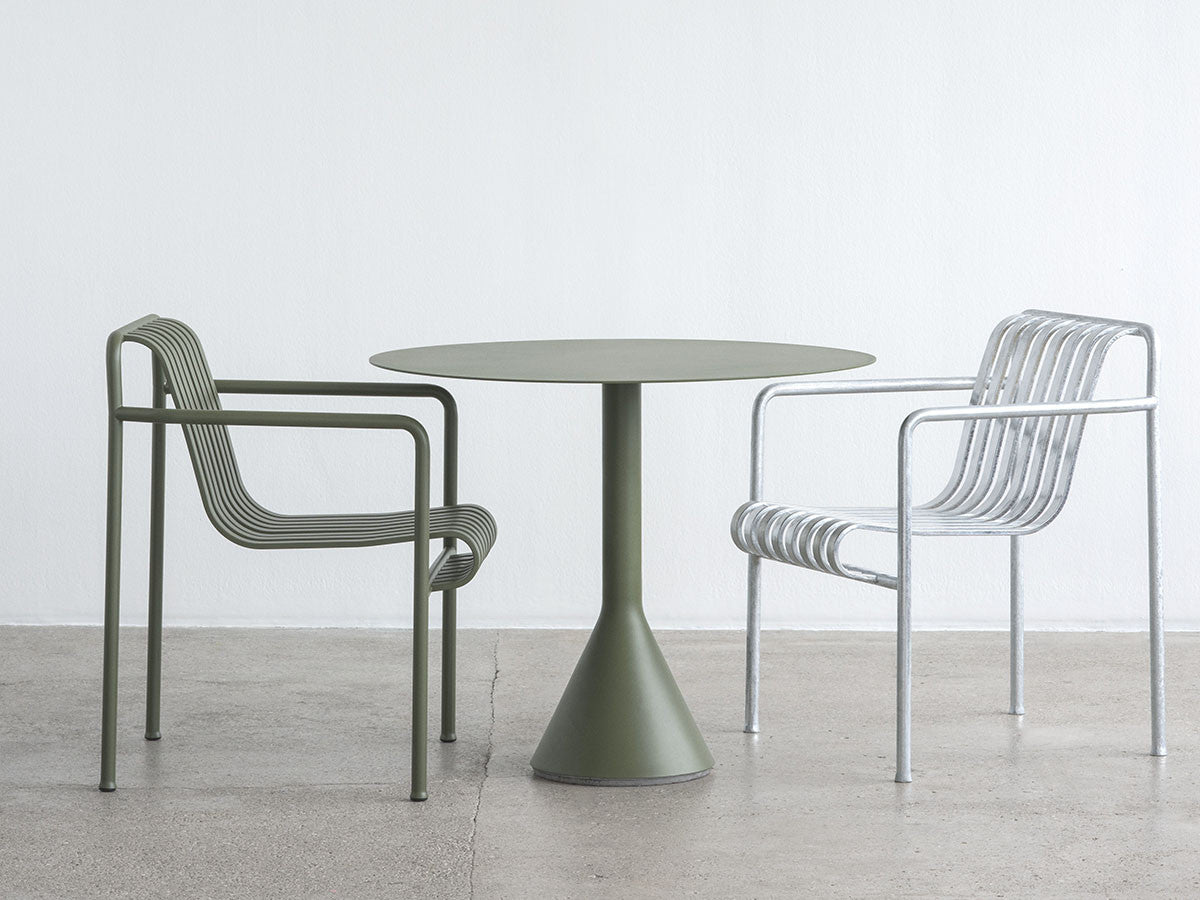 フランス出身の世界的デザインデュオ、Ronan & Erwan Bouroullec(ブルレック兄弟)による、アウトドアファニチャーコレクション「PALISSADE」のカフェテーブル。頑丈なベースと薄型の天板のグラフィカルなデザインは、コレクションの特徴でもあるエレガントな印象を保ちながらも、高い強度、コンパクトさ、安定感を兼ね備えています。屋外使用向けに、耐久性と弾力性に優れた粉体塗装スチールを特別に設計。さらに、劣化を防ぐために屋外用の塗装で仕上げています。コンクリートの土台が備わっているため、天候の影響を受けやすい屋外でも安定感を損ないません。ご家庭のテラスやバルコニーはもちろんのこと、カフェやレストラン、公共施設など、あらゆる空間に溶け込むデザインとなっています。