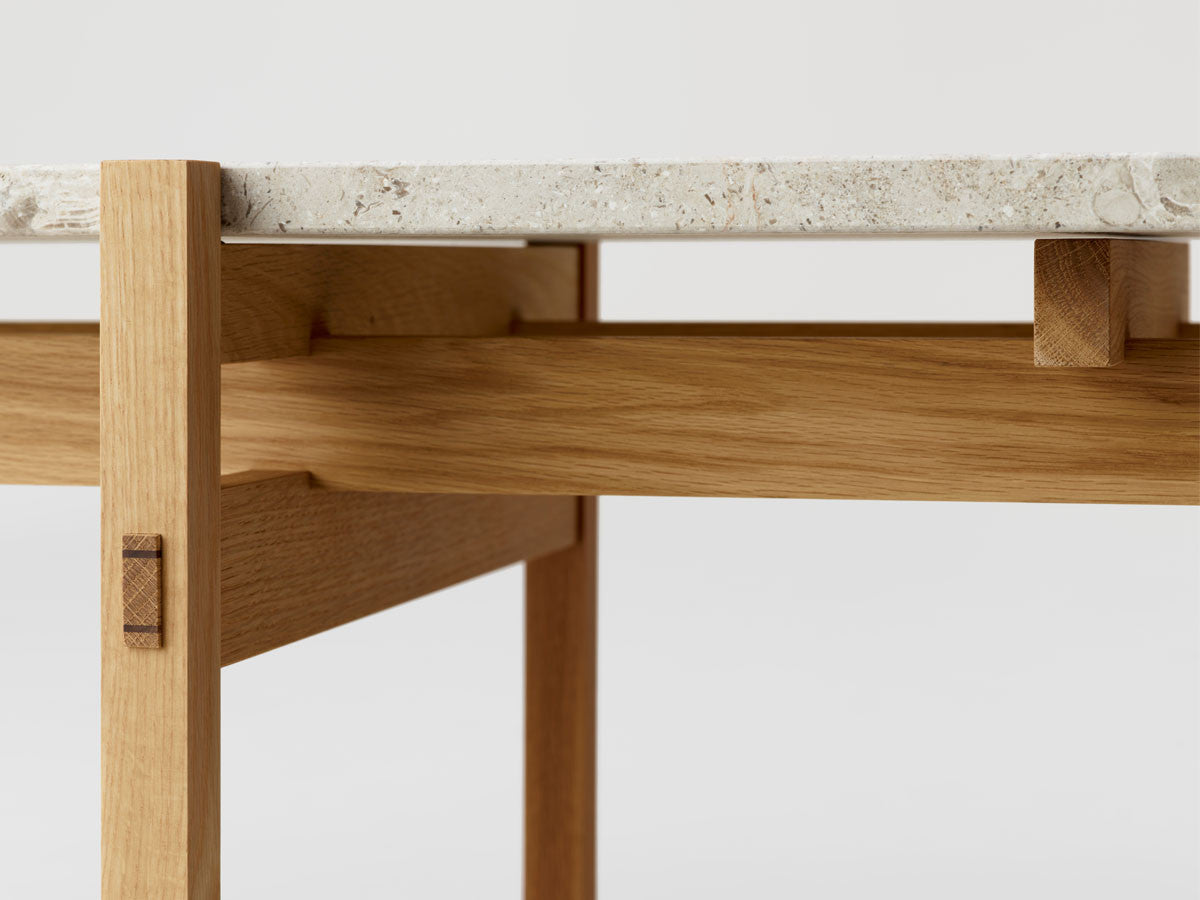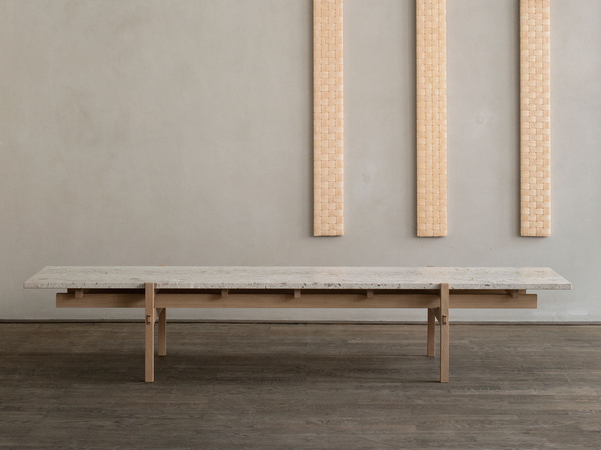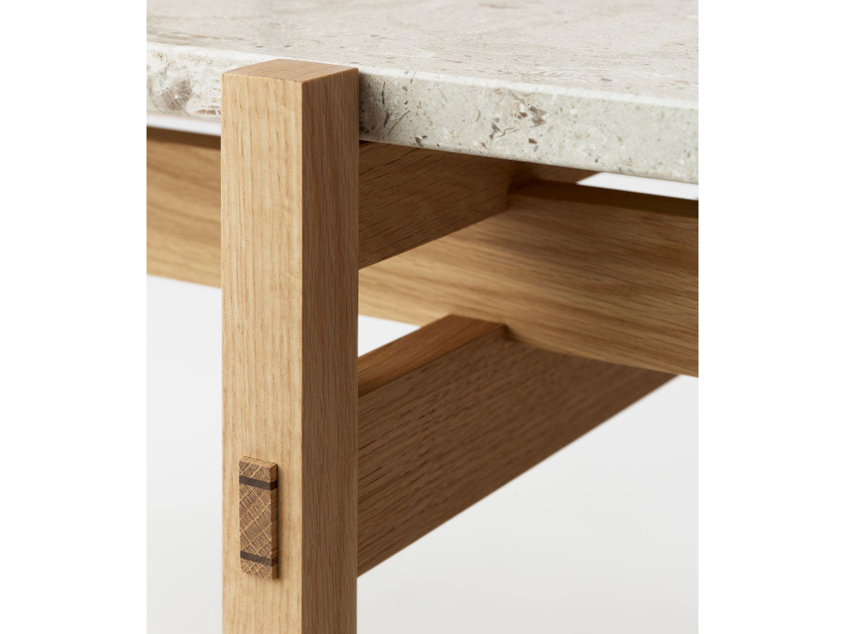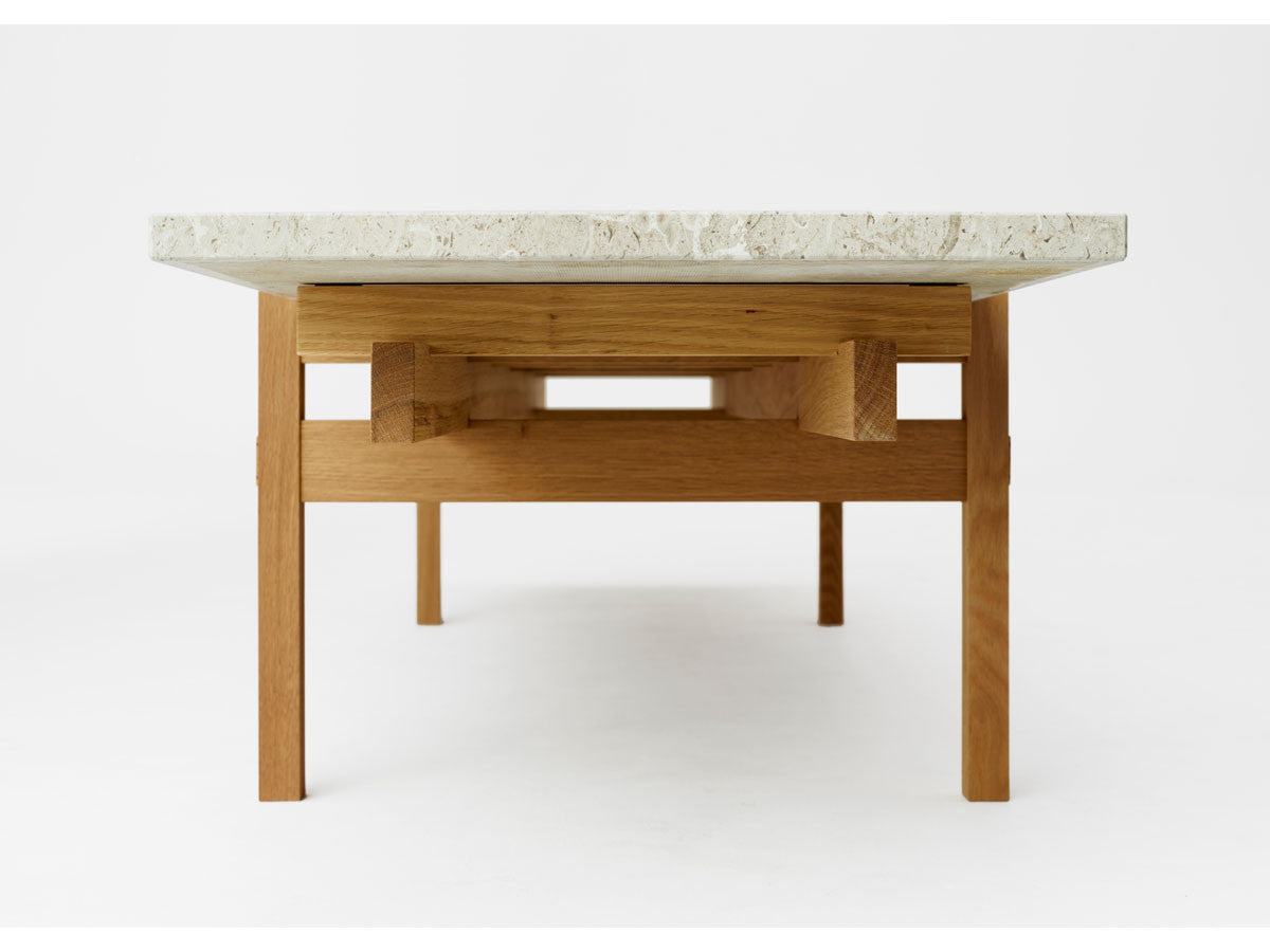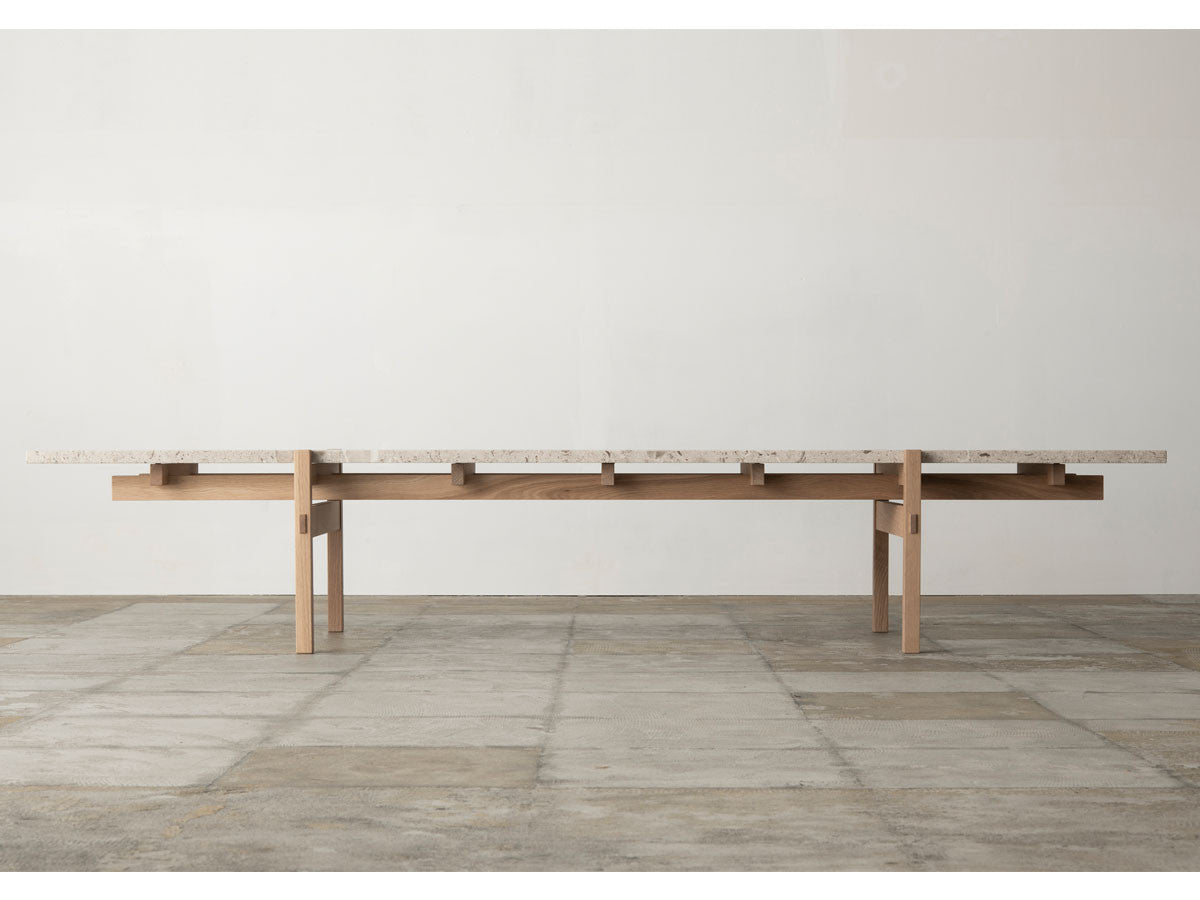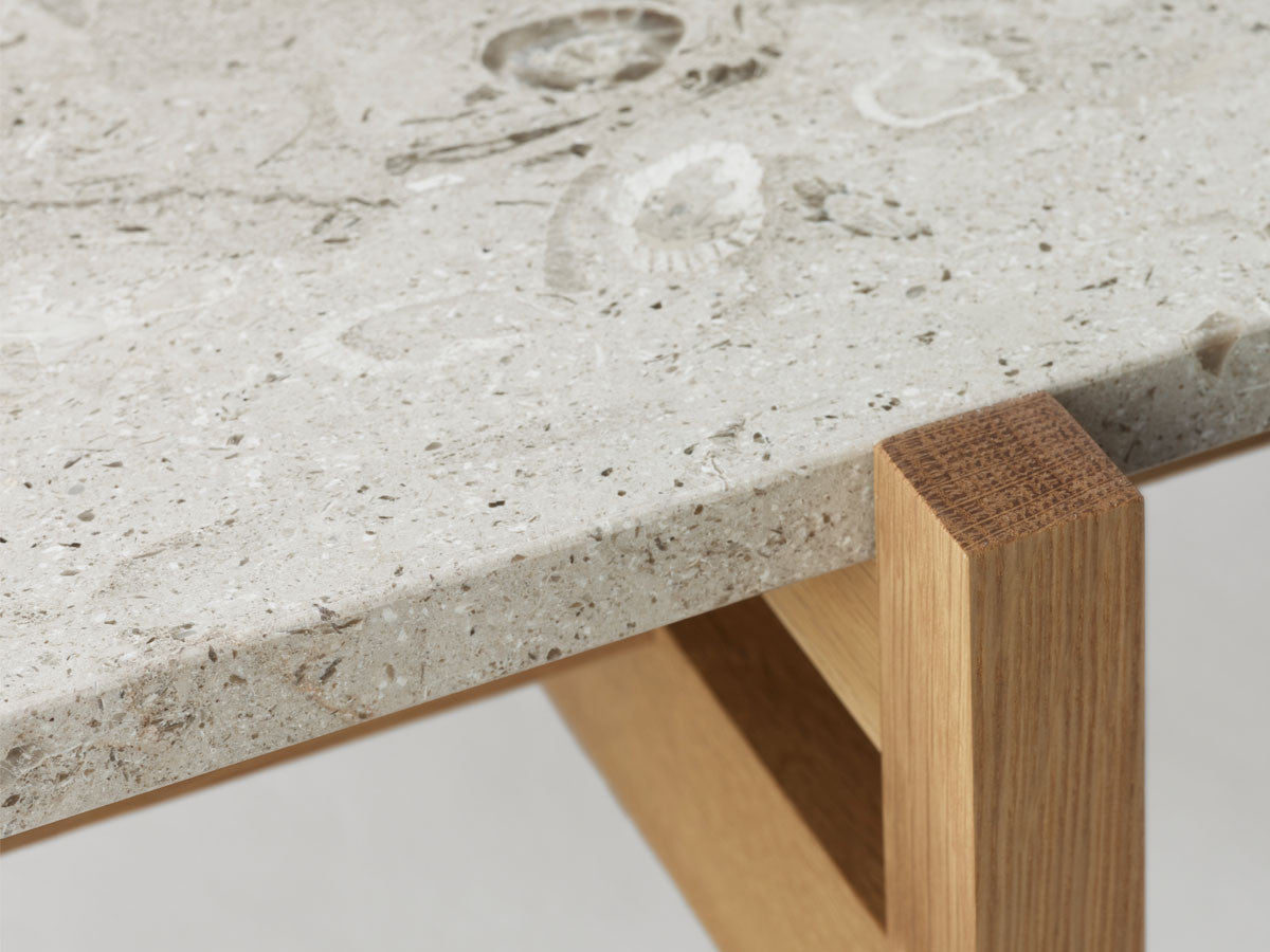 寺社仏閣や伝統的な建築に見られる多くのファサードや戸口を基にした構造が特徴的なローテーブル。緻密に組み合わされた複数の木製のパーツが、平行を保ちながらも、意図的に空間を生み出し、外観にある種の軽さを与えています。様々な要素の間に差し込む光が、有機的で生き生きとした表情を添えます。ストーントップは、デンマークの有名デザイナー、ポール・ケアホルムによるミニマリズム・デザインを参照しています。寺院など日本の伝統建築にみられる門や戸からイメージされた脚部は、限界まで細いパーツで構成されています。脚の木製パーツはそれぞれ隙間をあけることで光の通り道をつくり、床に映し出される影が、時間と共に空間に変化をつくり出します。組立金具を表面に露出させない日本の伝統的な建築技法を取り入れることで、美しさにこだわるとともに、重量のある大理石を支えるための高い強度を両立させました。天板はイタリア産の天然大理石。堆積岩を採用することで貝殻化石など様々な模様が生み出す多様なデザイン性が特徴。水磨きのマット仕上げを施し、自然な風合いを保ちながら耐水性を高めています。大理石天板の裏面には飛散防止のメッシュシートを採用。滑り止めのクッションと脚から続く木枠で挟み込み、安全性にも配慮しています。