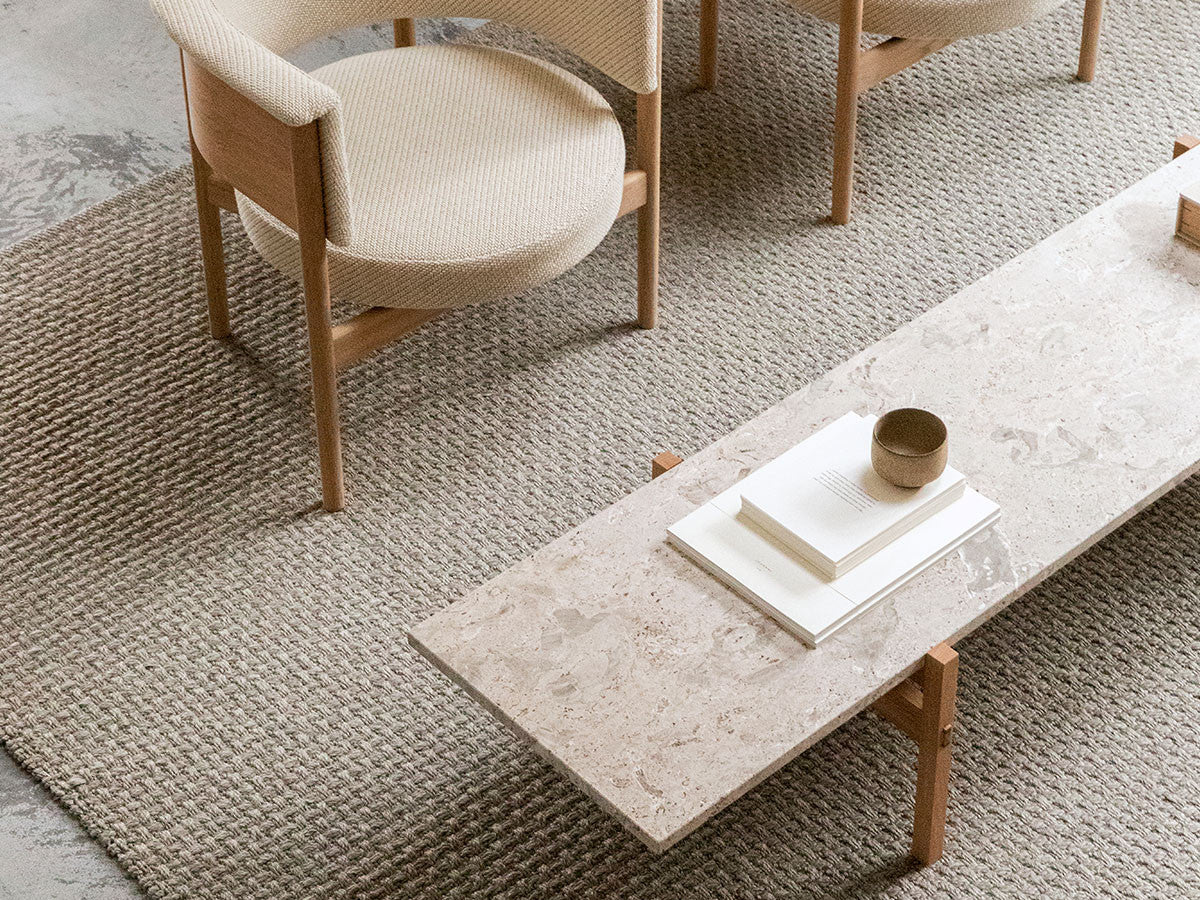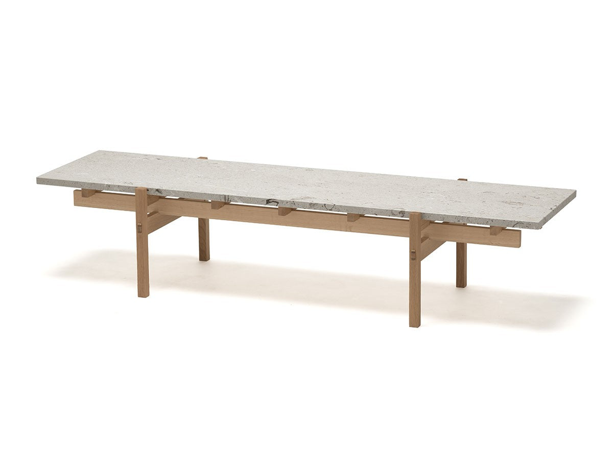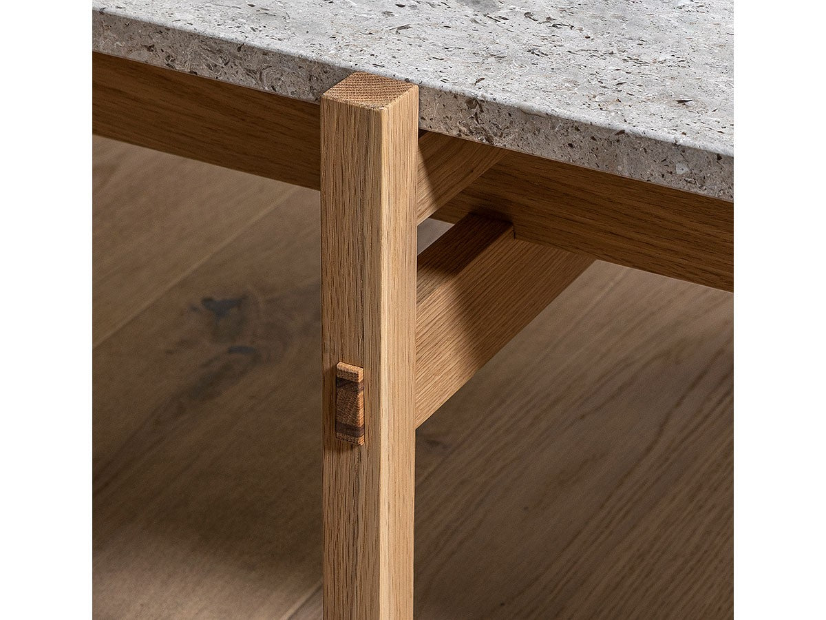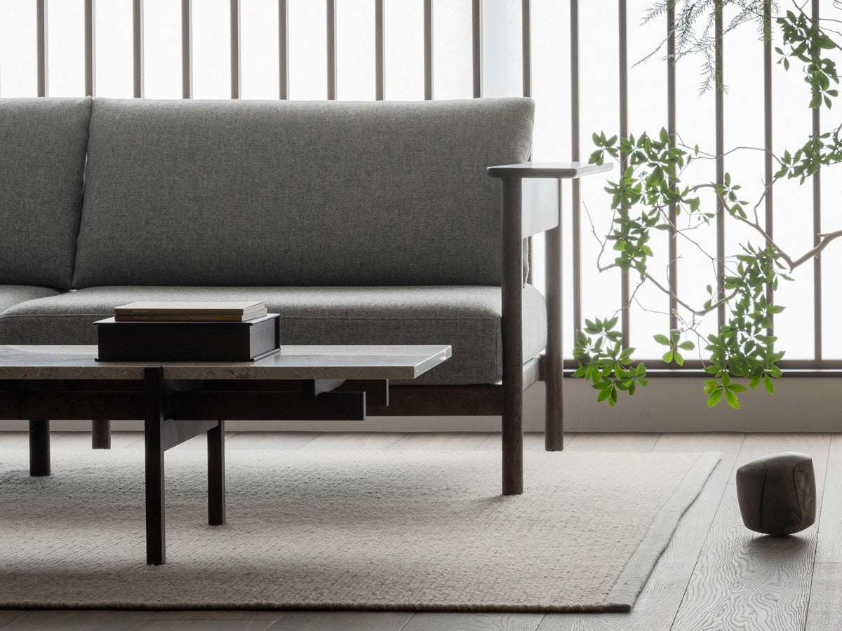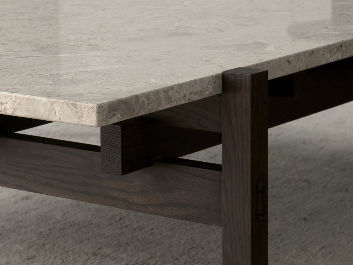 寺社仏閣や伝統的な建築に見られる多くのファサードや戸口を基にした構造が特徴的なローテーブル。緻密に組み合わされた複数の木製のパーツが、平行を保ちながらも、意図的に空間を生み出し、外観にある種の軽さを与えています。様々な要素の間に差し込む光が、有機的で生き生きとした表情を添えます。ストーントップは、デンマークの有名デザイナー、ポール・ケアホルムによるミニマリズム・デザインを参照しています。寺院など日本の伝統建築にみられる門や戸からイメージされた脚部は、限界まで細いパーツで構成されています。脚の木製パーツはそれぞれ隙間をあけることで光の通り道をつくり、床に映し出される影が、時間と共に空間に変化をつくり出します。組立金具を表面に露出させない日本の伝統的な建築技法を取り入れることで、美しさにこだわるとともに、重量のある大理石を支えるための高い強度を両立させました。天板はイタリア産の天然大理石。堆積岩を採用することで貝殻化石など様々な模様が生み出す多様なデザイン性が特徴。水磨きのマット仕上げを施し、自然な風合いを保ちながら耐水性を高めています。大理石天板の裏面には飛散防止のメッシュシートを採用。滑り止めのクッションと脚から続く木枠で挟み込み、安全性にも配慮しています。