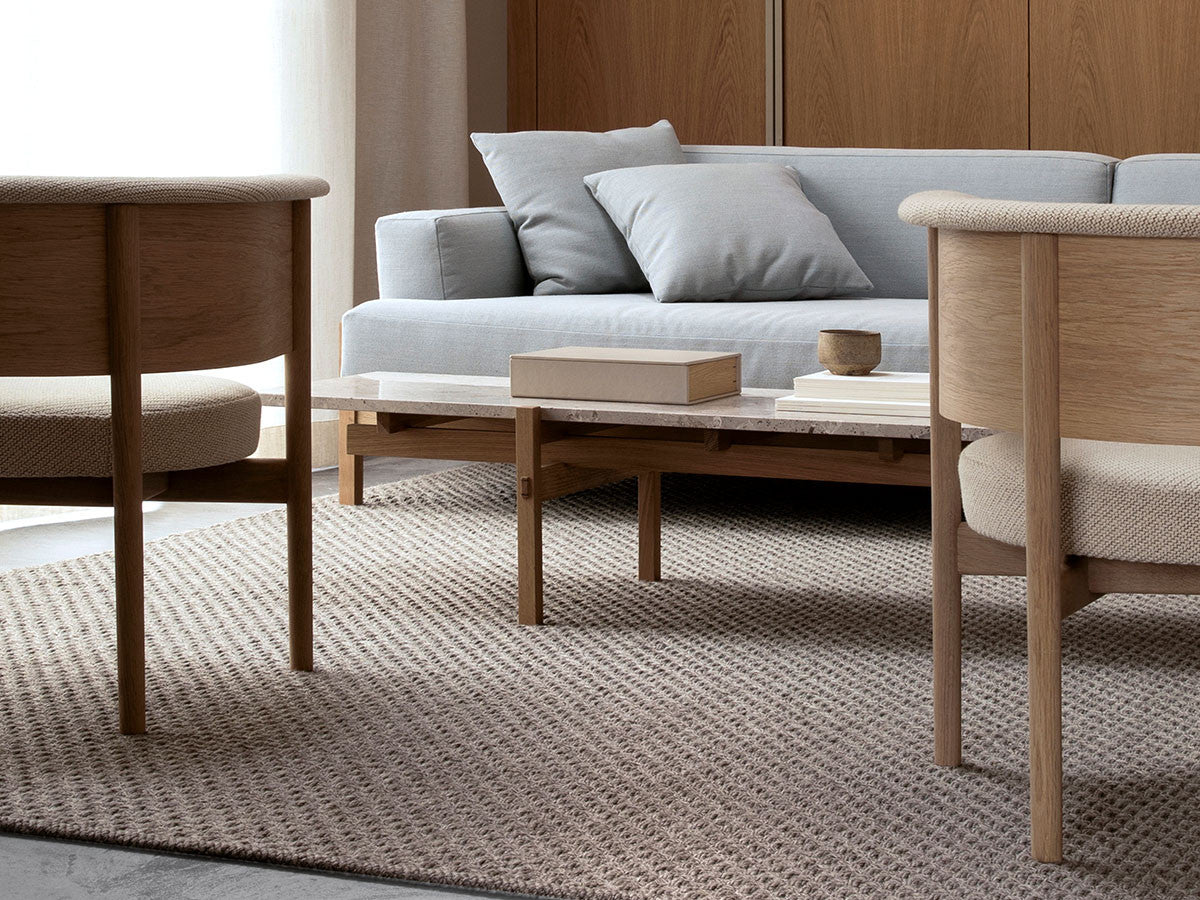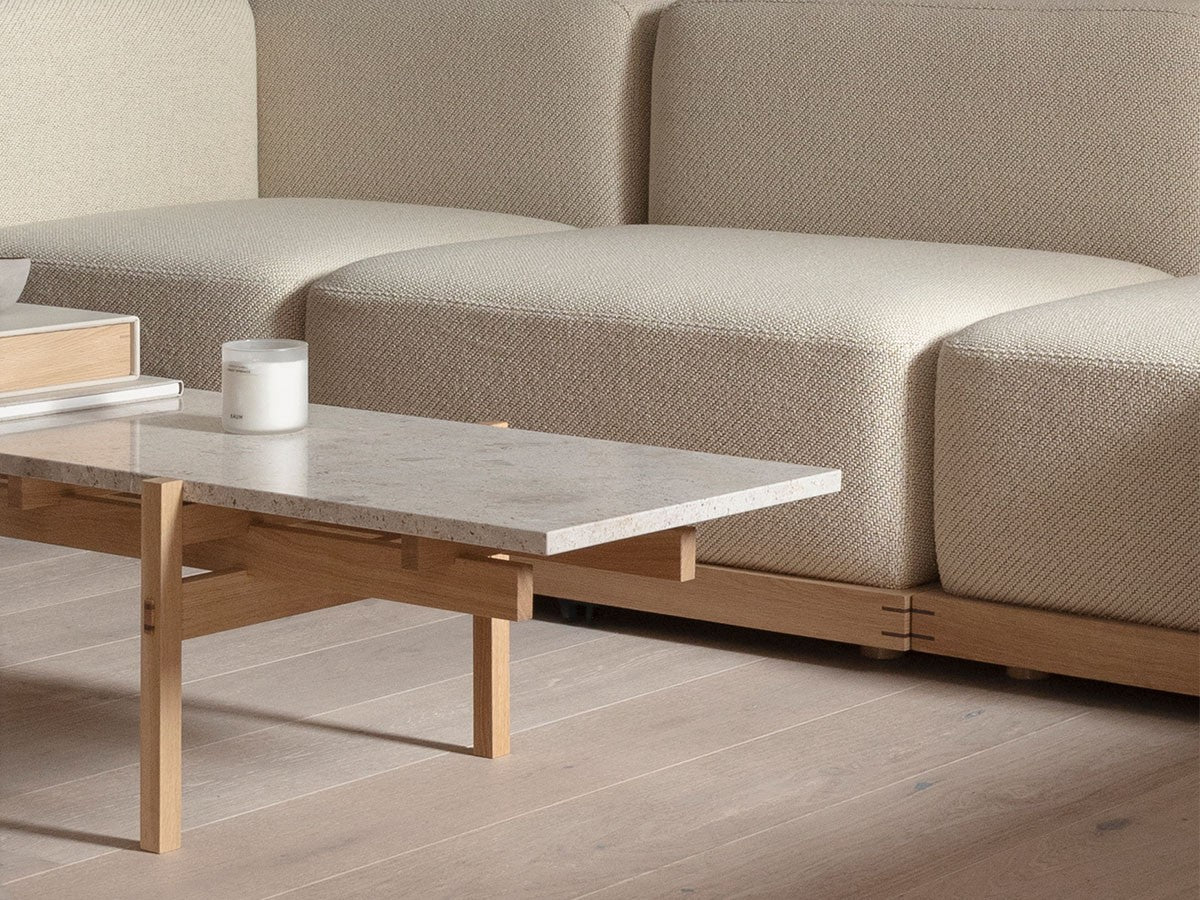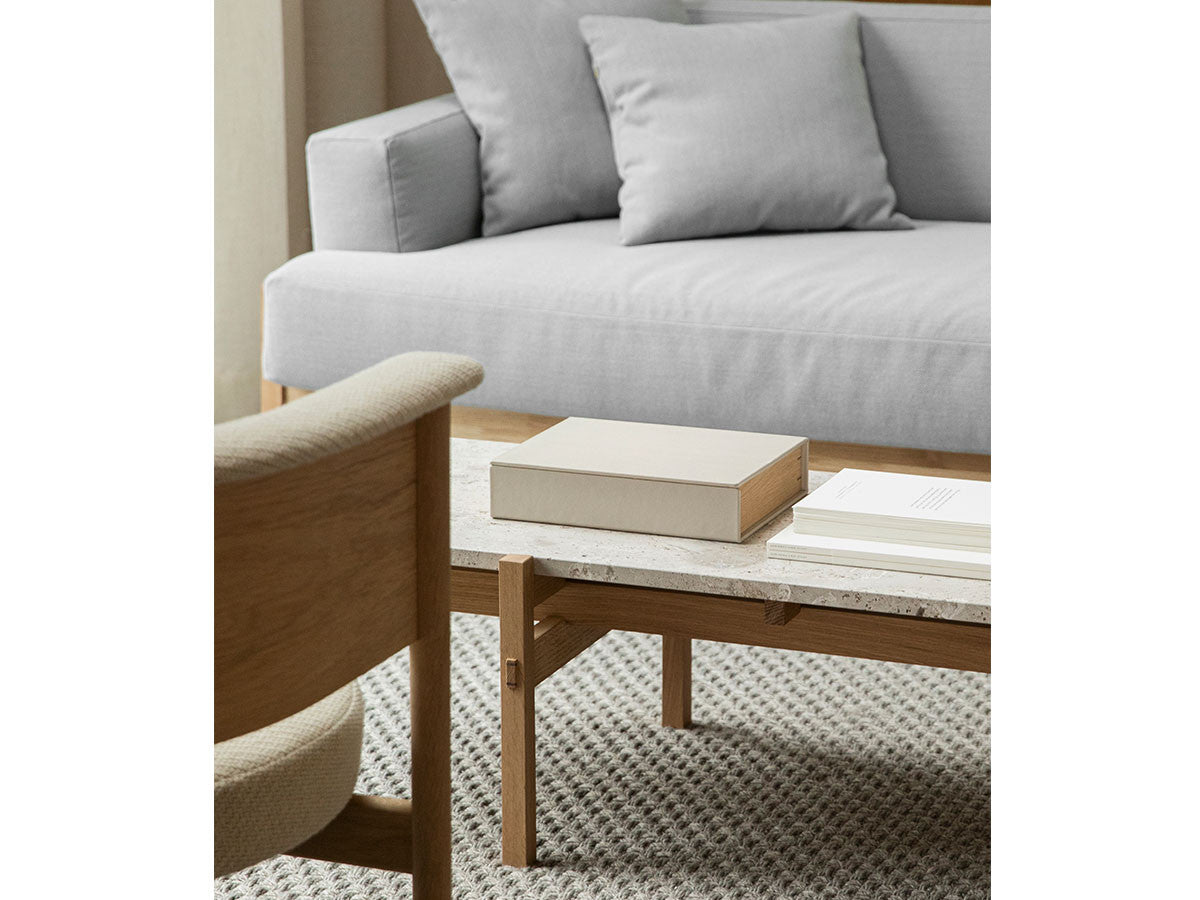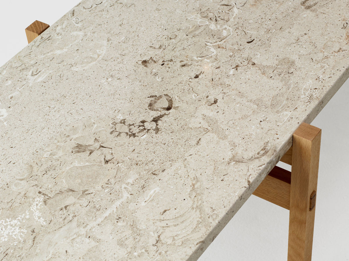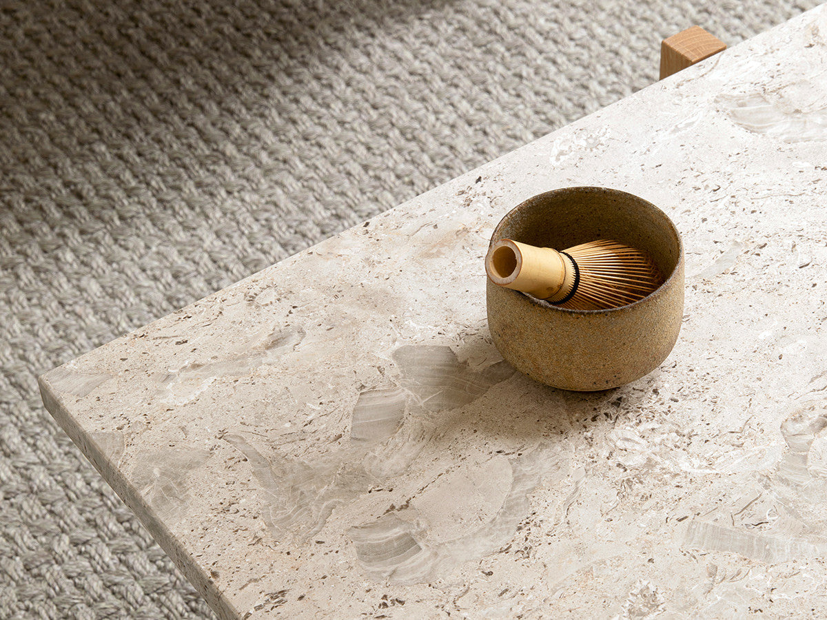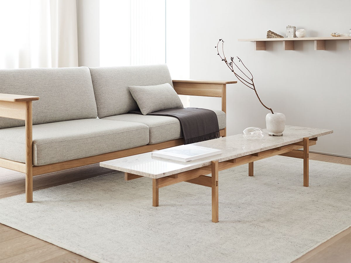 寺社仏閣や伝統的な建築に見られる多くのファサードや戸口を基にした構造が特徴的なローテーブル。緻密に組み合わされた複数の木製のパーツが、平行を保ちながらも、意図的に空間を生み出し、外観にある種の軽さを与えています。様々な要素の間に差し込む光が、有機的で生き生きとした表情を添えます。ストーントップは、デンマークの有名デザイナー、ポール・ケアホルムによるミニマリズム・デザインを参照しています。寺院など日本の伝統建築にみられる門や戸からイメージされた脚部は、限界まで細いパーツで構成されています。脚の木製パーツはそれぞれ隙間をあけることで光の通り道をつくり、床に映し出される影が、時間と共に空間に変化をつくり出します。組立金具を表面に露出させない日本の伝統的な建築技法を取り入れることで、美しさにこだわるとともに、重量のある大理石を支えるための高い強度を両立させました。天板はイタリア産の天然大理石。堆積岩を採用することで貝殻化石など様々な模様が生み出す多様なデザイン性が特徴。水磨きのマット仕上げを施し、自然な風合いを保ちながら耐水性を高めています。大理石天板の裏面には飛散防止のメッシュシートを採用。滑り止めのクッションと脚から続く木枠で挟み込み、安全性にも配慮しています。