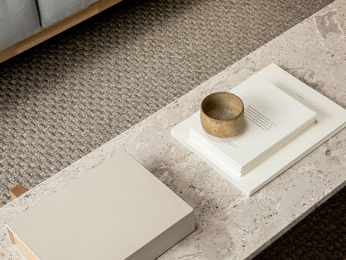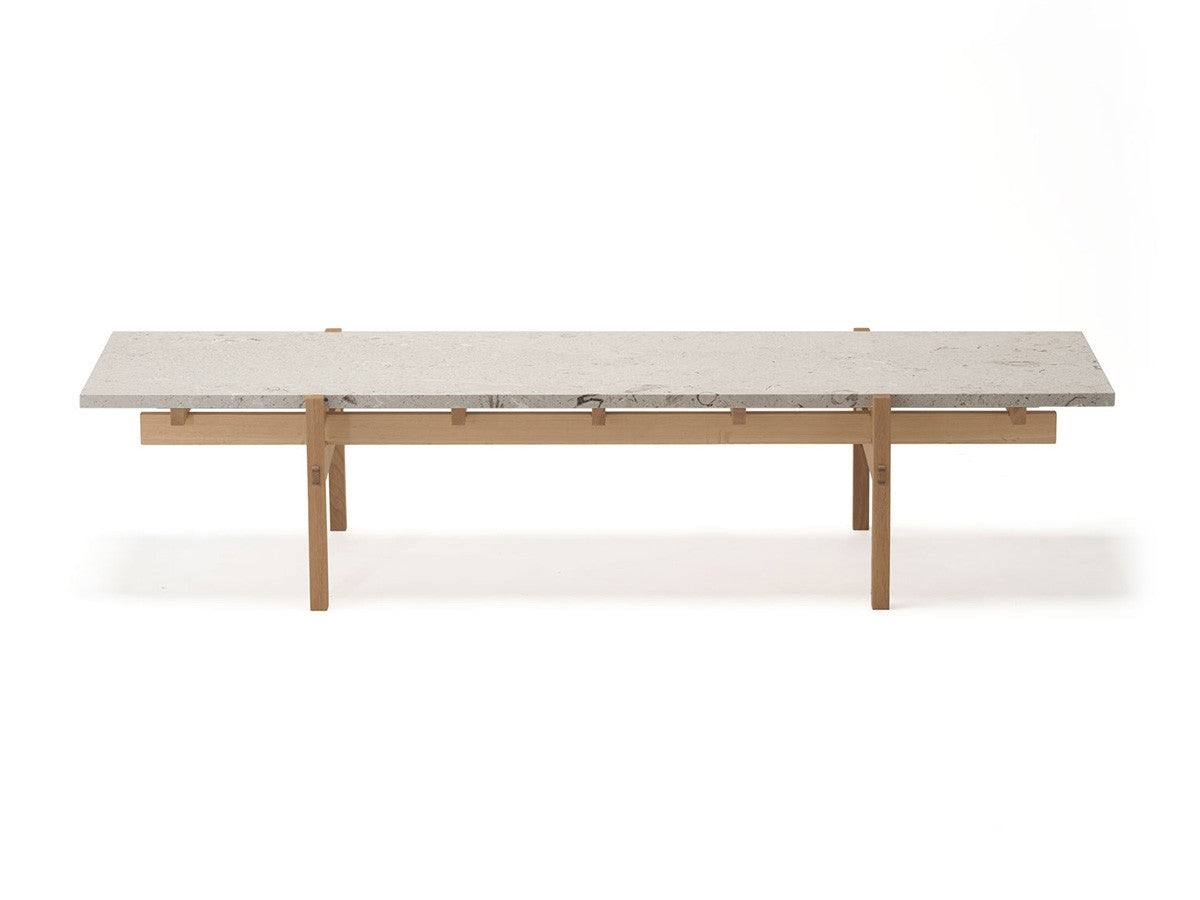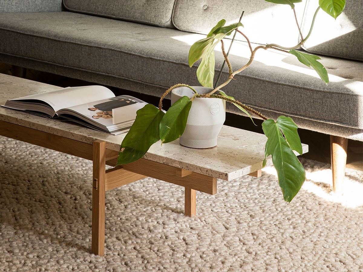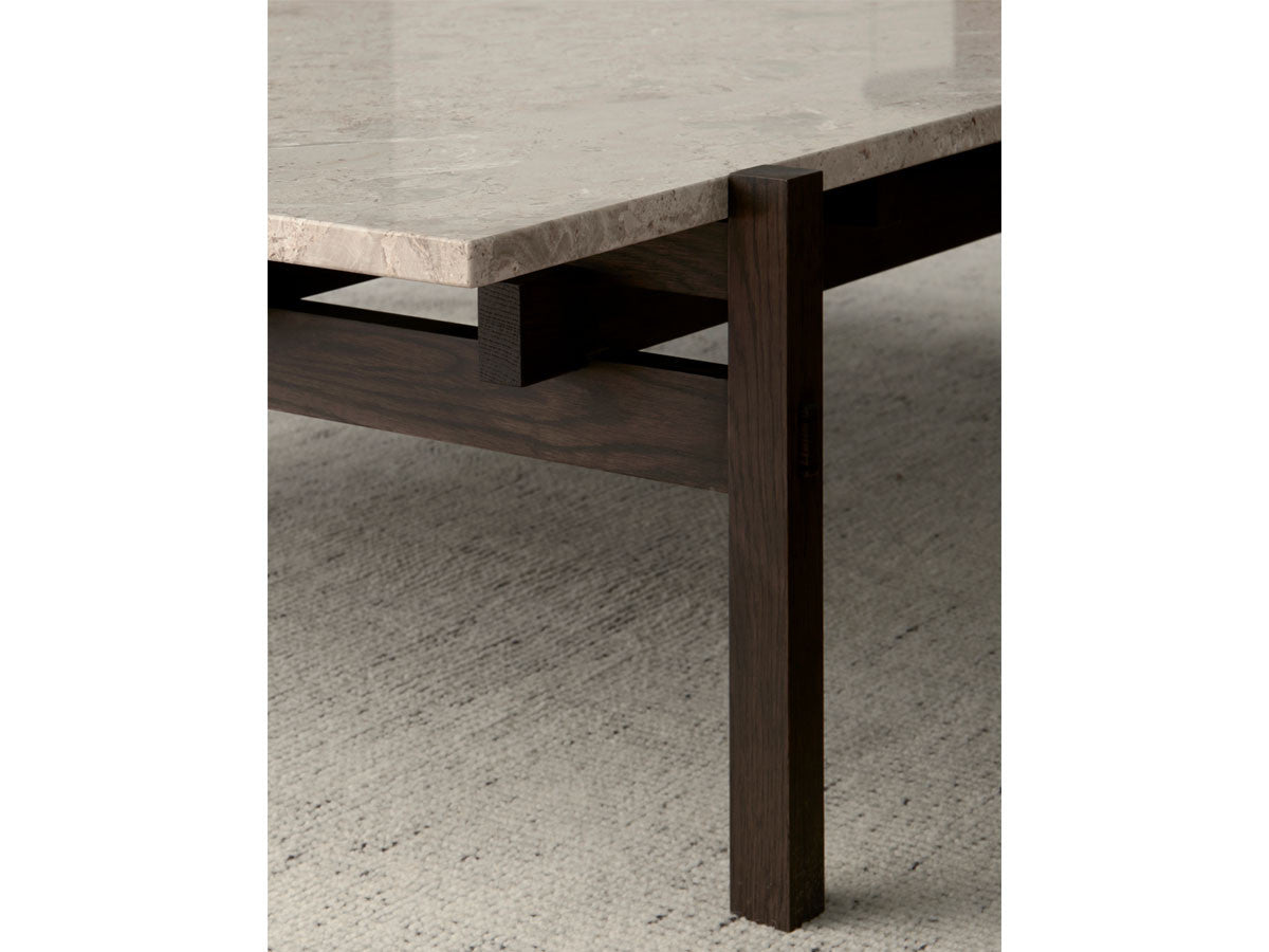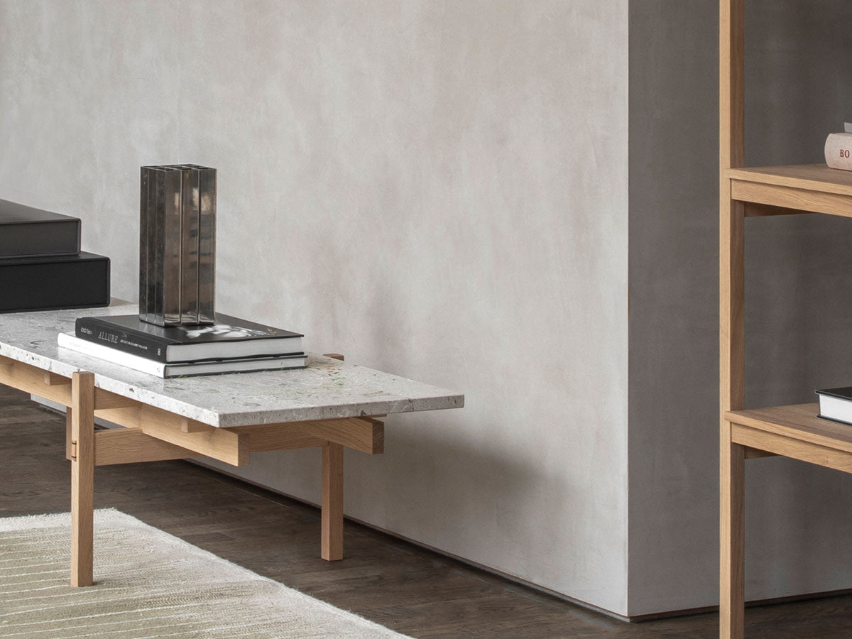 寺社仏閣や伝統的な建築に見られる多くのファサードや戸口を基にした構造が特徴的なローテーブル。緻密に組み合わされた複数の木製のパーツが、平行を保ちながらも、意図的に空間を生み出し、外観にある種の軽さを与えています。様々な要素の間に差し込む光が、有機的で生き生きとした表情を添えます。ストーントップは、デンマークの有名デザイナー、ポール・ケアホルムによるミニマリズム・デザインを参照しています。寺院など日本の伝統建築にみられる門や戸からイメージされた脚部は、限界まで細いパーツで構成されています。脚の木製パーツはそれぞれ隙間をあけることで光の通り道をつくり、床に映し出される影が、時間と共に空間に変化をつくり出します。組立金具を表面に露出させない日本の伝統的な建築技法を取り入れることで、美しさにこだわるとともに、重量のある大理石を支えるための高い強度を両立させました。天板はイタリア産の天然大理石。堆積岩を採用することで貝殻化石など様々な模様が生み出す多様なデザイン性が特徴。水磨きのマット仕上げを施し、自然な風合いを保ちながら耐水性を高めています。大理石天板の裏面には飛散防止のメッシュシートを採用。滑り止めのクッションと脚から続く木枠で挟み込み、安全性にも配慮しています。