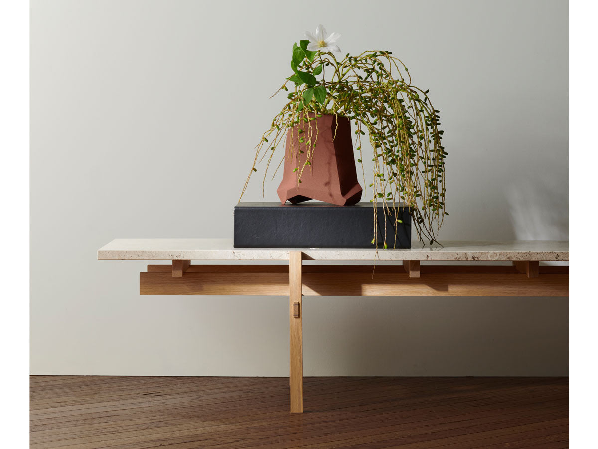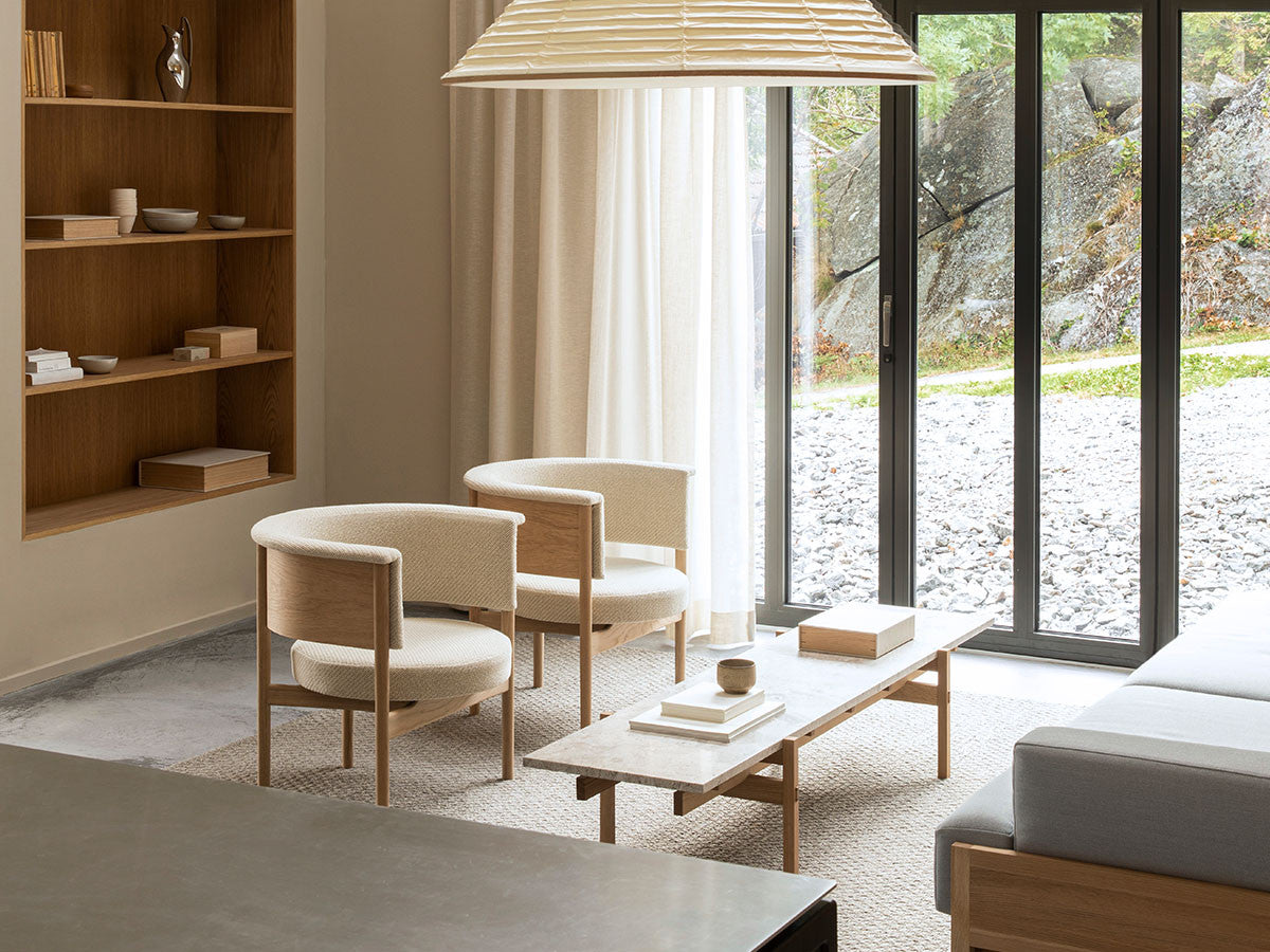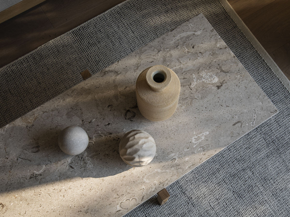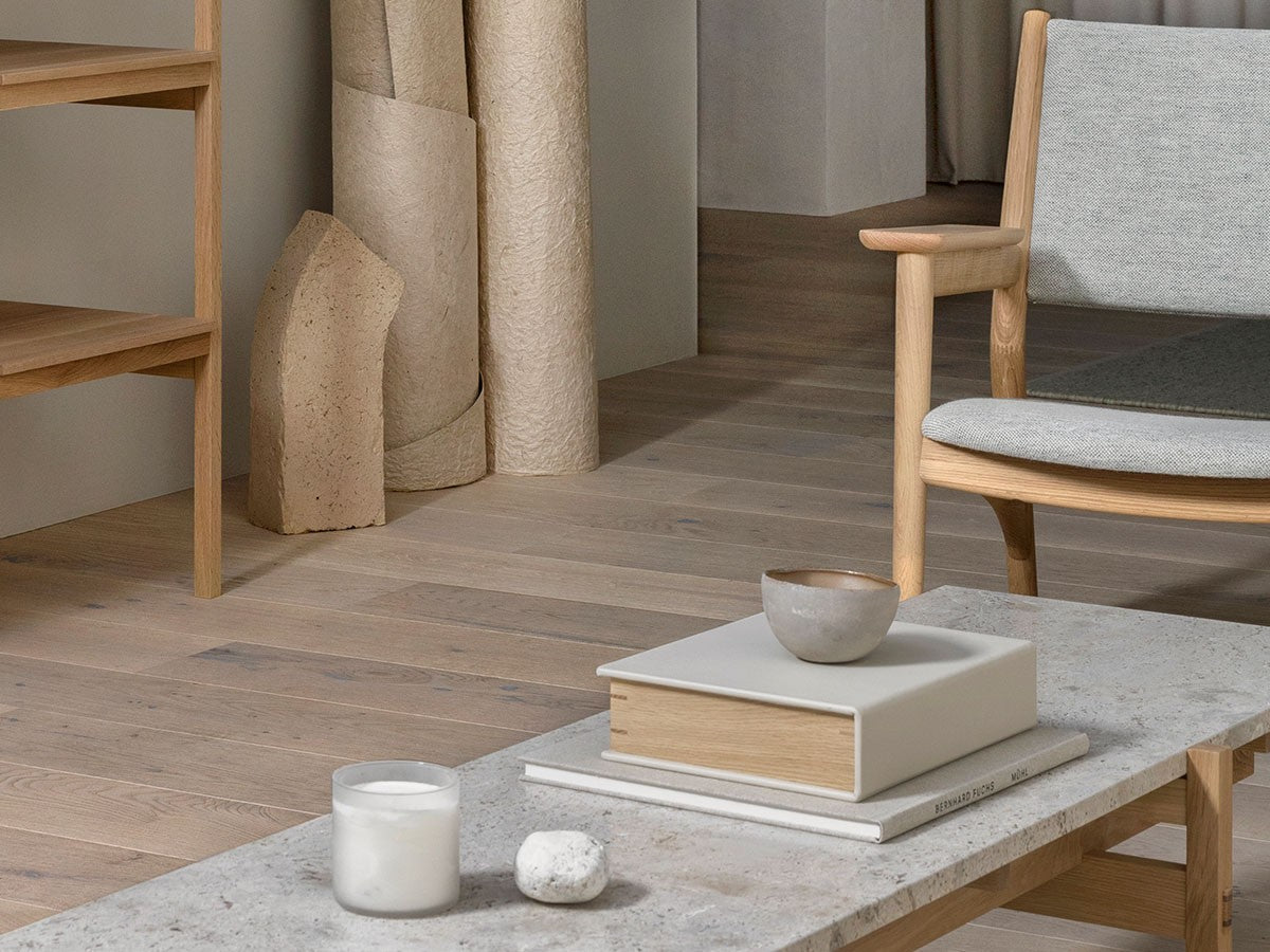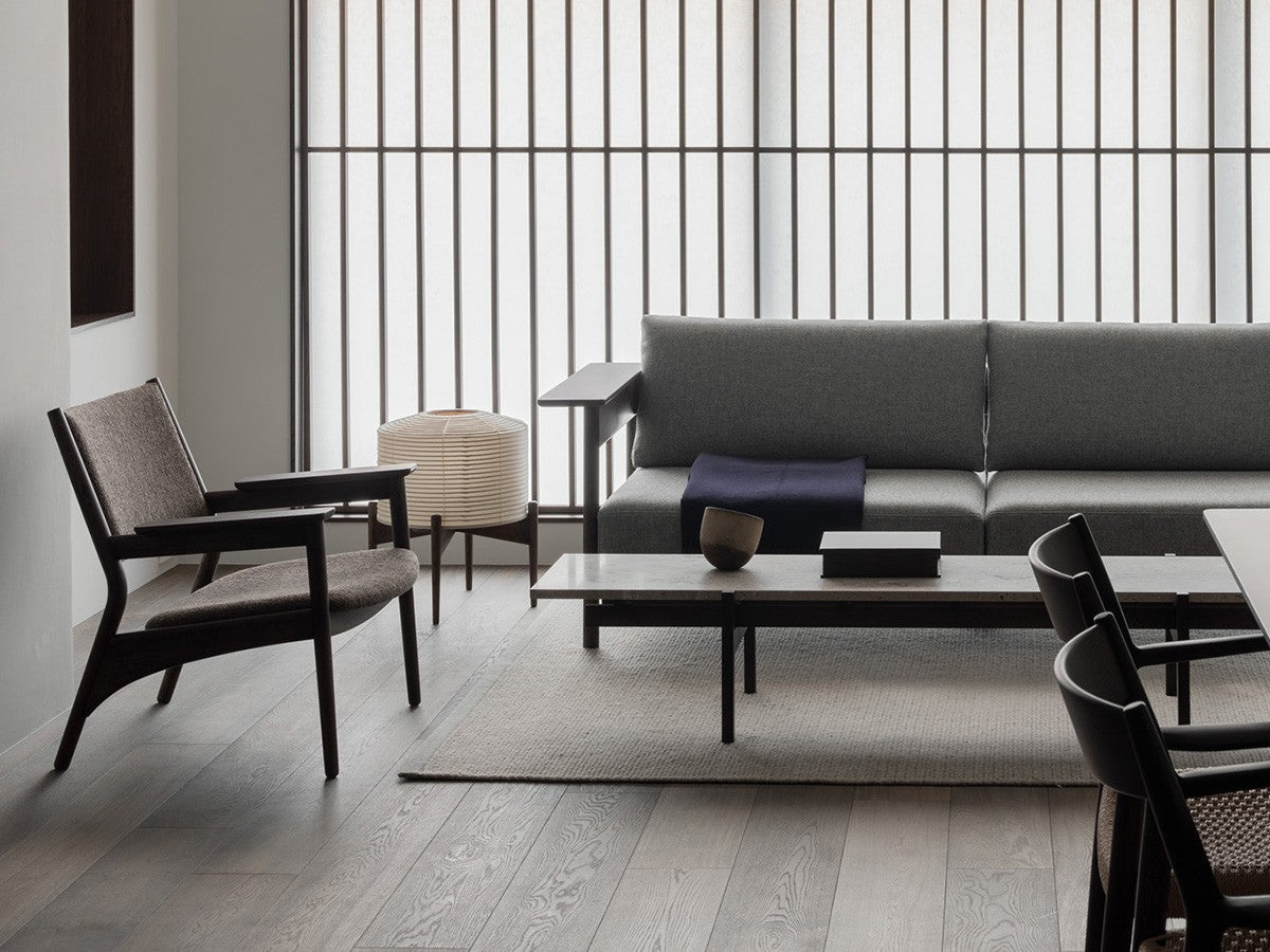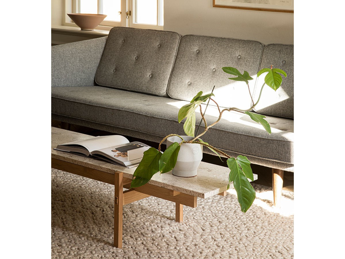 寺社仏閣や伝統的な建築に見られる多くのファサードや戸口を基にした構造が特徴的なローテーブル。緻密に組み合わされた複数の木製のパーツが、平行を保ちながらも、意図的に空間を生み出し、外観にある種の軽さを与えています。様々な要素の間に差し込む光が、有機的で生き生きとした表情を添えます。ストーントップは、デンマークの有名デザイナー、ポール・ケアホルムによるミニマリズム・デザインを参照しています。寺院など日本の伝統建築にみられる門や戸からイメージされた脚部は、限界まで細いパーツで構成されています。脚の木製パーツはそれぞれ隙間をあけることで光の通り道をつくり、床に映し出される影が、時間と共に空間に変化をつくり出します。組立金具を表面に露出させない日本の伝統的な建築技法を取り入れることで、美しさにこだわるとともに、重量のある大理石を支えるための高い強度を両立させました。天板はイタリア産の天然大理石。堆積岩を採用することで貝殻化石など様々な模様が生み出す多様なデザイン性が特徴。水磨きのマット仕上げを施し、自然な風合いを保ちながら耐水性を高めています。大理石天板の裏面には飛散防止のメッシュシートを採用。滑り止めのクッションと脚から続く木枠で挟み込み、安全性にも配慮しています。