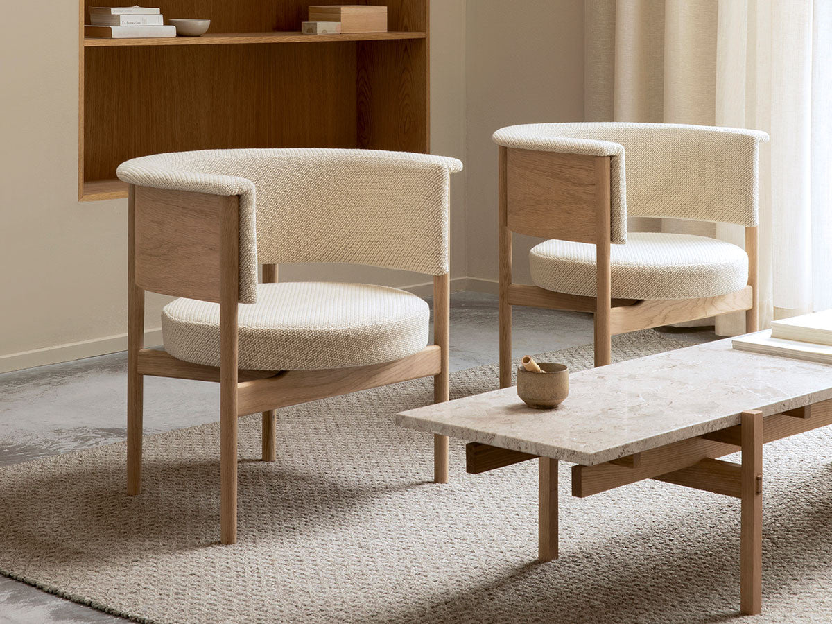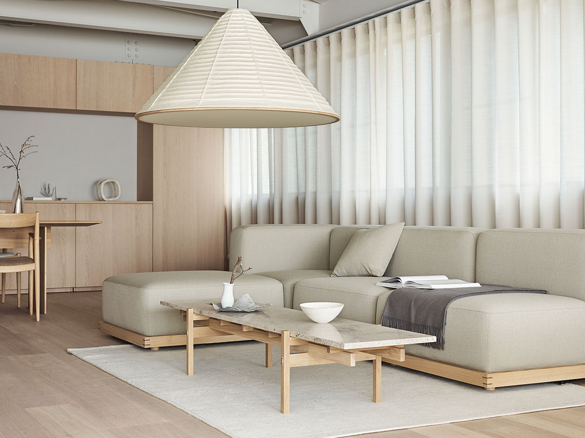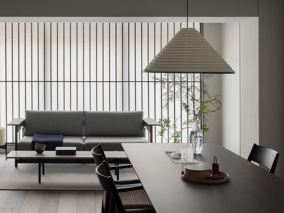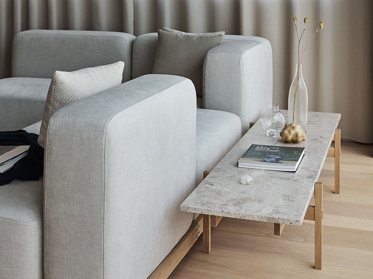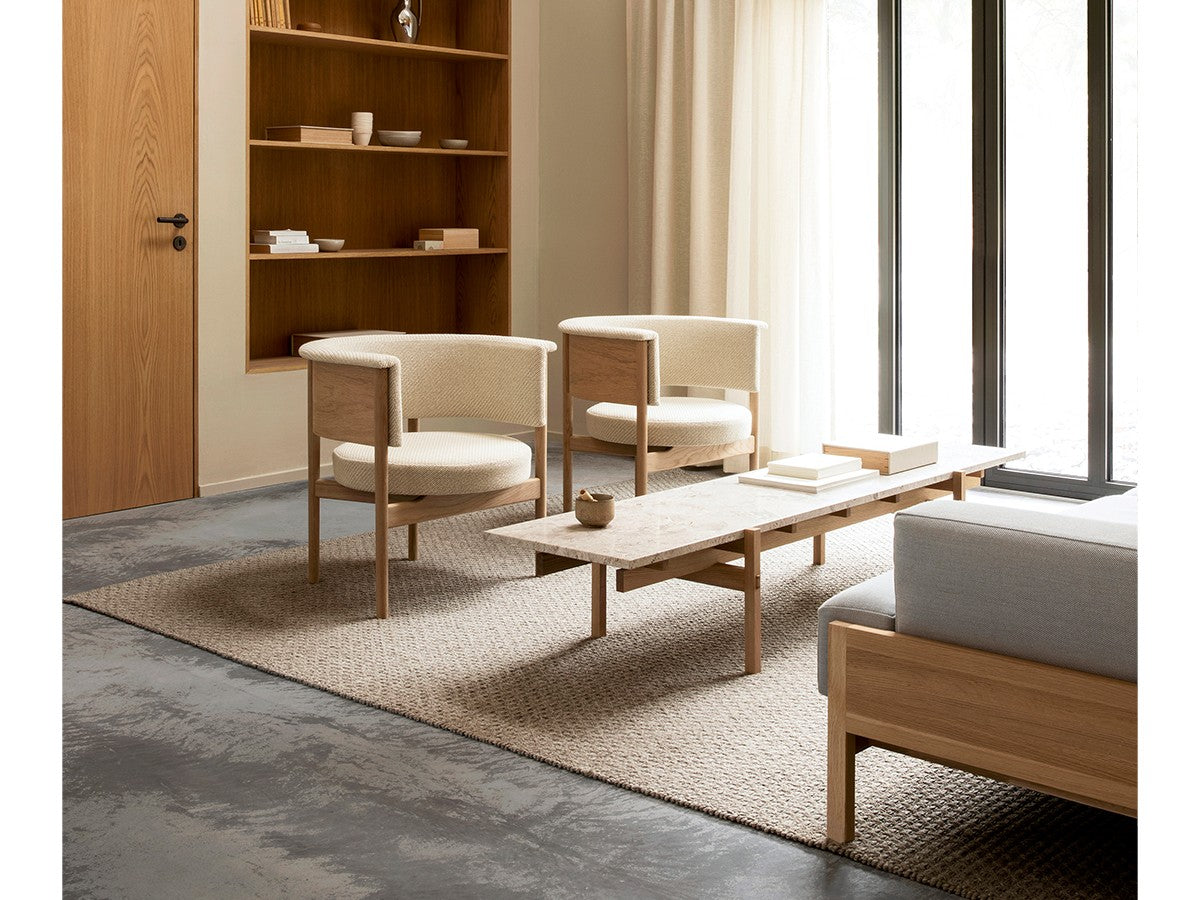 寺社仏閣や伝統的な建築に見られる多くのファサードや戸口を基にした構造が特徴的なローテーブル。緻密に組み合わされた複数の木製のパーツが、平行を保ちながらも、意図的に空間を生み出し、外観にある種の軽さを与えています。様々な要素の間に差し込む光が、有機的で生き生きとした表情を添えます。ストーントップは、デンマークの有名デザイナー、ポール・ケアホルムによるミニマリズム・デザインを参照しています。寺院など日本の伝統建築にみられる門や戸からイメージされた脚部は、限界まで細いパーツで構成されています。脚の木製パーツはそれぞれ隙間をあけることで光の通り道をつくり、床に映し出される影が、時間と共に空間に変化をつくり出します。組立金具を表面に露出させない日本の伝統的な建築技法を取り入れることで、美しさにこだわるとともに、重量のある大理石を支えるための高い強度を両立させました。天板はイタリア産の天然大理石。堆積岩を採用することで貝殻化石など様々な模様が生み出す多様なデザイン性が特徴。水磨きのマット仕上げを施し、自然な風合いを保ちながら耐水性を高めています。大理石天板の裏面には飛散防止のメッシュシートを採用。滑り止めのクッションと脚から続く木枠で挟み込み、安全性にも配慮しています。