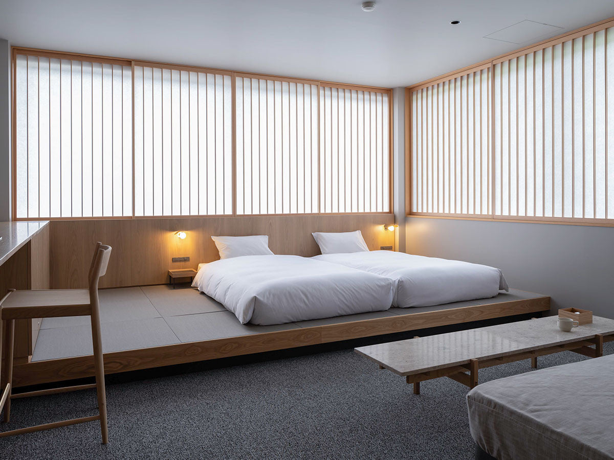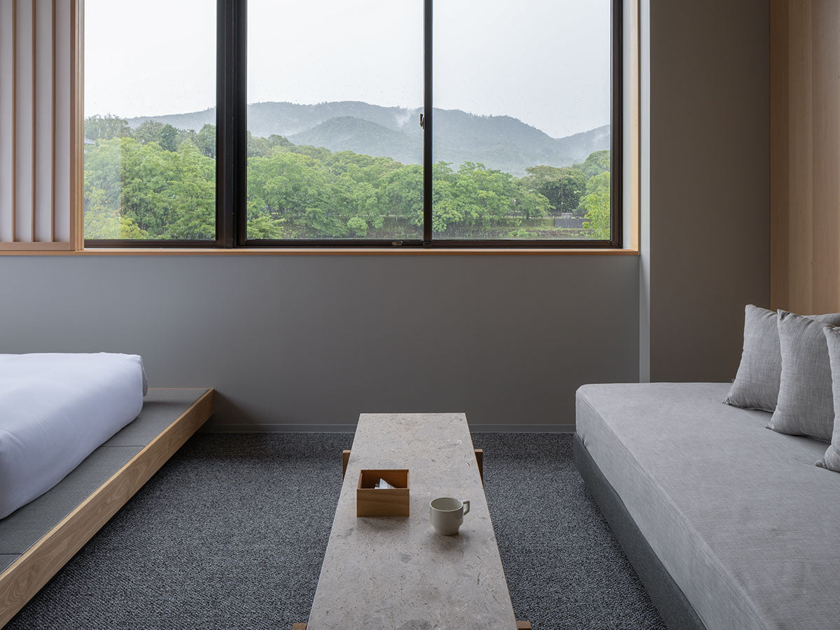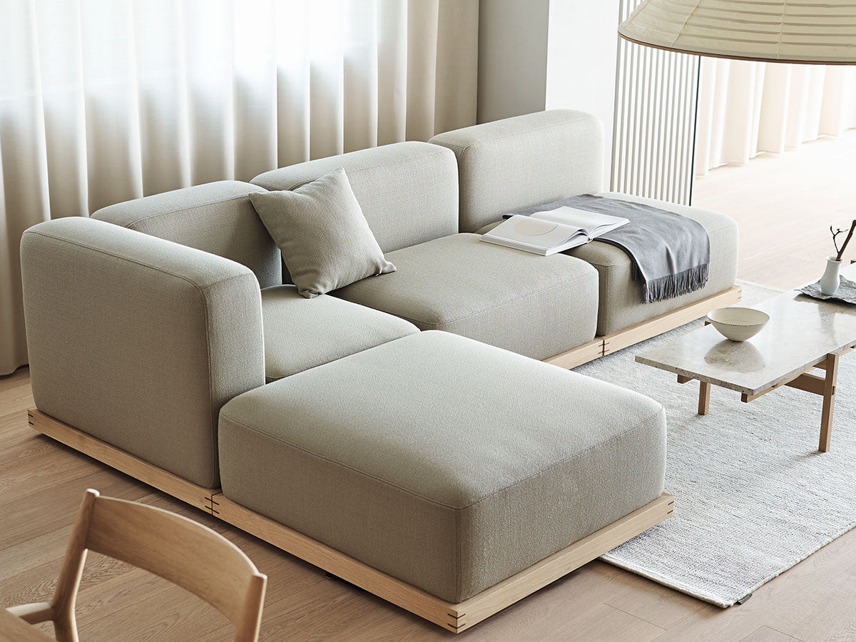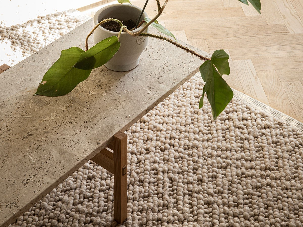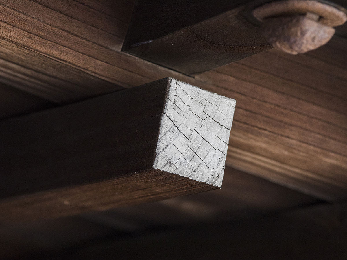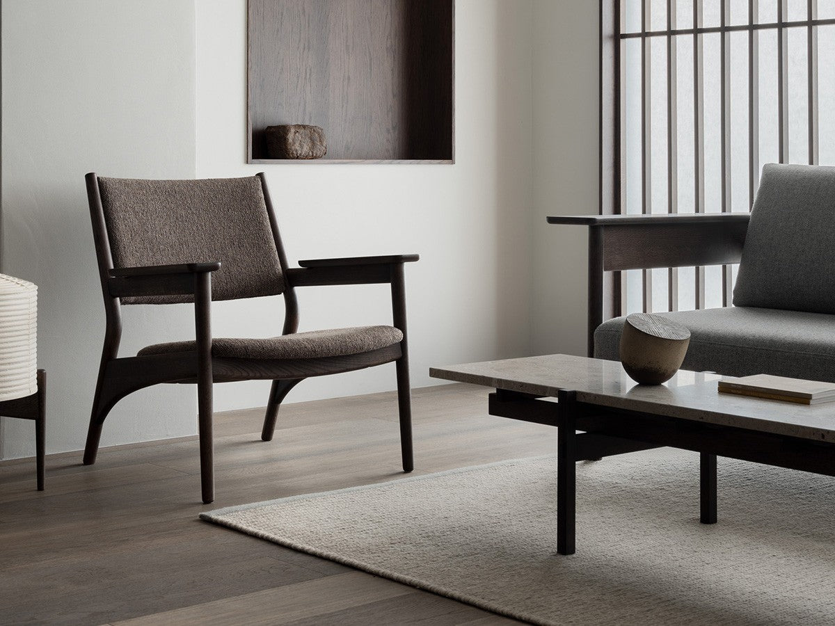 寺社仏閣や伝統的な建築に見られる多くのファサードや戸口を基にした構造が特徴的なローテーブル。緻密に組み合わされた複数の木製のパーツが、平行を保ちながらも、意図的に空間を生み出し、外観にある種の軽さを与えています。様々な要素の間に差し込む光が、有機的で生き生きとした表情を添えます。ストーントップは、デンマークの有名デザイナー、ポール・ケアホルムによるミニマリズム・デザインを参照しています。寺院など日本の伝統建築にみられる門や戸からイメージされた脚部は、限界まで細いパーツで構成されています。脚の木製パーツはそれぞれ隙間をあけることで光の通り道をつくり、床に映し出される影が、時間と共に空間に変化をつくり出します。組立金具を表面に露出させない日本の伝統的な建築技法を取り入れることで、美しさにこだわるとともに、重量のある大理石を支えるための高い強度を両立させました。天板はイタリア産の天然大理石。堆積岩を採用することで貝殻化石など様々な模様が生み出す多様なデザイン性が特徴。水磨きのマット仕上げを施し、自然な風合いを保ちながら耐水性を高めています。大理石天板の裏面には飛散防止のメッシュシートを採用。滑り止めのクッションと脚から続く木枠で挟み込み、安全性にも配慮しています。