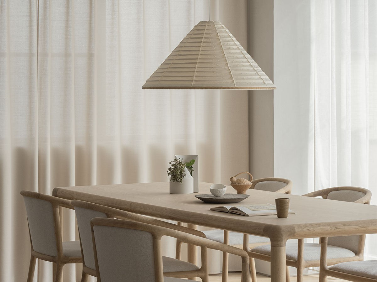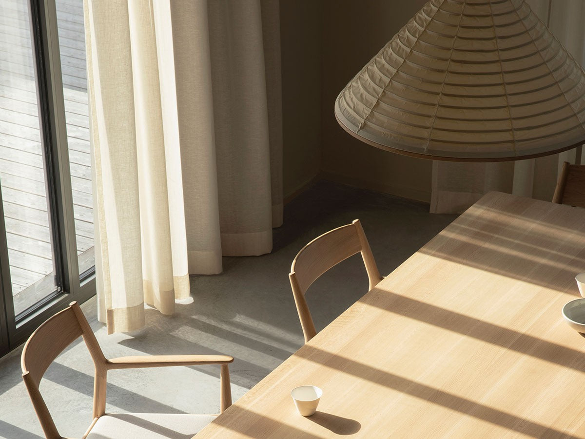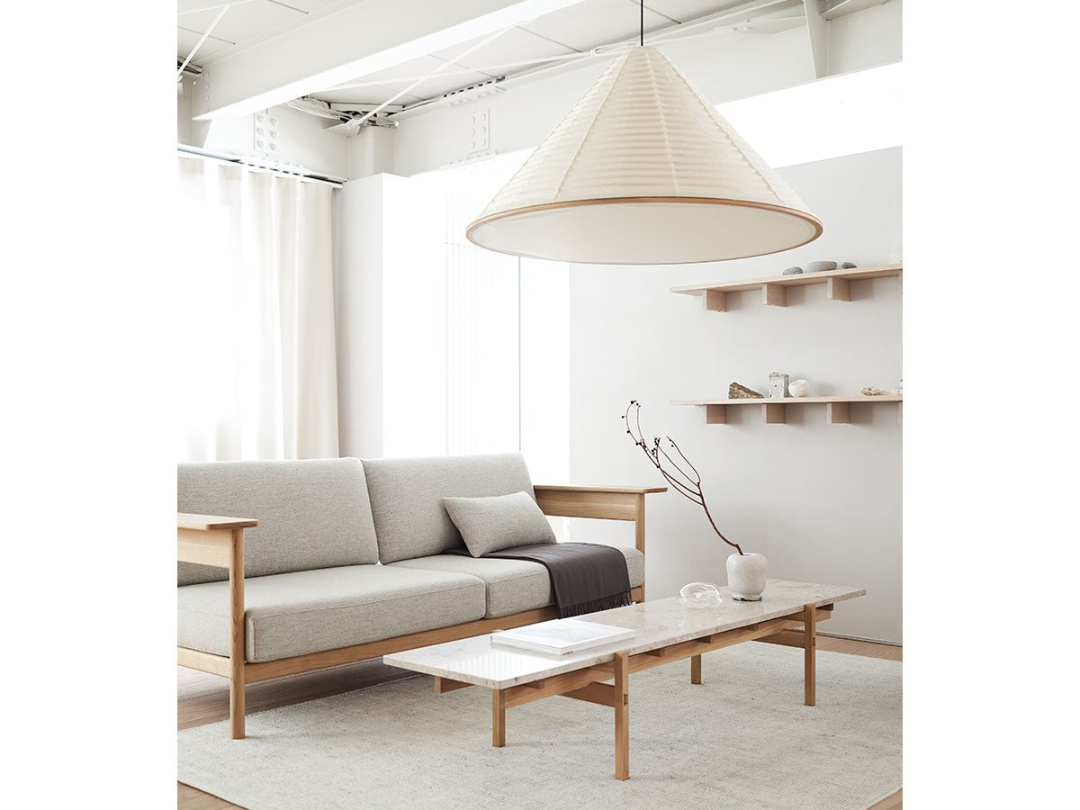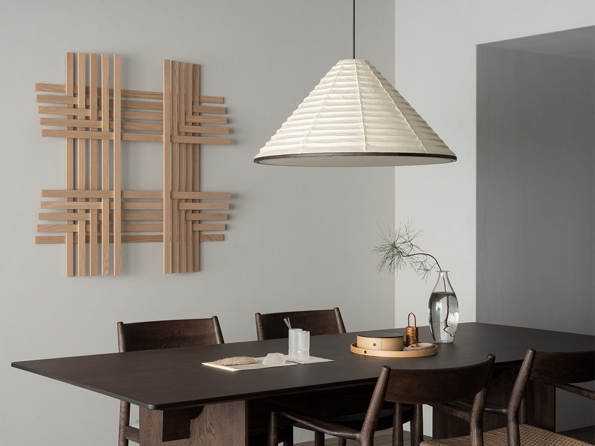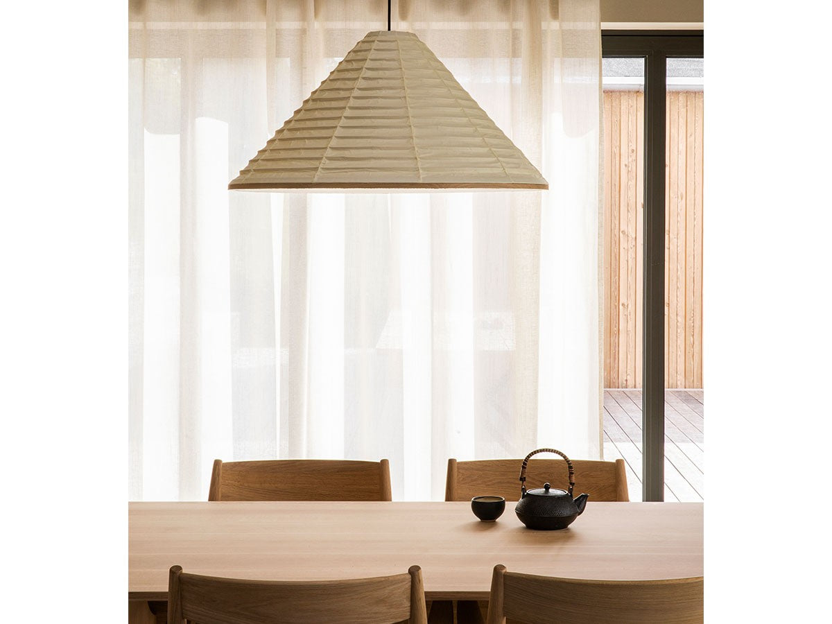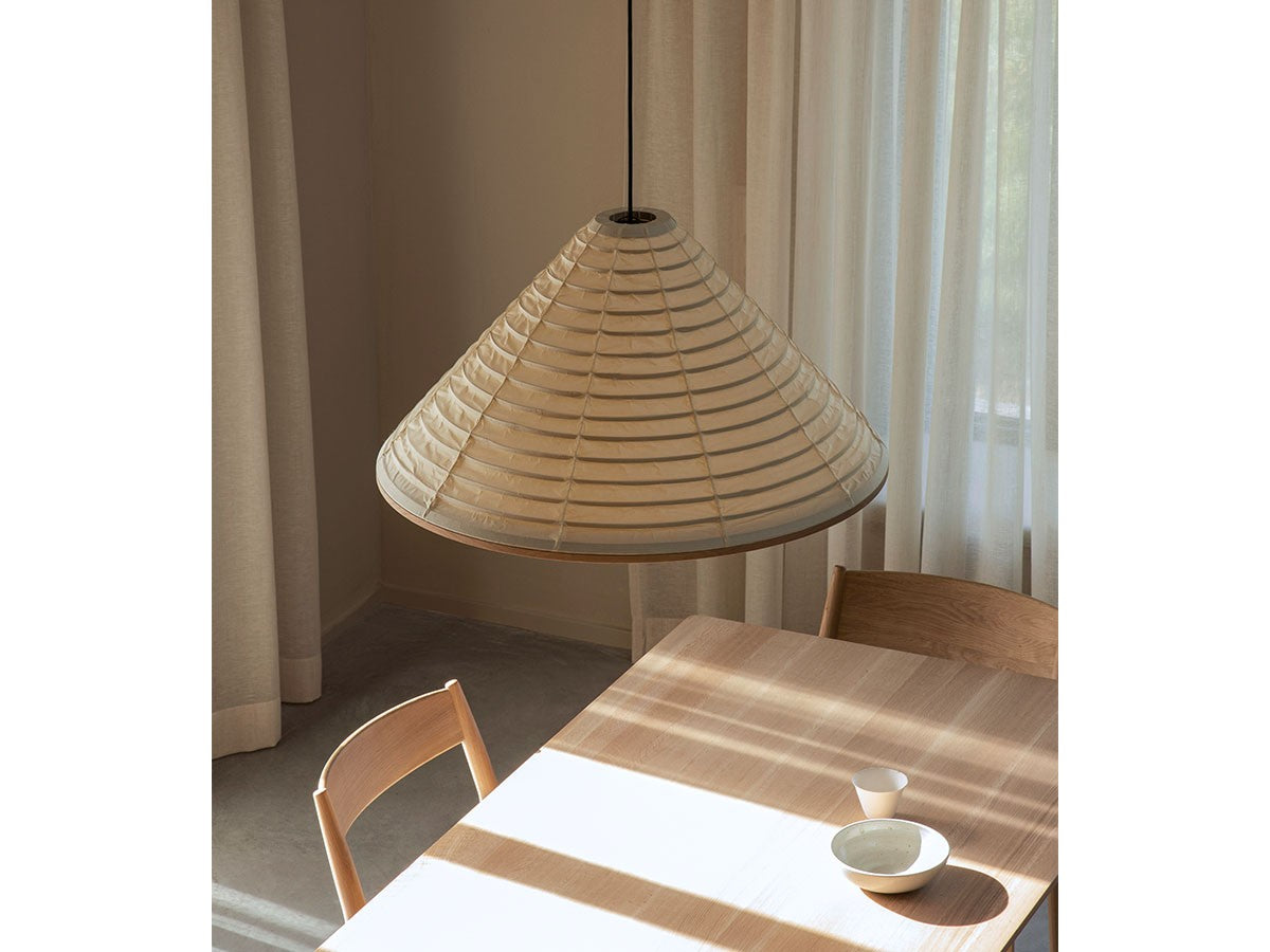スウェーデンの海岸線沿いに立つ、アーキペラゴハウスの頂点の三角形の屋根構造を模したペンダントライト。照明の底は和紙で覆われており、磁石で固定されているため、電球の交換が必要な場合は簡単に取り外すことができます。底部にはさらにスクリーンとしての機能もあり、光源を隠し、暖かい間接光を生み出します。光は下方向だけでなく、上方向にも横方向にも広がります。ペーパーコードといった細やかなディテールにより、カリモクケースの家具のイメージをさり気なく取り入れています。また、アーキペラゴハウス近くの漁港で見つかったロープやワイヤーにインスピレーションを得ており、海の雰囲気を添えています。THE ARCHIPELAGO HOUSE「アーキペラゴハウスコレクション」は、スウェーデン西部に位置する海岸線にあるサマーハウスに備え付けられることを想定して作られています。このサマーハウスは、家族の生活の全ての側面を包含する近代化された別荘です。デンマークのデザインスタジオ、Norm Architects(ノームアーキテクツ)は、天然素材、落ち着いた色、すっきりとしたラインに重点を置いてサマーハウスを設計しました。ミニマルでありながら、居心地の良い、厳選されたインテリアに仕上げられています。
