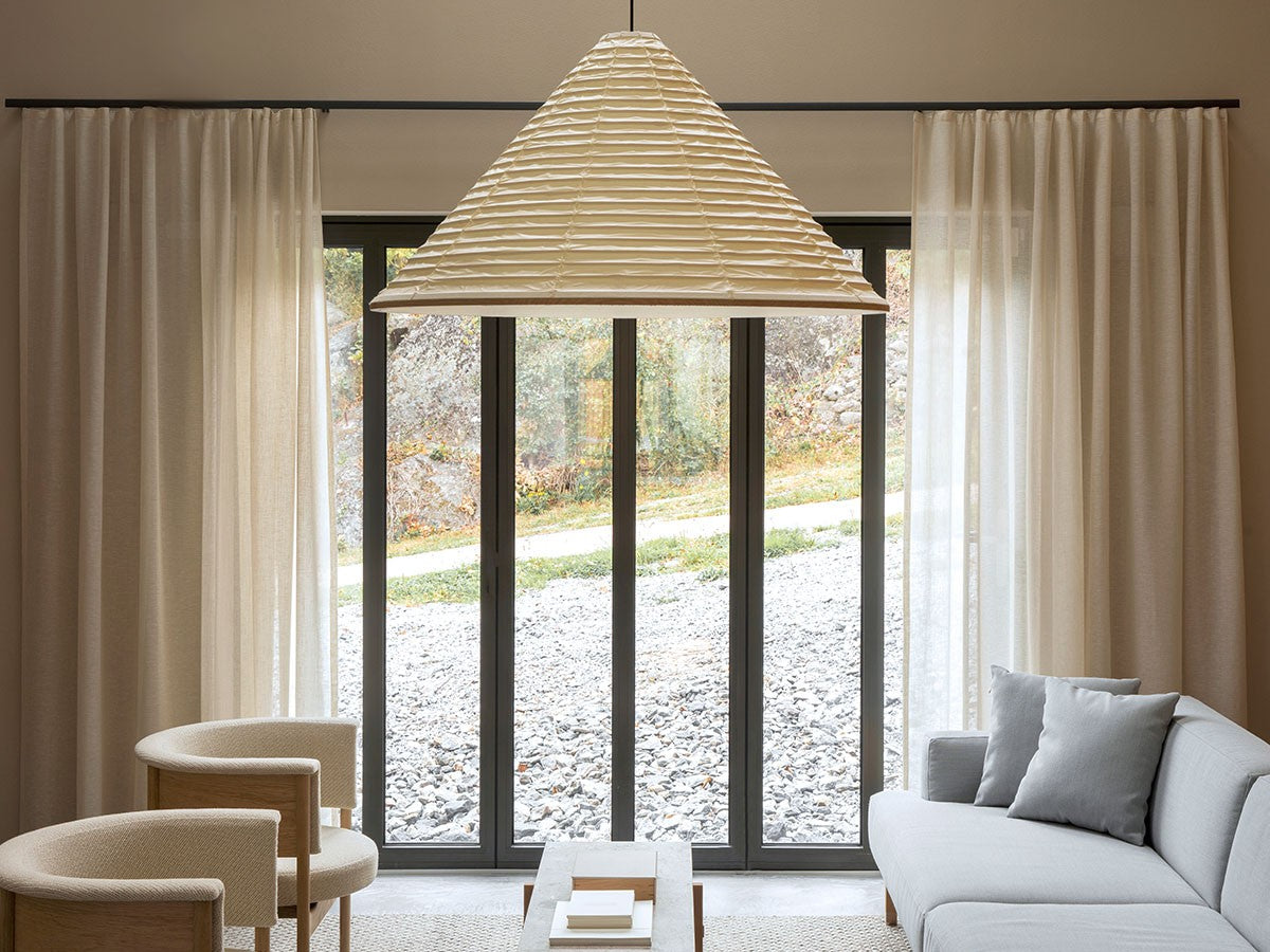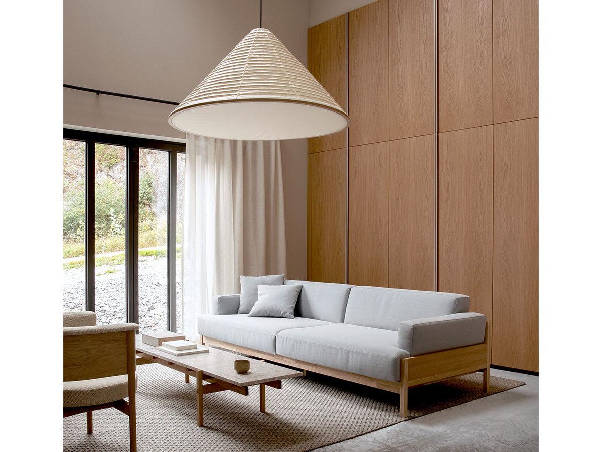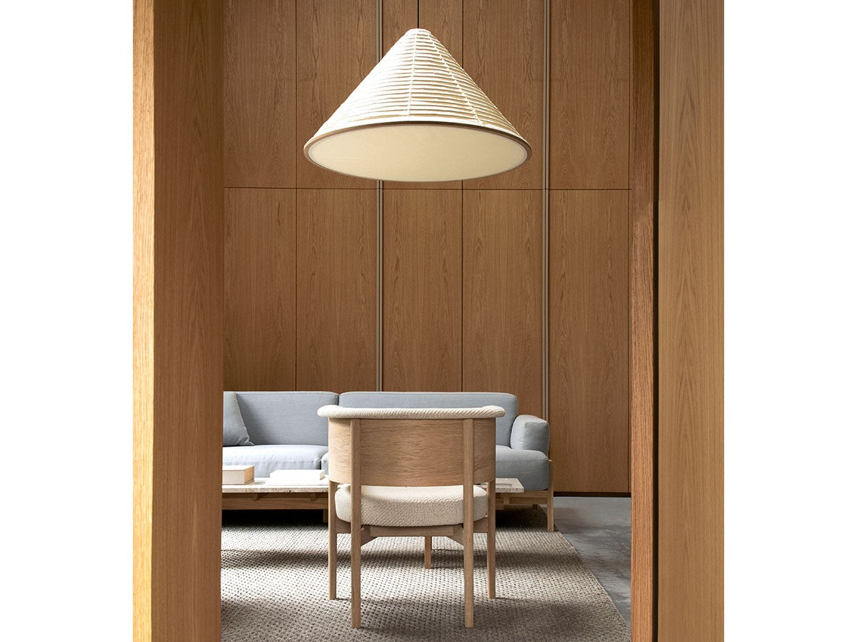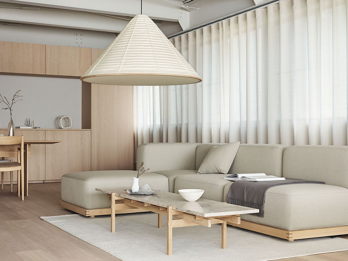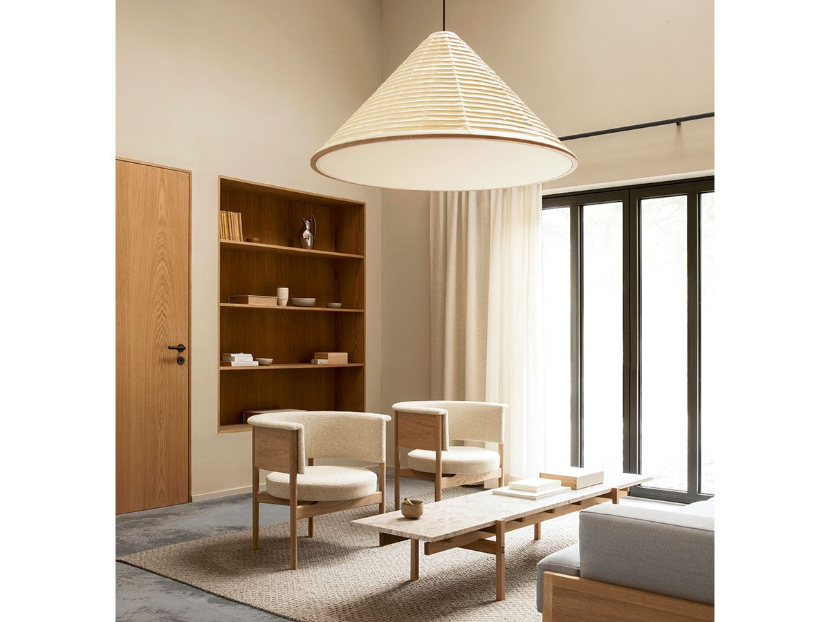 スウェーデンの海岸線沿いに立つ、アーキペラゴハウスの頂点の三角形の屋根構造を模したペンダントライト。照明の底は和紙で覆われており、磁石で固定されているため、電球の交換が必要な場合は簡単に取り外すことができます。底部にはさらにスクリーンとしての機能もあり、光源を隠し、暖かい間接光を生み出します。光は下方向だけでなく、上方向にも横方向にも広がります。ペーパーコードといった細やかなディテールにより、カリモクケースの家具のイメージをさり気なく取り入れています。また、アーキペラゴハウス近くの漁港で見つかったロープやワイヤーにインスピレーションを得ており、海の雰囲気を添えています。THE ARCHIPELAGO HOUSE「アーキペラゴハウスコレクション」は、スウェーデン西部に位置する海岸線にあるサマーハウスに備え付けられることを想定して作られています。このサマーハウスは、家族の生活の全ての側面を包含する近代化された別荘です。デンマークのデザインスタジオ、Norm Architects(ノームアーキテクツ)は、天然素材、落ち着いた色、すっきりとしたラインに重点を置いてサマーハウスを設計しました。ミニマルでありながら、居心地の良い、厳選されたインテリアに仕上げられています。