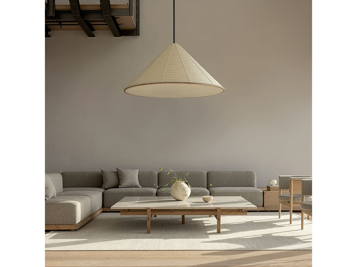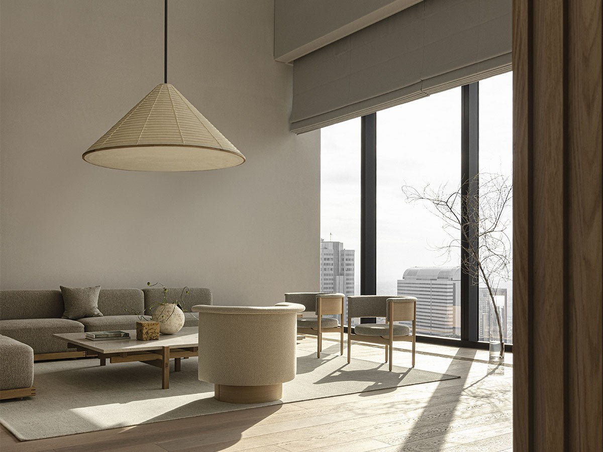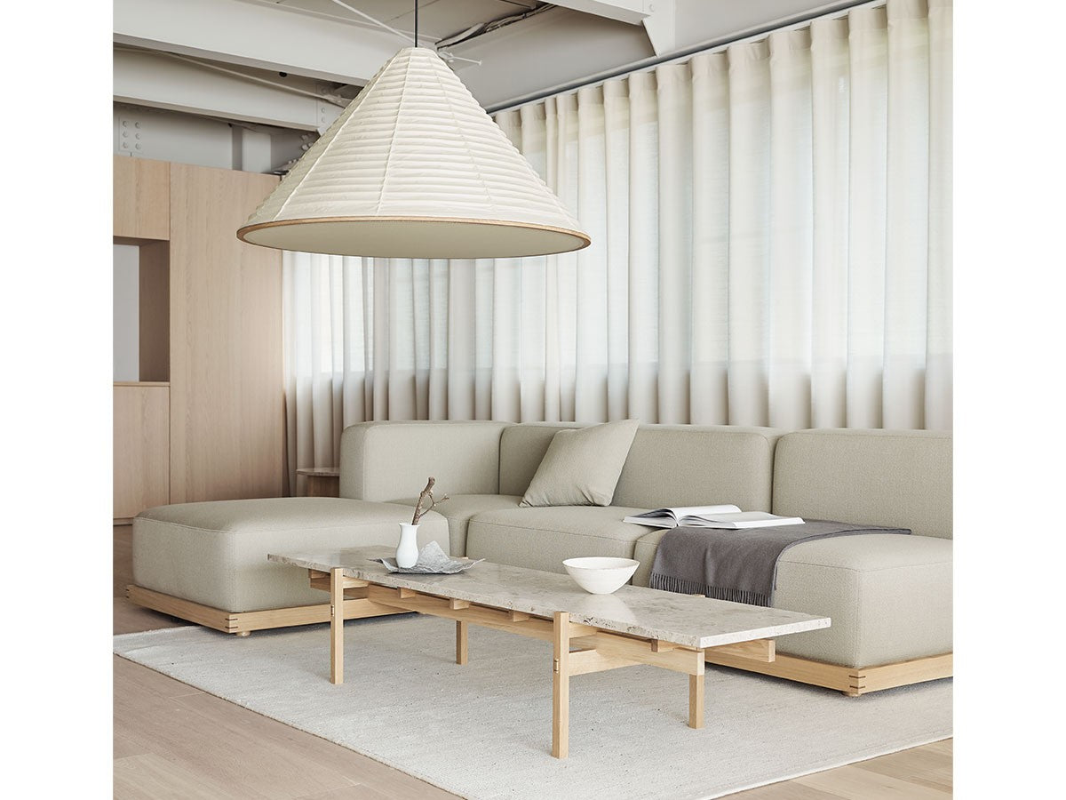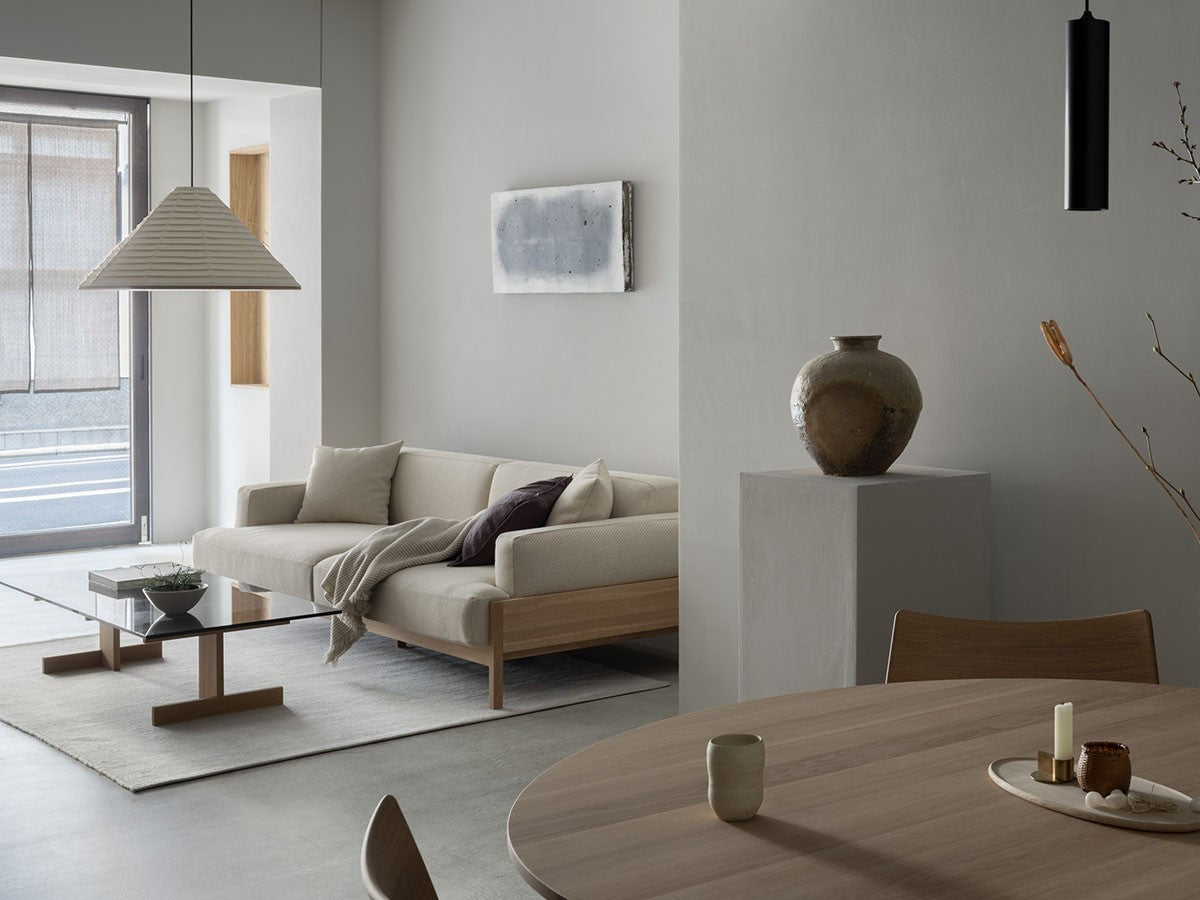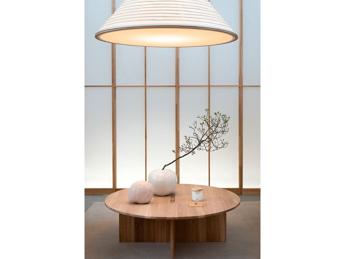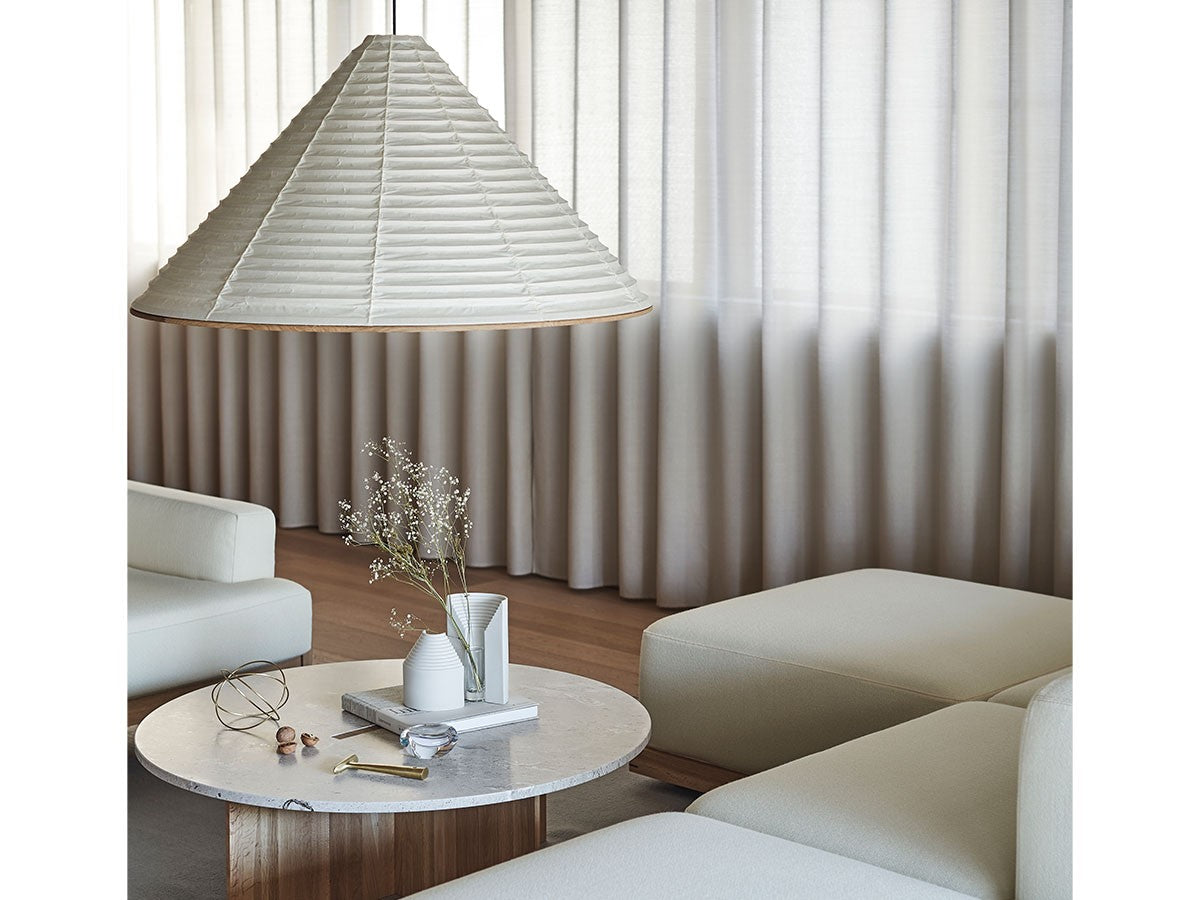スウェーデンの海岸線沿いに立つ、アーキペラゴハウスの頂点の三角形の屋根構造を模したペンダントライト。照明の底は和紙で覆われており、磁石で固定されているため、電球の交換が必要な場合は簡単に取り外すことができます。底部にはさらにスクリーンとしての機能もあり、光源を隠し、暖かい間接光を生み出します。光は下方向だけでなく、上方向にも横方向にも広がります。ペーパーコードといった細やかなディテールにより、カリモクケースの家具のイメージをさり気なく取り入れています。また、アーキペラゴハウス近くの漁港で見つかったロープやワイヤーにインスピレーションを得ており、海の雰囲気を添えています。THE ARCHIPELAGO HOUSE「アーキペラゴハウスコレクション」は、スウェーデン西部に位置する海岸線にあるサマーハウスに備え付けられることを想定して作られています。このサマーハウスは、家族の生活の全ての側面を包含する近代化された別荘です。デンマークのデザインスタジオ、Norm Architects(ノームアーキテクツ)は、天然素材、落ち着いた色、すっきりとしたラインに重点を置いてサマーハウスを設計しました。ミニマルでありながら、居心地の良い、厳選されたインテリアに仕上げられています。