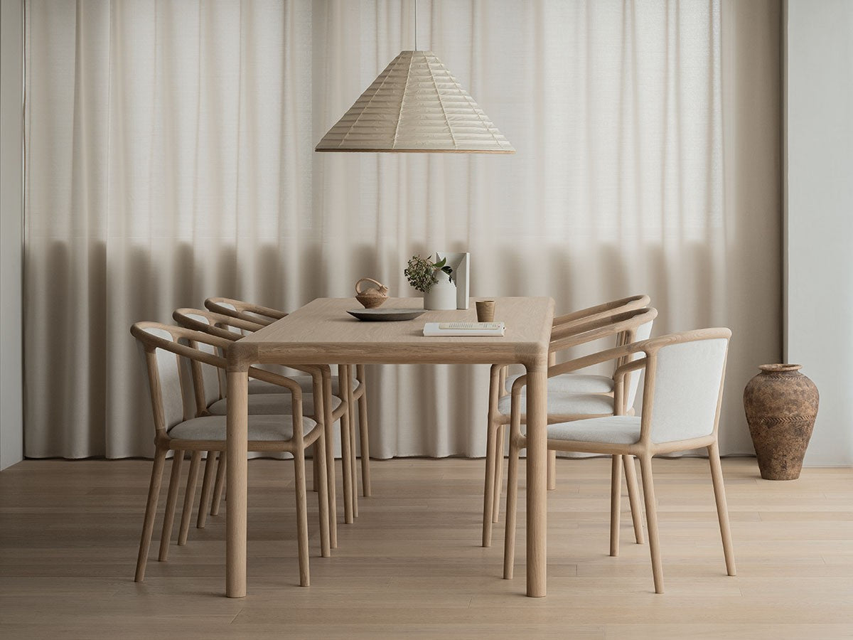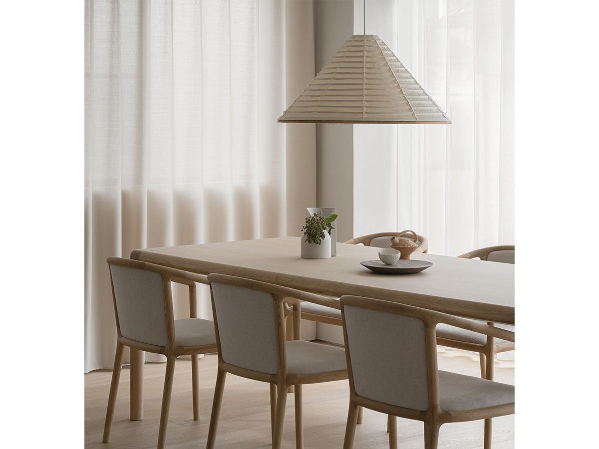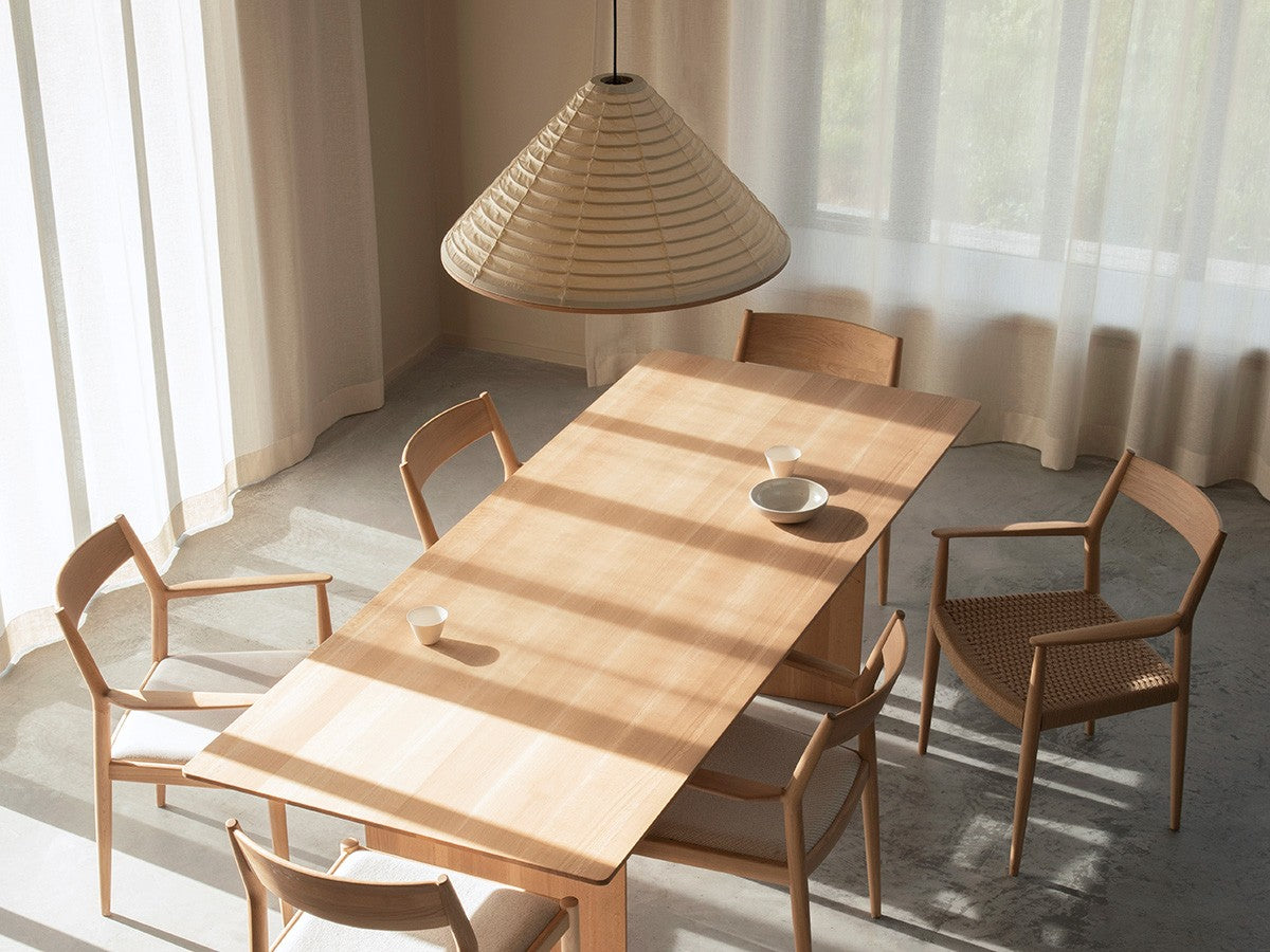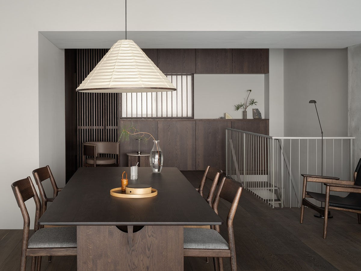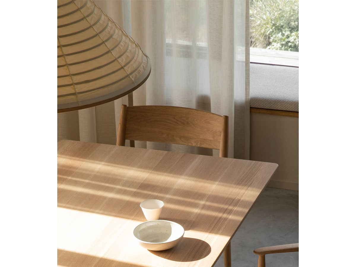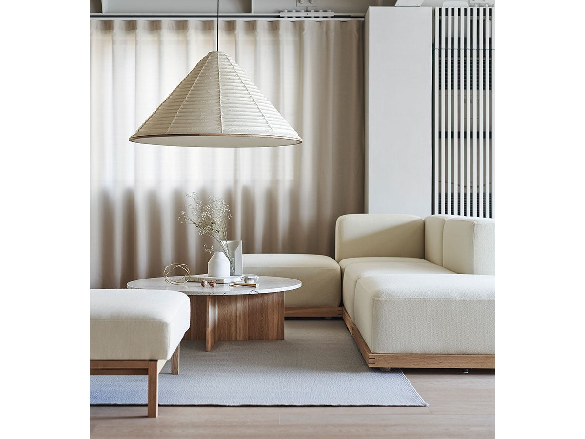 スウェーデンの海岸線沿いに立つ、アーキペラゴハウスの頂点の三角形の屋根構造を模したペンダントライト。照明の底は和紙で覆われており、磁石で固定されているため、電球の交換が必要な場合は簡単に取り外すことができます。底部にはさらにスクリーンとしての機能もあり、光源を隠し、暖かい間接光を生み出します。光は下方向だけでなく、上方向にも横方向にも広がります。ペーパーコードといった細やかなディテールにより、カリモクケースの家具のイメージをさり気なく取り入れています。また、アーキペラゴハウス近くの漁港で見つかったロープやワイヤーにインスピレーションを得ており、海の雰囲気を添えています。THE ARCHIPELAGO HOUSE「アーキペラゴハウスコレクション」は、スウェーデン西部に位置する海岸線にあるサマーハウスに備え付けられることを想定して作られています。このサマーハウスは、家族の生活の全ての側面を包含する近代化された別荘です。デンマークのデザインスタジオ、Norm Architects(ノームアーキテクツ)は、天然素材、落ち着いた色、すっきりとしたラインに重点を置いてサマーハウスを設計しました。ミニマルでありながら、居心地の良い、厳選されたインテリアに仕上げられています。