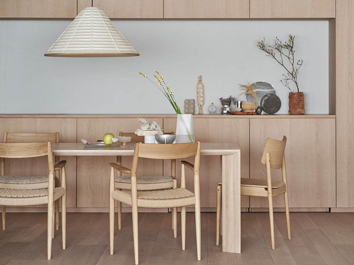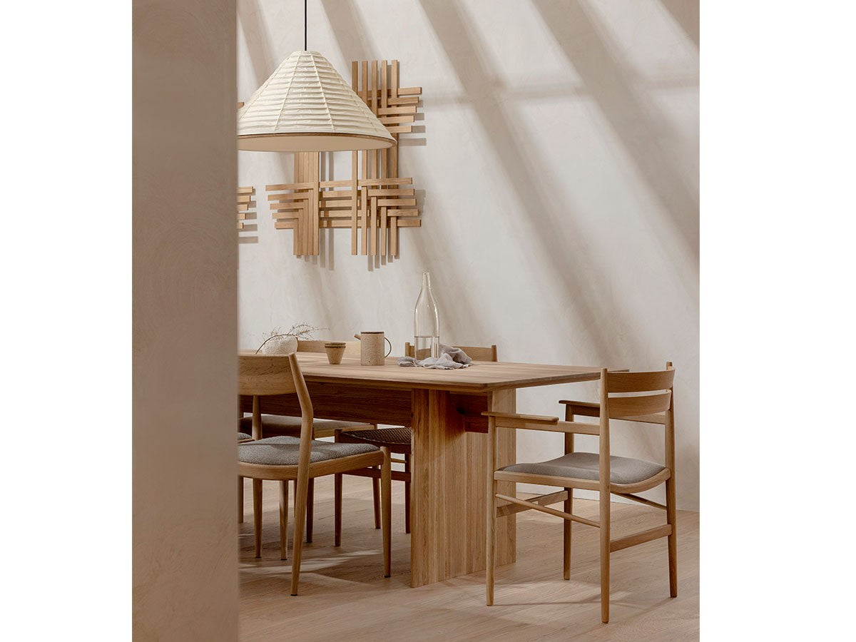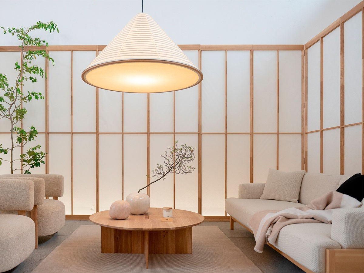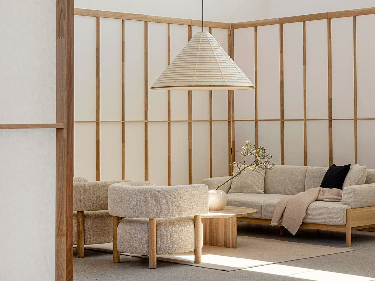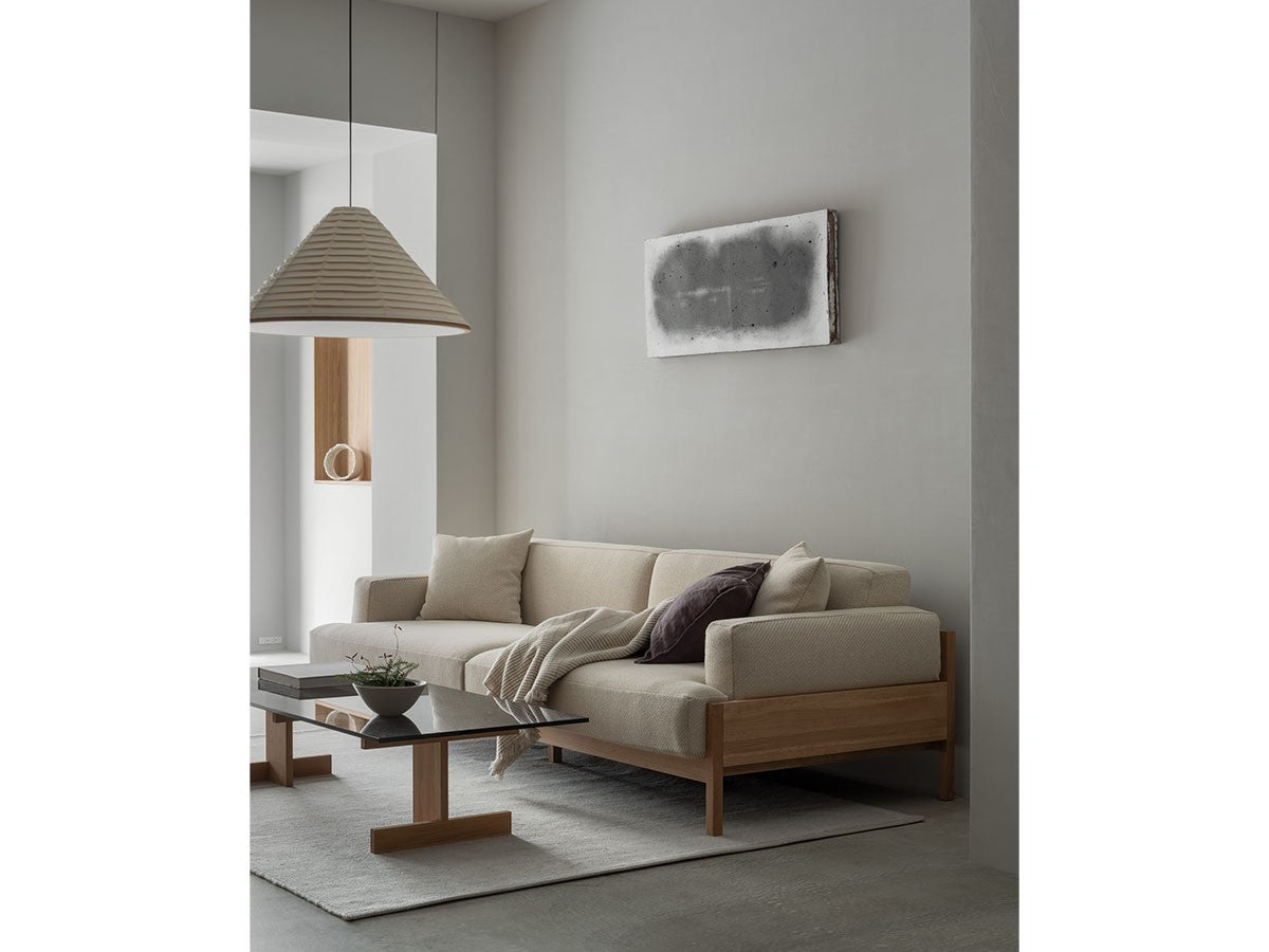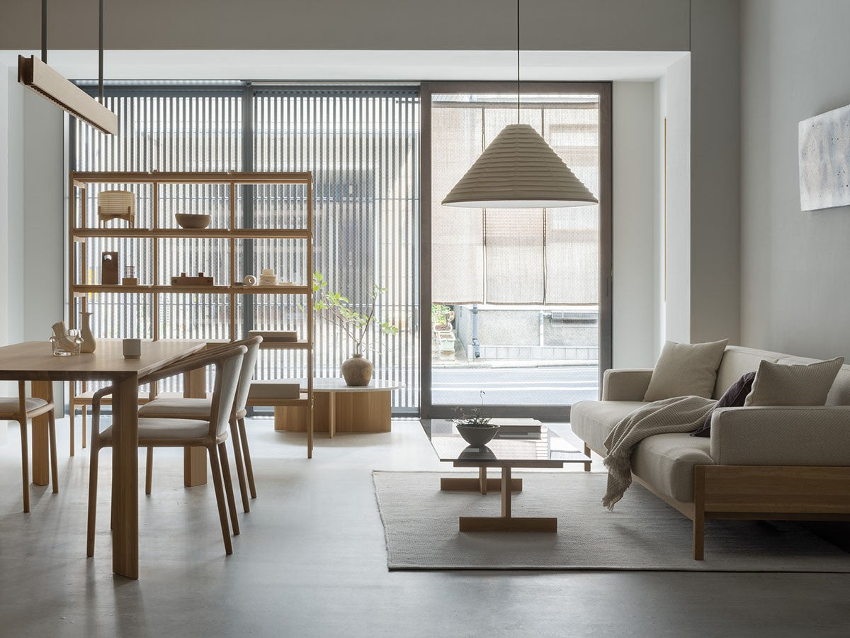 スウェーデンの海岸線沿いに立つ、アーキペラゴハウスの頂点の三角形の屋根構造を模したペンダントライト。照明の底は和紙で覆われており、磁石で固定されているため、電球の交換が必要な場合は簡単に取り外すことができます。底部にはさらにスクリーンとしての機能もあり、光源を隠し、暖かい間接光を生み出します。光は下方向だけでなく、上方向にも横方向にも広がります。ペーパーコードといった細やかなディテールにより、カリモクケースの家具のイメージをさり気なく取り入れています。また、アーキペラゴハウス近くの漁港で見つかったロープやワイヤーにインスピレーションを得ており、海の雰囲気を添えています。THE ARCHIPELAGO HOUSE「アーキペラゴハウスコレクション」は、スウェーデン西部に位置する海岸線にあるサマーハウスに備え付けられることを想定して作られています。このサマーハウスは、家族の生活の全ての側面を包含する近代化された別荘です。デンマークのデザインスタジオ、Norm Architects(ノームアーキテクツ)は、天然素材、落ち着いた色、すっきりとしたラインに重点を置いてサマーハウスを設計しました。ミニマルでありながら、居心地の良い、厳選されたインテリアに仕上げられています。