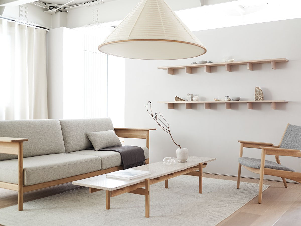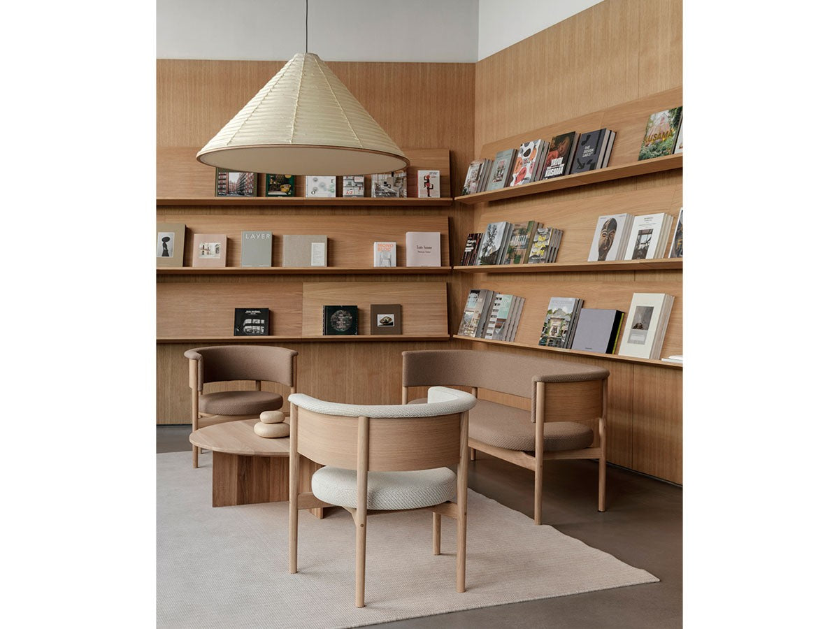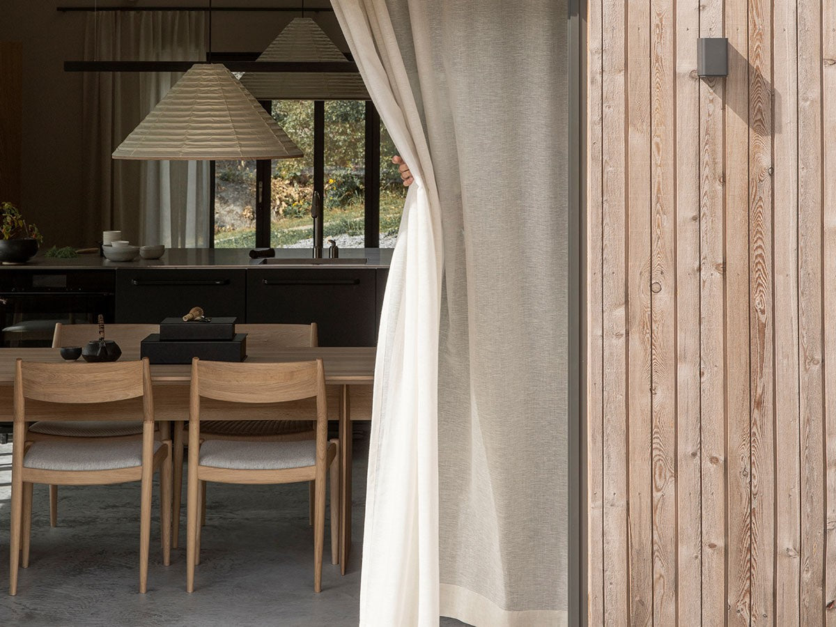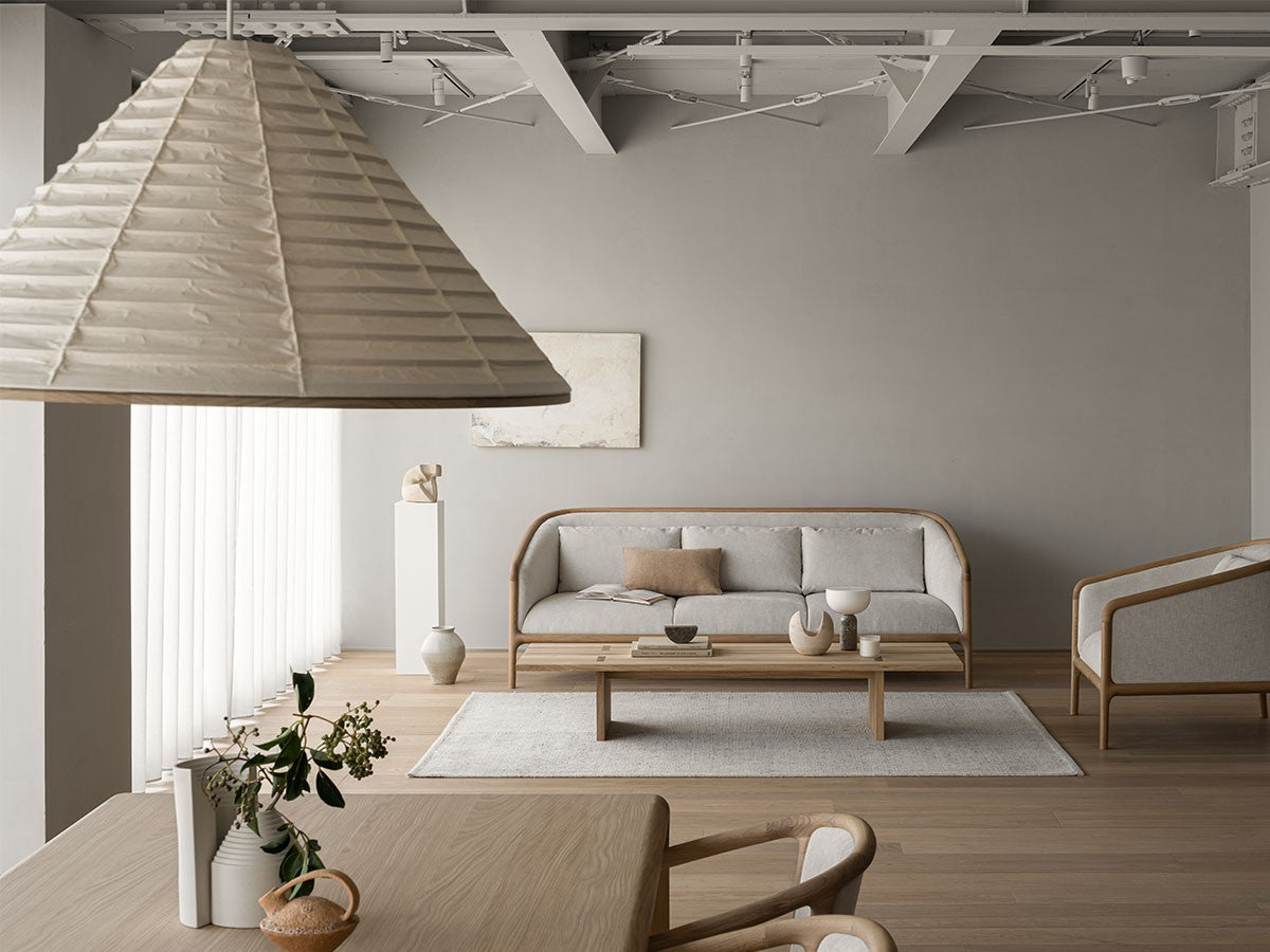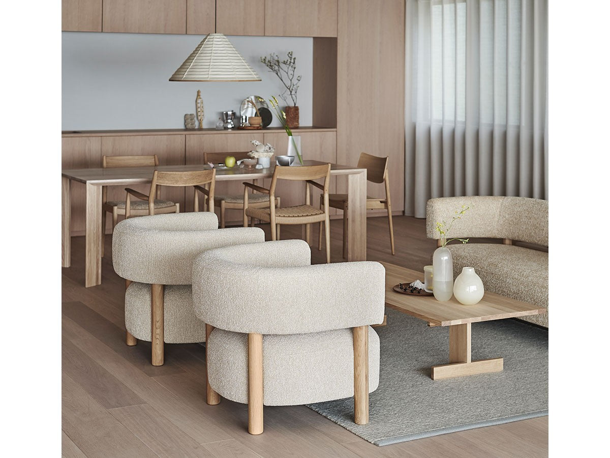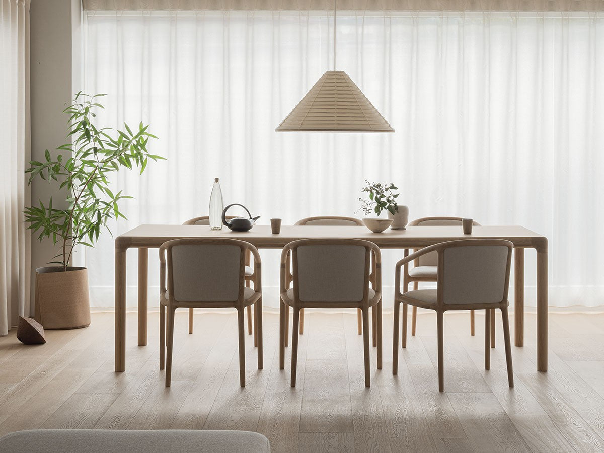 スウェーデンの海岸線沿いに立つ、アーキペラゴハウスの頂点の三角形の屋根構造を模したペンダントライト。照明の底は和紙で覆われており、磁石で固定されているため、電球の交換が必要な場合は簡単に取り外すことができます。底部にはさらにスクリーンとしての機能もあり、光源を隠し、暖かい間接光を生み出します。光は下方向だけでなく、上方向にも横方向にも広がります。ペーパーコードといった細やかなディテールにより、カリモクケースの家具のイメージをさり気なく取り入れています。また、アーキペラゴハウス近くの漁港で見つかったロープやワイヤーにインスピレーションを得ており、海の雰囲気を添えています。THE ARCHIPELAGO HOUSE「アーキペラゴハウスコレクション」は、スウェーデン西部に位置する海岸線にあるサマーハウスに備え付けられることを想定して作られています。このサマーハウスは、家族の生活の全ての側面を包含する近代化された別荘です。デンマークのデザインスタジオ、Norm Architects(ノームアーキテクツ)は、天然素材、落ち着いた色、すっきりとしたラインに重点を置いてサマーハウスを設計しました。ミニマルでありながら、居心地の良い、厳選されたインテリアに仕上げられています。
