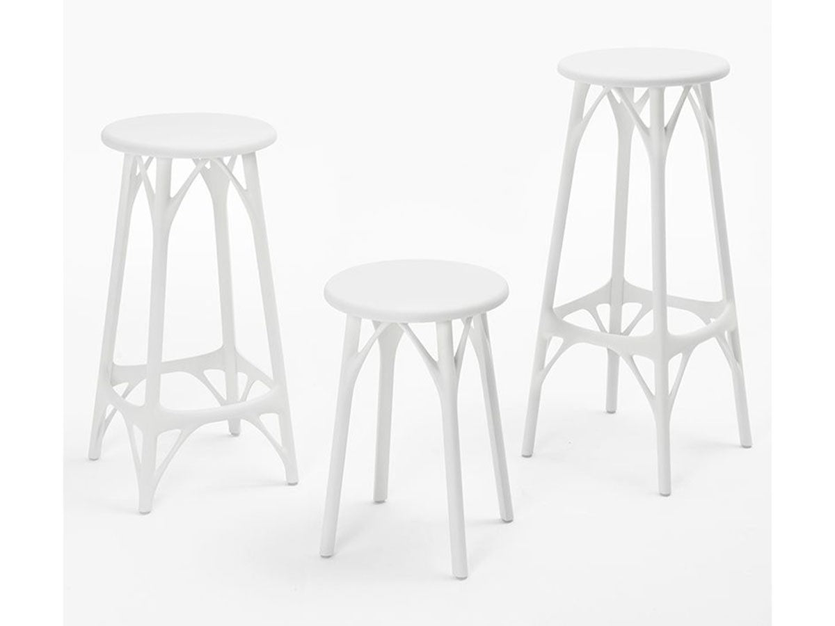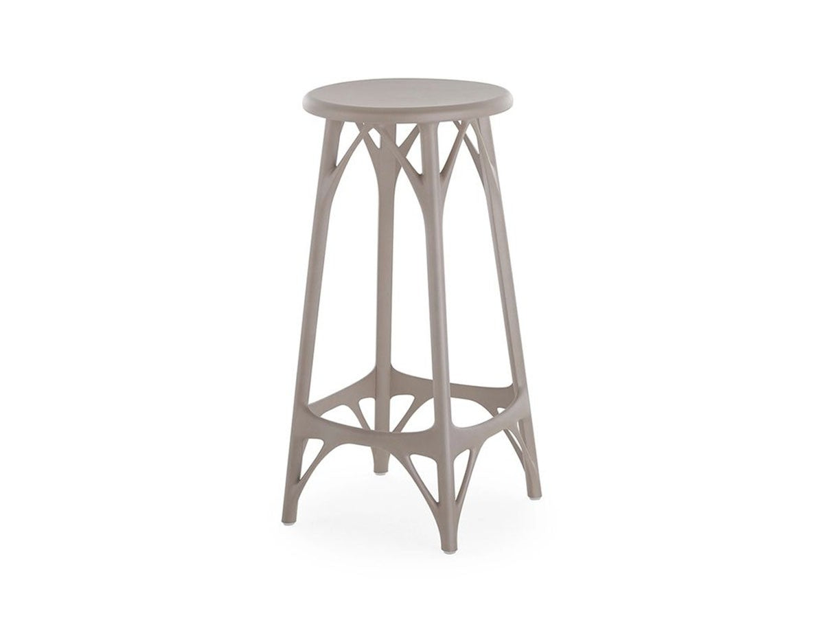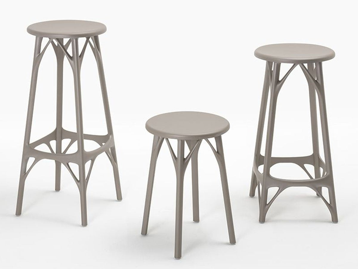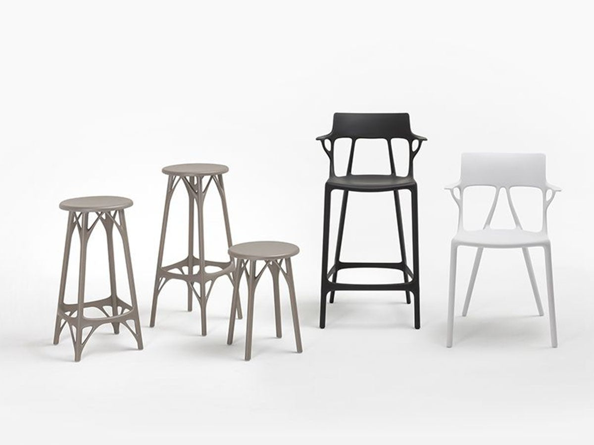 世界的なスターデザイナー、Philippe Starck(フィリップ・スタルク)がこれまでにデザインした椅子のデータをA.I.(人工知能)が学習し、導き出した最適解として制作された椅子のカウンタースツールタイプ。有機的なデザインが特徴で、快適な座り心地と強度を備えながら、材料の使用を最低限に抑えています。素材には再生樹脂が使われており、ソフトな肌触りに仕上げられています。3つの高さ違いのバリエーションがあり、サステナビリティを最大限に高めるために、それら3つのモデルの製造には同じ金型が用いられています。徹底した最適化を図ることで、生産工程においても環境に配慮しています。