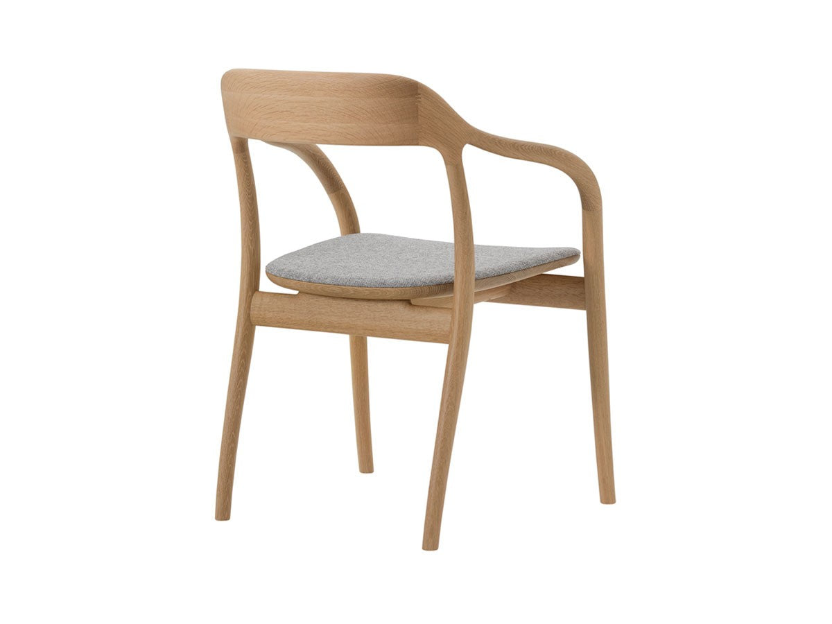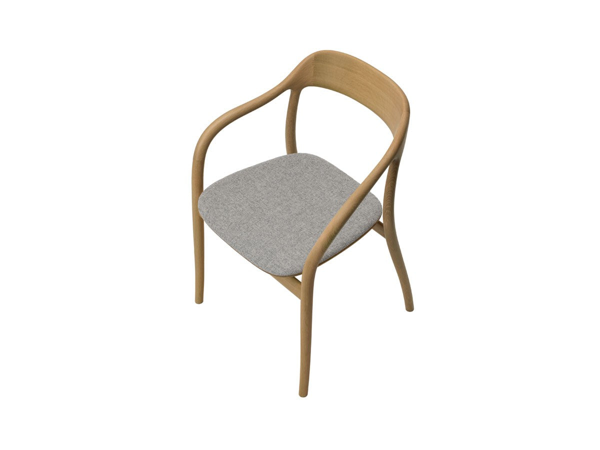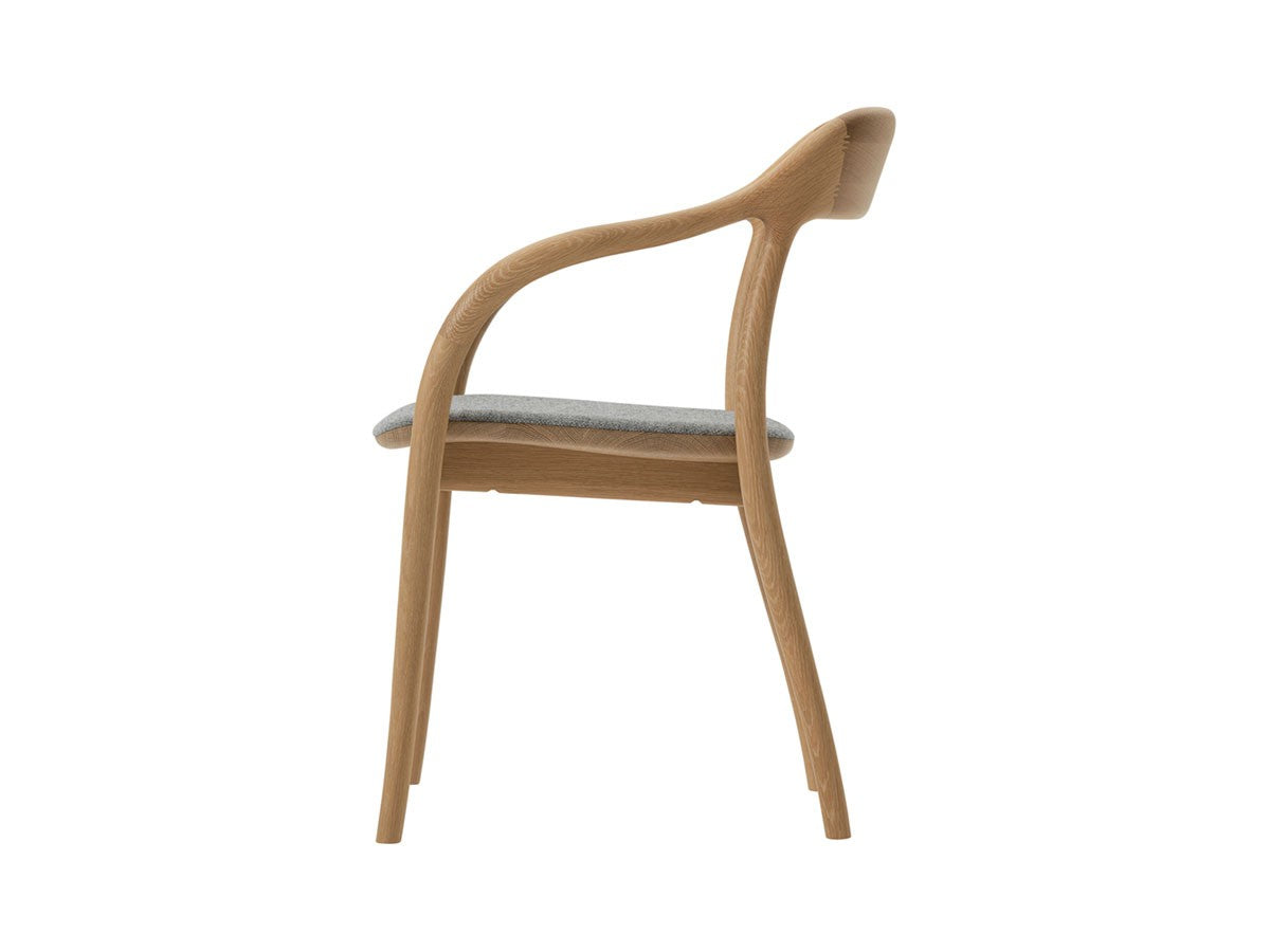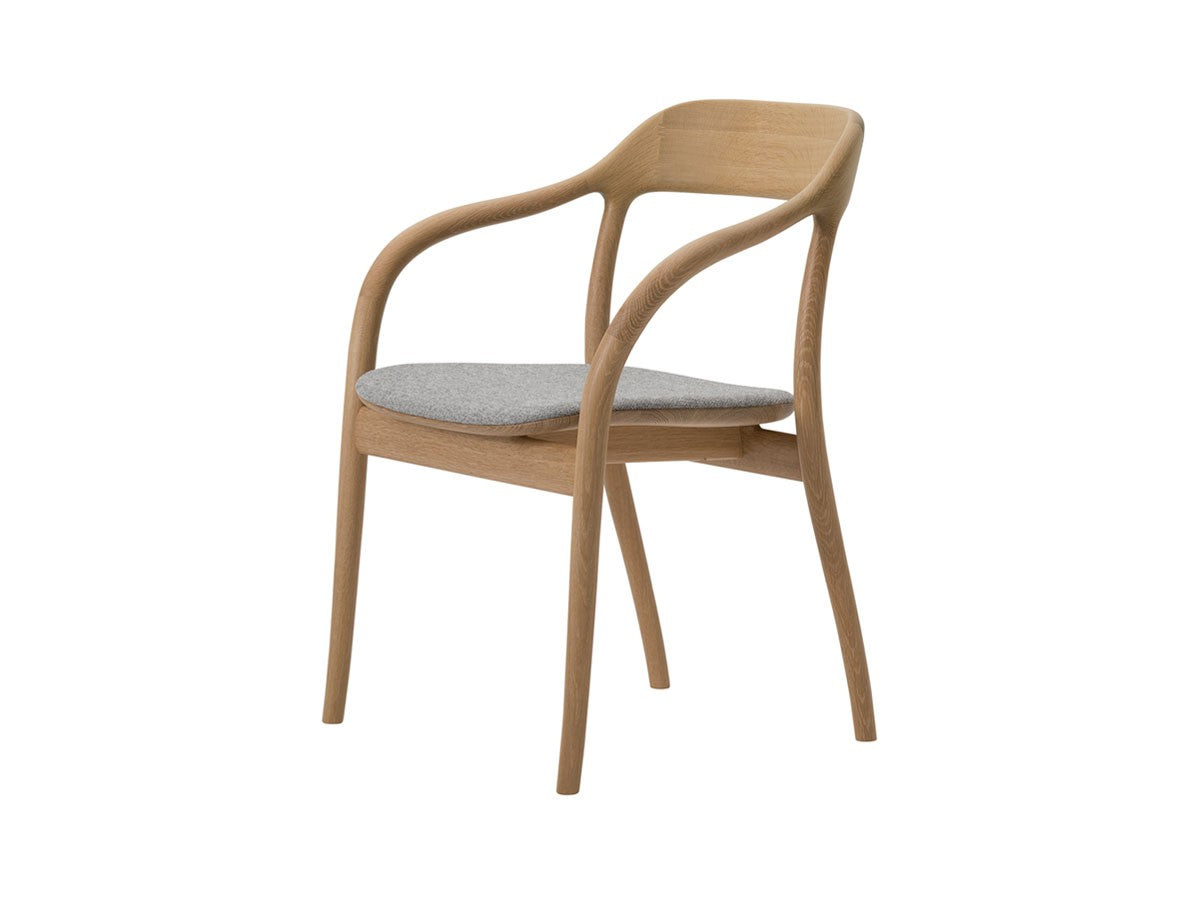 国際的に活躍するデザイナーの深澤直人による、彫刻のように木を削り出すことで生まれたアーム付きダイニングチェア。背もたれから枝分かれしたように繋がるフレームやしなやかなカーブを描いた座面形状、やわらかい曲線でかたちづくられたシルエットは、印象的でありながら清らかな静けさをまとっています。ゆとりのある広い座面と途切れのないなめらかなフレームが、ゆったりと包みこむように身体を支えます。ゆるやかに湾曲したアームはどの角度からも握りやすく、自然と手をそえたくなるような心地良さです。板座と張座(本商品)の2種類のバリエーションがあり、どちらもウェーブを描いたような美しい3次曲面に削り出された座板を使用しています。座面前方は緩やかに下方へ傾斜し、太もも裏への当たりが柔らかく圧迫感のない優しい座り心地。臀部があたる部分は緩やかにくぼみ、しっかりと身体にフィットします。板座の上に薄いクッションシートをのせた張座は、型に入れて発泡成形をするモールドウレタンを使用しています。座面の特徴を生かしつつ、よりクッション性のある掛け心地を実現。座るとゆっくりと沈み込む弾力性のあるウレタンです。