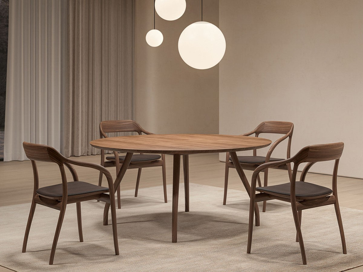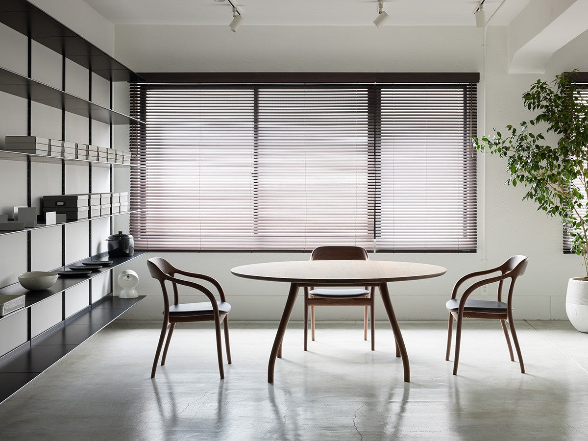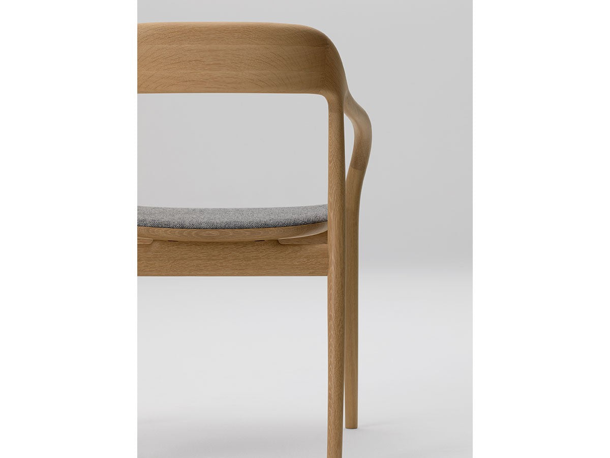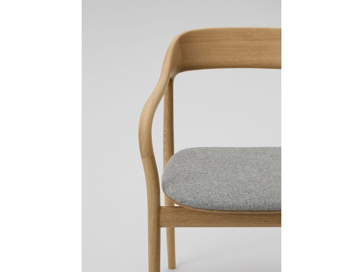 国際的に活躍するデザイナーの深澤直人による、彫刻のように木を削り出すことで生まれたアーム付きダイニングチェア。背もたれから枝分かれしたように繋がるフレームやしなやかなカーブを描いた座面形状、やわらかい曲線でかたちづくられたシルエットは、印象的でありながら清らかな静けさをまとっています。ゆとりのある広い座面と途切れのないなめらかなフレームが、ゆったりと包みこむように身体を支えます。ゆるやかに湾曲したアームはどの角度からも握りやすく、自然と手をそえたくなるような心地良さです。板座と張座(本商品)の2種類のバリエーションがあり、どちらもウェーブを描いたような美しい3次曲面に削り出された座板を使用しています。座面前方は緩やかに下方へ傾斜し、太もも裏への当たりが柔らかく圧迫感のない優しい座り心地。臀部があたる部分は緩やかにくぼみ、しっかりと身体にフィットします。板座の上に薄いクッションシートをのせた張座は、型に入れて発泡成形をするモールドウレタンを使用しています。座面の特徴を生かしつつ、よりクッション性のある掛け心地を実現。座るとゆっくりと沈み込む弾力性のあるウレタンです。