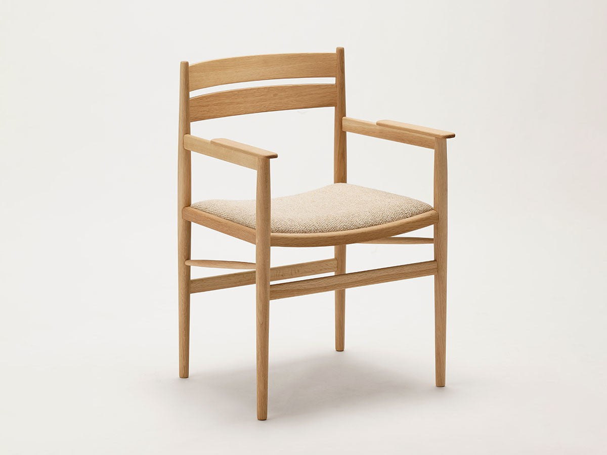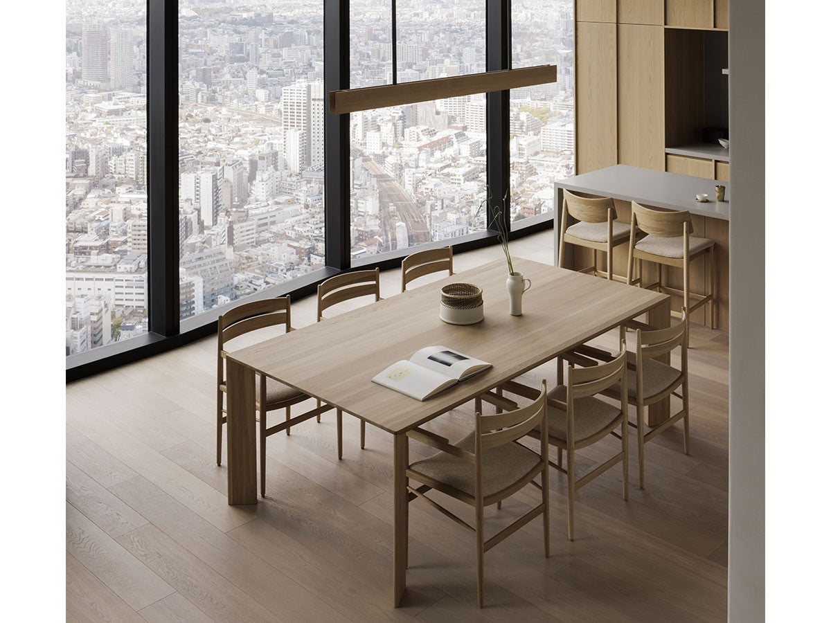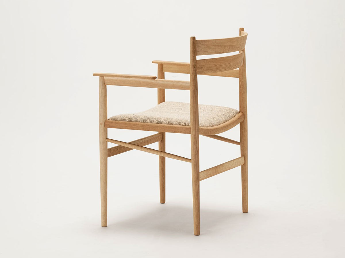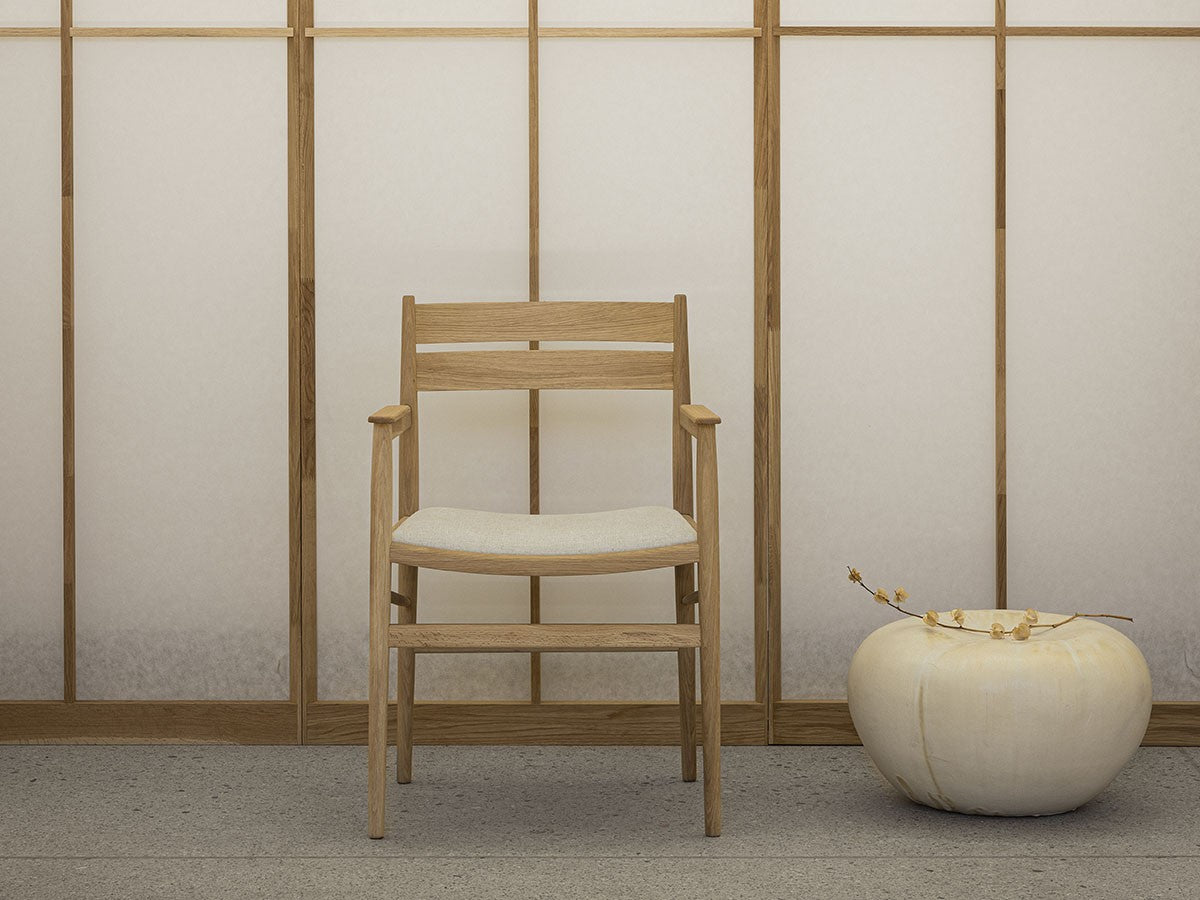 洗練された職人技と高度な機械技術による高い品質を誇るカリモクならではの「直線的な木製椅子を生みだす」というアイディアを起点としてデザインされたダイニングアームチェア。座面は張座仕様です。主に直線的な要素で作られたこのチェアは、補強材にアングルをかけることで、方向性と特長を表出しています。これにより背筋を正したくなるようなモダンな表情を持つ、インテリアスタイルを選ばないチェアとなっています。THE HIROO RESIDENCE PROJECT広尾コレクションは、緑豊かな公園に近く、健康的で明るい雰囲気をもつ広尾に位置する、住宅リノベーションプロジェクトの一室に備え付けられることを想定されてデザインされました。広尾レジデンスは「クラフテッド・スペース」と呼ばれる、手を掛けられるところはすべて手を掛けた空間プロジェクトです。芦沢啓治建築設計事務所がインテリアのリノベーションを行い、これを構成する要素として、北欧のデザインスタジオ、Norm Architects(ノームアーキテクツ)と協働し、数点のテイラーメイド家具を制作しました。これらがカリモクケースの8番目のコレクションを構成しています。本コレクションは、インテリアのテーマとして空間におけるノイズをなくすことを念頭に、長く過ごす場所としてふさわしいよう、より丁寧なシチュエーションづくりの一旦を担っています。