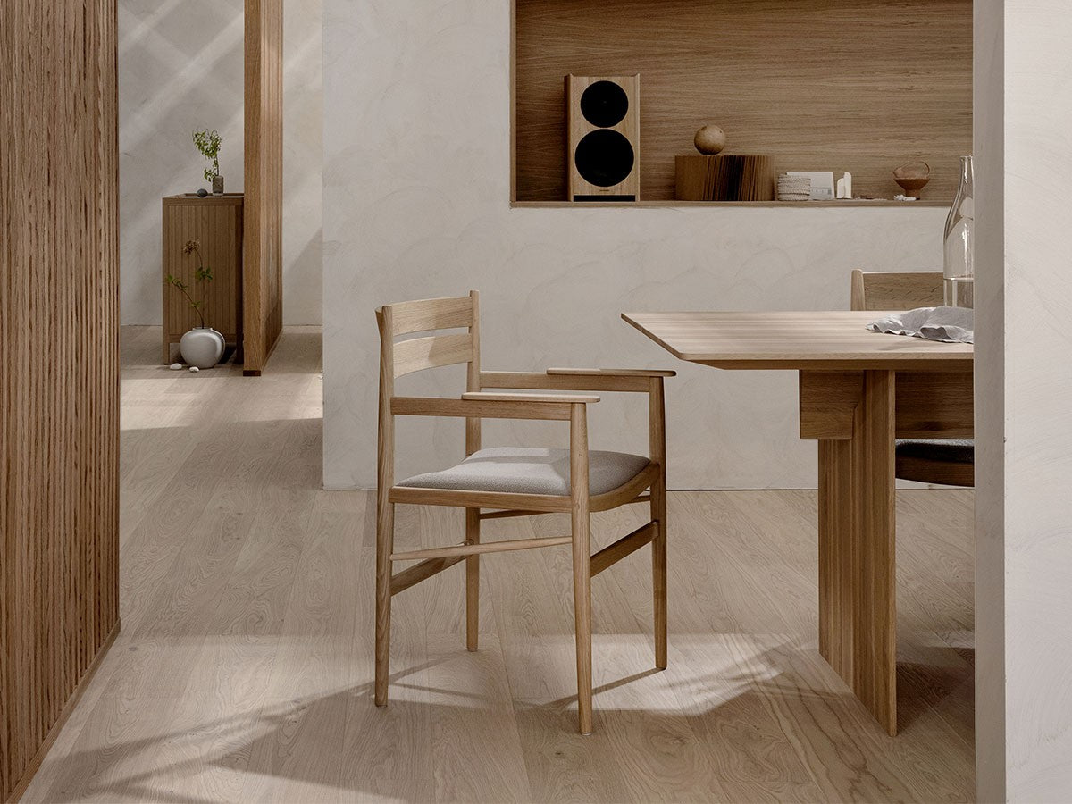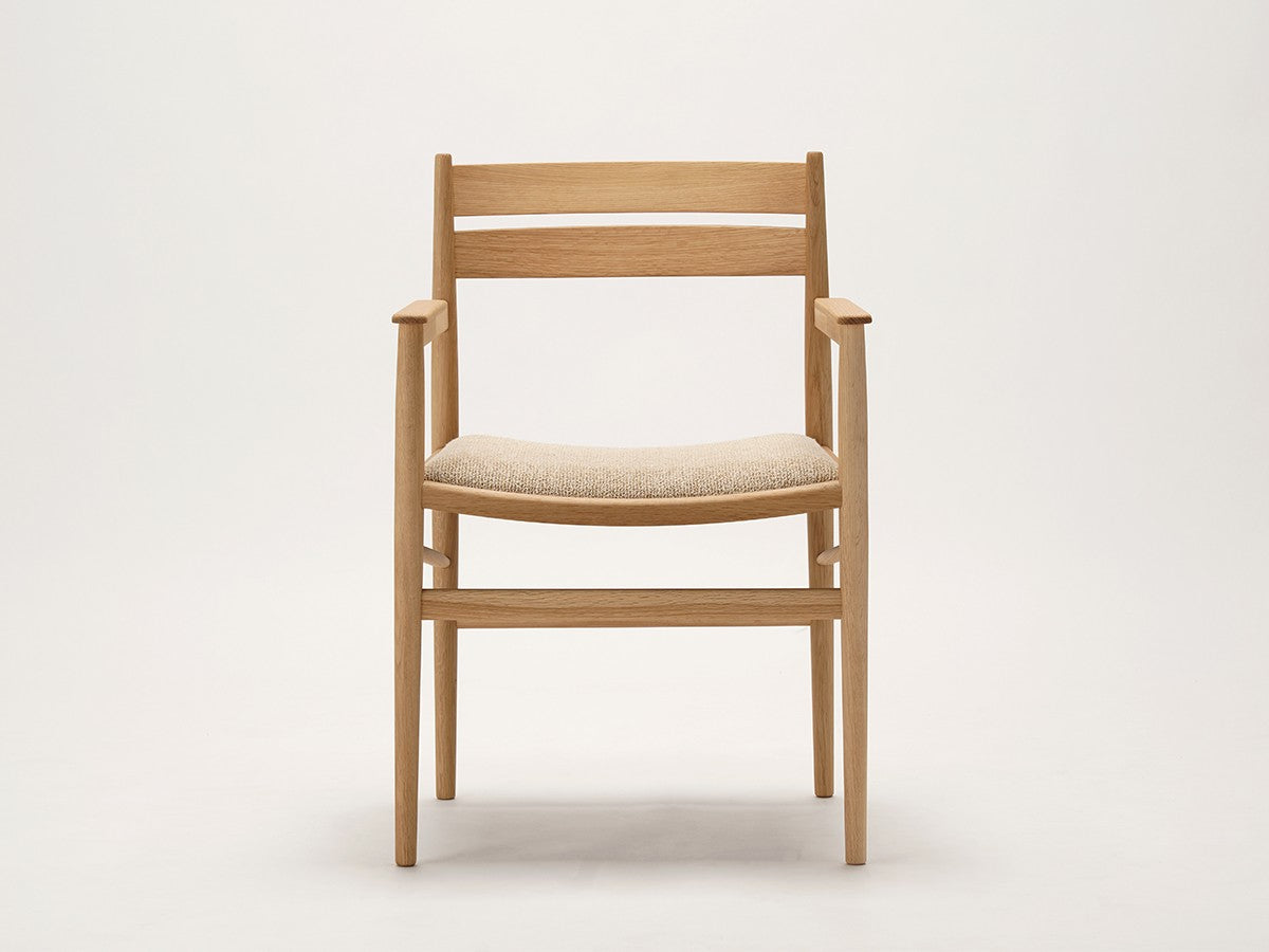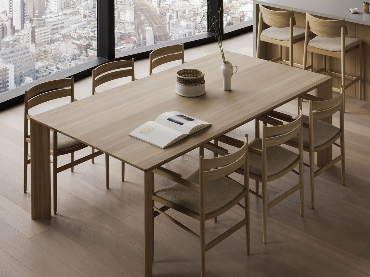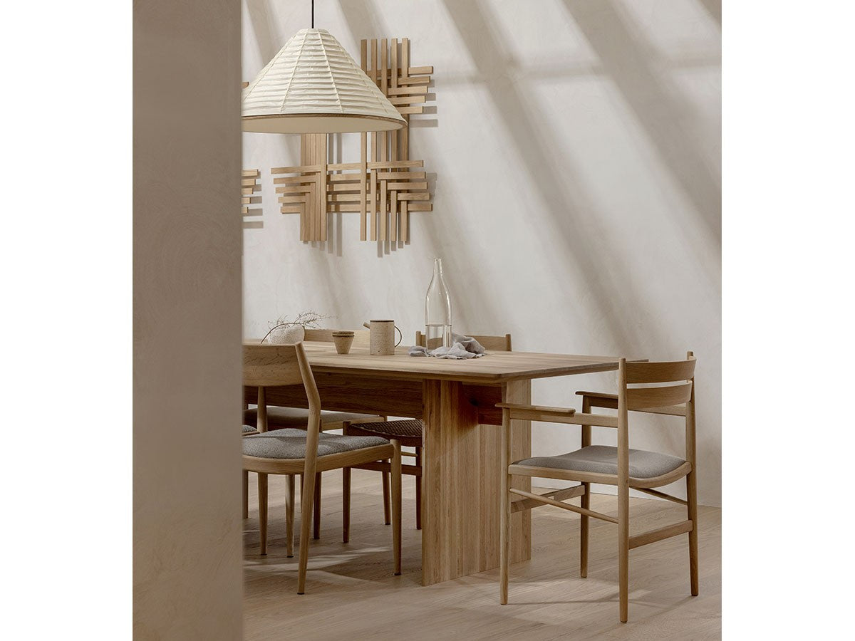 洗練された職人技と高度な機械技術による高い品質を誇るカリモクならではの「直線的な木製椅子を生みだす」というアイディアを起点としてデザインされたダイニングアームチェア。座面は張座仕様です。主に直線的な要素で作られたこのチェアは、補強材にアングルをかけることで、方向性と特長を表出しています。これにより背筋を正したくなるようなモダンな表情を持つ、インテリアスタイルを選ばないチェアとなっています。THE HIROO RESIDENCE PROJECT広尾コレクションは、緑豊かな公園に近く、健康的で明るい雰囲気をもつ広尾に位置する、住宅リノベーションプロジェクトの一室に備え付けられることを想定されてデザインされました。広尾レジデンスは「クラフテッド・スペース」と呼ばれる、手を掛けられるところはすべて手を掛けた空間プロジェクトです。芦沢啓治建築設計事務所がインテリアのリノベーションを行い、これを構成する要素として、北欧のデザインスタジオ、Norm Architects(ノームアーキテクツ)と協働し、数点のテイラーメイド家具を制作しました。これらがカリモクケースの8番目のコレクションを構成しています。本コレクションは、インテリアのテーマとして空間におけるノイズをなくすことを念頭に、長く過ごす場所としてふさわしいよう、より丁寧なシチュエーションづくりの一旦を担っています。