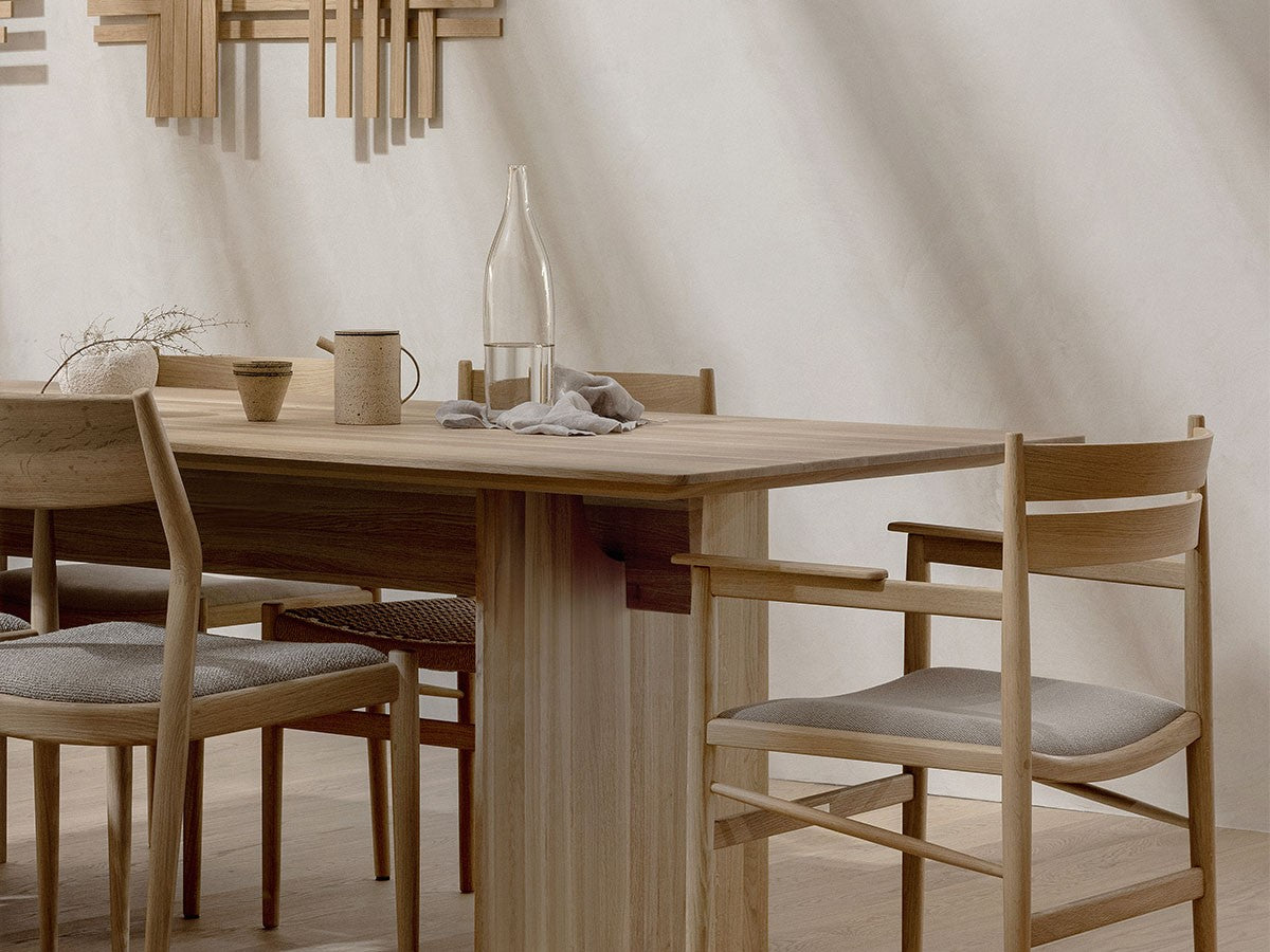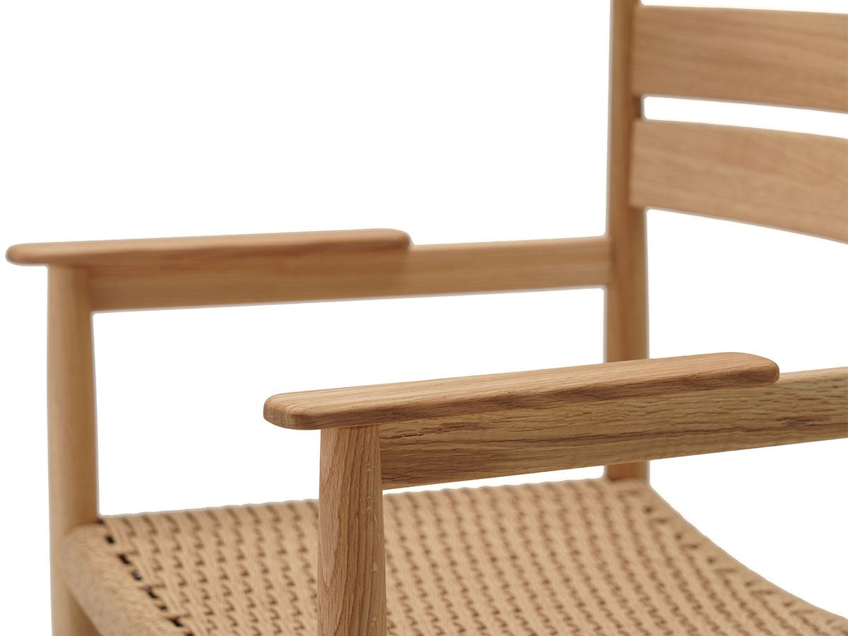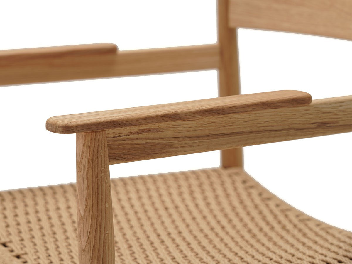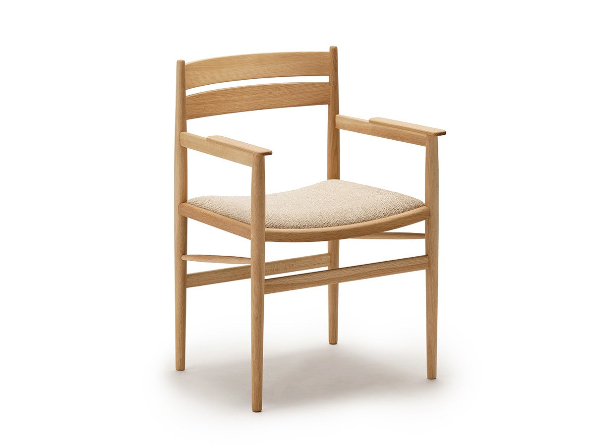 洗練された職人技と高度な機械技術による高い品質を誇るカリモクならではの「直線的な木製椅子を生みだす」というアイディアを起点としてデザインされたダイニングアームチェア。座面は張座仕様です。主に直線的な要素で作られたこのチェアは、補強材にアングルをかけることで、方向性と特長を表出しています。これにより背筋を正したくなるようなモダンな表情を持つ、インテリアスタイルを選ばないチェアとなっています。THE HIROO RESIDENCE PROJECT広尾コレクションは、緑豊かな公園に近く、健康的で明るい雰囲気をもつ広尾に位置する、住宅リノベーションプロジェクトの一室に備え付けられることを想定されてデザインされました。広尾レジデンスは「クラフテッド・スペース」と呼ばれる、手を掛けられるところはすべて手を掛けた空間プロジェクトです。芦沢啓治建築設計事務所がインテリアのリノベーションを行い、これを構成する要素として、北欧のデザインスタジオ、Norm Architects(ノームアーキテクツ)と協働し、数点のテイラーメイド家具を制作しました。これらがカリモクケースの8番目のコレクションを構成しています。本コレクションは、インテリアのテーマとして空間におけるノイズをなくすことを念頭に、長く過ごす場所としてふさわしいよう、より丁寧なシチュエーションづくりの一旦を担っています。