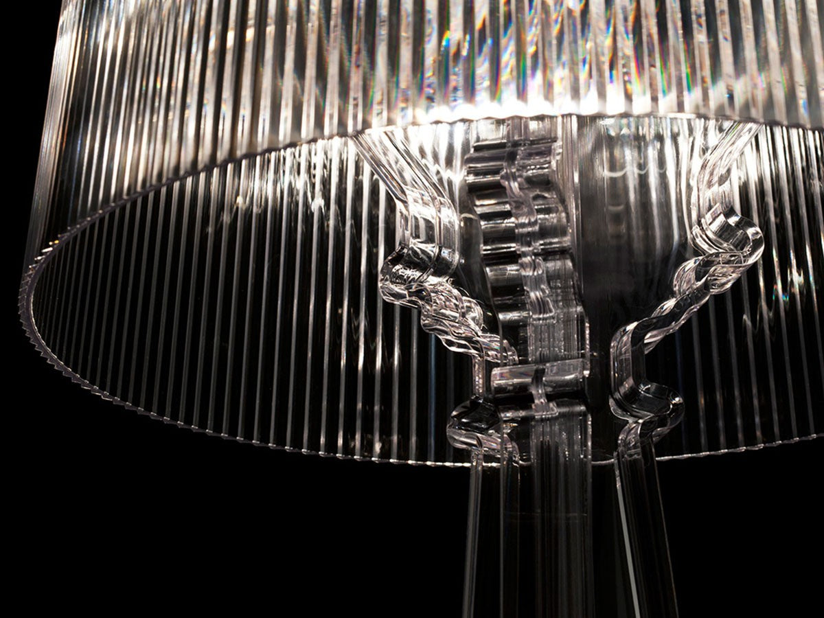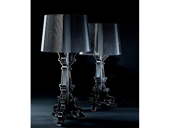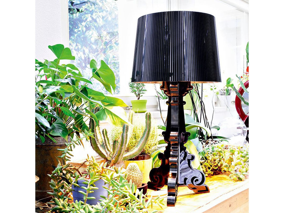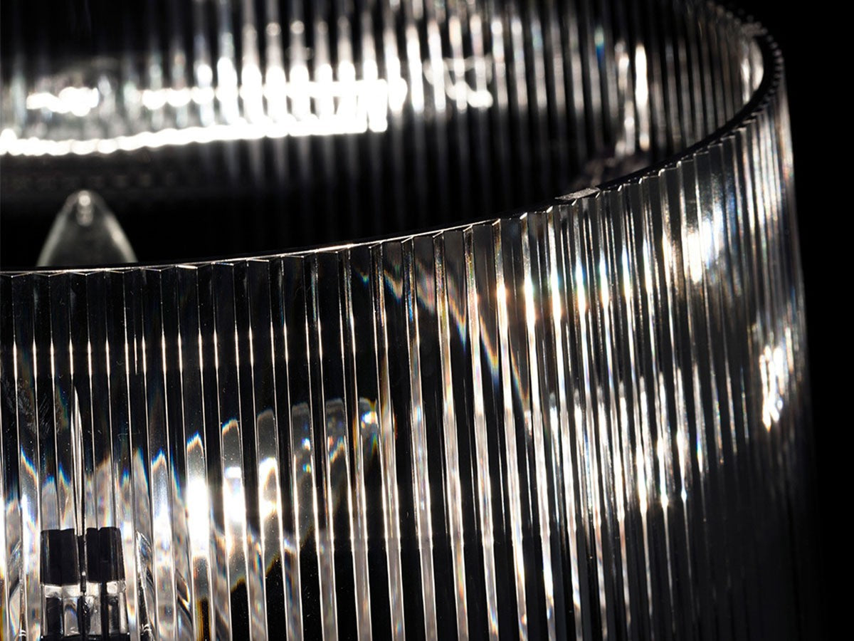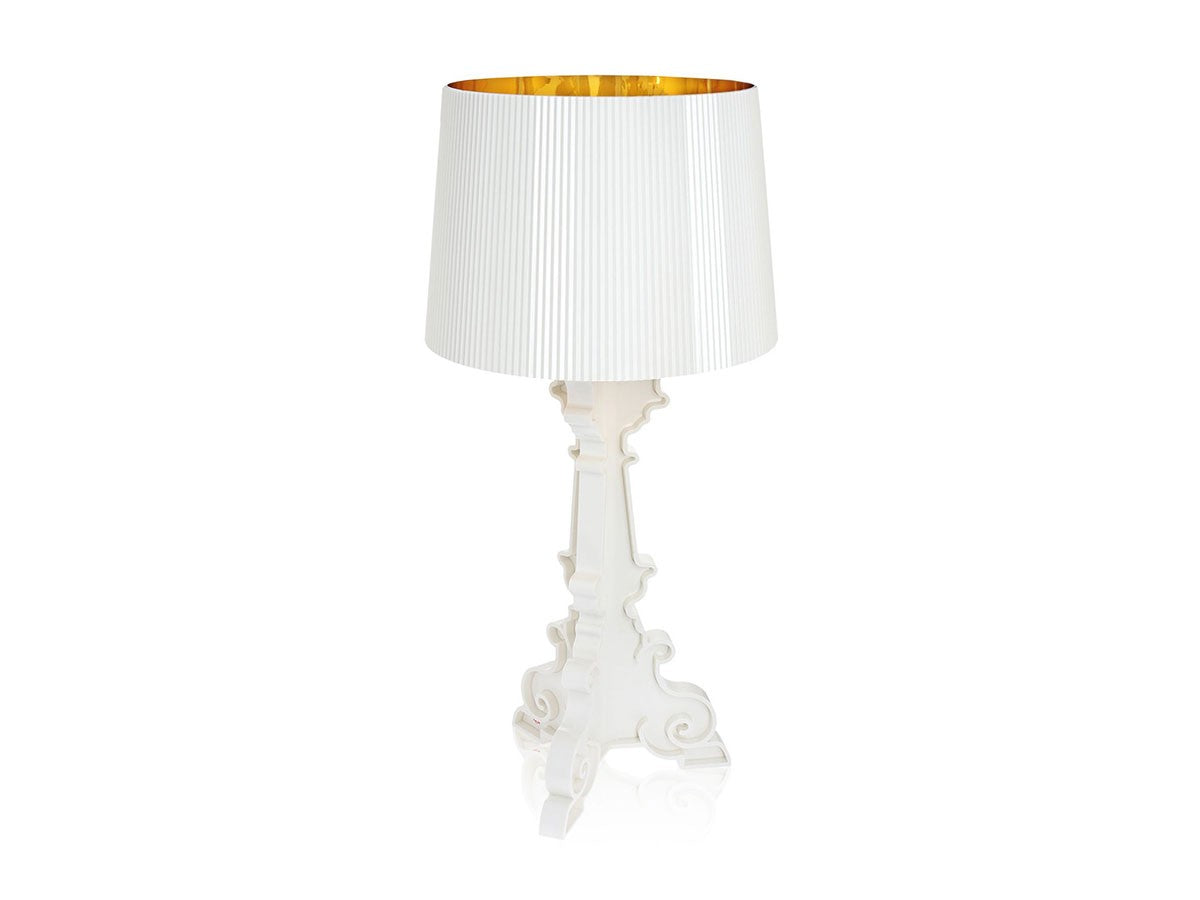 バロック調モチーフの3枚のベースがフレームを構成しているテーブルランプ。大きめのシェードにはプリーツ装飾がされており、点灯すると神秘的な光を放ちます。シェードは高さを68cm、73cm、78cmの3通りに調節が可能。ベッドやソファーのサイドテーブルに、フロアに直接おいてインテリア装飾に、読書用ランプにと、高さ調整をすることにより、好みと用途に合わせ様々な場面でご使用いただけます。