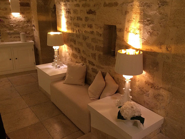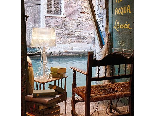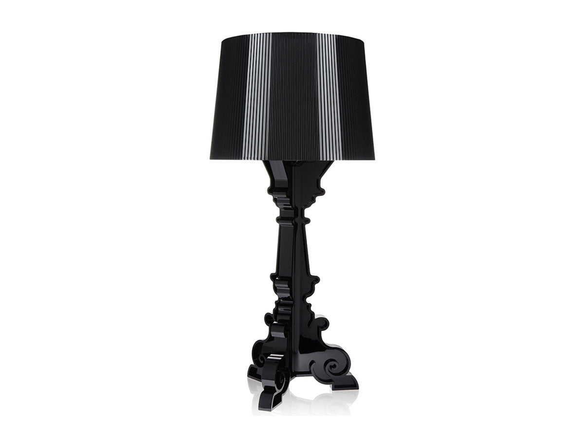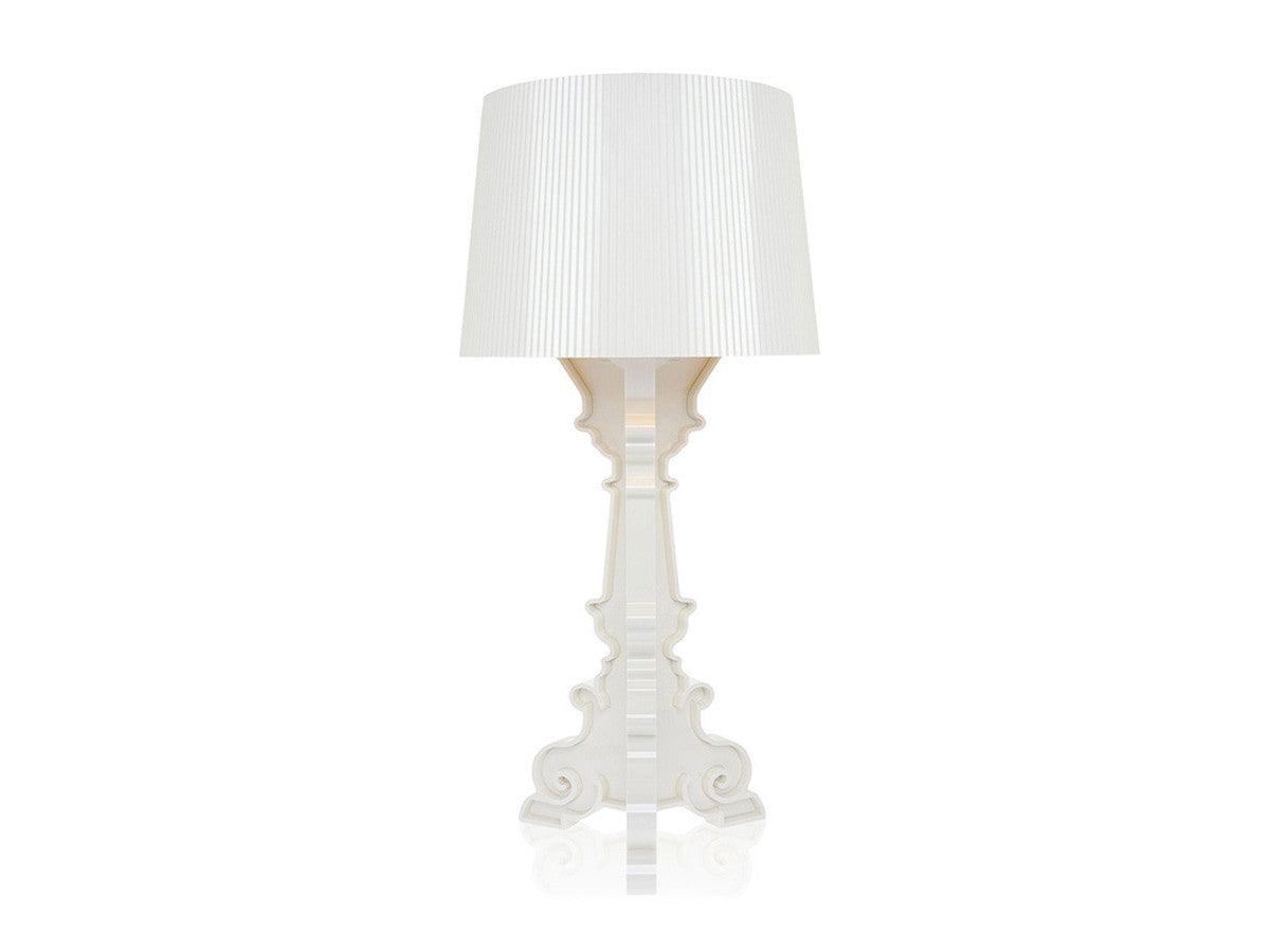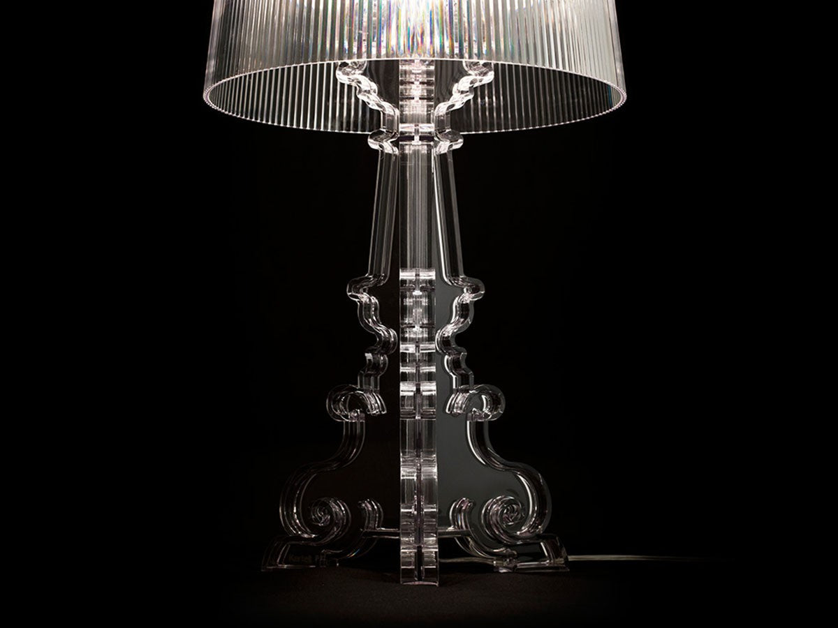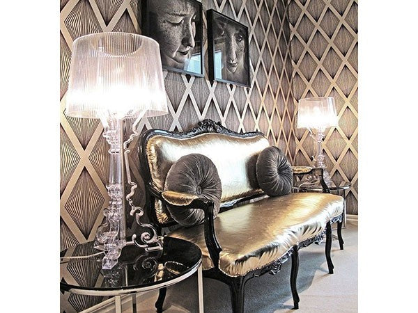 バロック調モチーフの3枚のベースがフレームを構成しているテーブルランプ。大きめのシェードにはプリーツ装飾がされており、点灯すると神秘的な光を放ちます。シェードは高さを68cm、73cm、78cmの3通りに調節が可能。ベッドやソファーのサイドテーブルに、フロアに直接おいてインテリア装飾に、読書用ランプにと、高さ調整をすることにより、好みと用途に合わせ様々な場面でご使用いただけます。