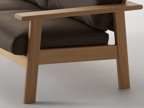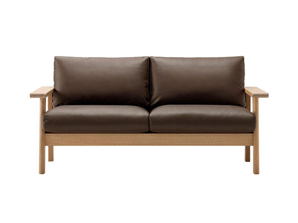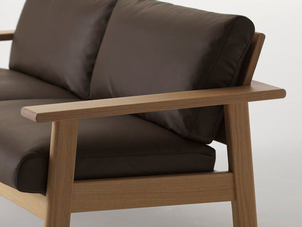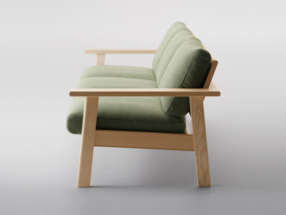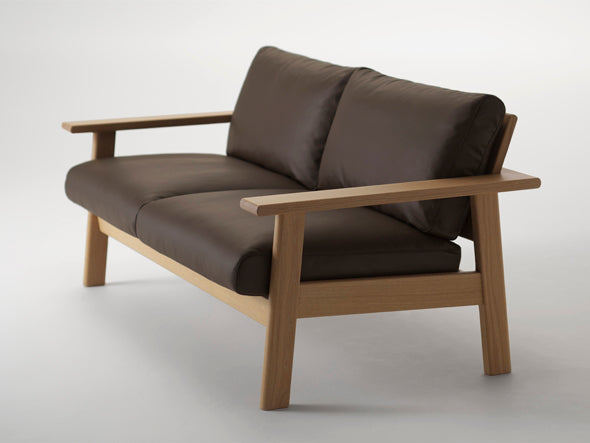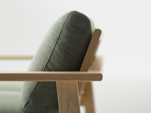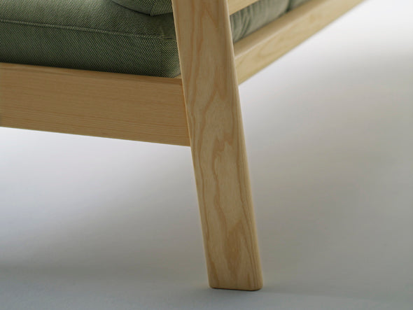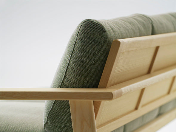 見えない構造部分にも木を使った木工メーカーならではのこだわりの二人掛けソファ。座り心地や快適さを考慮した木の構造体そのものが、さりげなく美しいフォルムを形成しています。座面の高さや背もたれの角度は検証が重ねられ、快適な座り心地を実現。ナチュラルな色合いの木フレームとファブリックの組み合わせはソファに新鮮な佇まいを与えます。クッションは羽毛や硬さの異なるウレタンフォームを層にし、体重負荷の異なる背と座ではそれぞれに合うものを厳選しています。