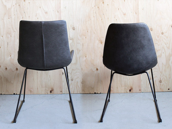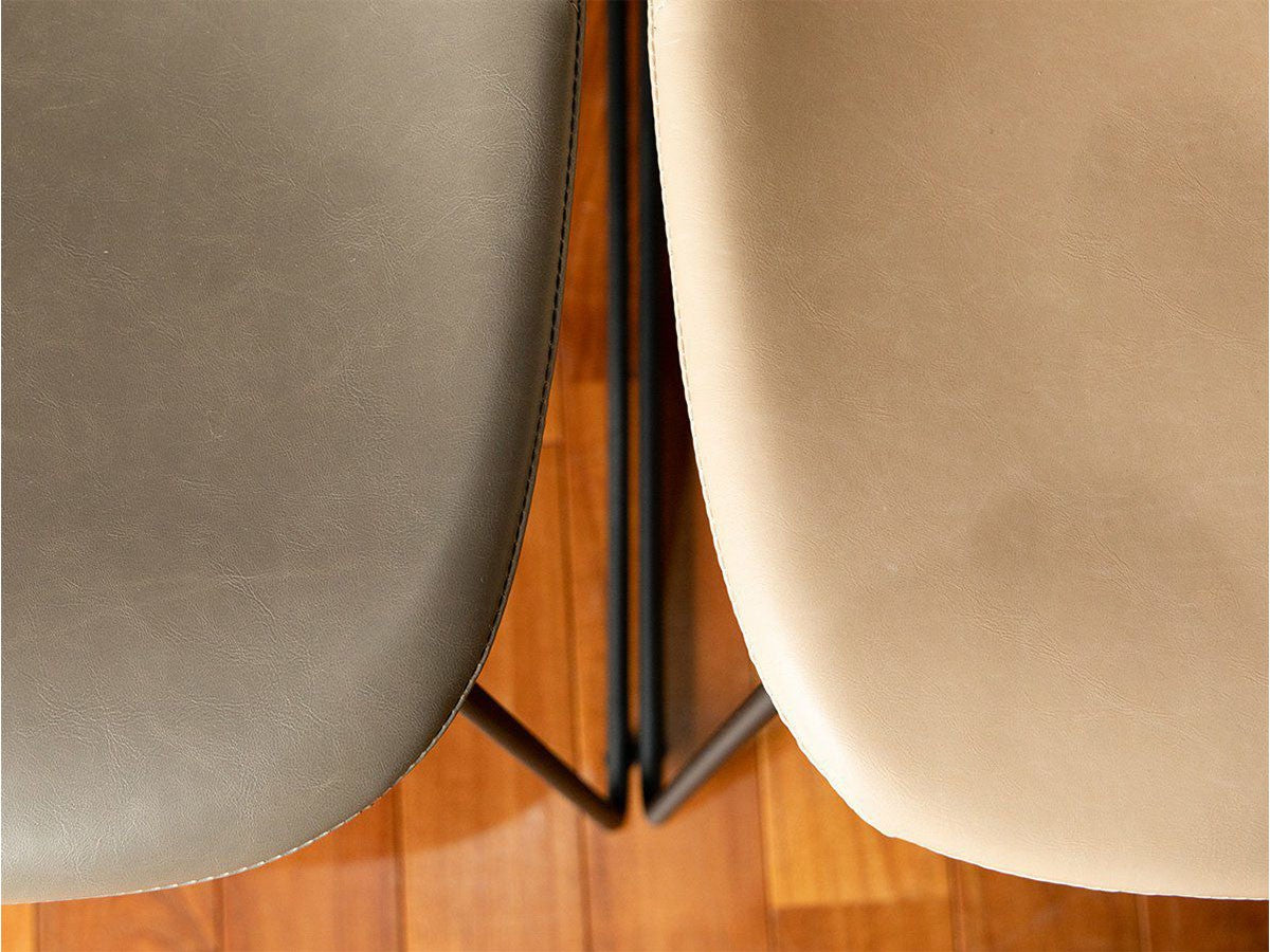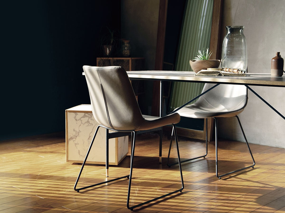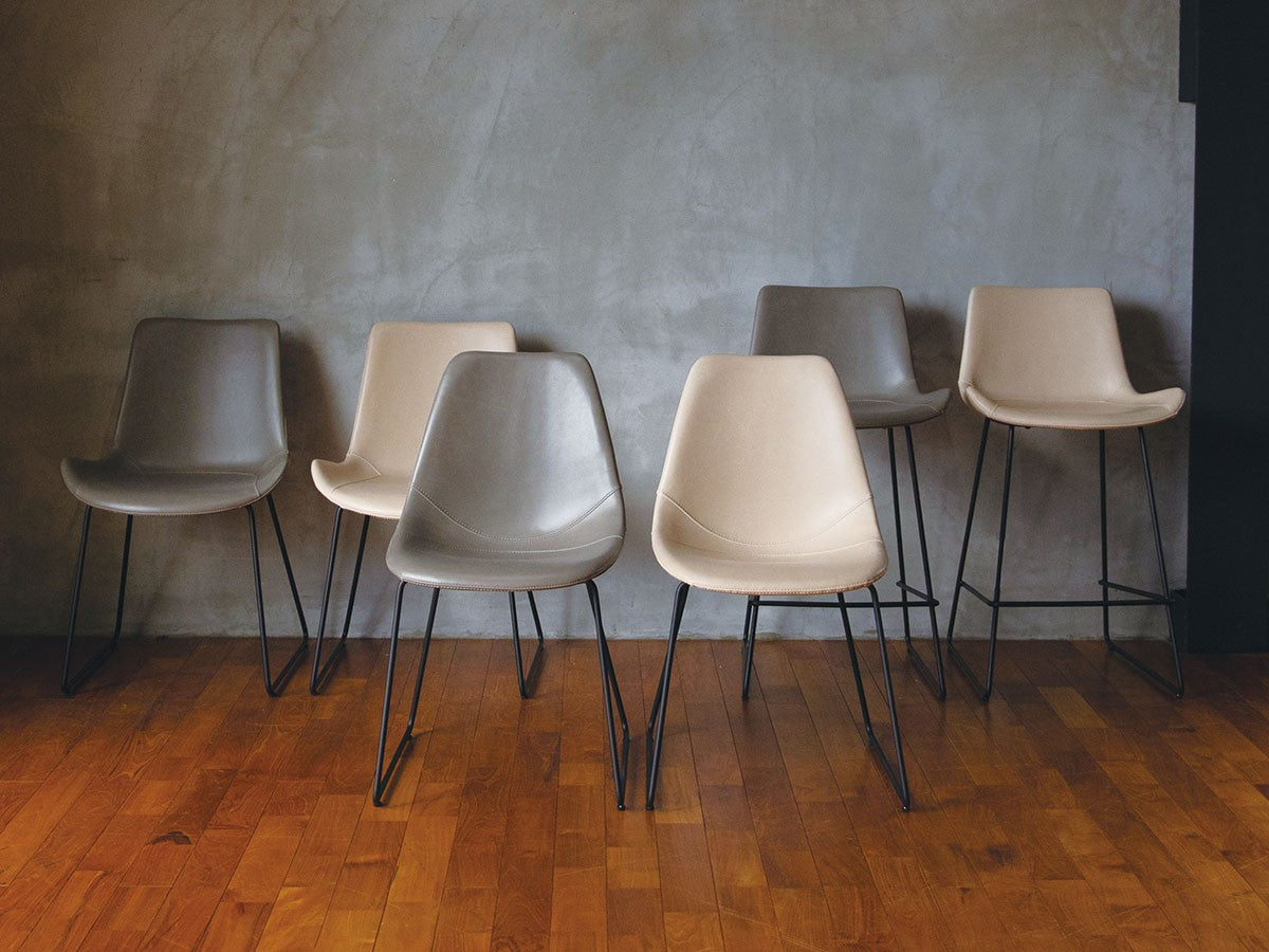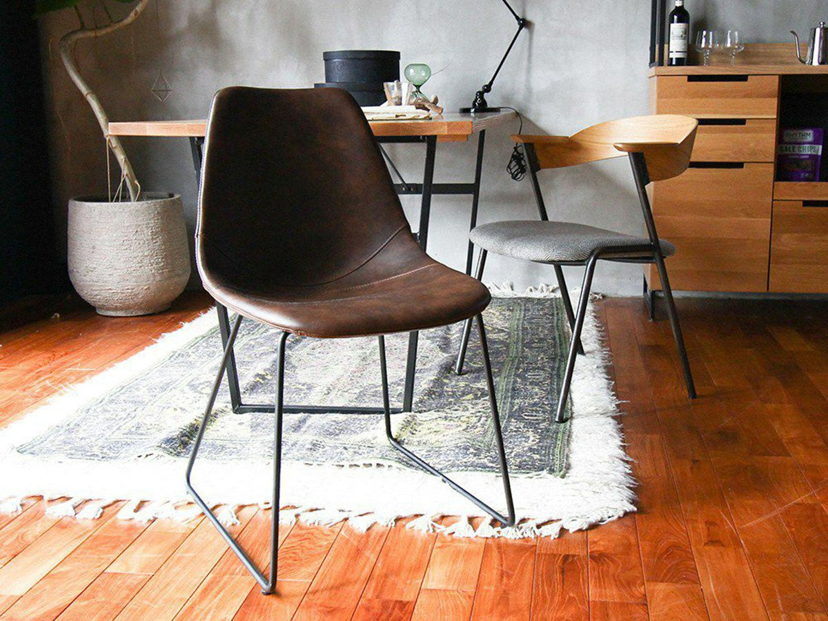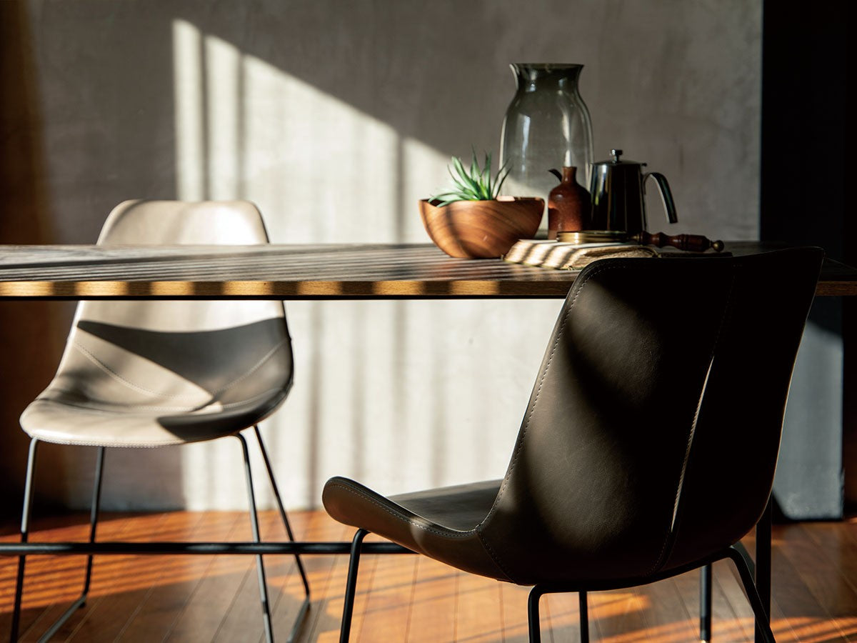 独特のムラ感を持つ合皮を使用したパニッシュチェア。絶妙なフォルムに成型加工されたシートは、包み込むような心地よいフィット感を生み出します。脚部には黒く焼き付けた細身のスチールを用いており、素材とフォルムのコントラストが多様なインテリアに溶け込むミックススタイルをつくりだしています。座面にはクッション性があり、張地には耐水性に優れた合皮を使用しています。固く絞った布巾でさっと拭くことができるため、メンテナンスも容易です。