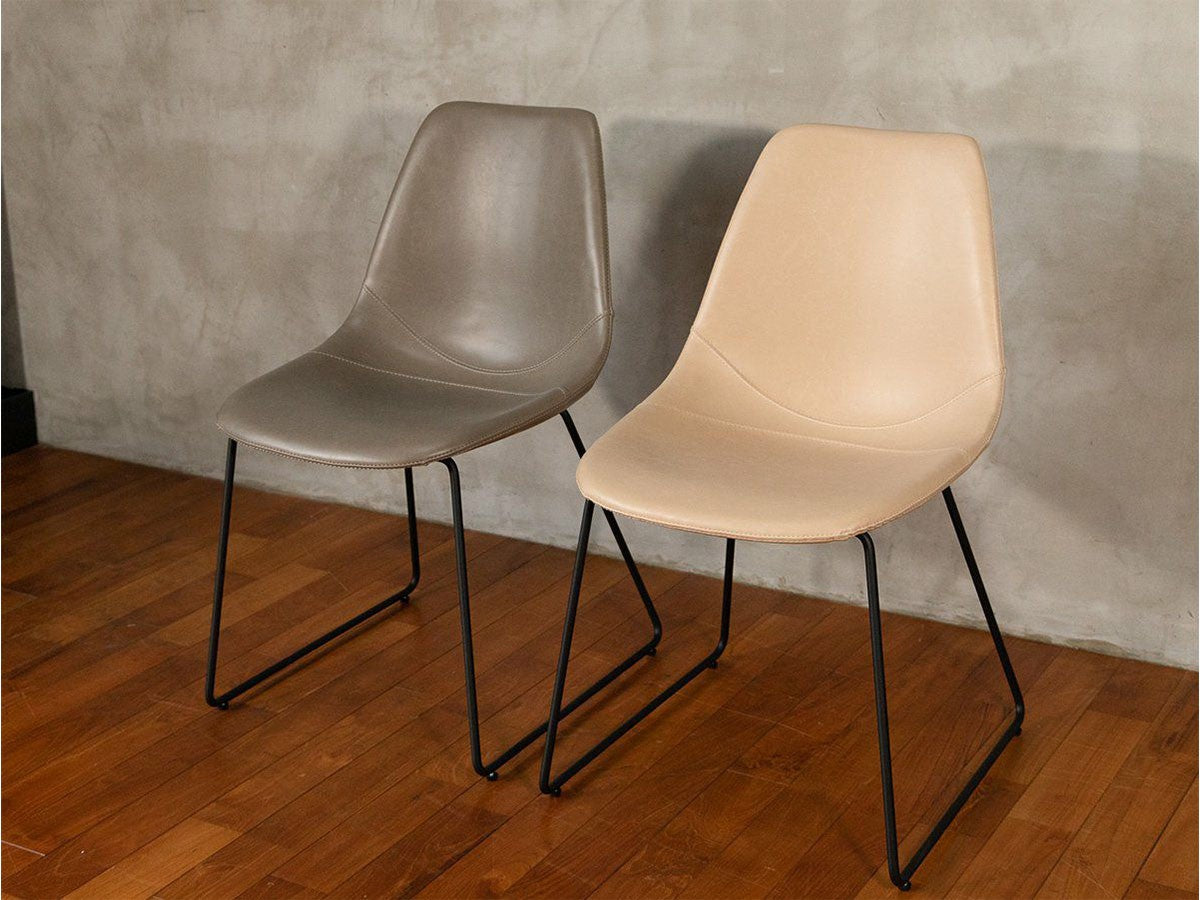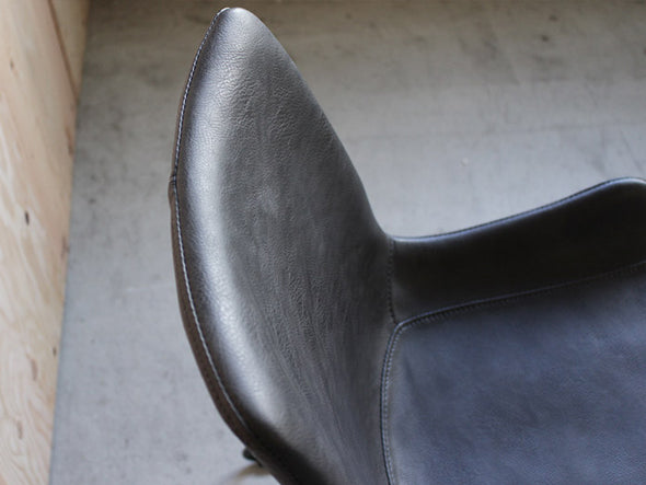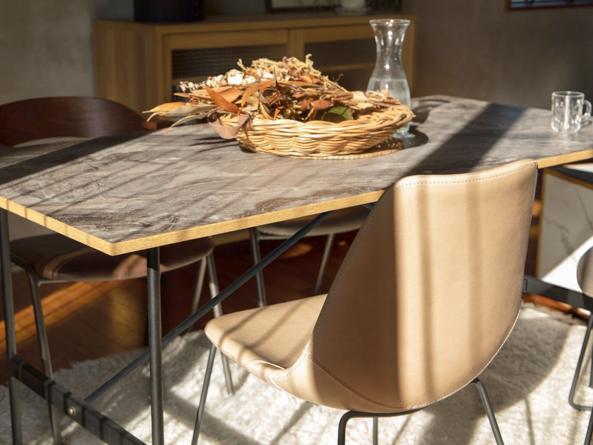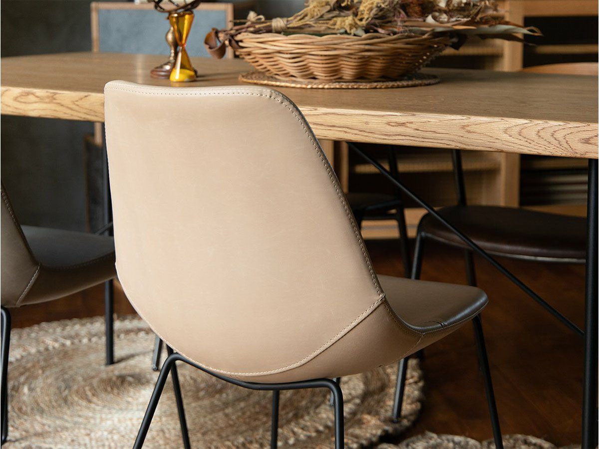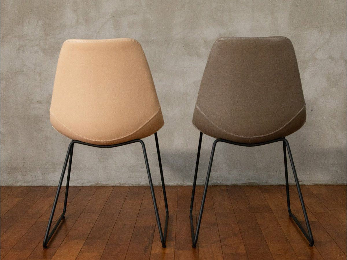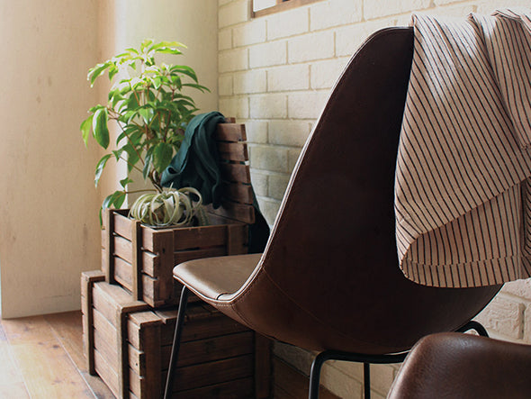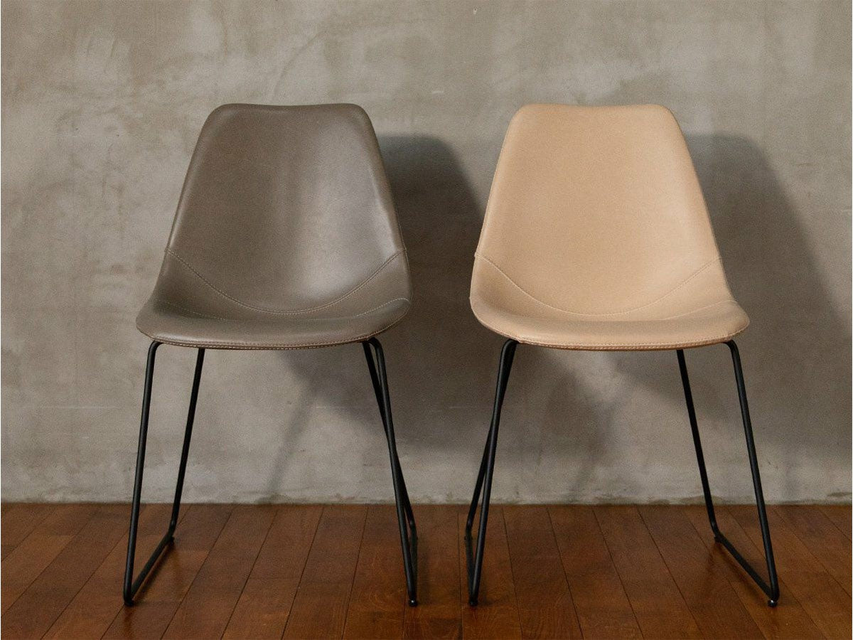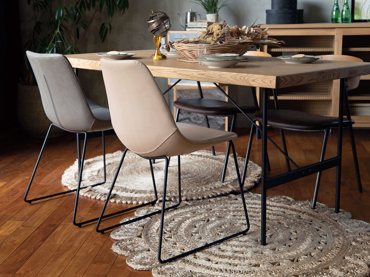 独特のムラ感を持つ合皮を使用したパニッシュチェア。絶妙なフォルムに成型加工されたシートは、包み込むような心地よいフィット感を生み出します。脚部には黒く焼き付けた細身のスチールを用いており、素材とフォルムのコントラストが多様なインテリアに溶け込むミックススタイルをつくりだしています。座面にはクッション性があり、張地には耐水性に優れた合皮を使用しています。固く絞った布巾でさっと拭くことができるため、メンテナンスも容易です。