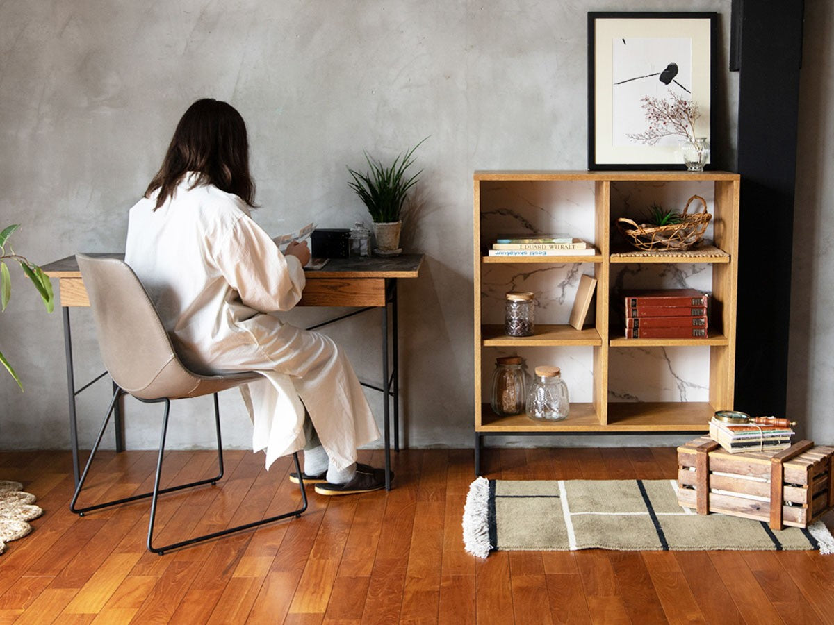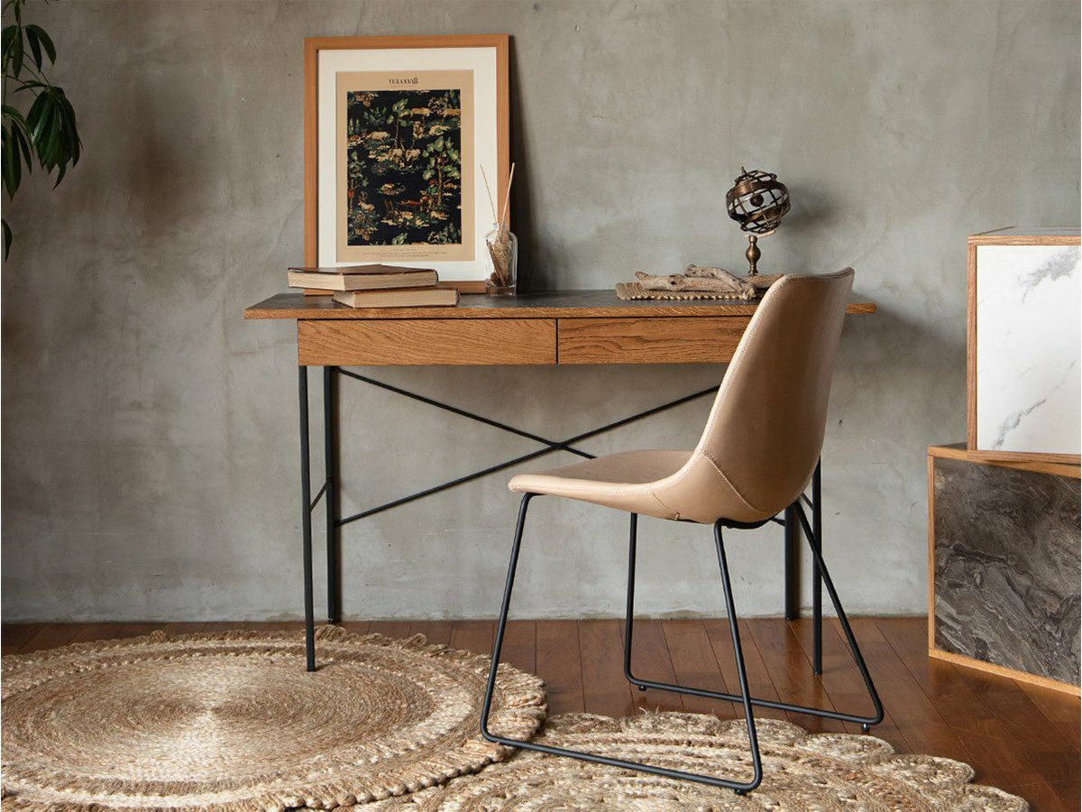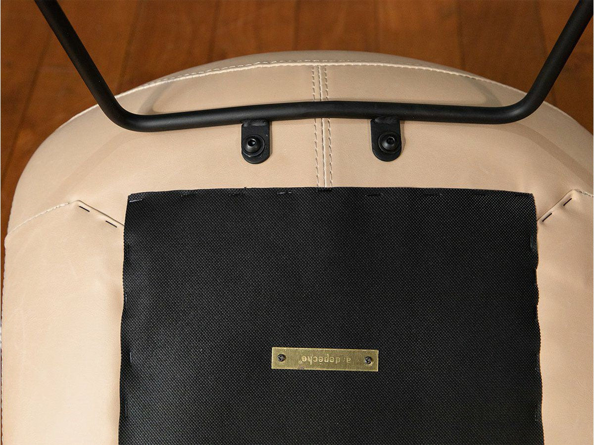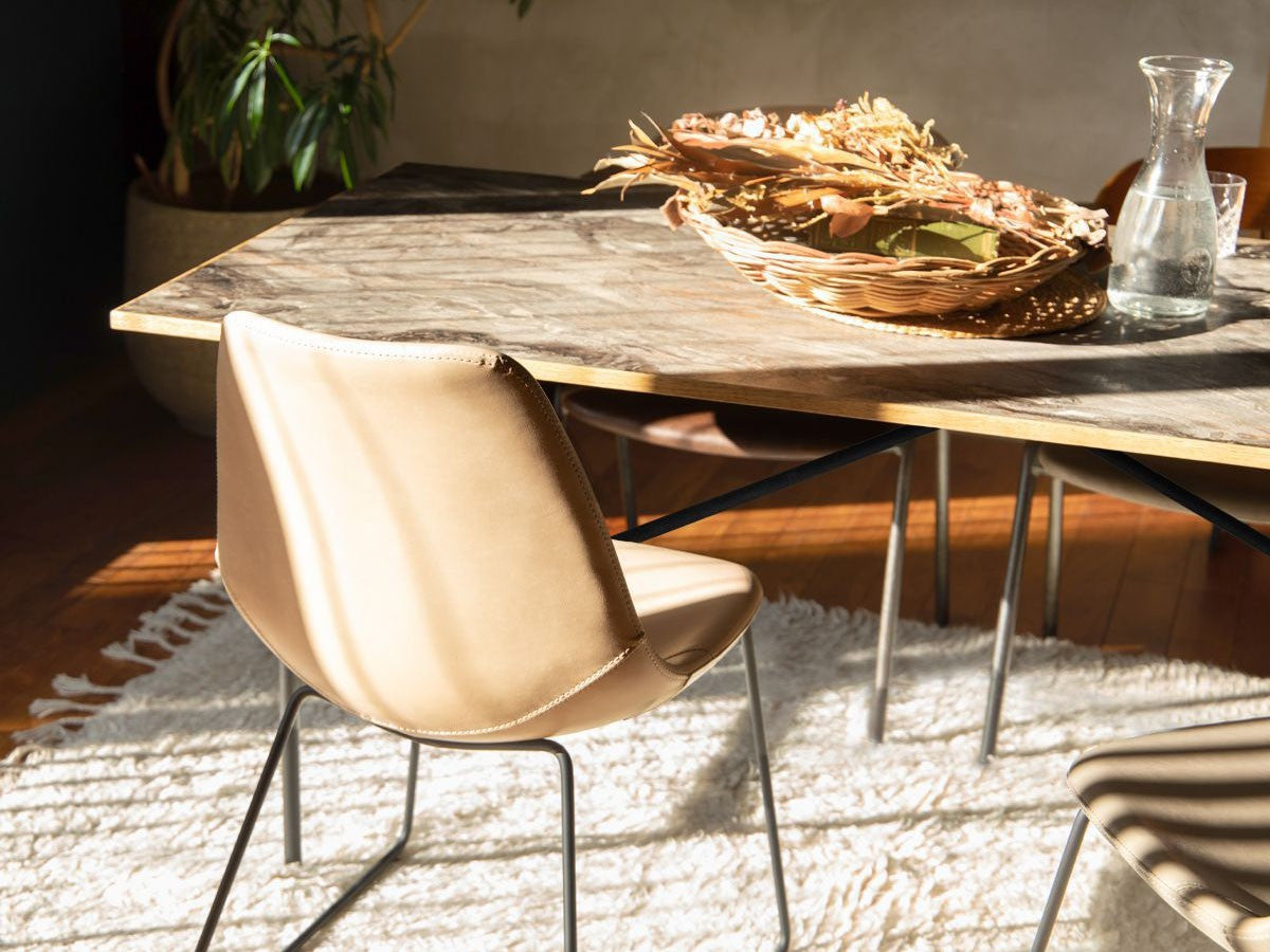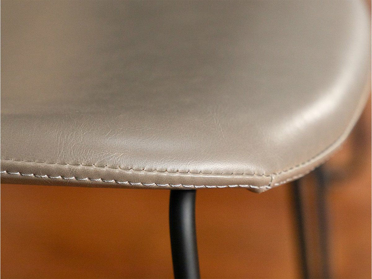 独特のムラ感を持つ合皮を使用したパニッシュチェア。絶妙なフォルムに成型加工されたシートは、包み込むような心地よいフィット感を生み出します。脚部には黒く焼き付けた細身のスチールを用いており、素材とフォルムのコントラストが多様なインテリアに溶け込むミックススタイルをつくりだしています。座面にはクッション性があり、張地には耐水性に優れた合皮を使用しています。固く絞った布巾でさっと拭くことができるため、メンテナンスも容易です。