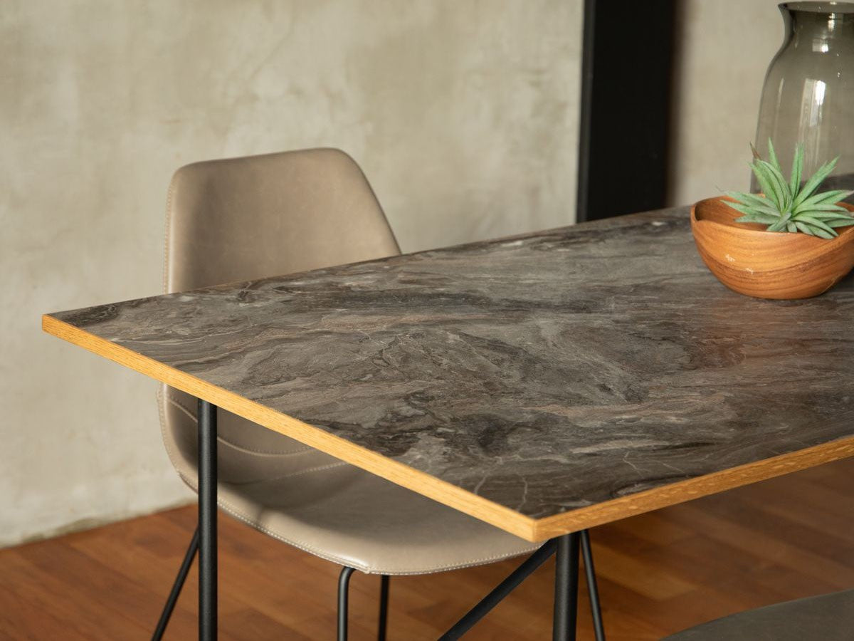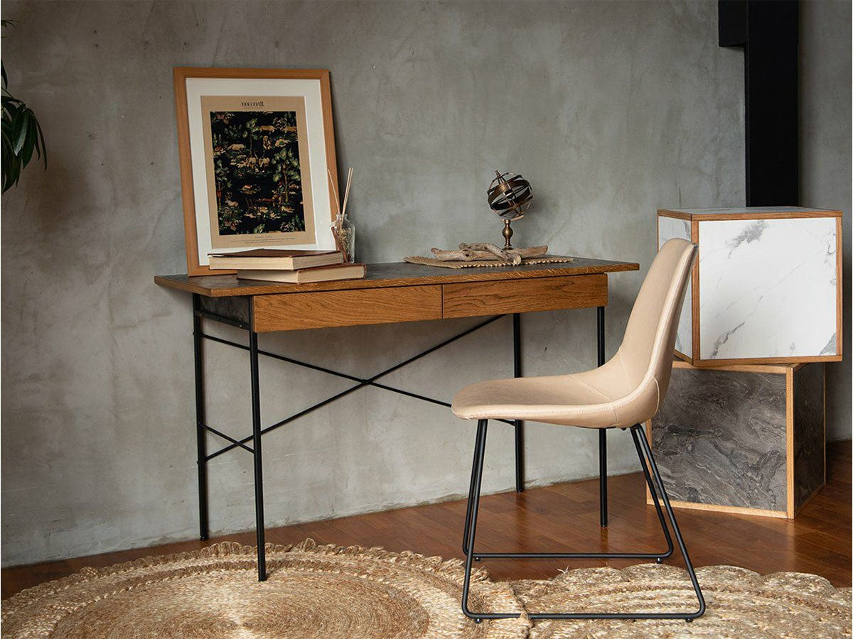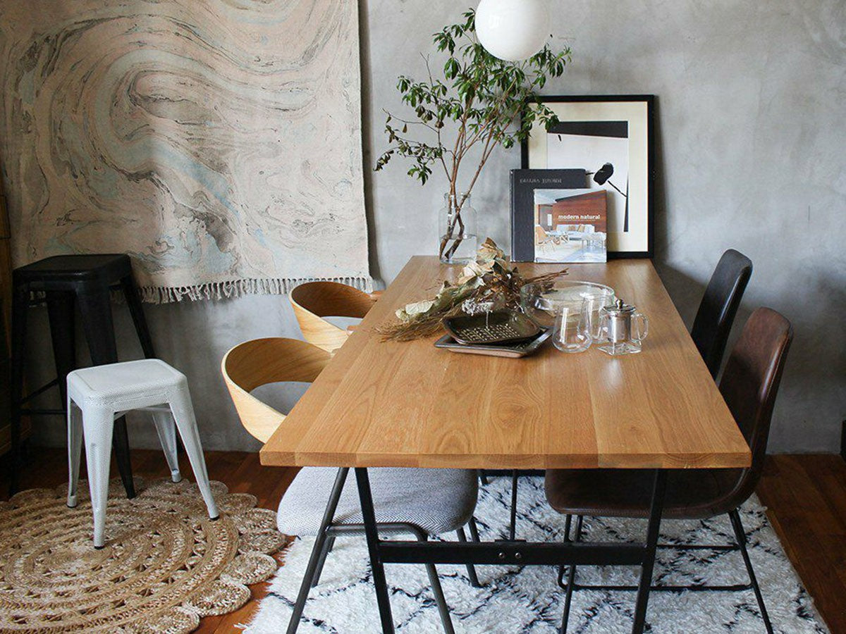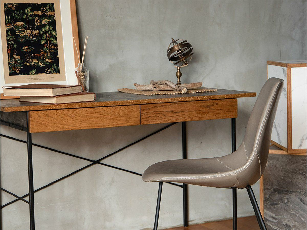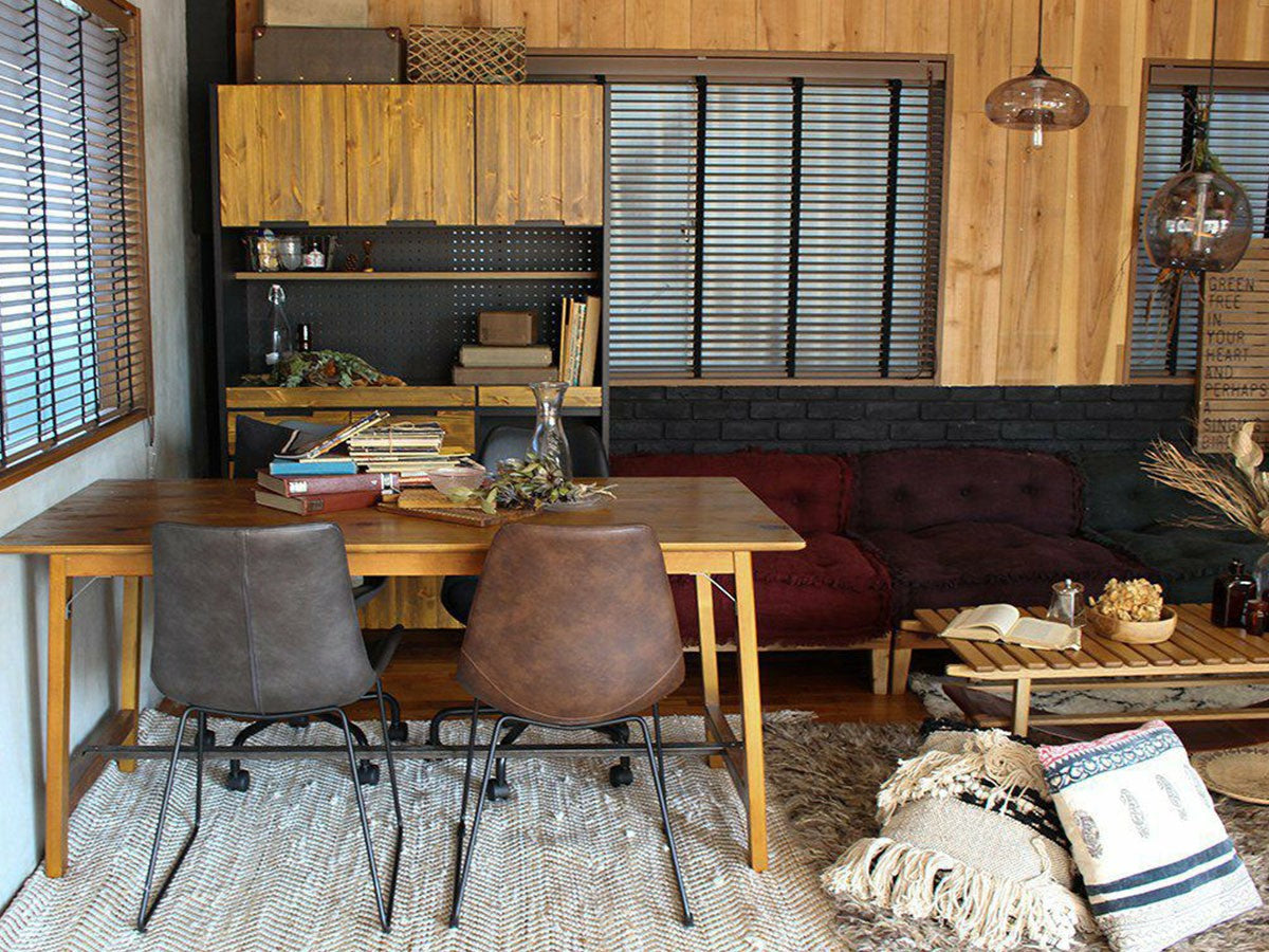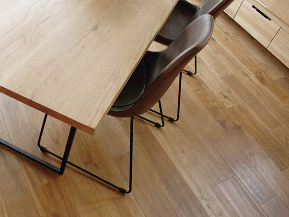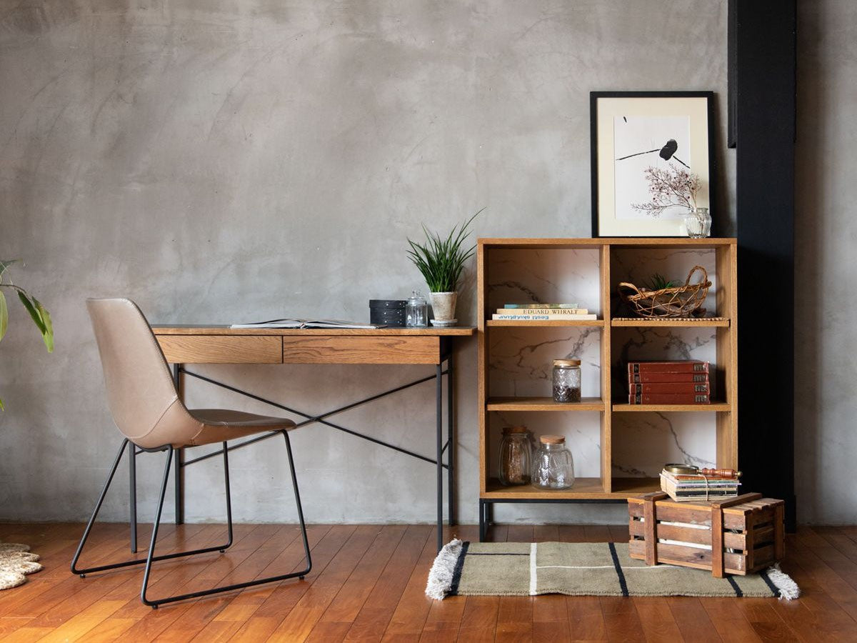 独特のムラ感を持つ合皮を使用したパニッシュチェア。絶妙なフォルムに成型加工されたシートは、包み込むような心地よいフィット感を生み出します。脚部には黒く焼き付けた細身のスチールを用いており、素材とフォルムのコントラストが多様なインテリアに溶け込むミックススタイルをつくりだしています。座面にはクッション性があり、張地には耐水性に優れた合皮を使用しています。固く絞った布巾でさっと拭くことができるため、メンテナンスも容易です。