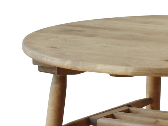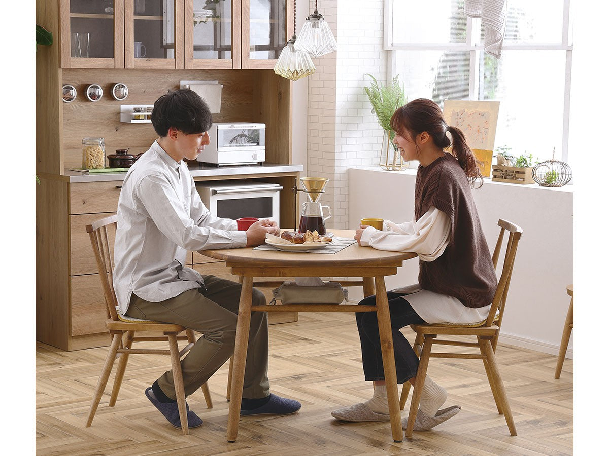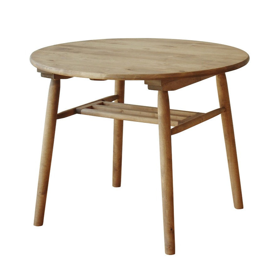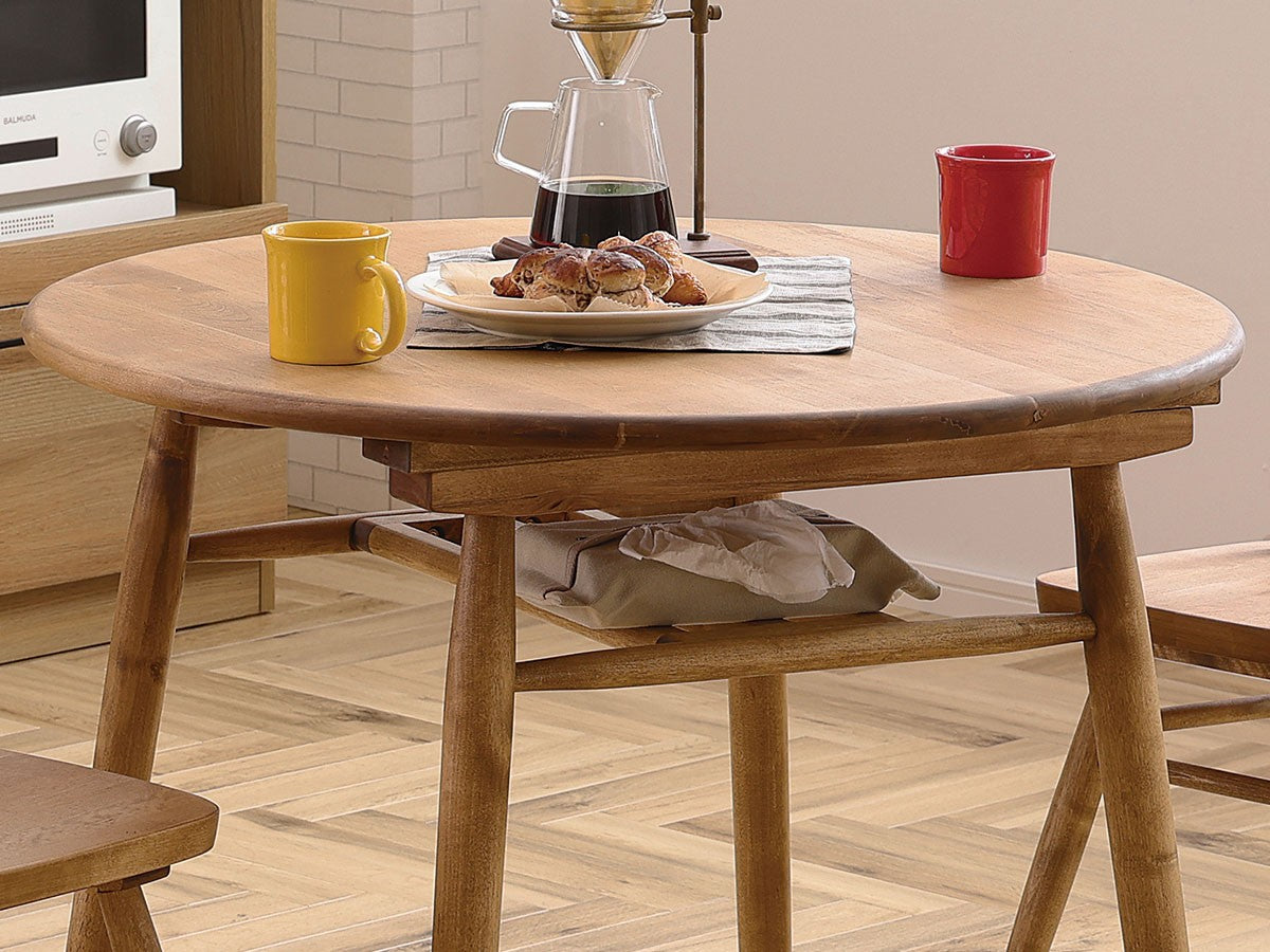 天板の縁に丸みのある面取りが施されたラウンドテーブル。中央をふっくらとさせた円柱状の脚部がより優しい印象を与えます。天板下の棚は、テーブルの上に散かりがちな雑誌や小物を片付ける際に活躍。食事の準備もスムーズに進みます。一人暮らしはもちろん、二人暮らしのコンパクトなダイニングにもおすすめです。