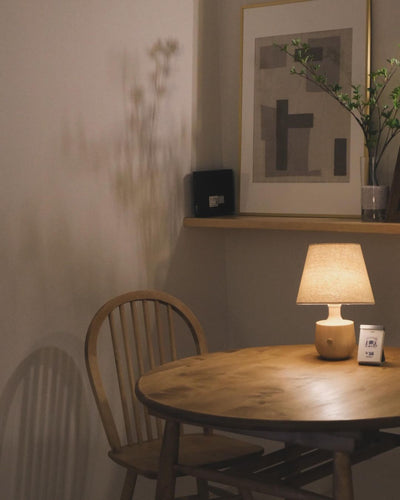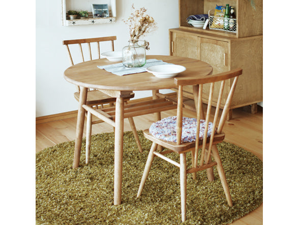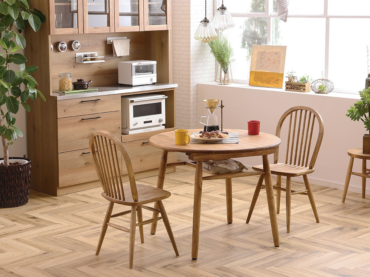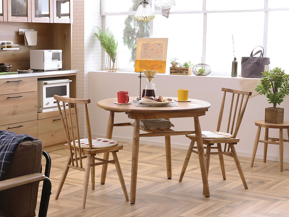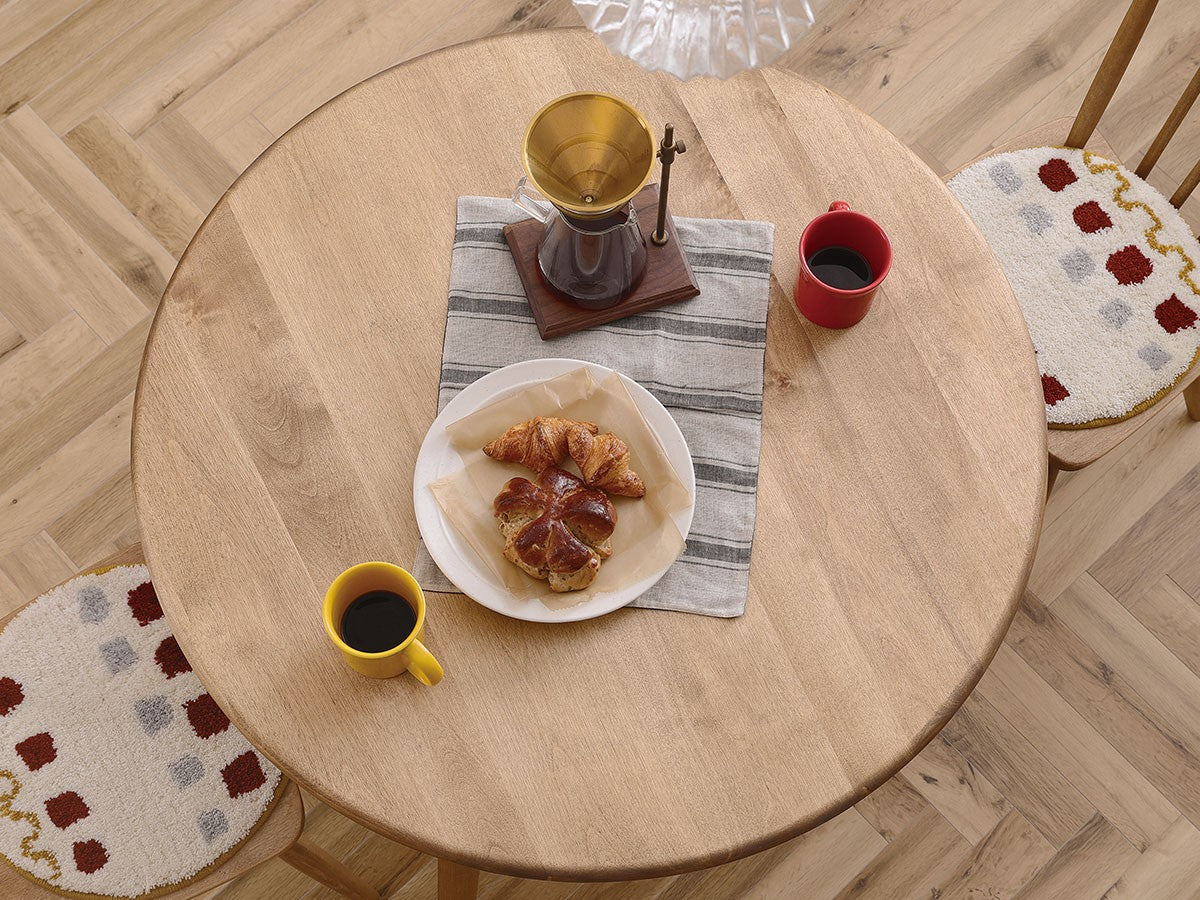 天板の縁に丸みのある面取りが施されたラウンドテーブル。中央をふっくらとさせた円柱状の脚部がより優しい印象を与えます。天板下の棚は、テーブルの上に散かりがちな雑誌や小物を片付ける際に活躍。食事の準備もスムーズに進みます。一人暮らしはもちろん、二人暮らしのコンパクトなダイニングにもおすすめです。