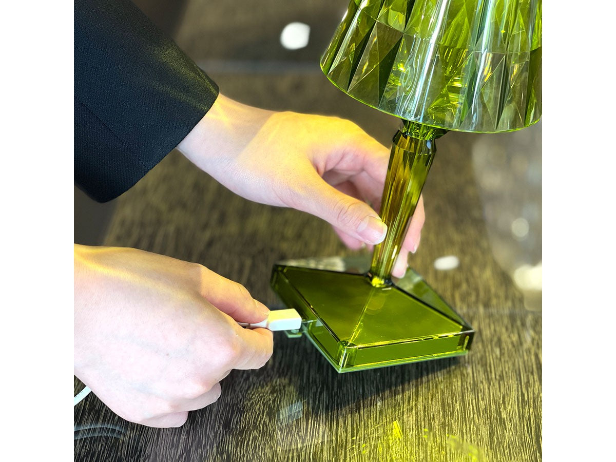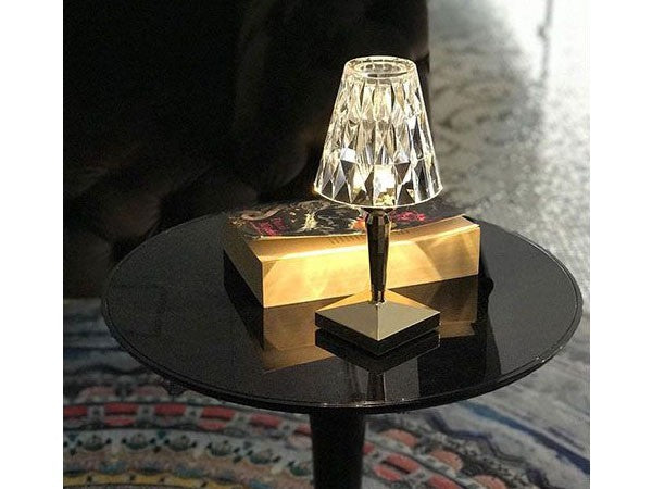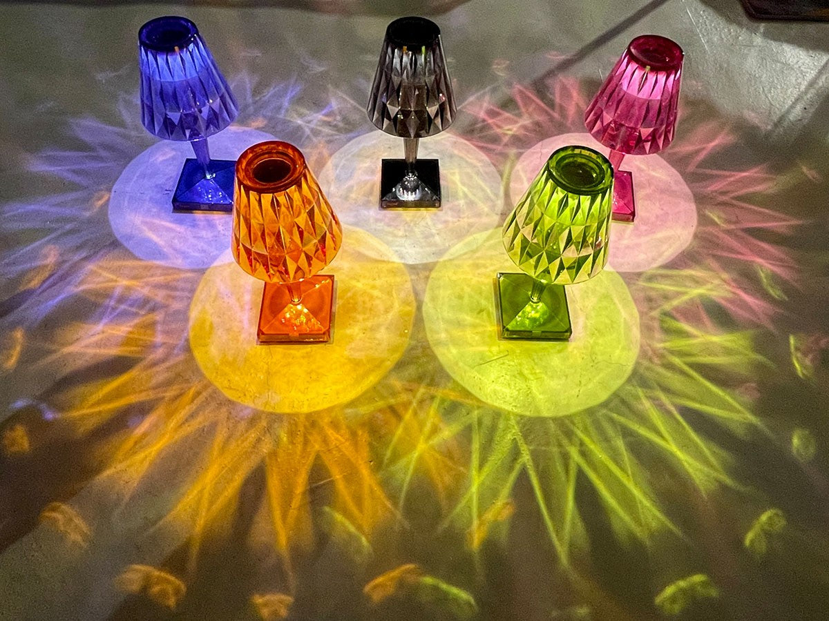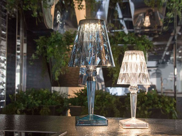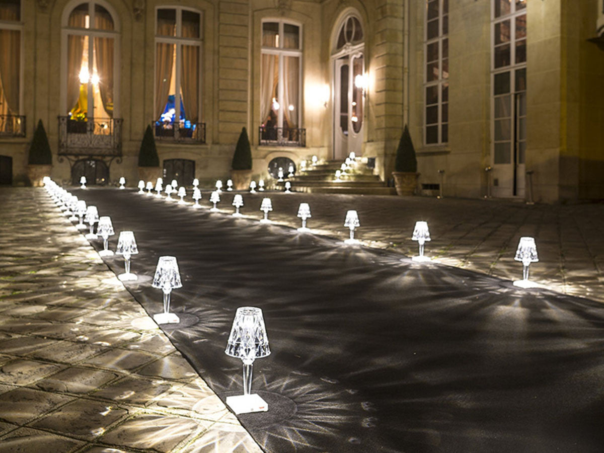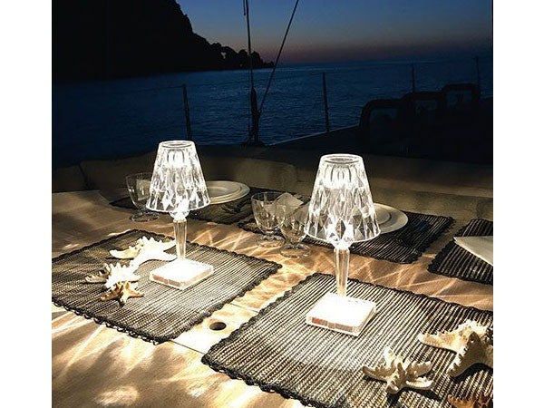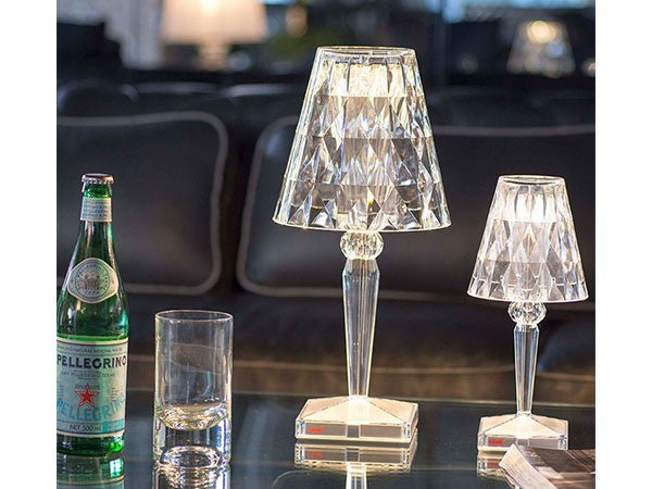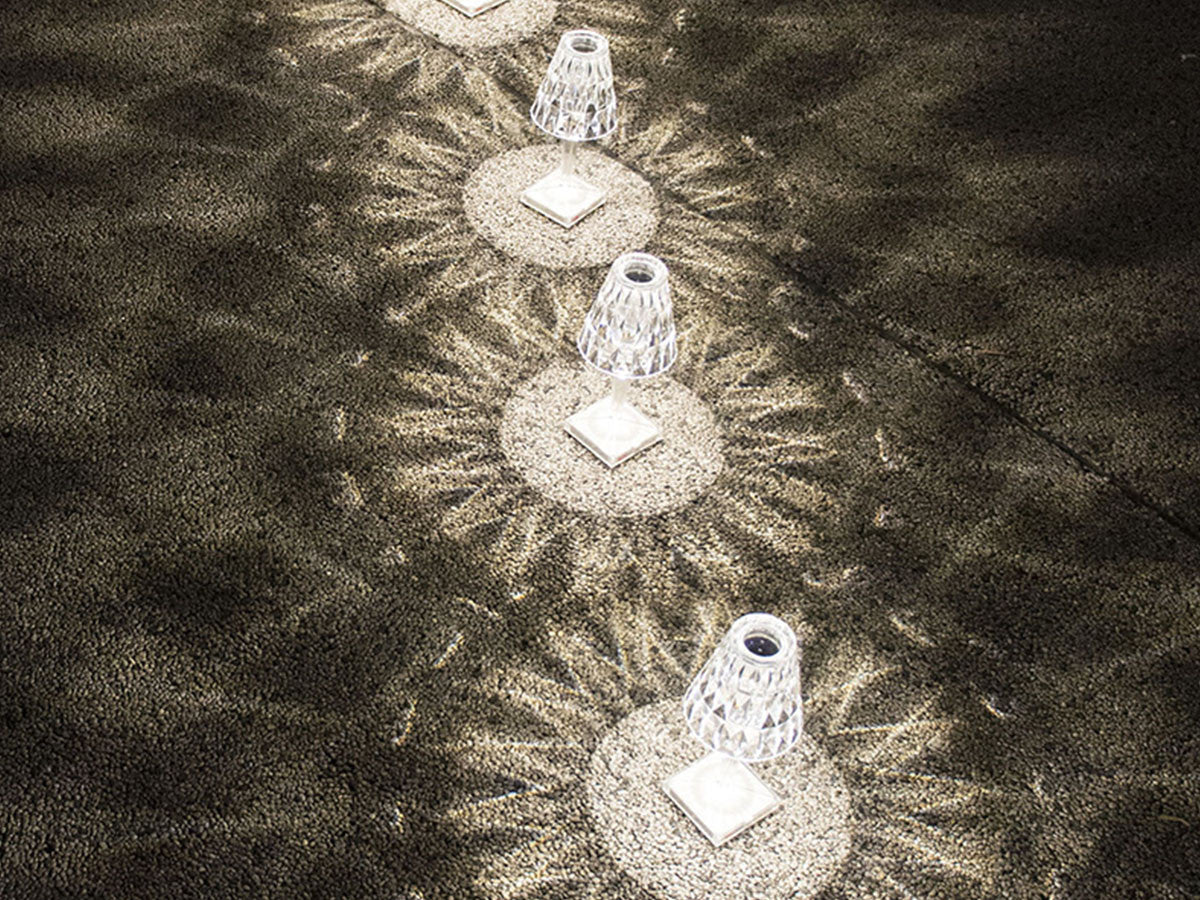 透明なPMMA製のアイコン的デザインのベッドサイドランプです。表面に切り子風の装飾が施されたランプシェードから、魅力に満ちた光を放ちます。USBケーブルで充電し、電源から外しても6時間持続します。電源コードを必要せずに簡単に持ち運べるため、室内だけでなく屋外のレストランやカフェでのご使用もおすすめです。