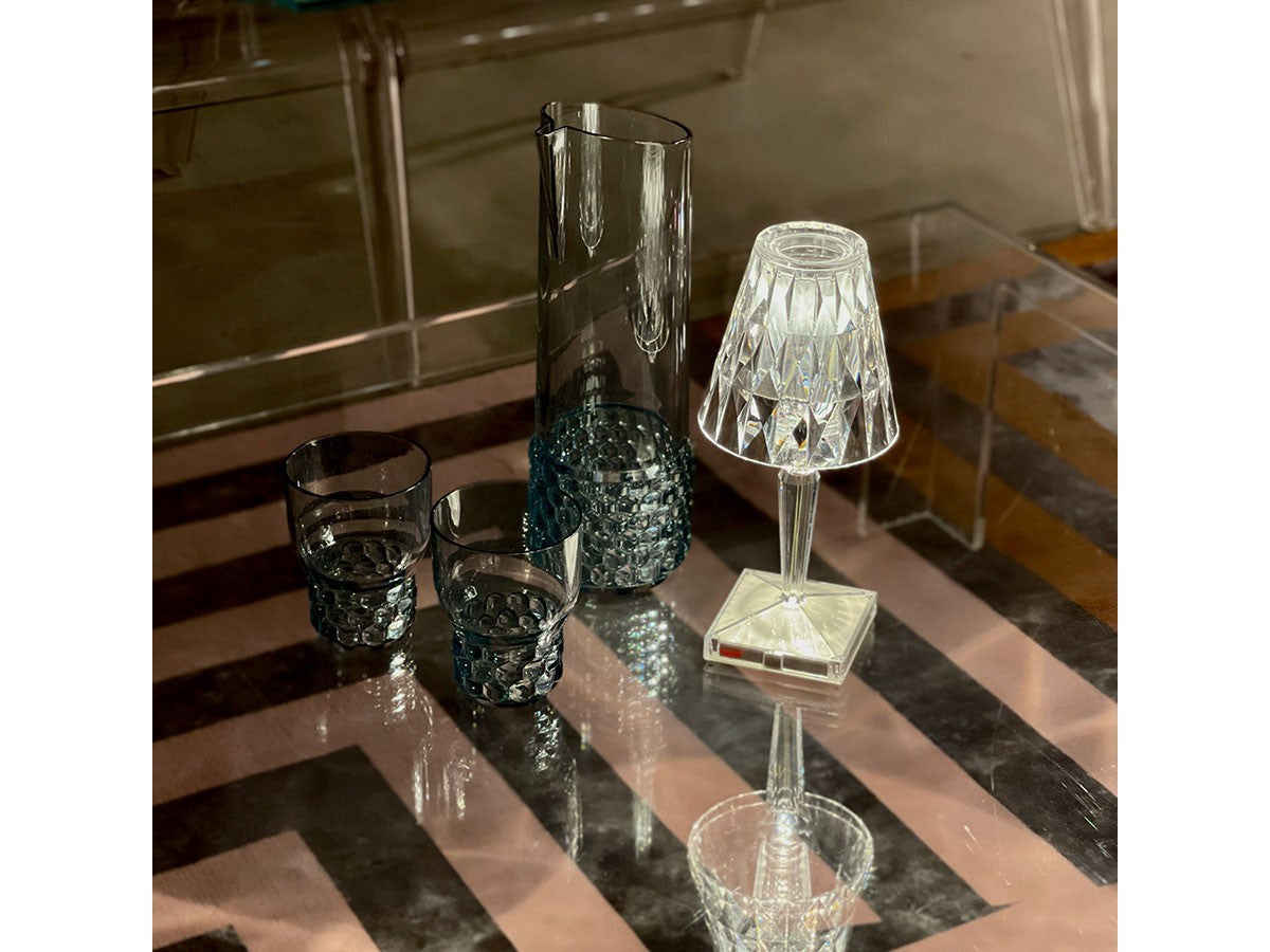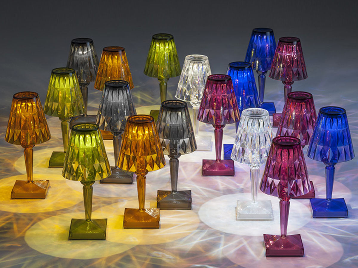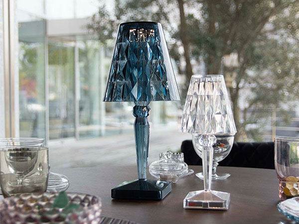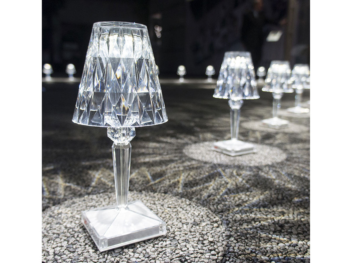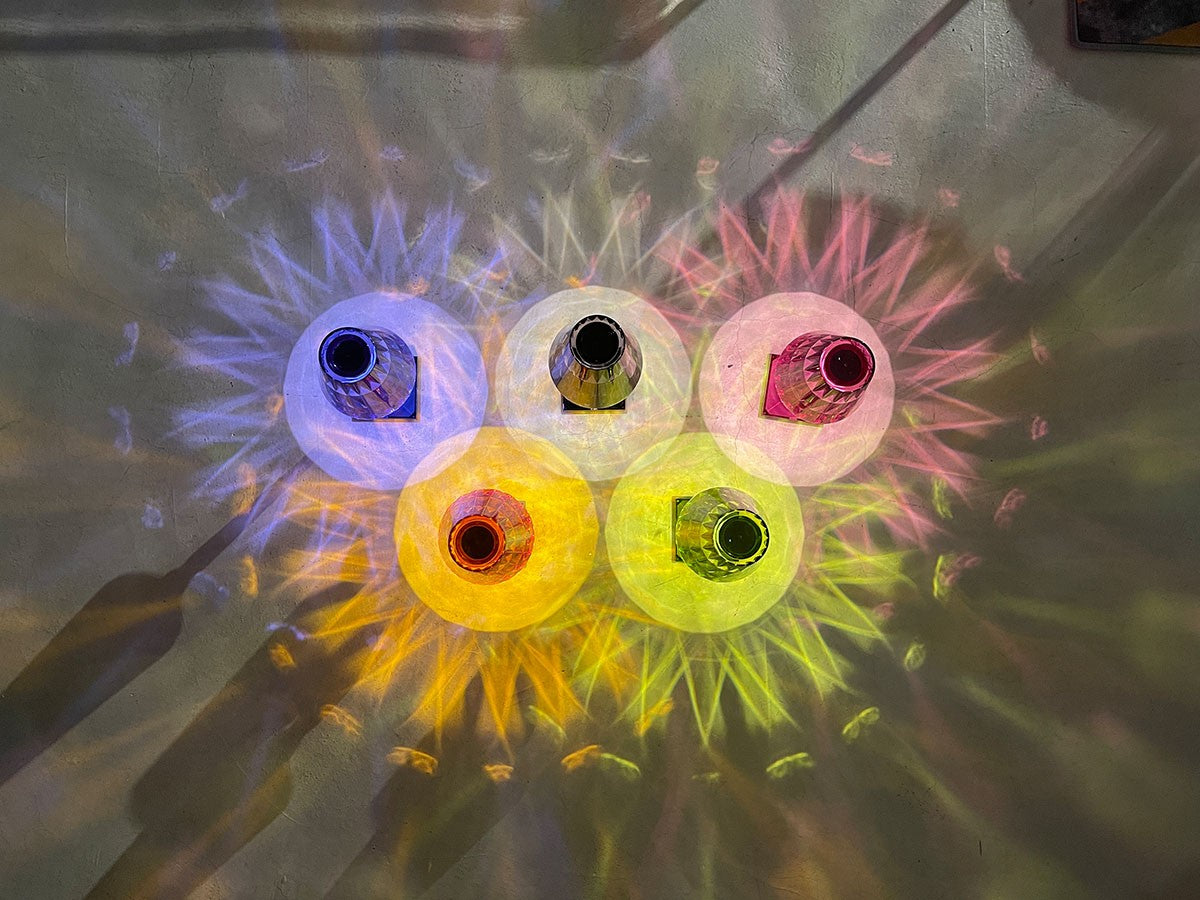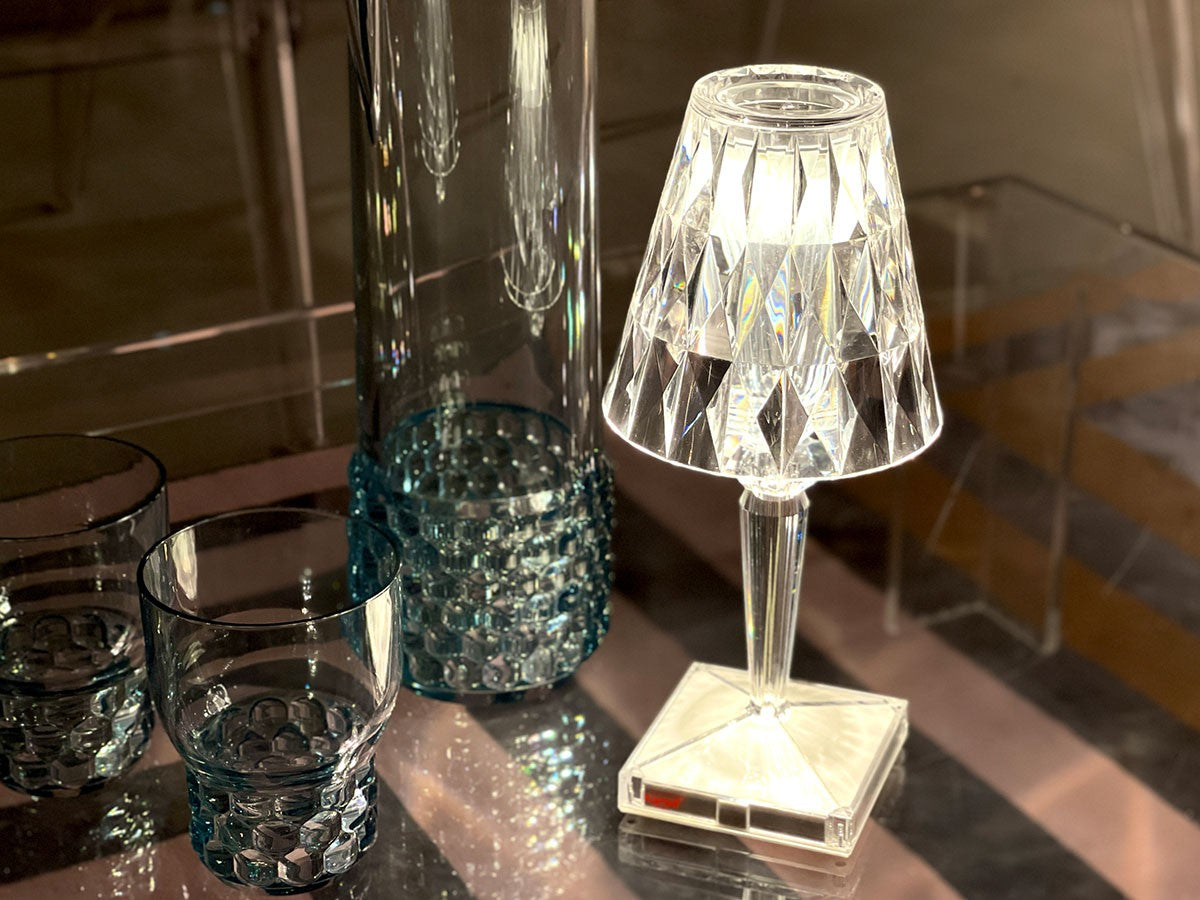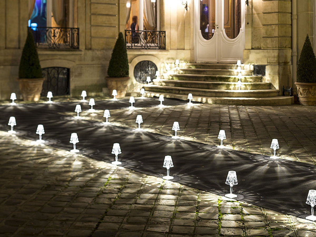 透明なPMMA製のアイコン的デザインのベッドサイドランプです。表面に切り子風の装飾が施されたランプシェードから、魅力に満ちた光を放ちます。USBケーブルで充電し、電源から外しても6時間持続します。電源コードを必要せずに簡単に持ち運べるため、室内だけでなく屋外のレストランやカフェでのご使用もおすすめです。