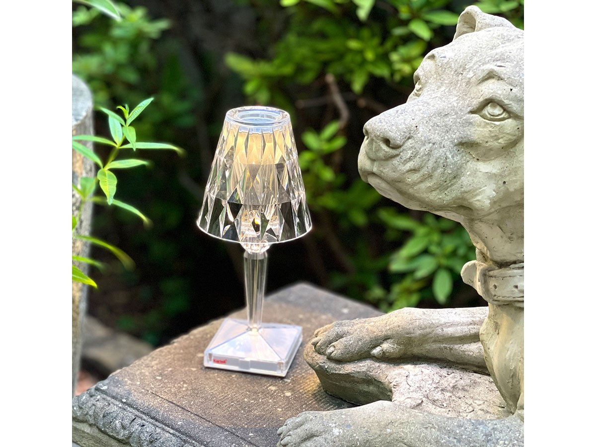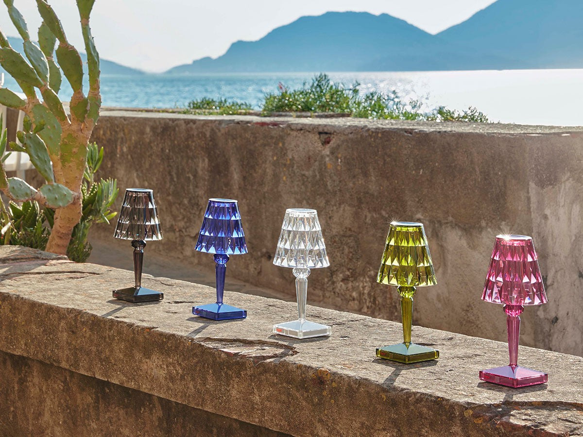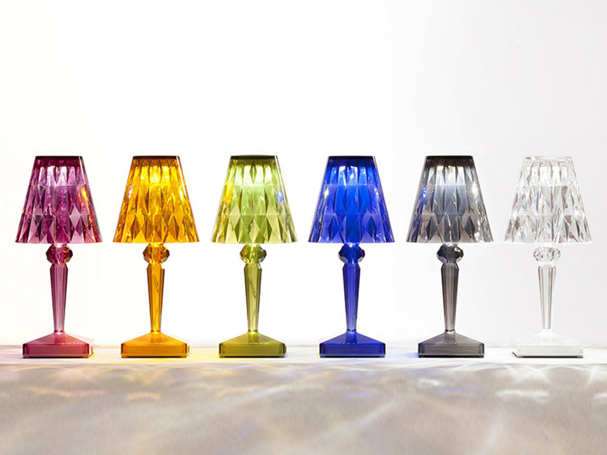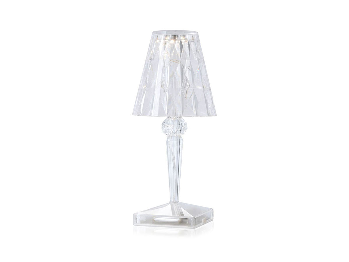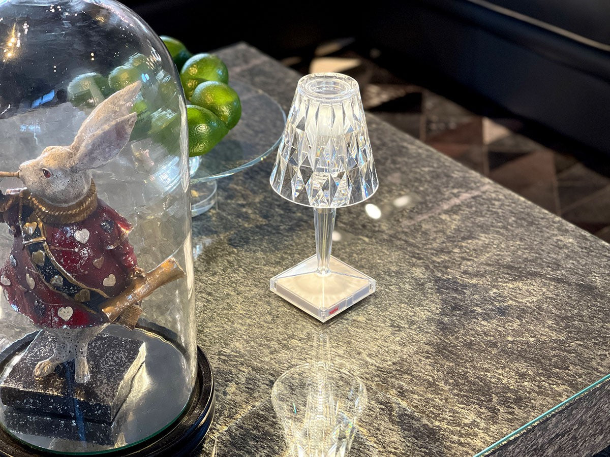 透明なPMMA製のアイコン的デザインのベッドサイドランプです。表面に切り子風の装飾が施されたランプシェードから、魅力に満ちた光を放ちます。USBケーブルで充電し、電源から外しても6時間持続します。電源コードを必要せずに簡単に持ち運べるため、室内だけでなく屋外のレストランやカフェでのご使用もおすすめです。