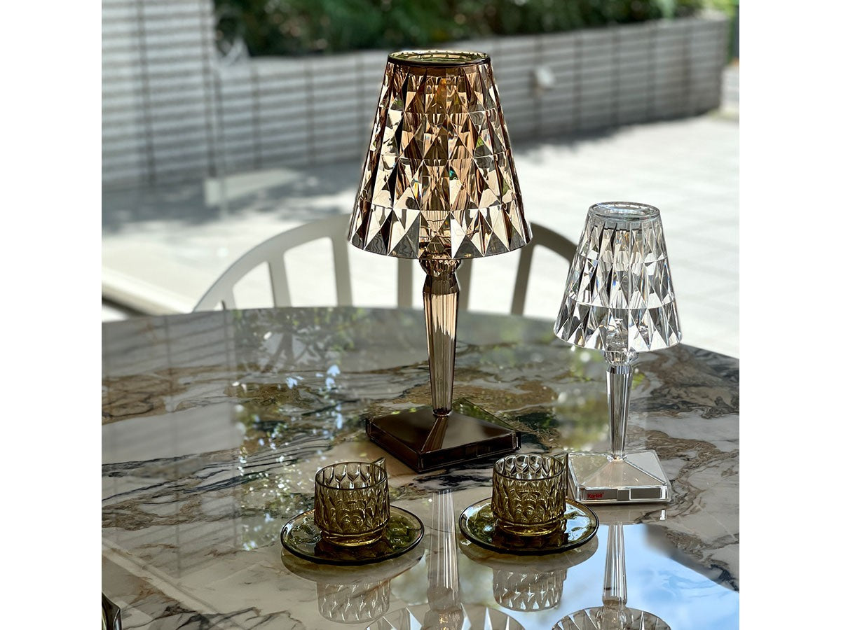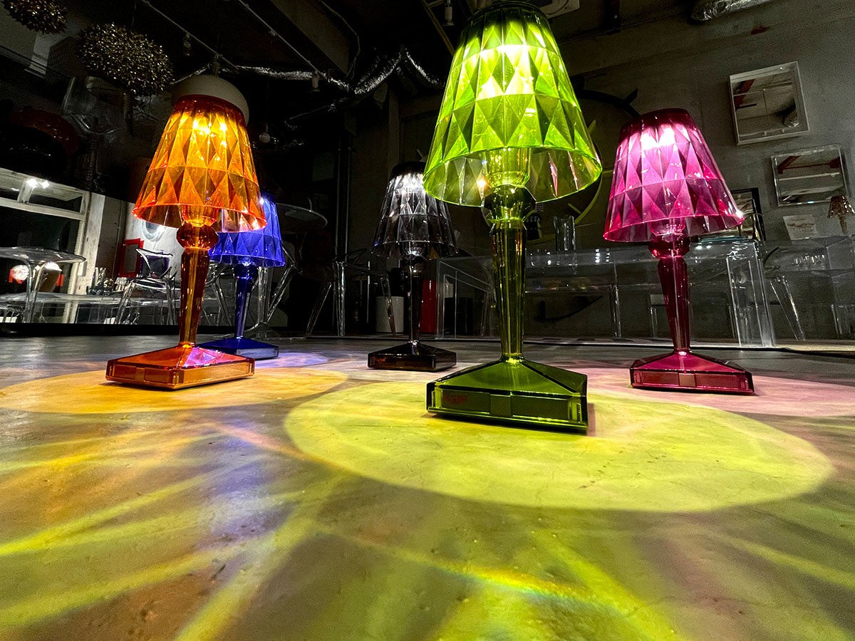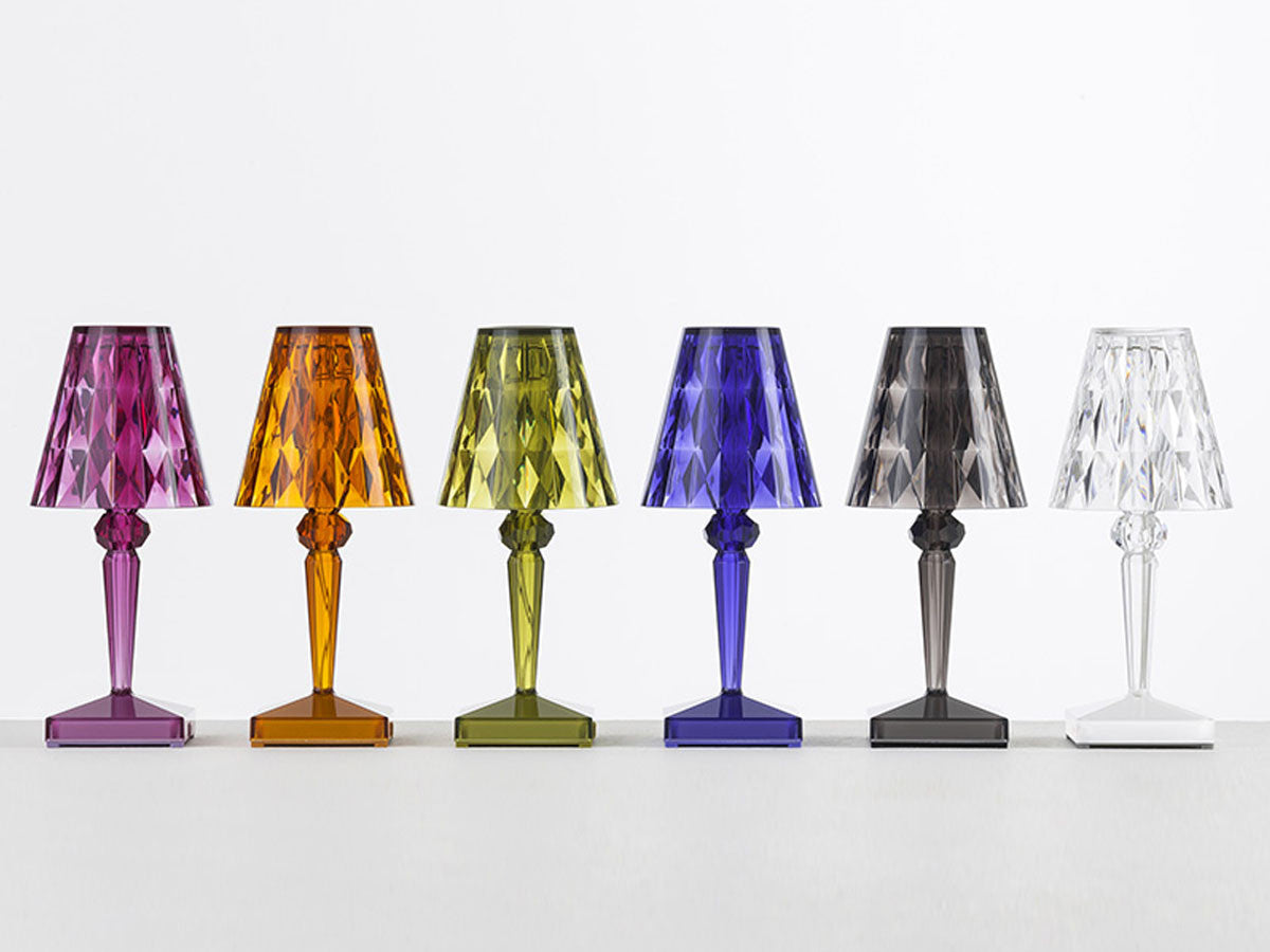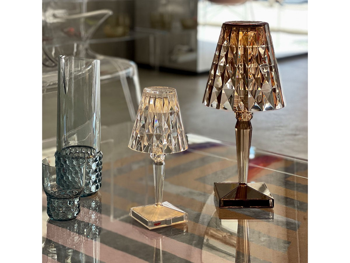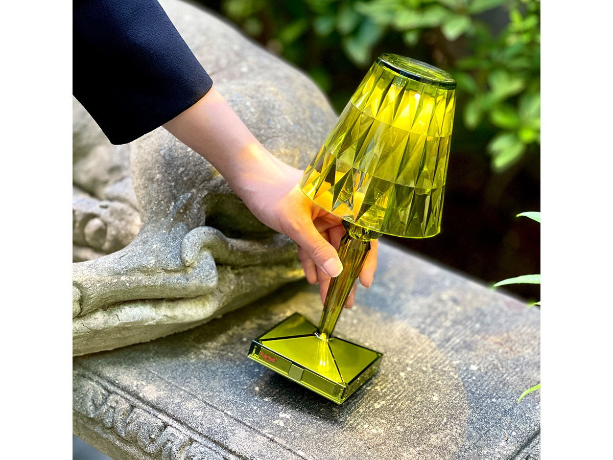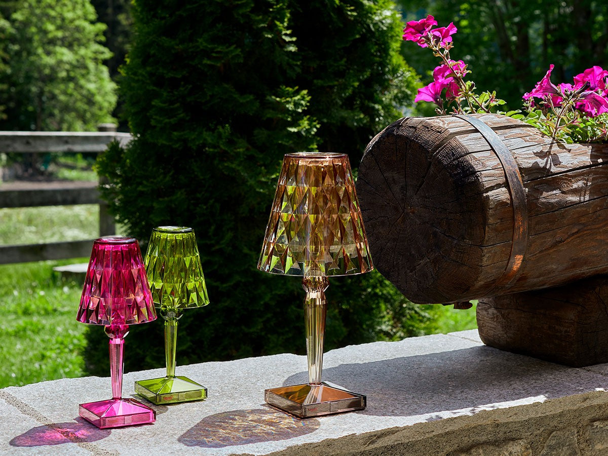 透明なPMMA製のアイコン的デザインのベッドサイドランプです。表面に切り子風の装飾が施されたランプシェードから、魅力に満ちた光を放ちます。USBケーブルで充電し、電源から外しても6時間持続します。電源コードを必要せずに簡単に持ち運べるため、室内だけでなく屋外のレストランやカフェでのご使用もおすすめです。