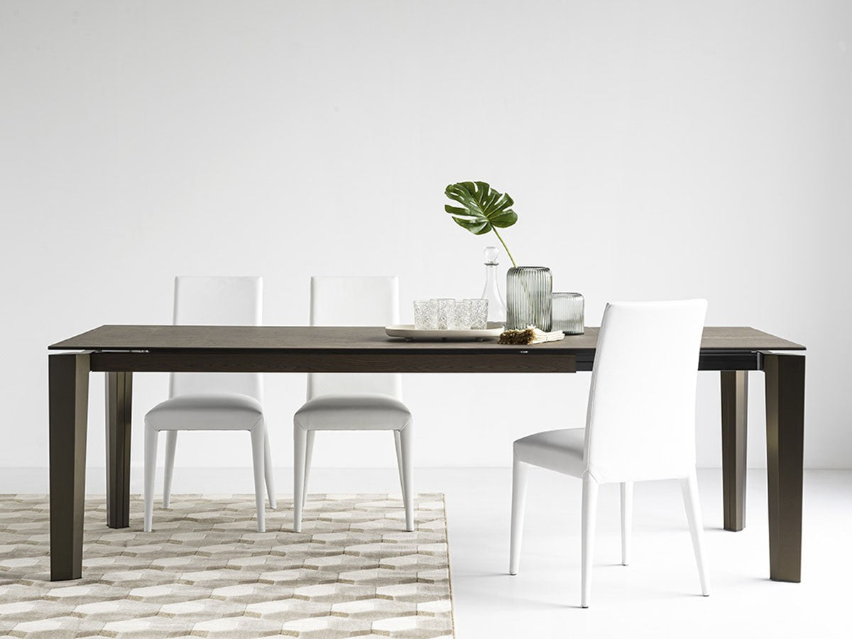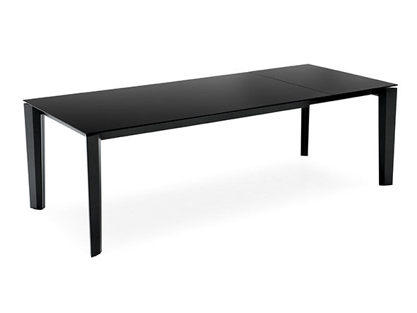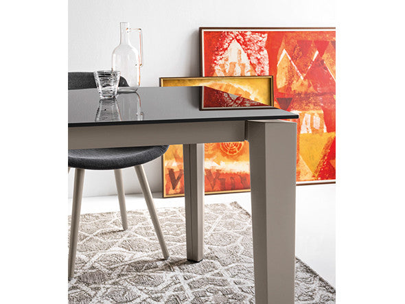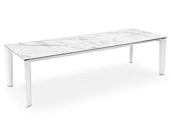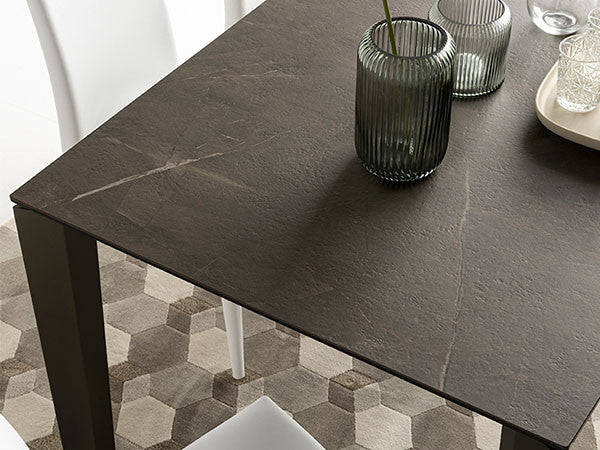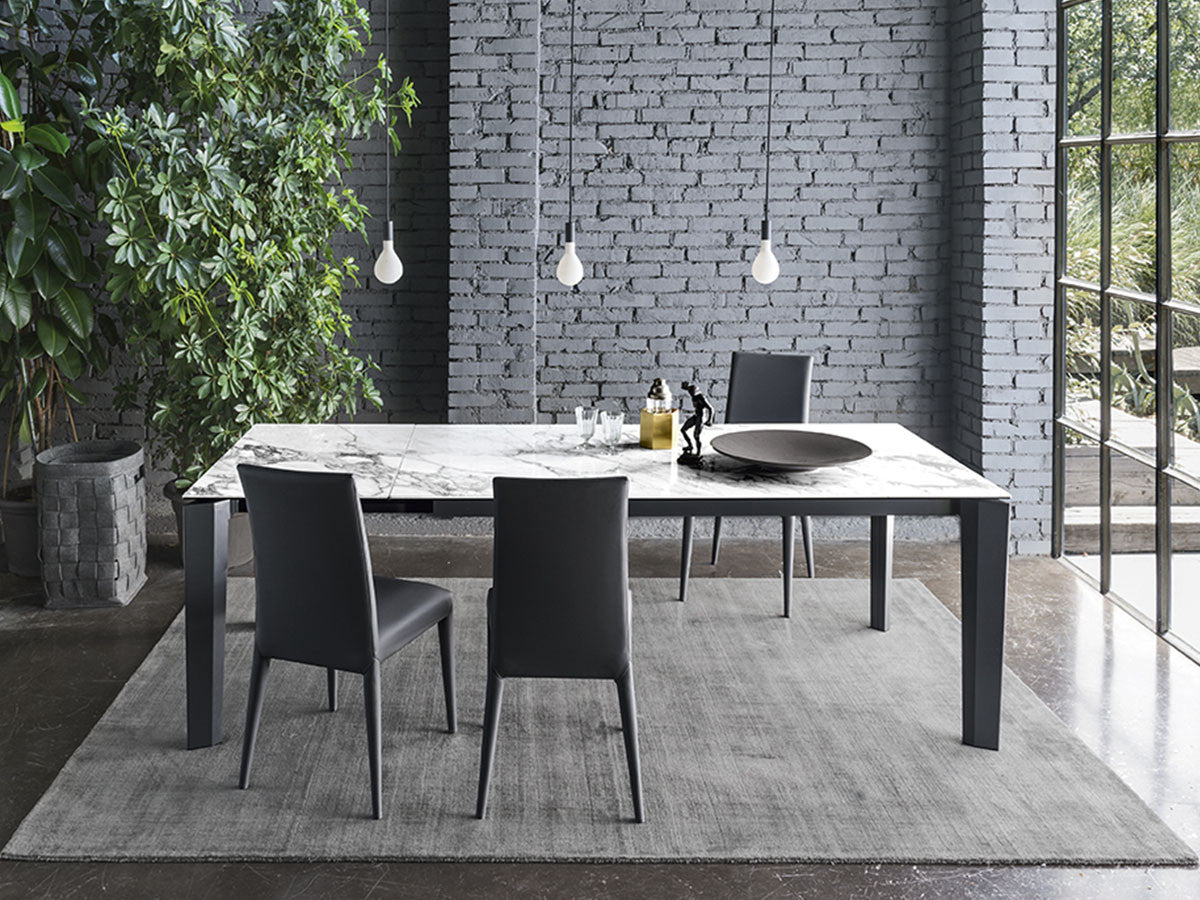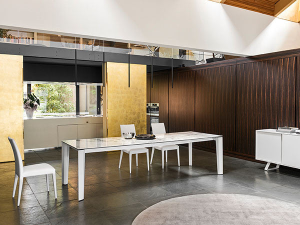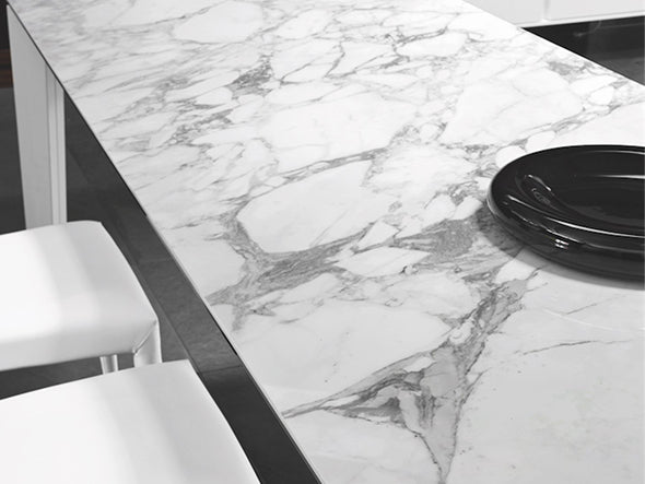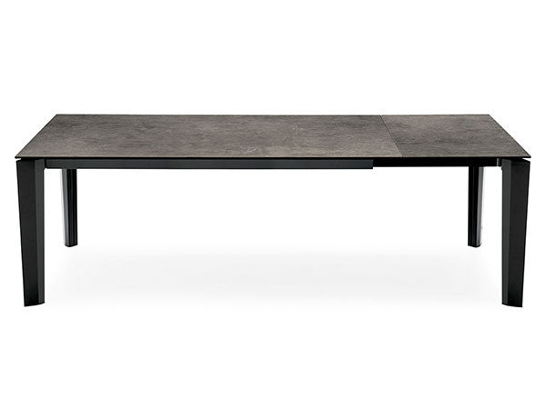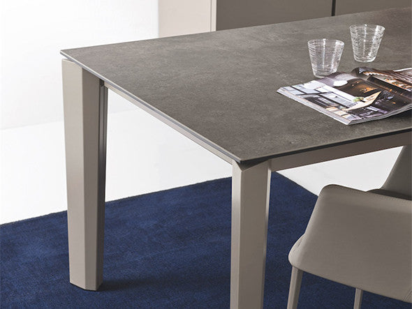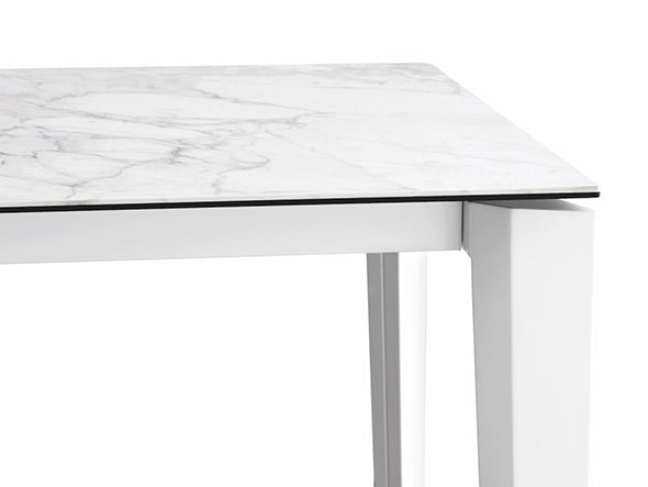 カリガリスが得意とする、用途に応じて天板サイズを変えることのできるエクステンションテーブル。都会的な空間に似合う、存在感のある一台です。脚部は見る方向により印象が変わるようにデザインされています。セラミック製天板またはガラス製天板をご選択いただけます。天板は幅160cm、220cmの2段階で調整していただけます。脚を持って伸ばし、天板下に隠れているエクステンション用天板を引き上げて90度回転。最後に脚を所定の位置まで戻すという流れで、簡単にサイズの変更が可能です。伸長時の様子、またその方法は動画をご参照ください。映像内では本商品と異なる商品を使用していますが伸張の方法は同じです。