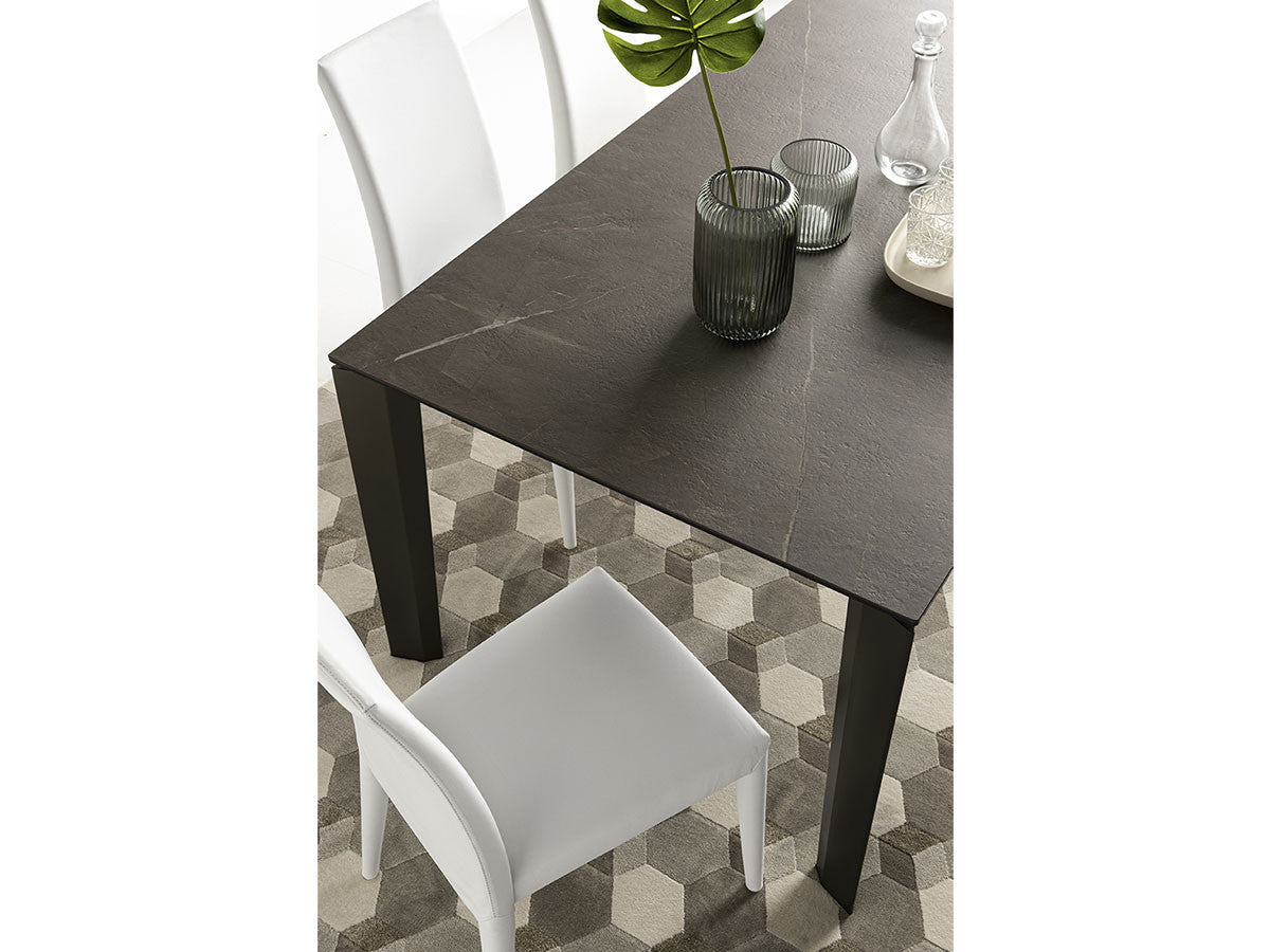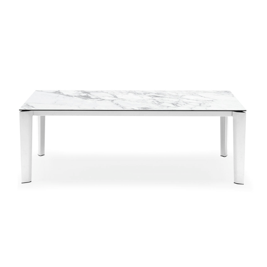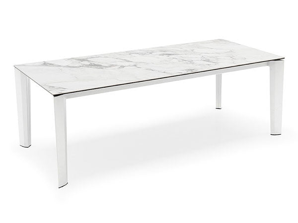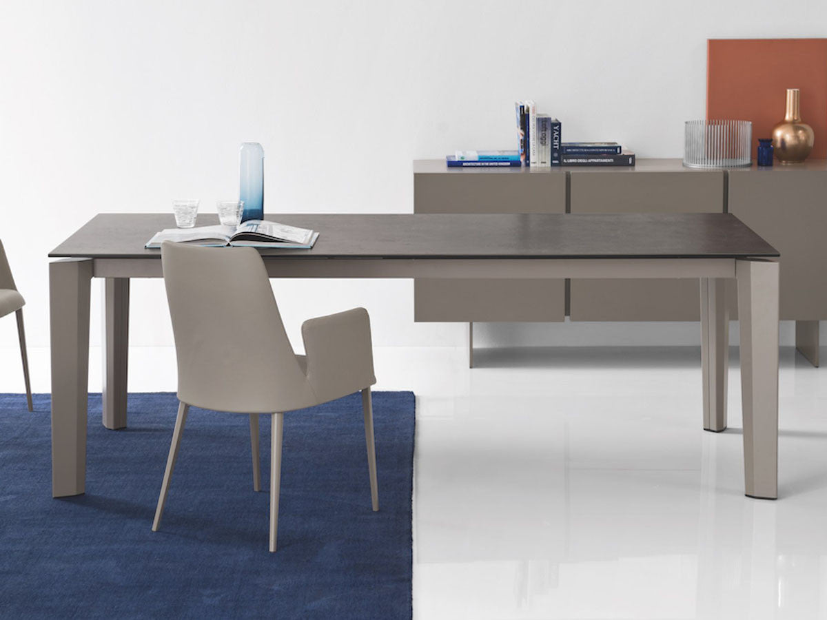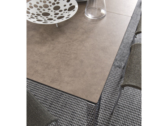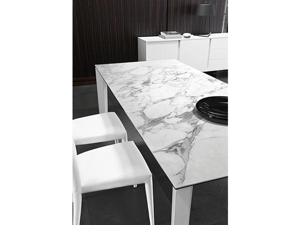 カリガリスが得意とする、用途に応じて天板サイズを変えることのできるエクステンションテーブル。都会的な空間に似合う、存在感のある一台です。脚部は見る方向により印象が変わるようにデザインされています。セラミック製天板またはガラス製天板をご選択いただけます。天板は幅160cm、220cmの2段階で調整していただけます。脚を持って伸ばし、天板下に隠れているエクステンション用天板を引き上げて90度回転。最後に脚を所定の位置まで戻すという流れで、簡単にサイズの変更が可能です。伸長時の様子、またその方法は動画をご参照ください。映像内では本商品と異なる商品を使用していますが伸張の方法は同じです。