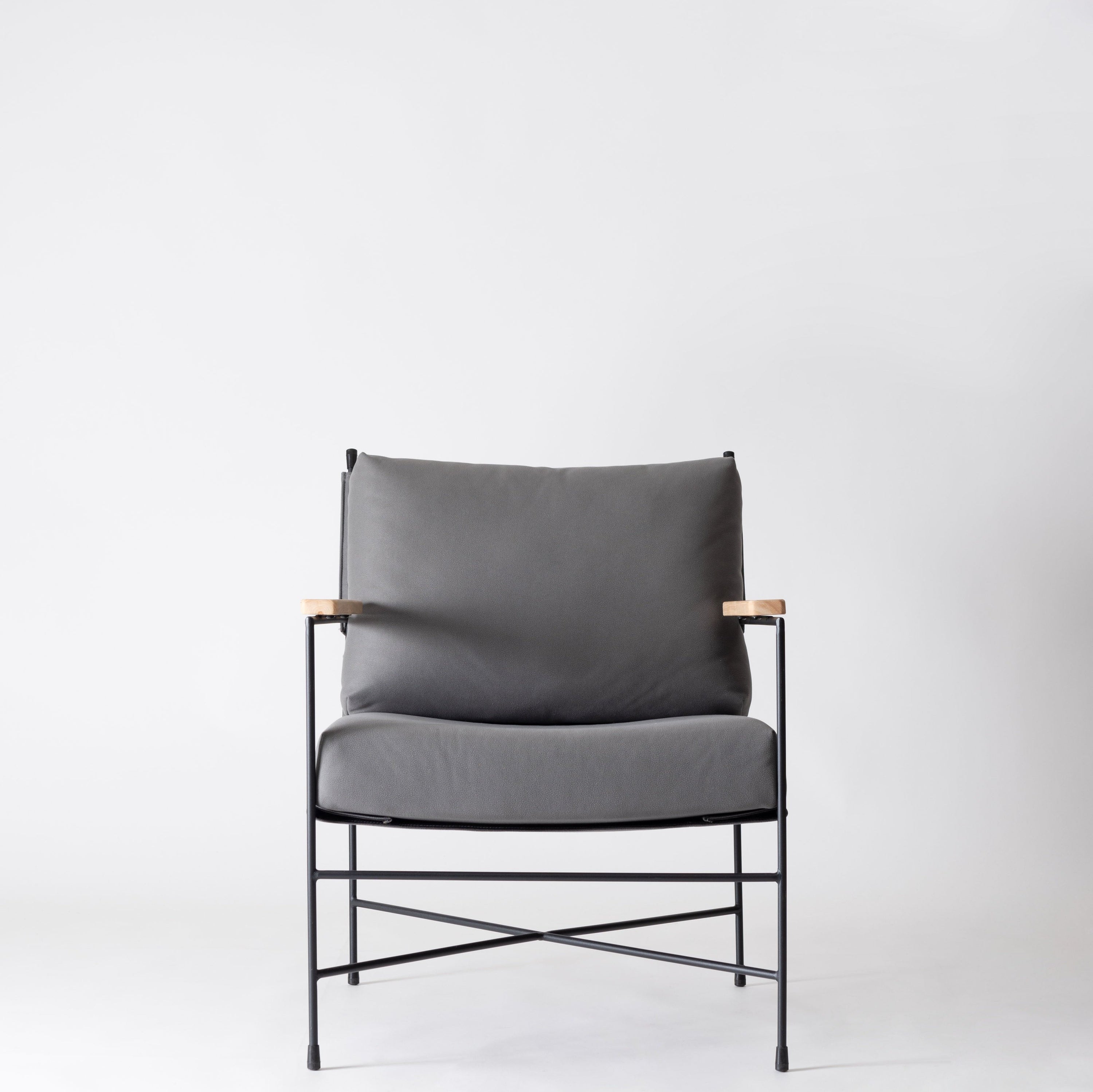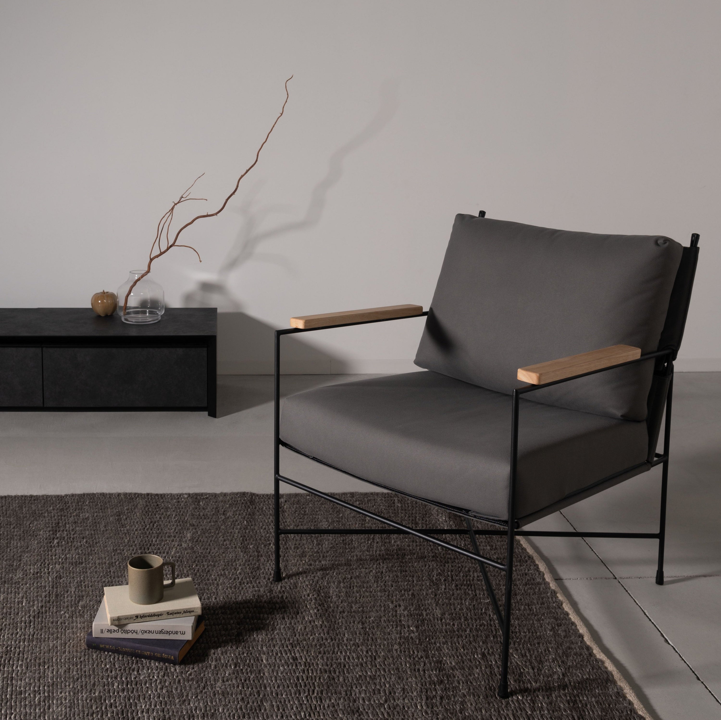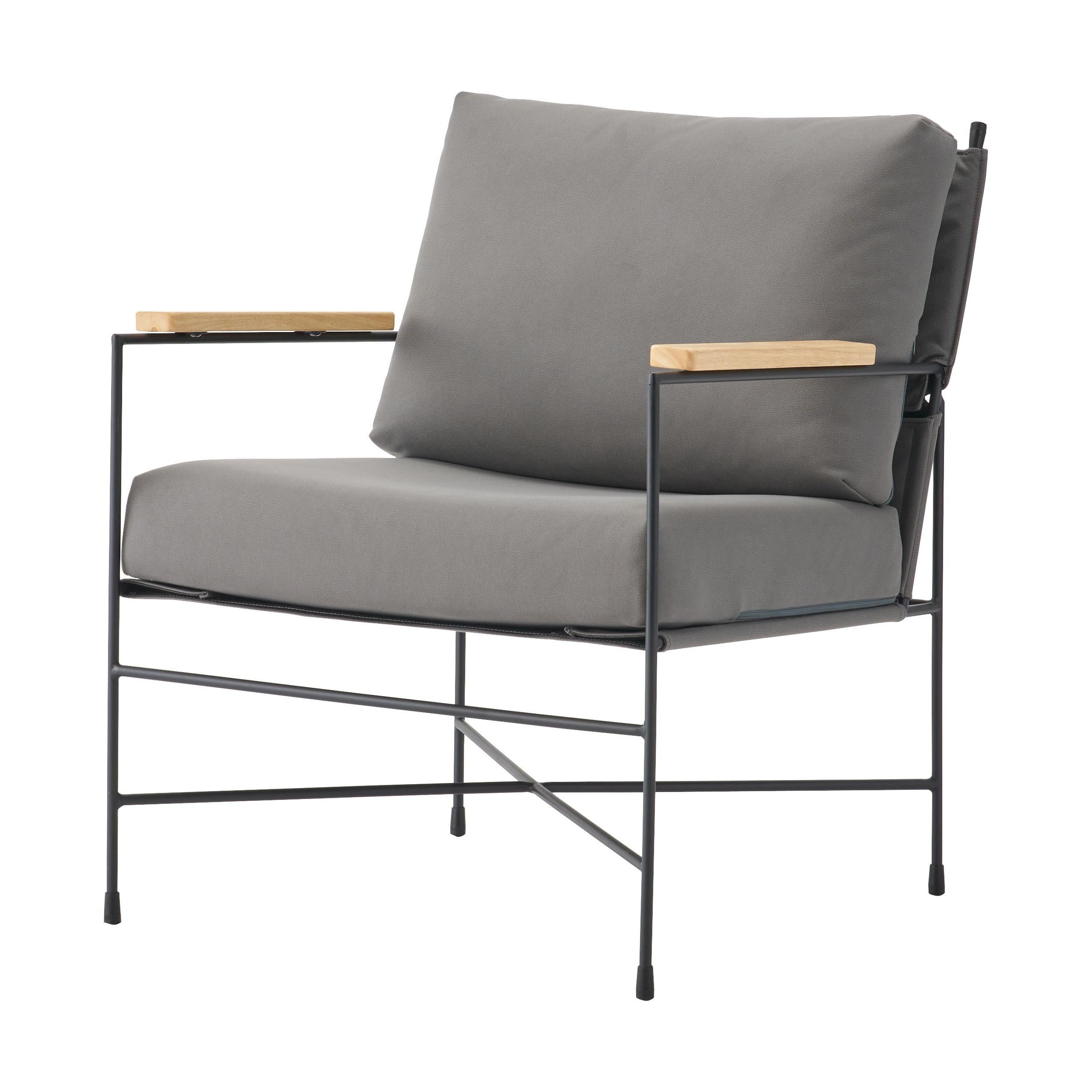 レーザーを模した肌触りの良い上質なファブリックと、シャープなスチール脚を掛け合わせたラウンジチェアです。クールで洗練されたデザインに天然木アームを使用し、温かみとアクセントを加えています。広めに設計された座面と背面のクッションが身体を包み込み、ゆっくりと流れる贅沢なひとり時間をサポートします。