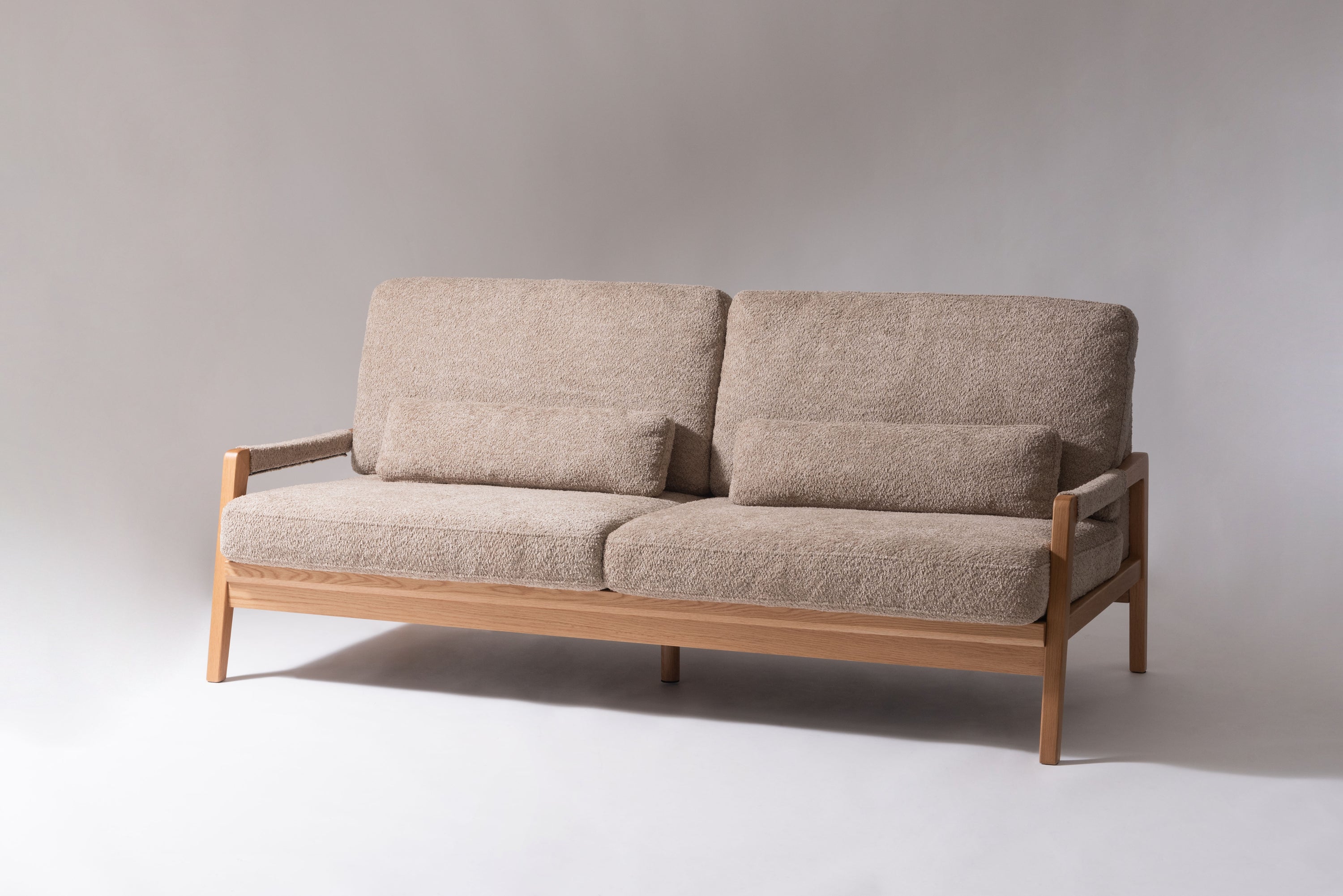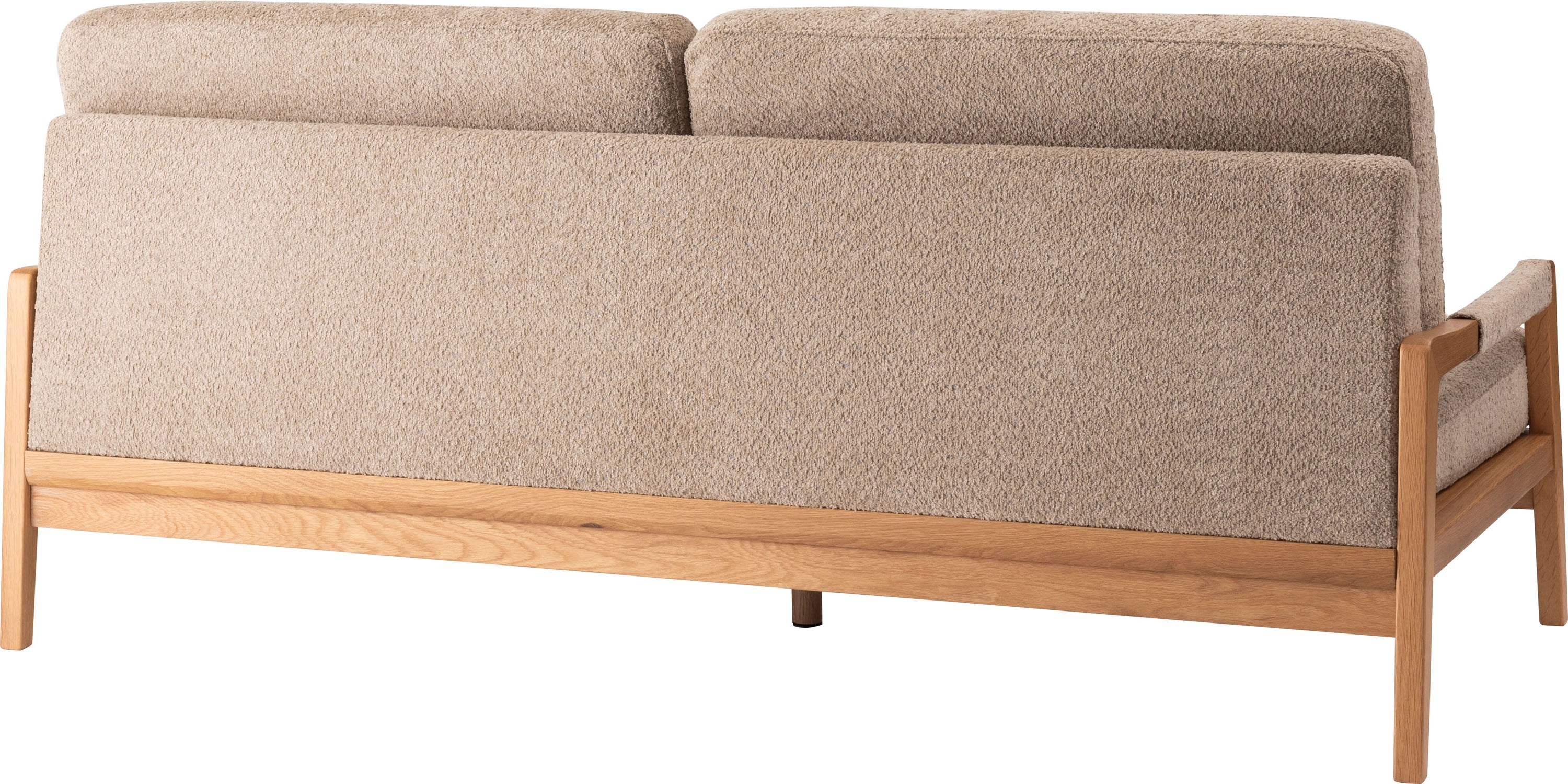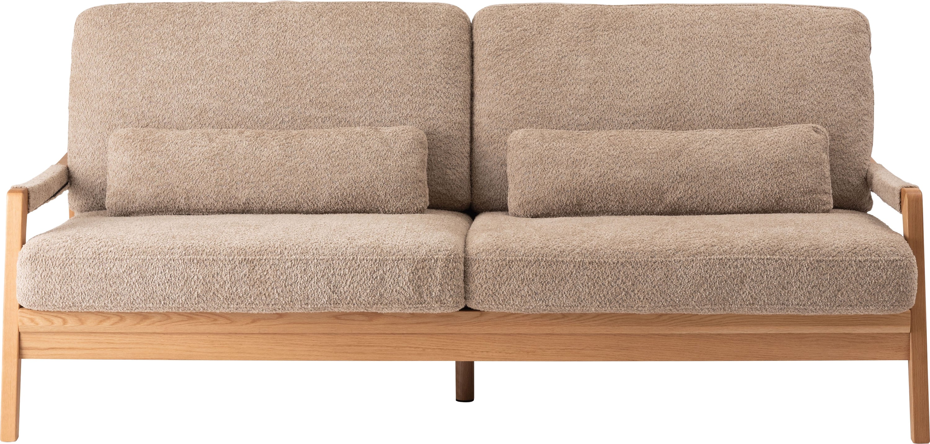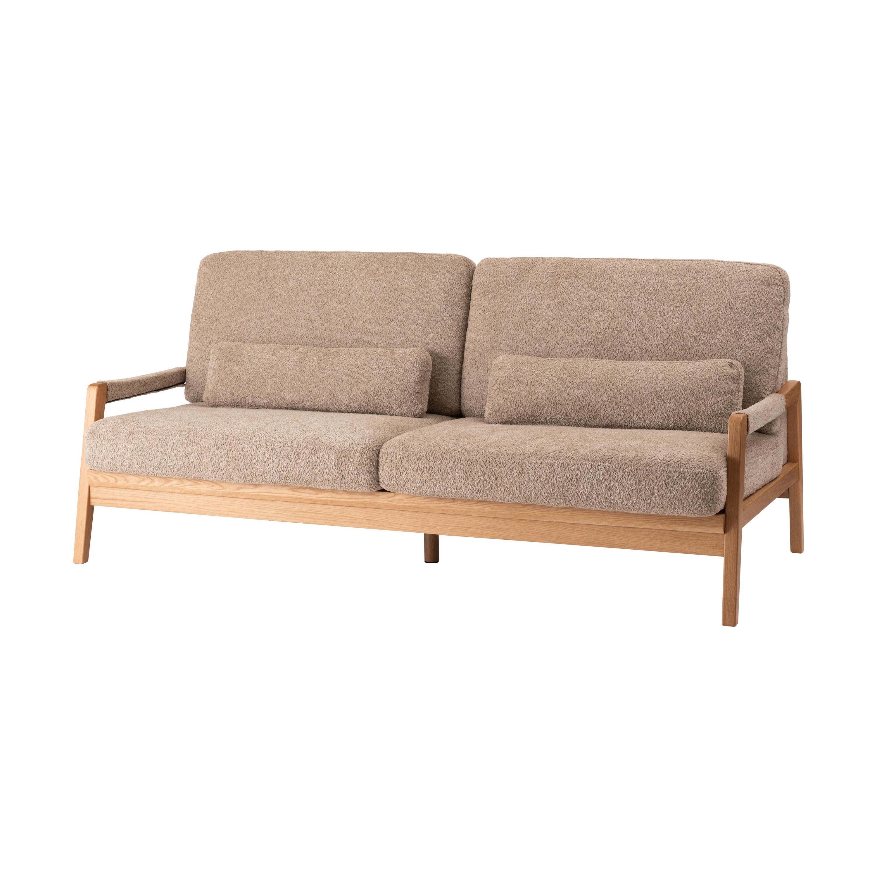 オーク材のフレームがあたたかみを演出するソファです。ゆったりとした座面でのびのび使えます。背・座ともに大ボリュームな設計でクッション性も抜群です。背面にも本体と同じ生地を使用し、後ろ姿にもこだわりました。BE/KHは人気のブークレ生地を、CAはクロスレザーを採用しています。