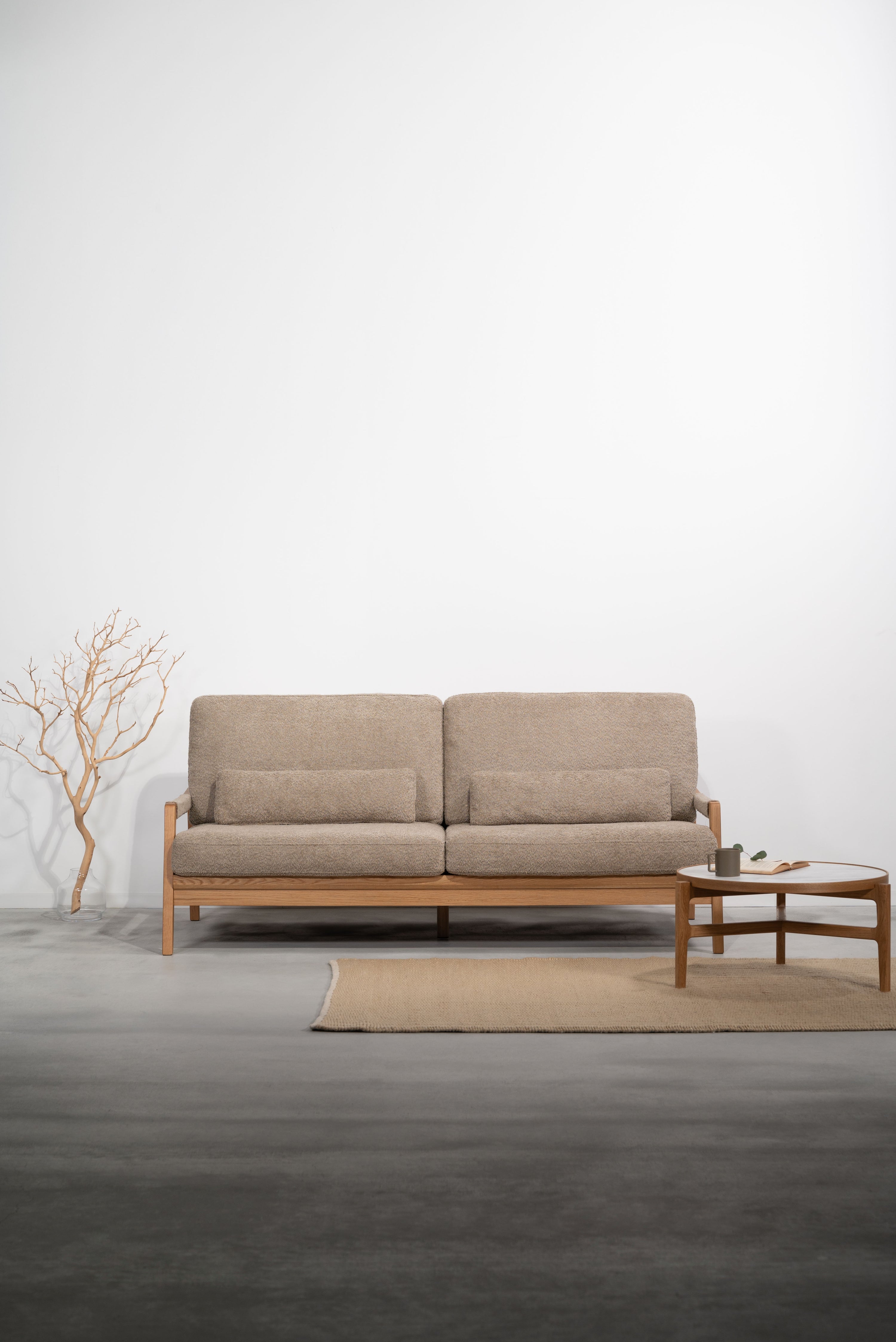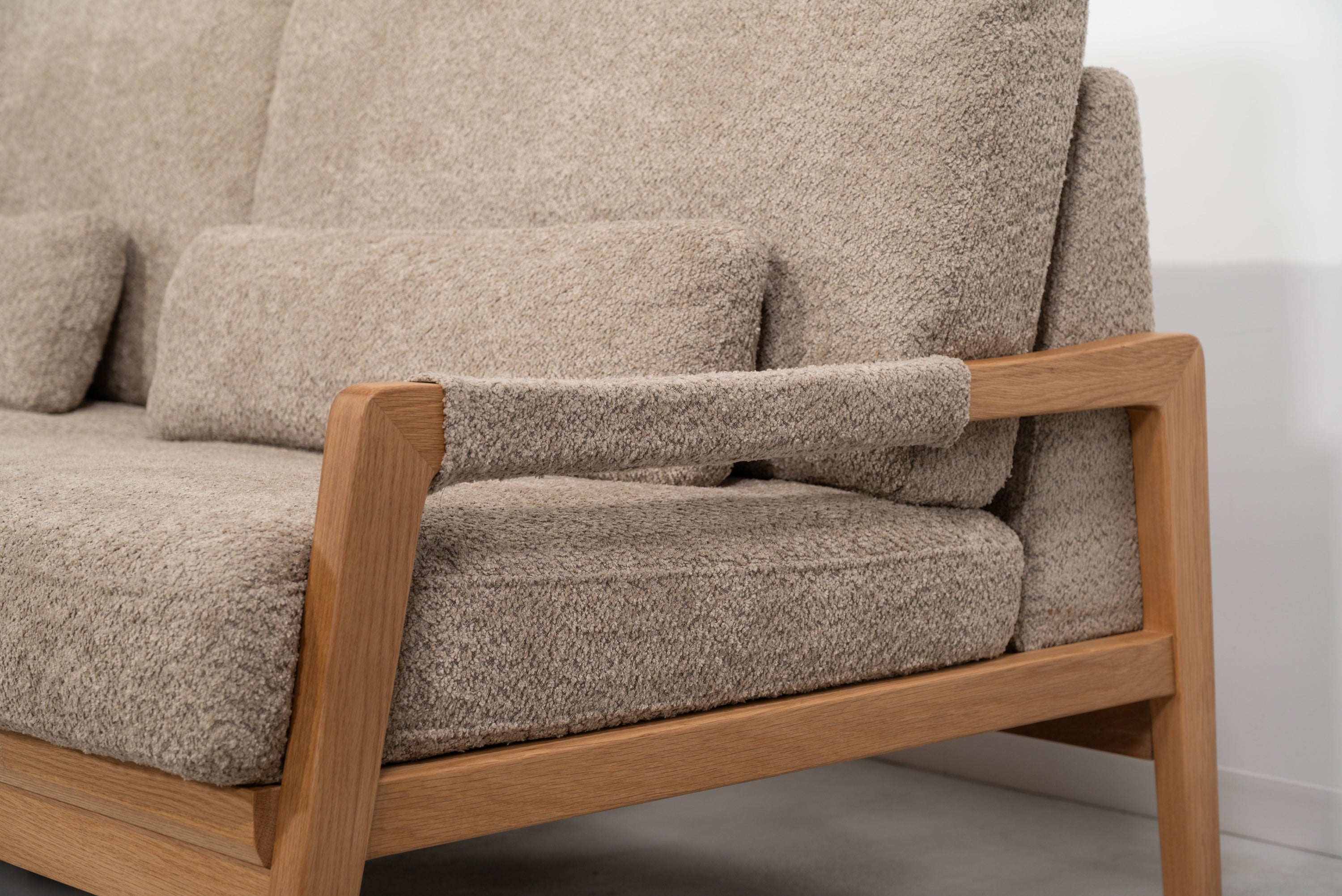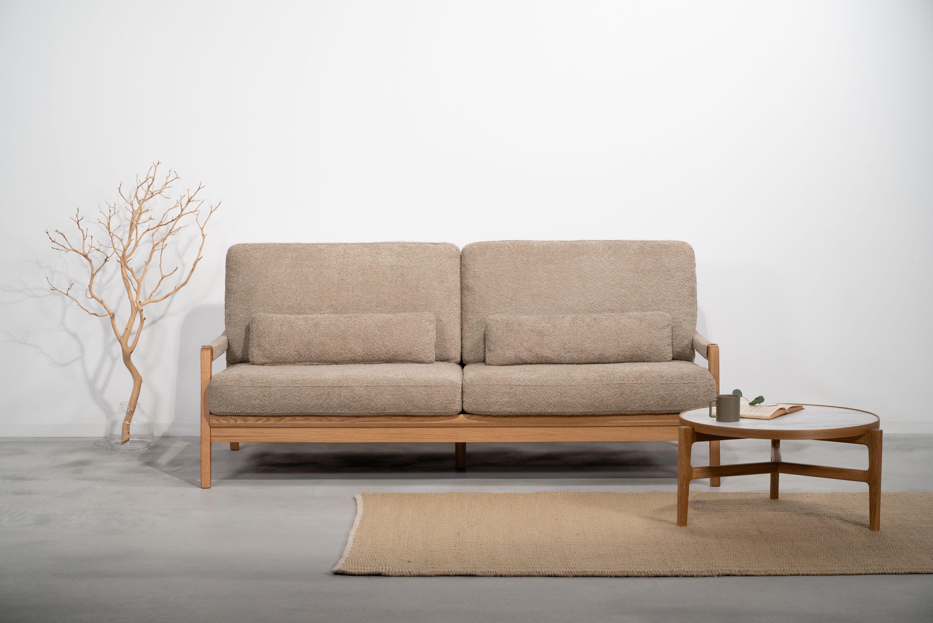 オーク材のフレームがあたたかみを演出するソファです。ゆったりとした座面でのびのび使えます。背・座ともに大ボリュームな設計でクッション性も抜群です。背面にも本体と同じ生地を使用し、後ろ姿にもこだわりました。BE/KHは人気のブークレ生地を、CAはクロスレザーを採用しています。