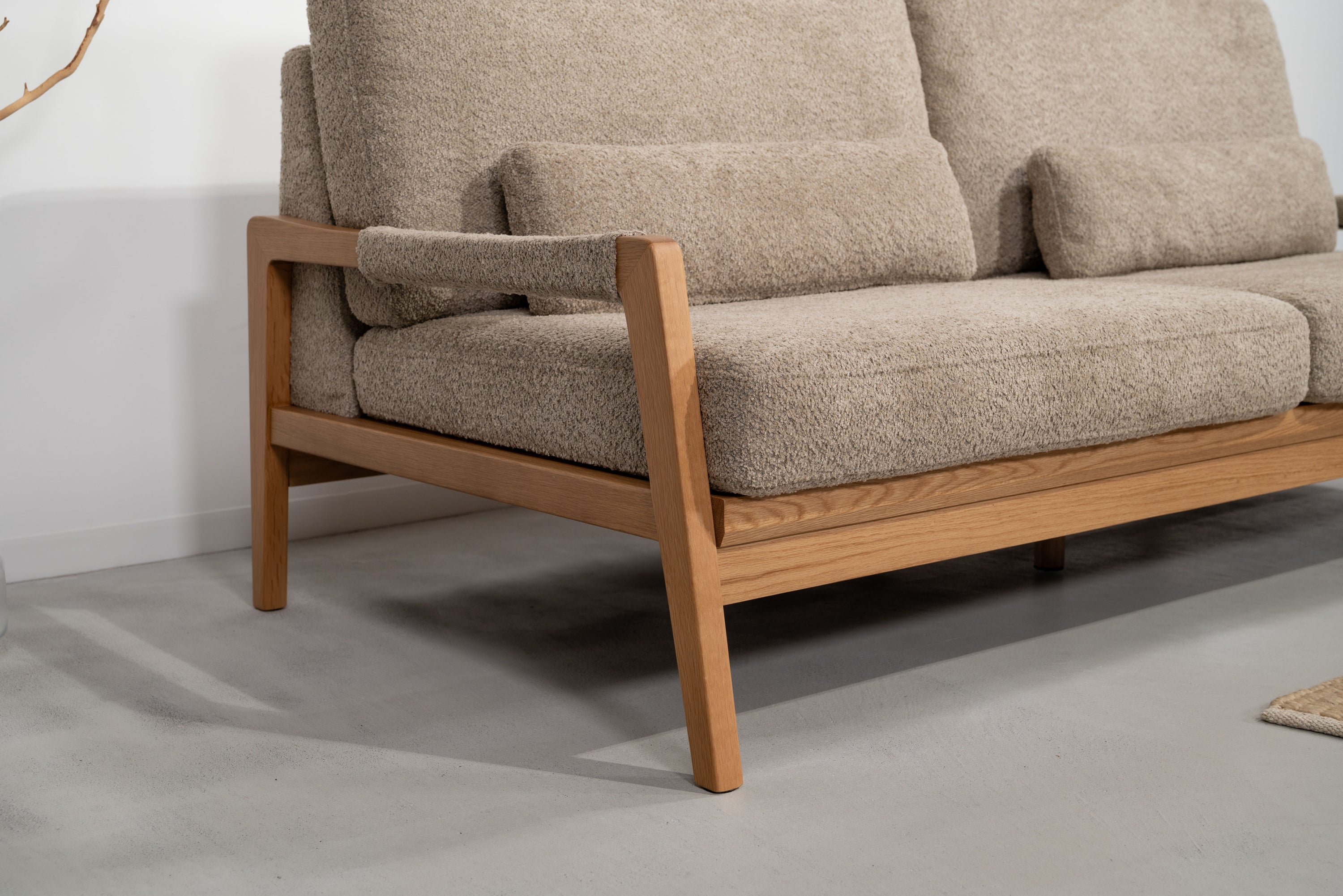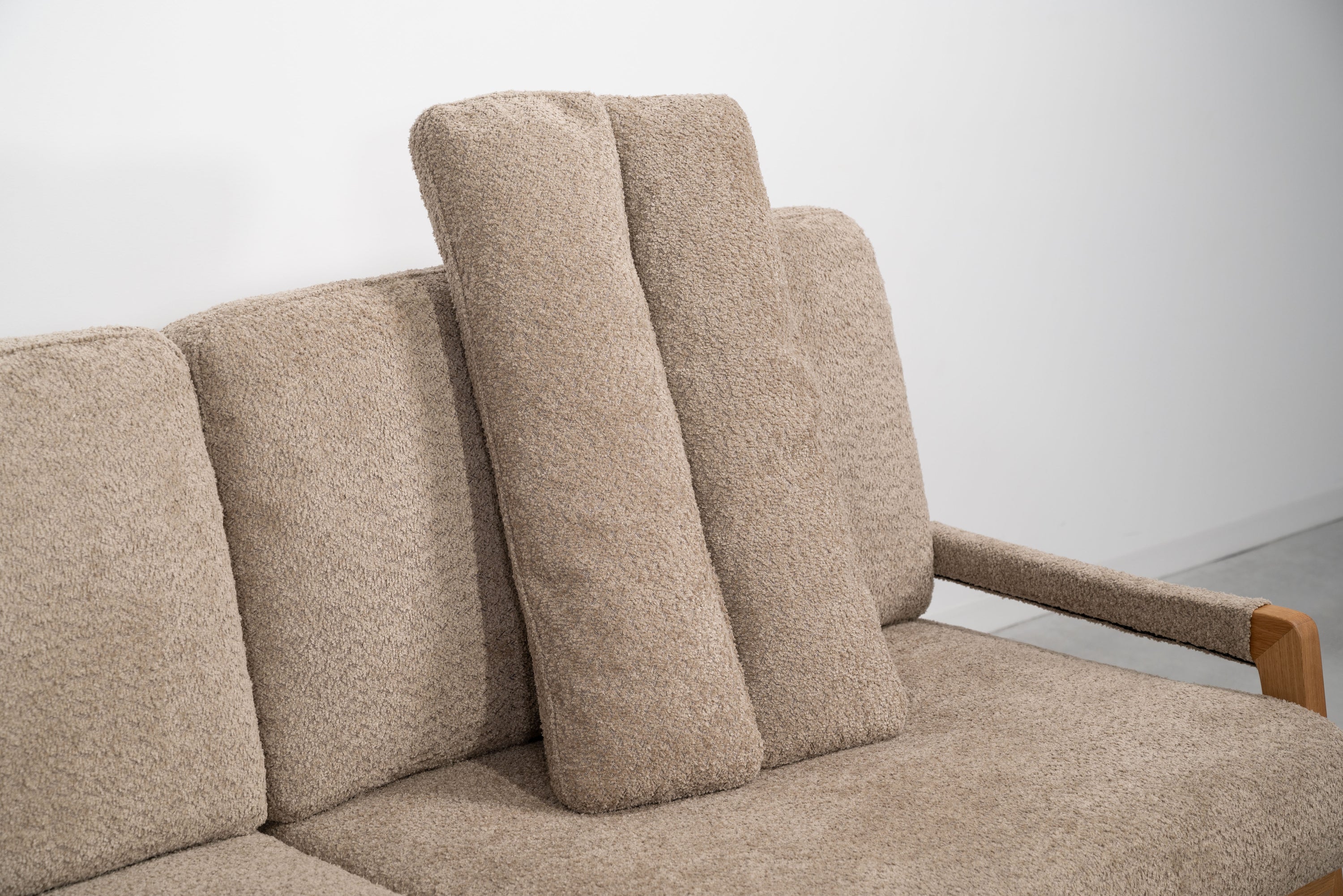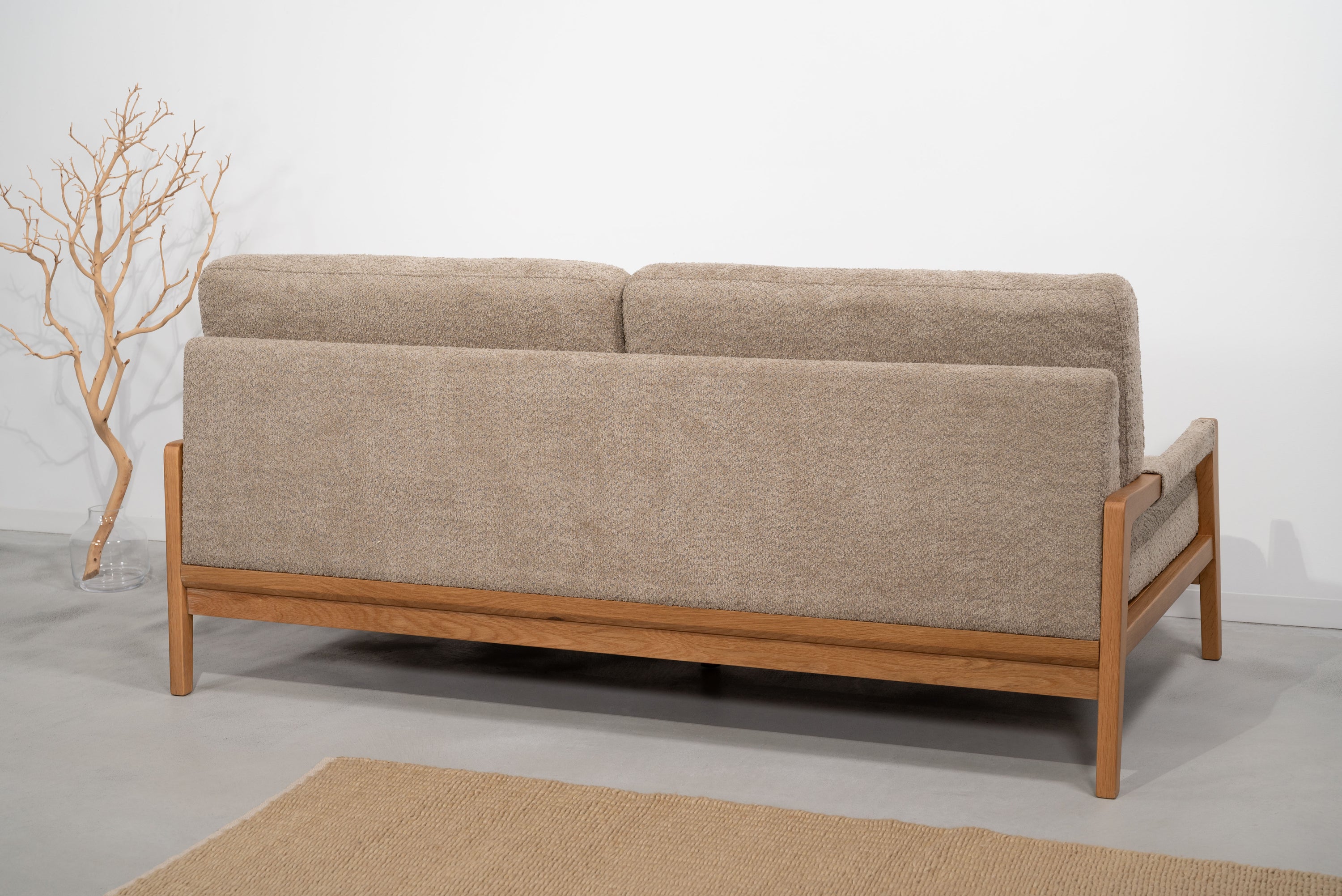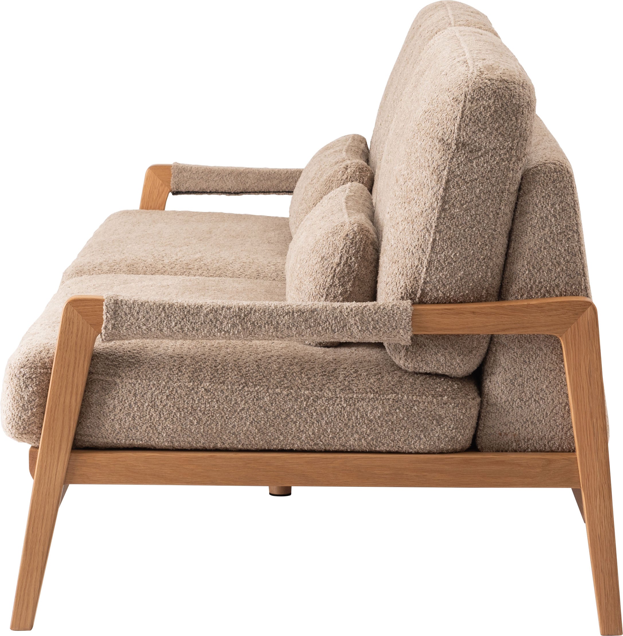 オーク材のフレームがあたたかみを演出するソファです。ゆったりとした座面でのびのび使えます。背・座ともに大ボリュームな設計でクッション性も抜群です。背面にも本体と同じ生地を使用し、後ろ姿にもこだわりました。BE/KHは人気のブークレ生地を、CAはクロスレザーを採用しています。