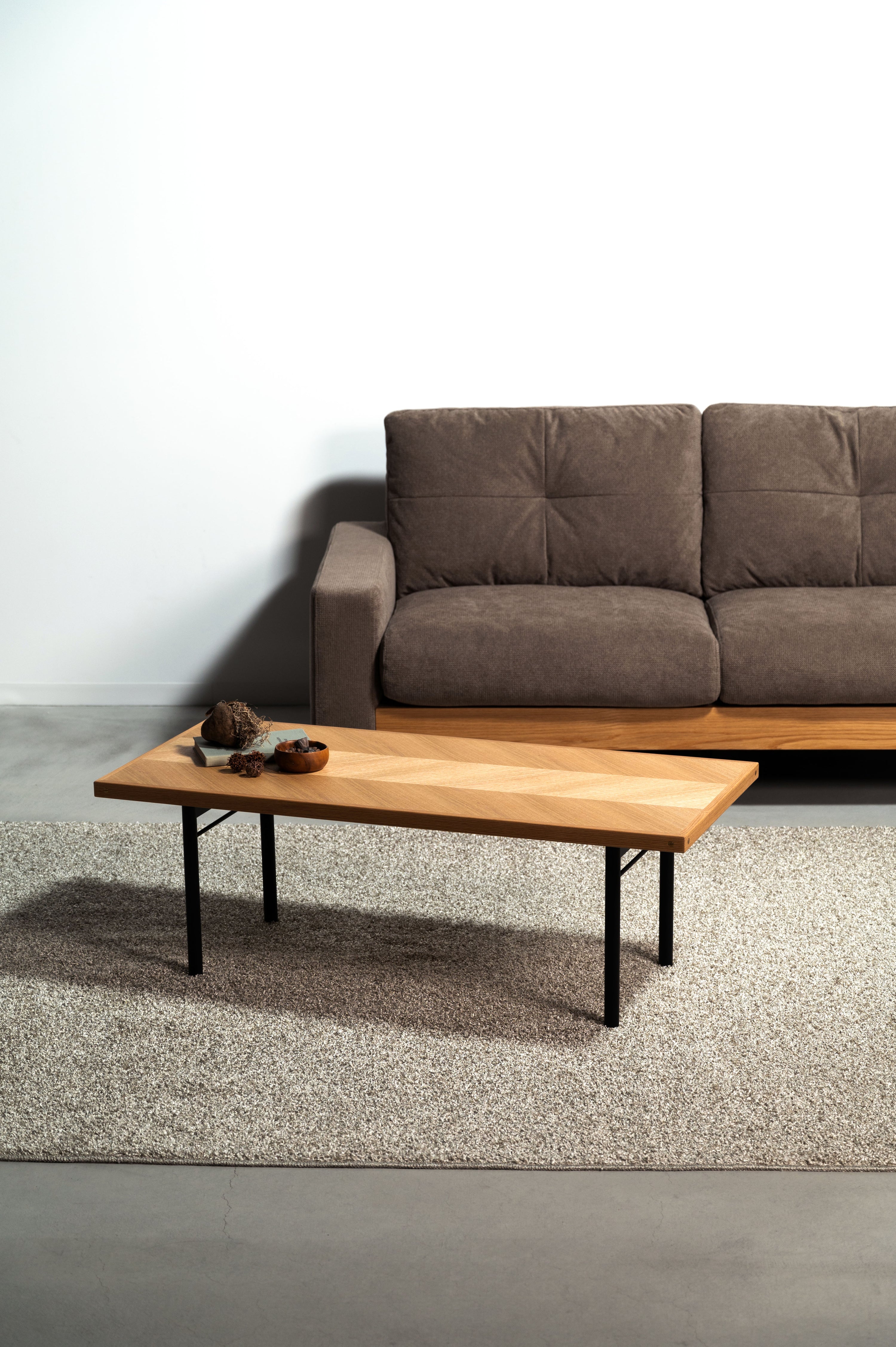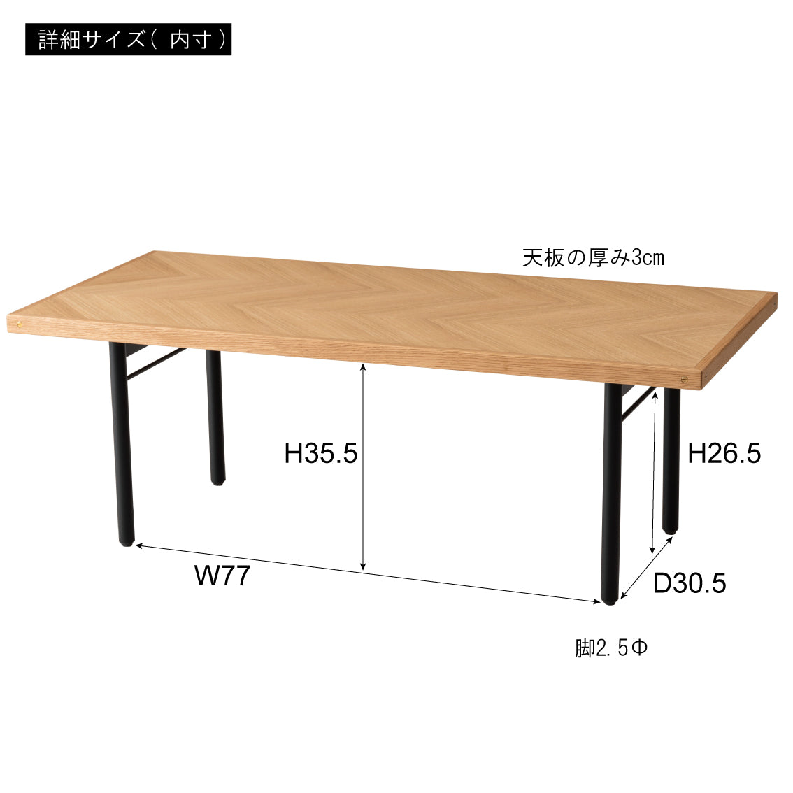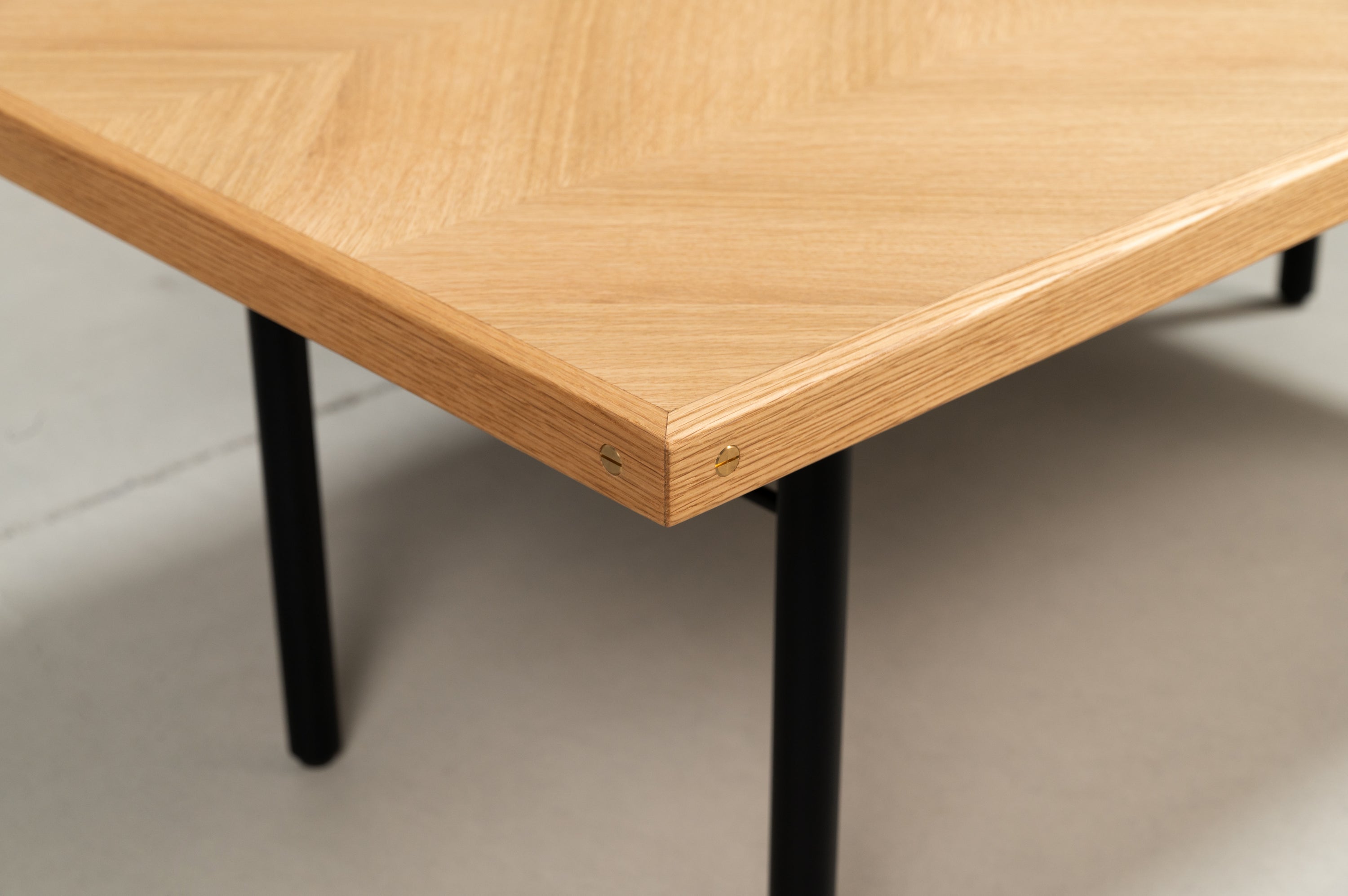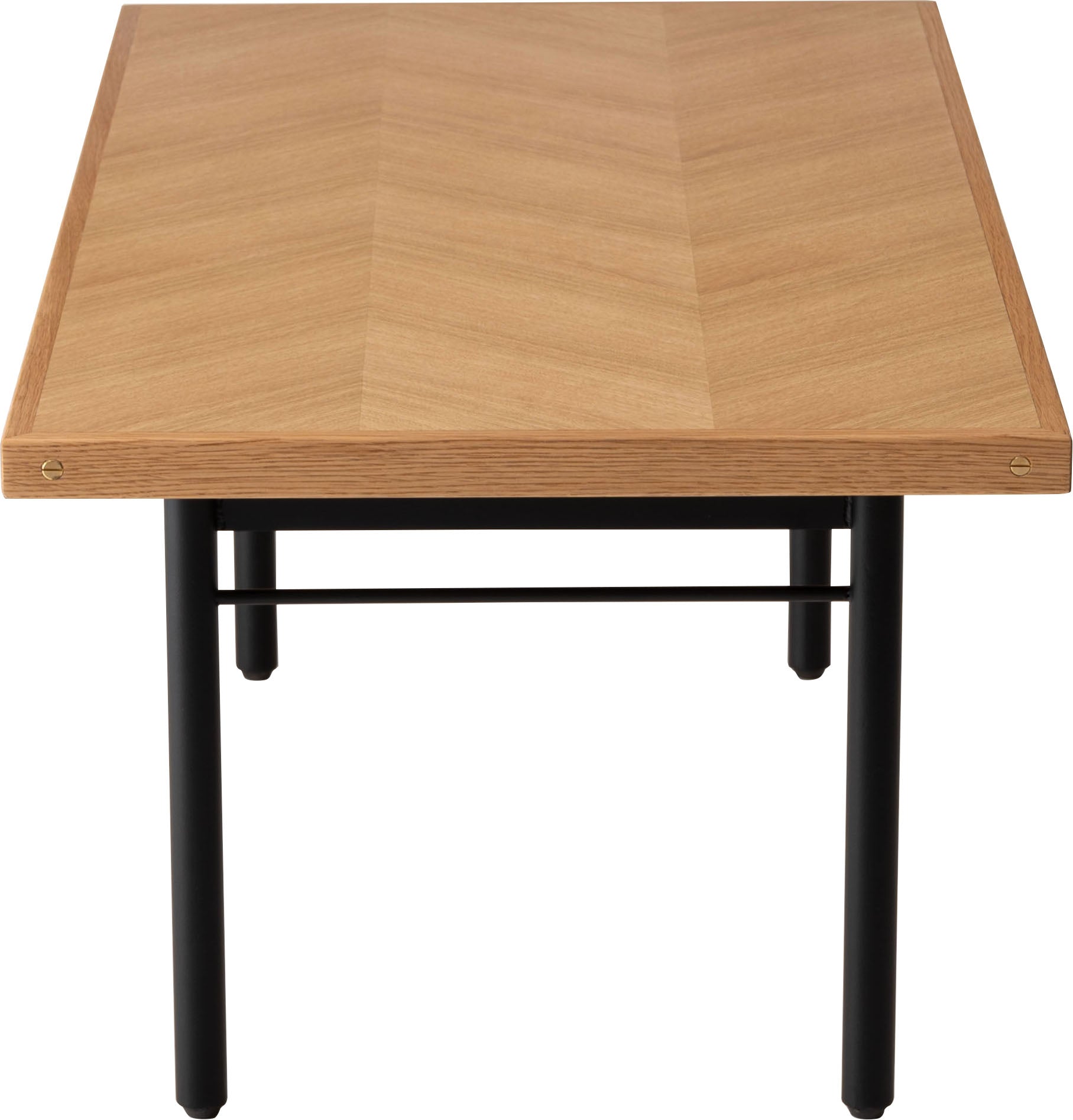木目の向きを変えて貼り合わせた矢張りデザインが特徴的で、側面に施した真鍮がアクセントになっているリビングテーブルです。シンプルなスチール脚にすることで、天板を引き立てます。さまざまなテイストに合わせやすいナチュラルとブラウンの2色展開です。