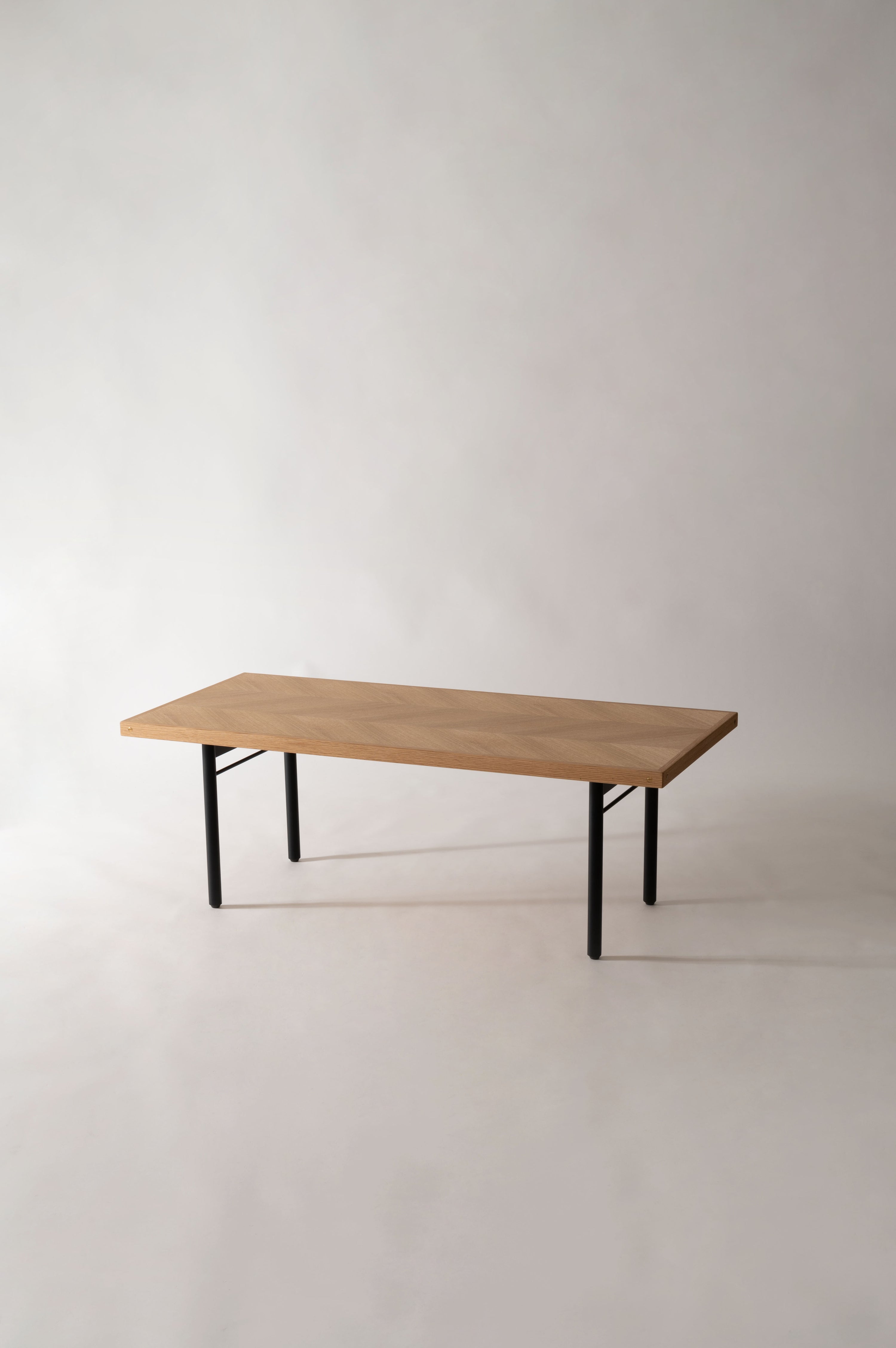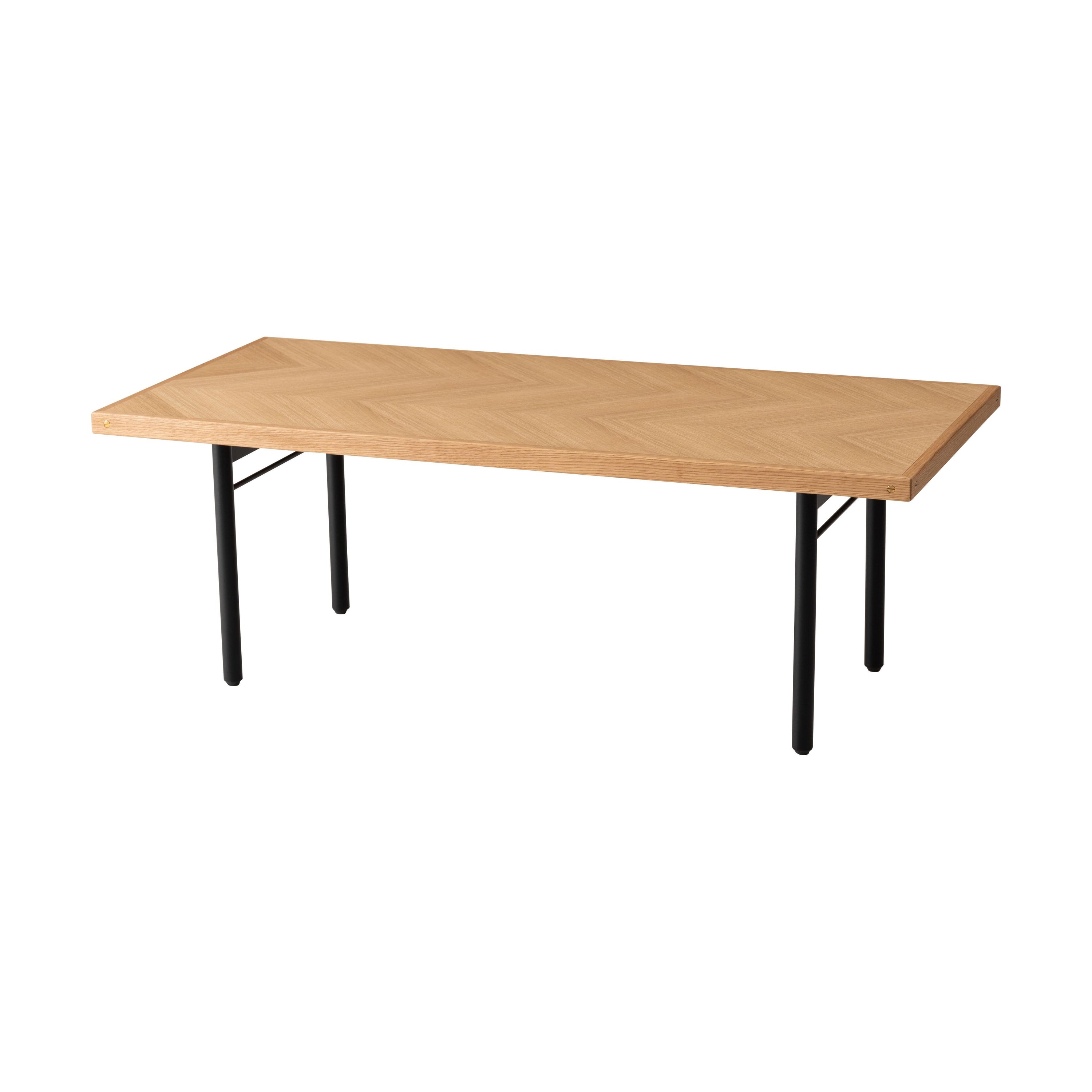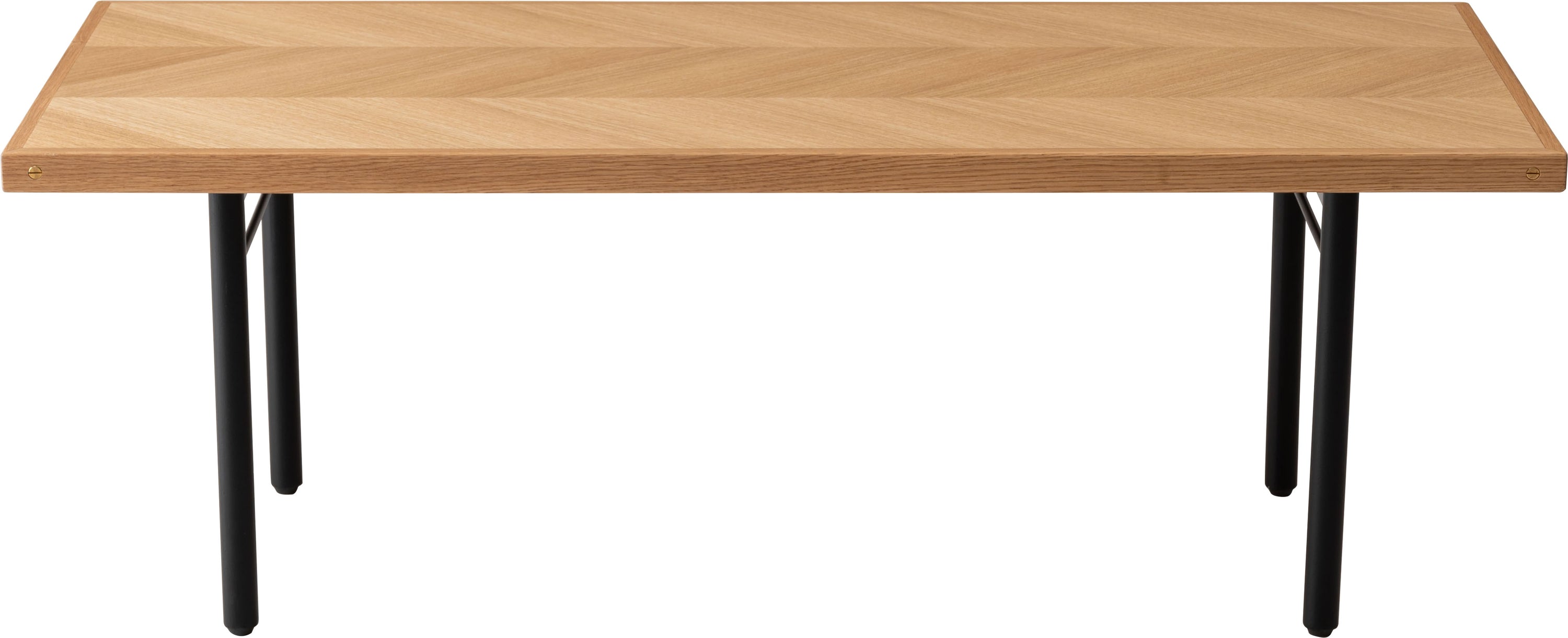 木目の向きを変えて貼り合わせた矢張りデザインが特徴的で、側面に施した真鍮がアクセントになっているリビングテーブルです。シンプルなスチール脚にすることで、天板を引き立てます。さまざまなテイストに合わせやすいナチュラルとブラウンの2色展開です。