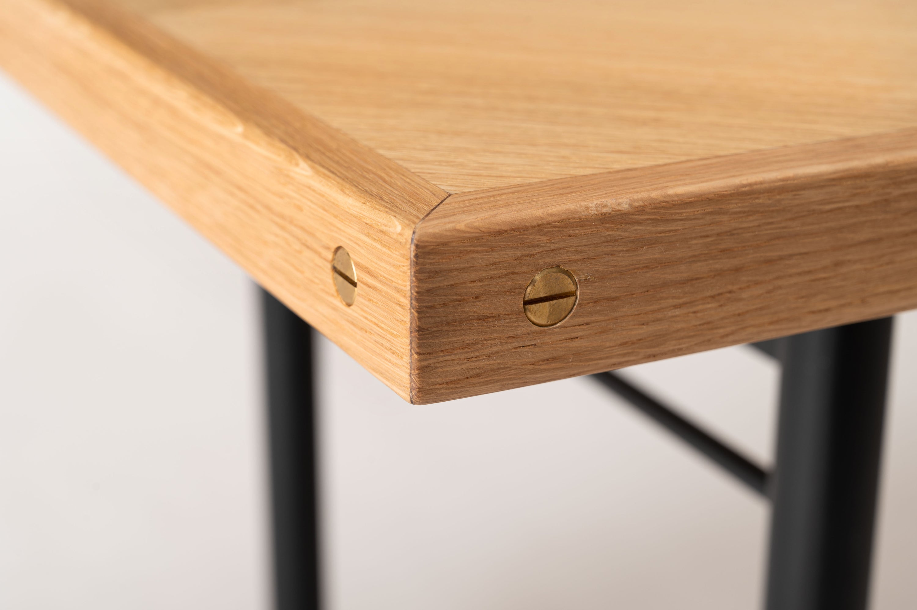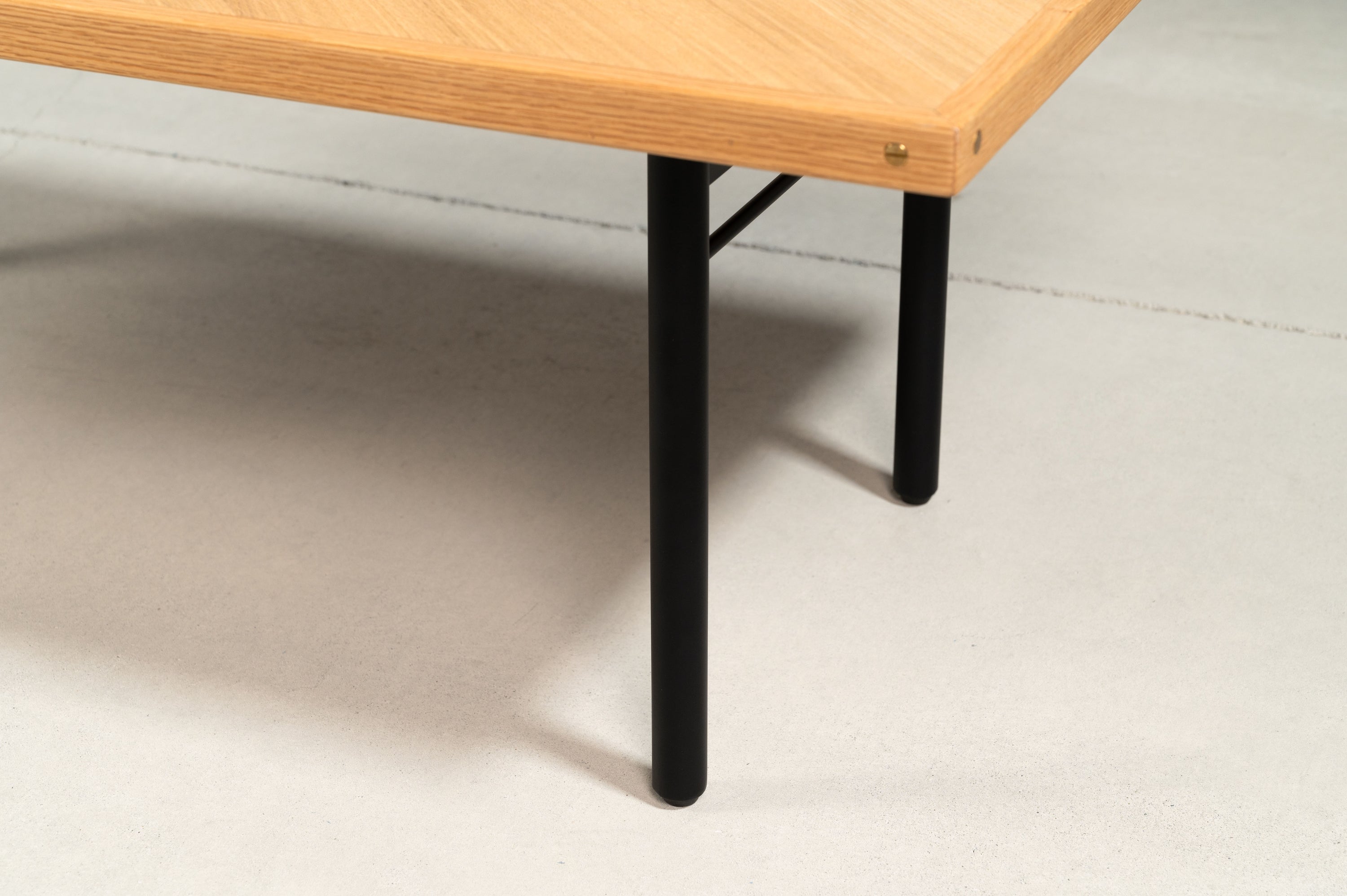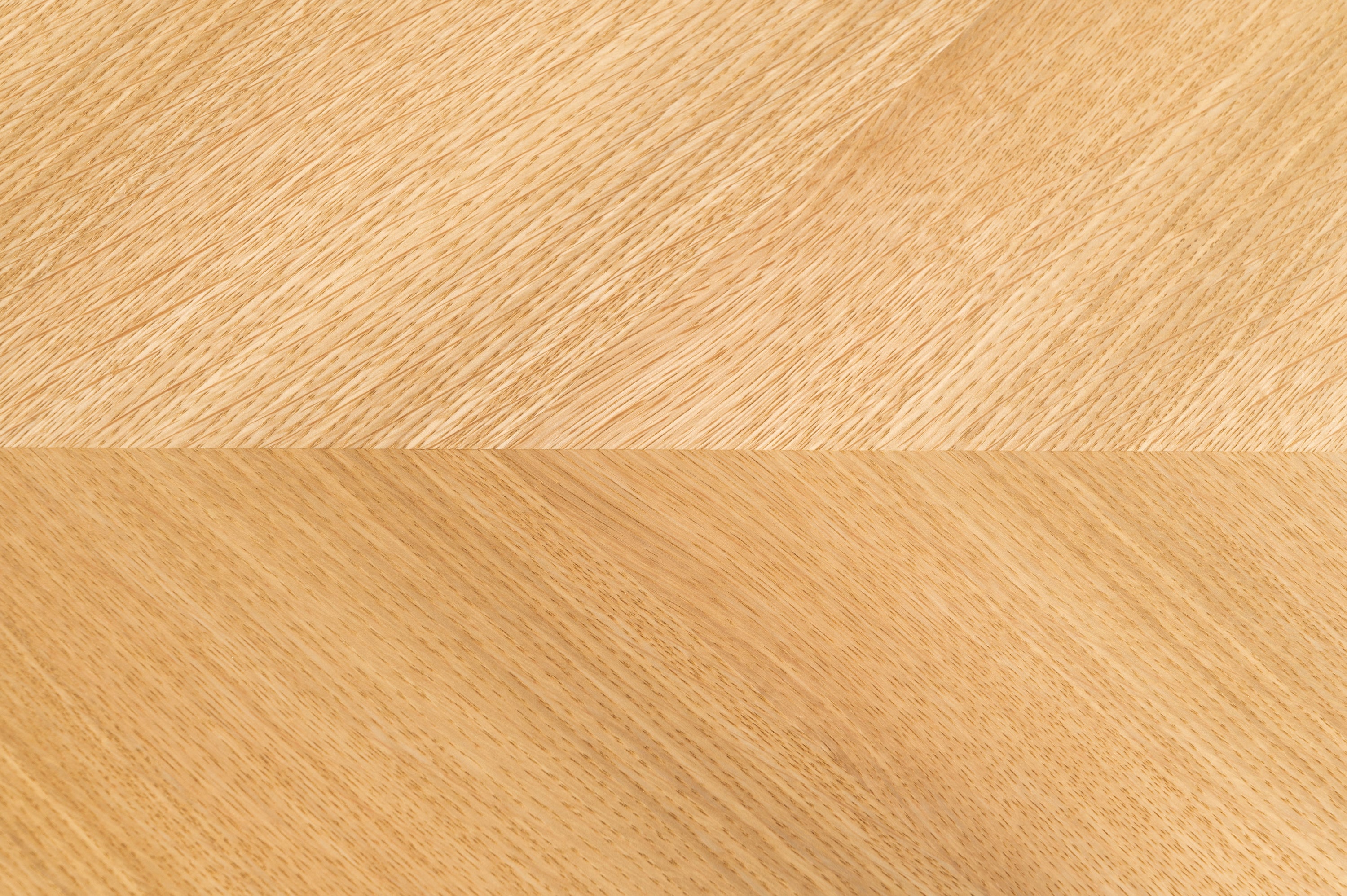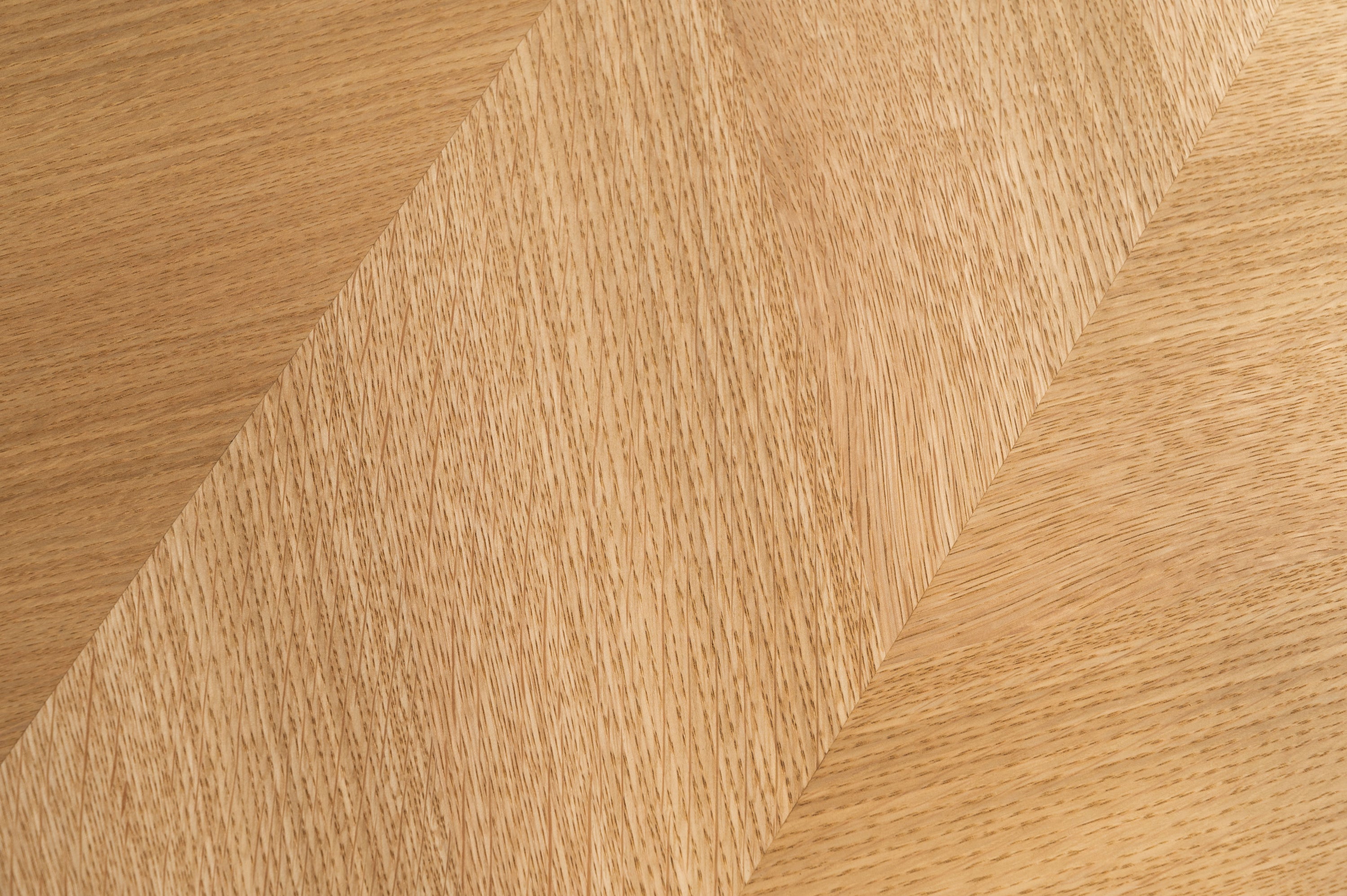 木目の向きを変えて貼り合わせた矢張りデザインが特徴的で、側面に施した真鍮がアクセントになっているリビングテーブルです。シンプルなスチール脚にすることで、天板を引き立てます。さまざまなテイストに合わせやすいナチュラルとブラウンの2色展開です。
