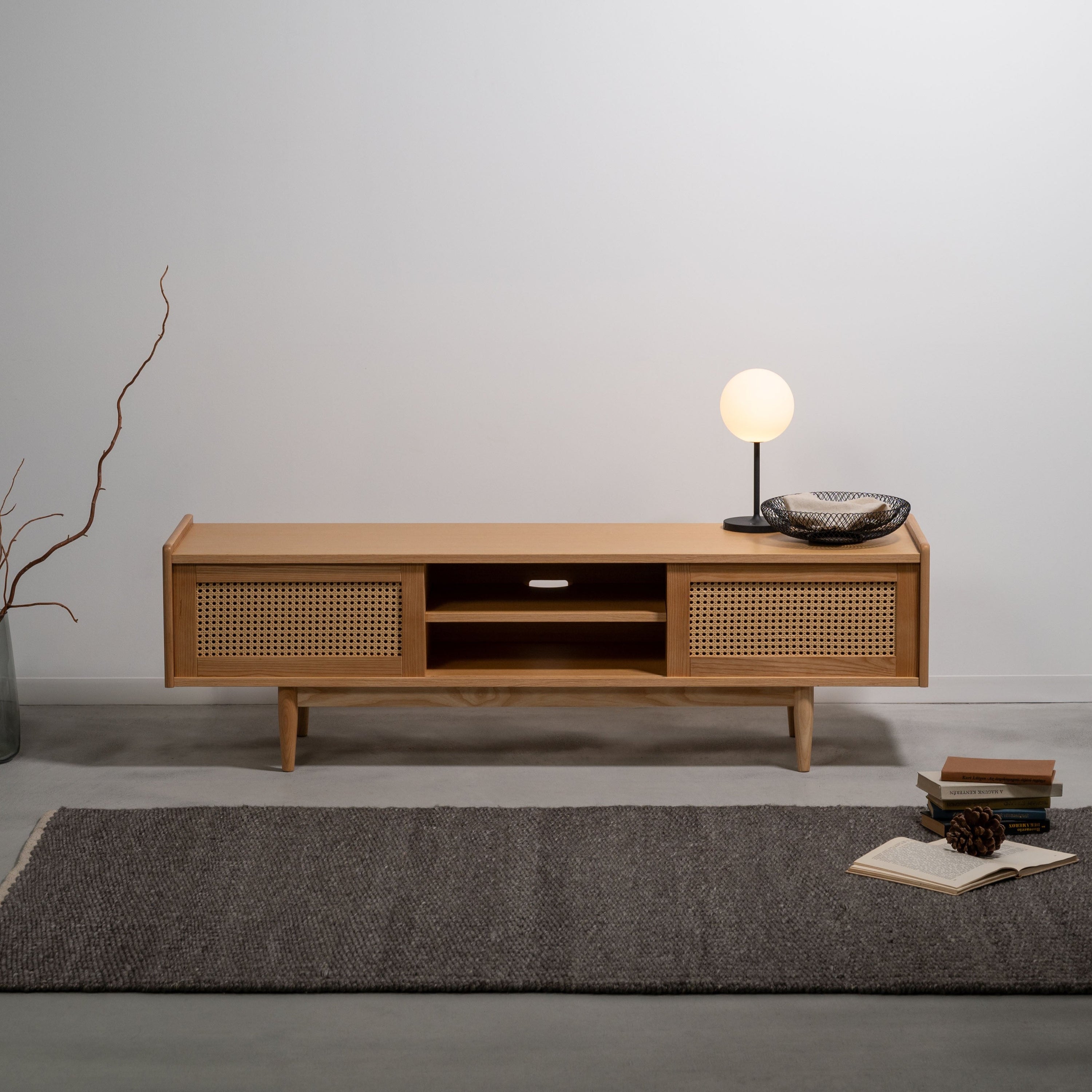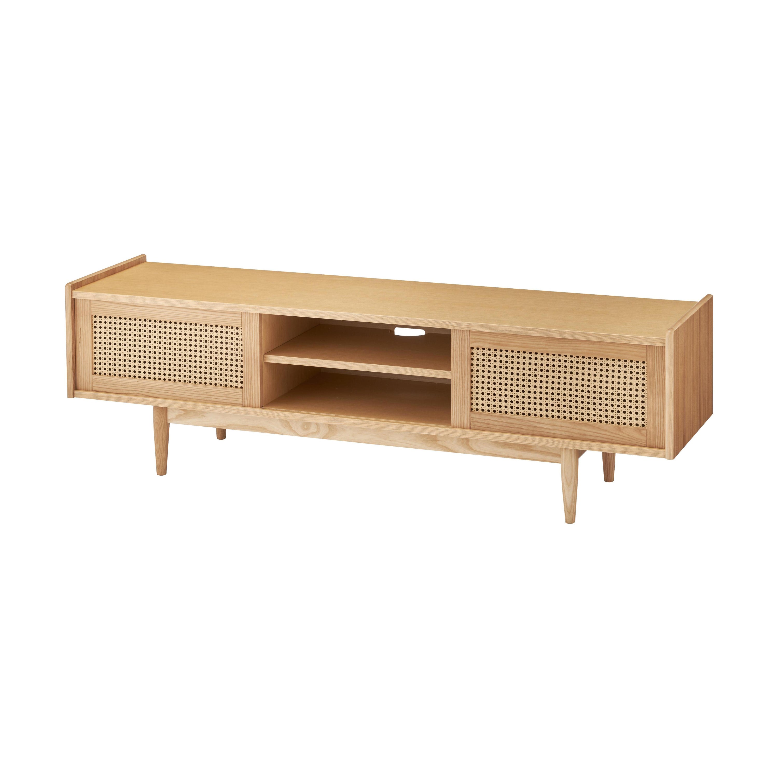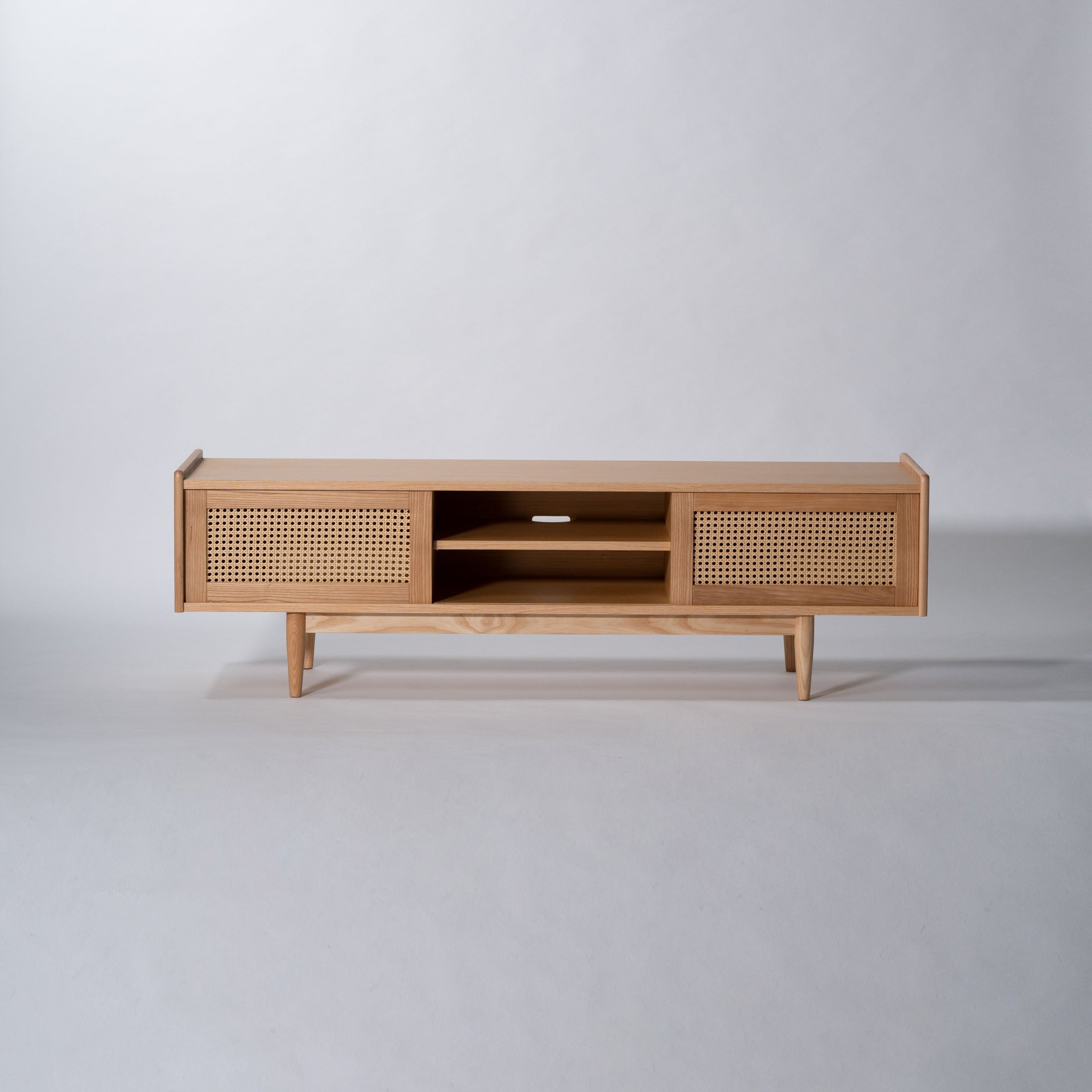 かごめ編みをアクセントに、シンプルでありながら目を引くフォルムに仕上げたローボードです。アッシュ材のカラーとマッチする人工ラタン素材をセレクトし、引き戸は木枠の段差を利用してスライド開閉させることで取っ手を無くしたました。雑貨やグリーンとの相性も良く、収納できるディスプレイボードとしてレイアウトも可能です。