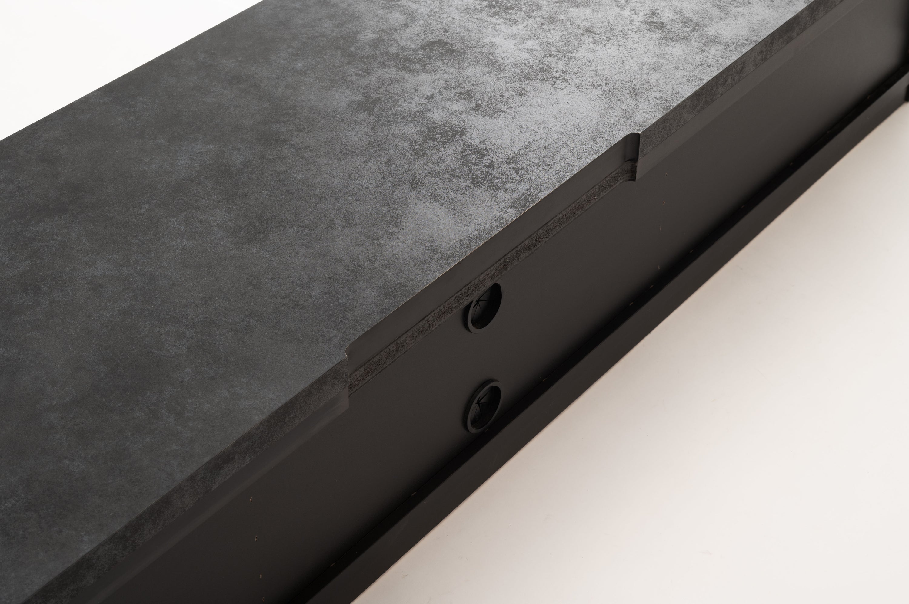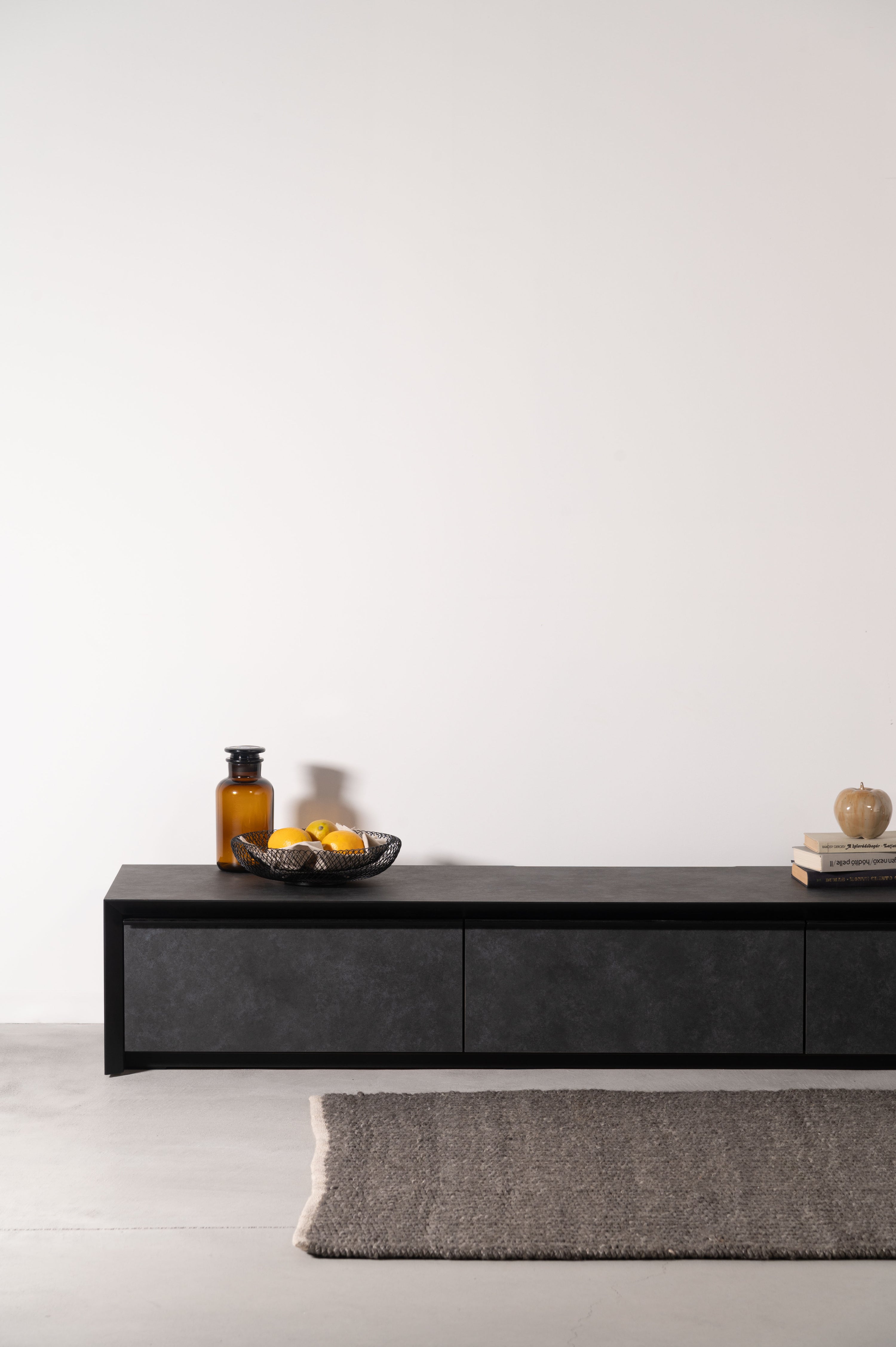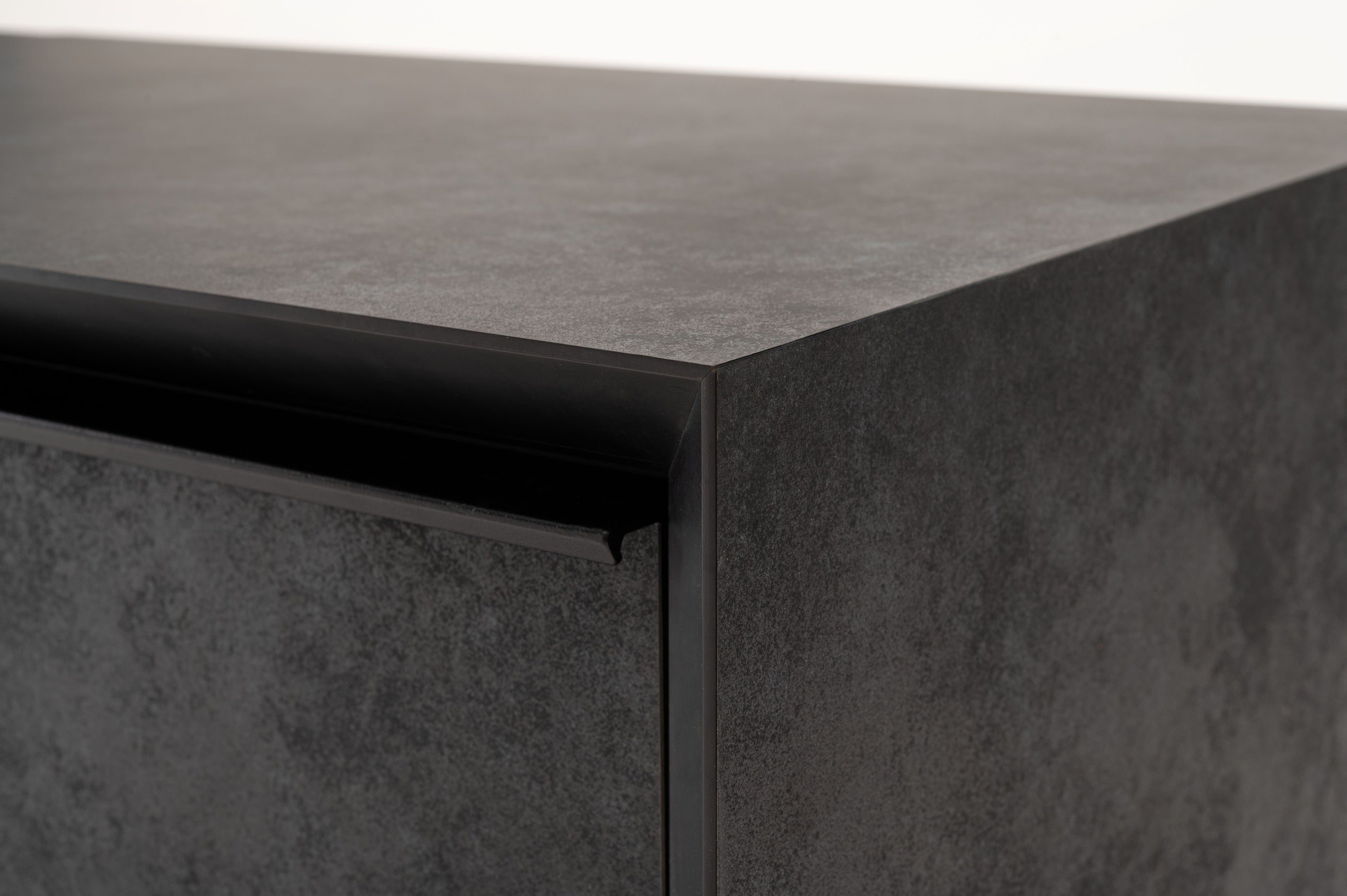 モルタル調の石目柄を施した高級感あふれるローボードです。前面に斜めのカット加工を施すことで陰影が生まれ、柄の見え方、表情に動きを与えます。引き出しとフラップ扉のとっても薄いプレートタイプにすることで、見える無駄をなくし洗練された重厚感のあるデザインに仕上がっています。