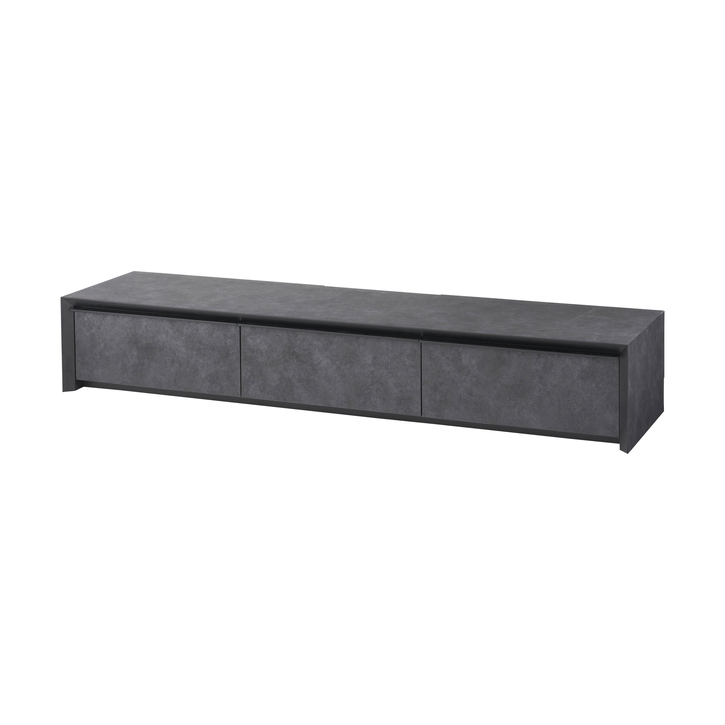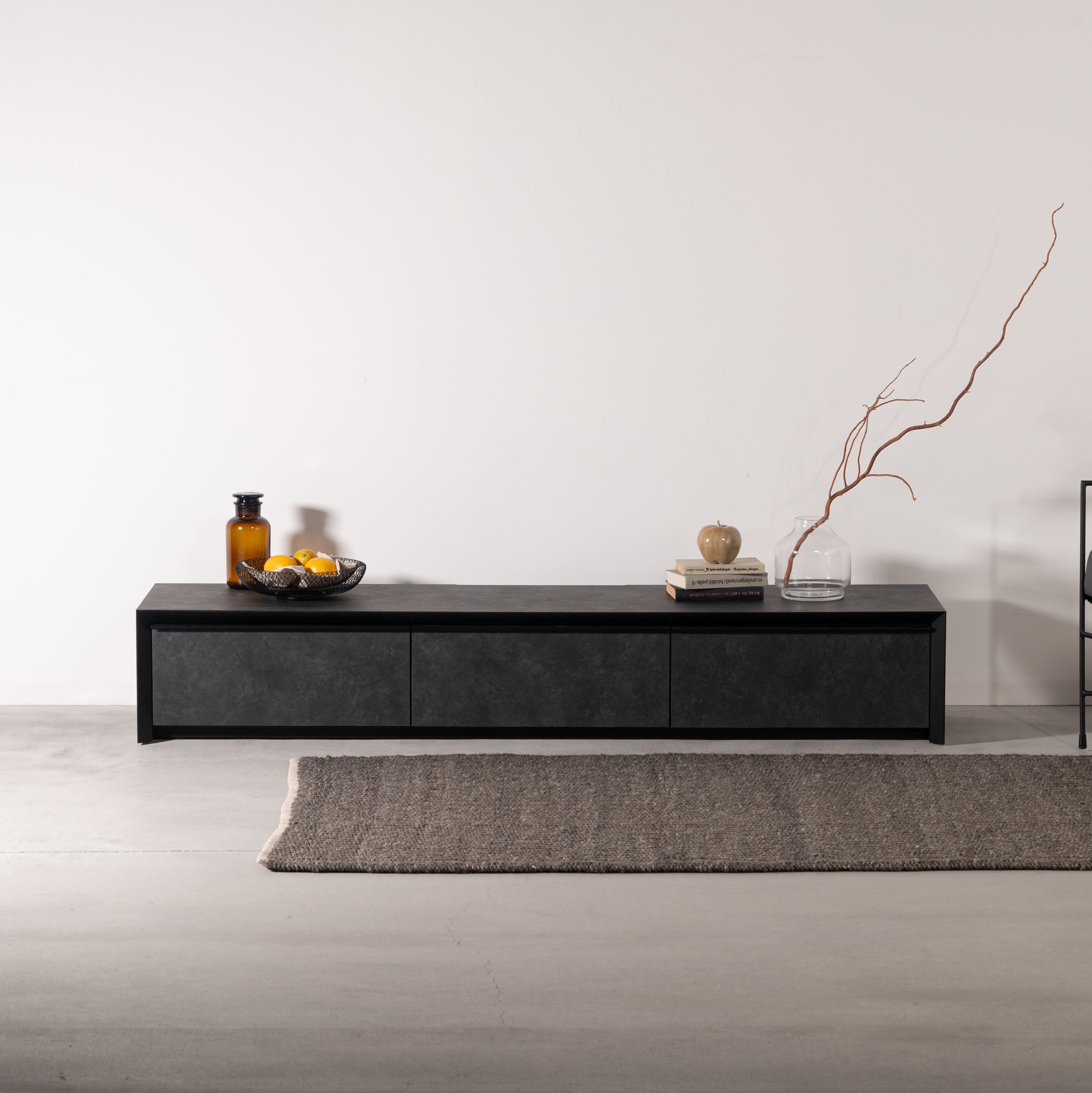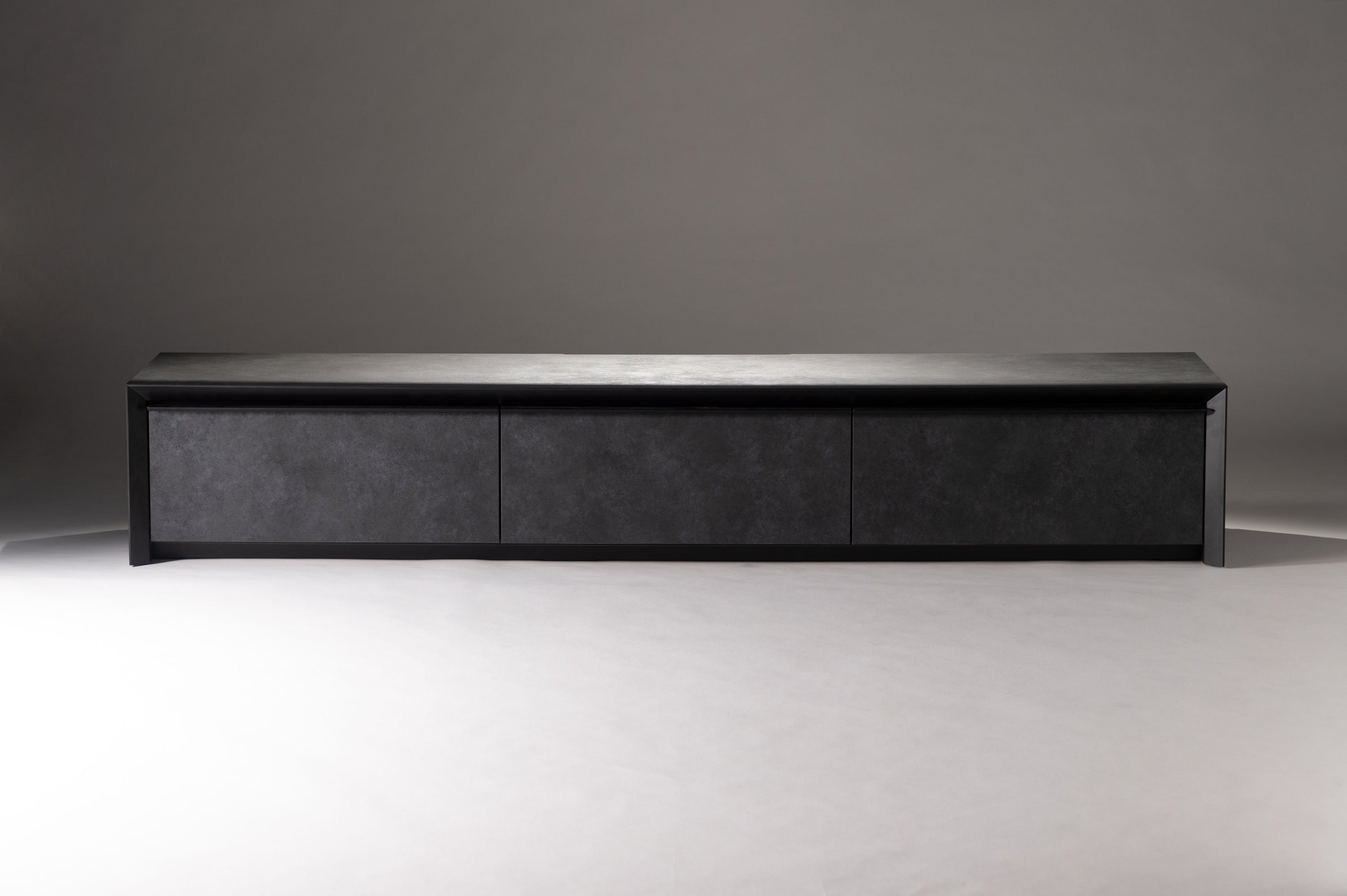 モルタル調の石目柄を施した高級感あふれるローボードです。前面に斜めのカット加工を施すことで陰影が生まれ、柄の見え方、表情に動きを与えます。引き出しとフラップ扉のとっても薄いプレートタイプにすることで、見える無駄をなくし洗練された重厚感のあるデザインに仕上がっています。