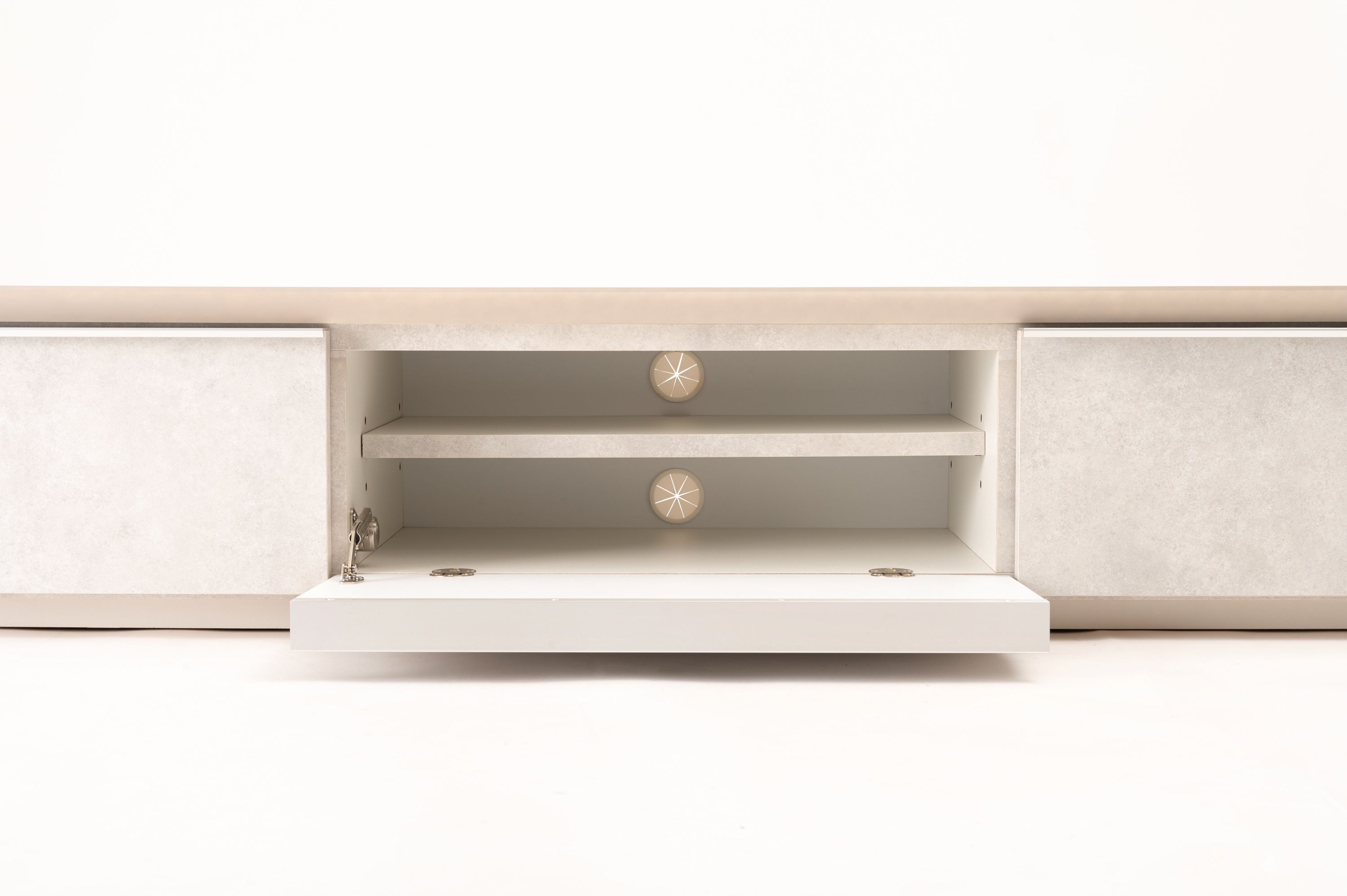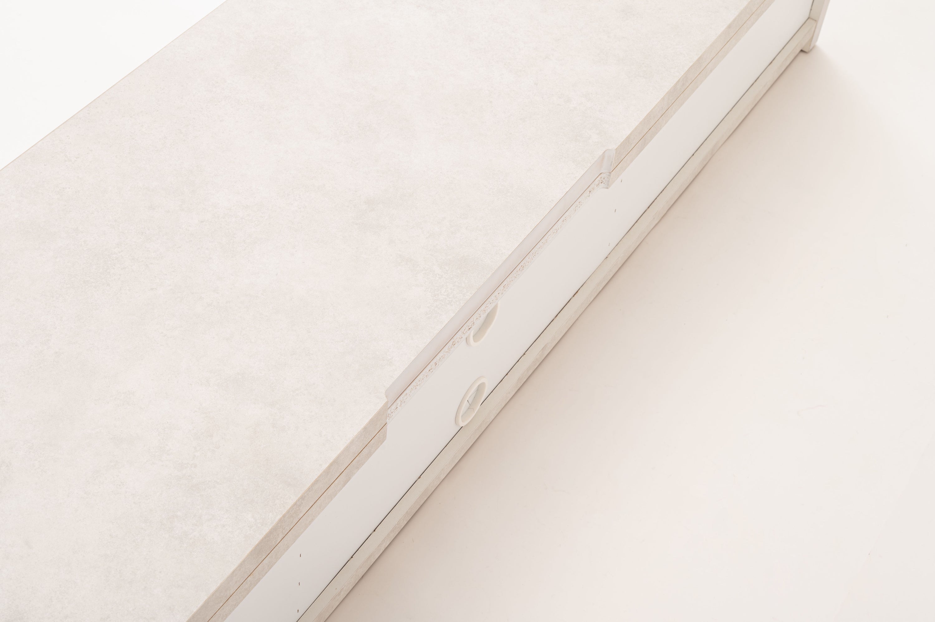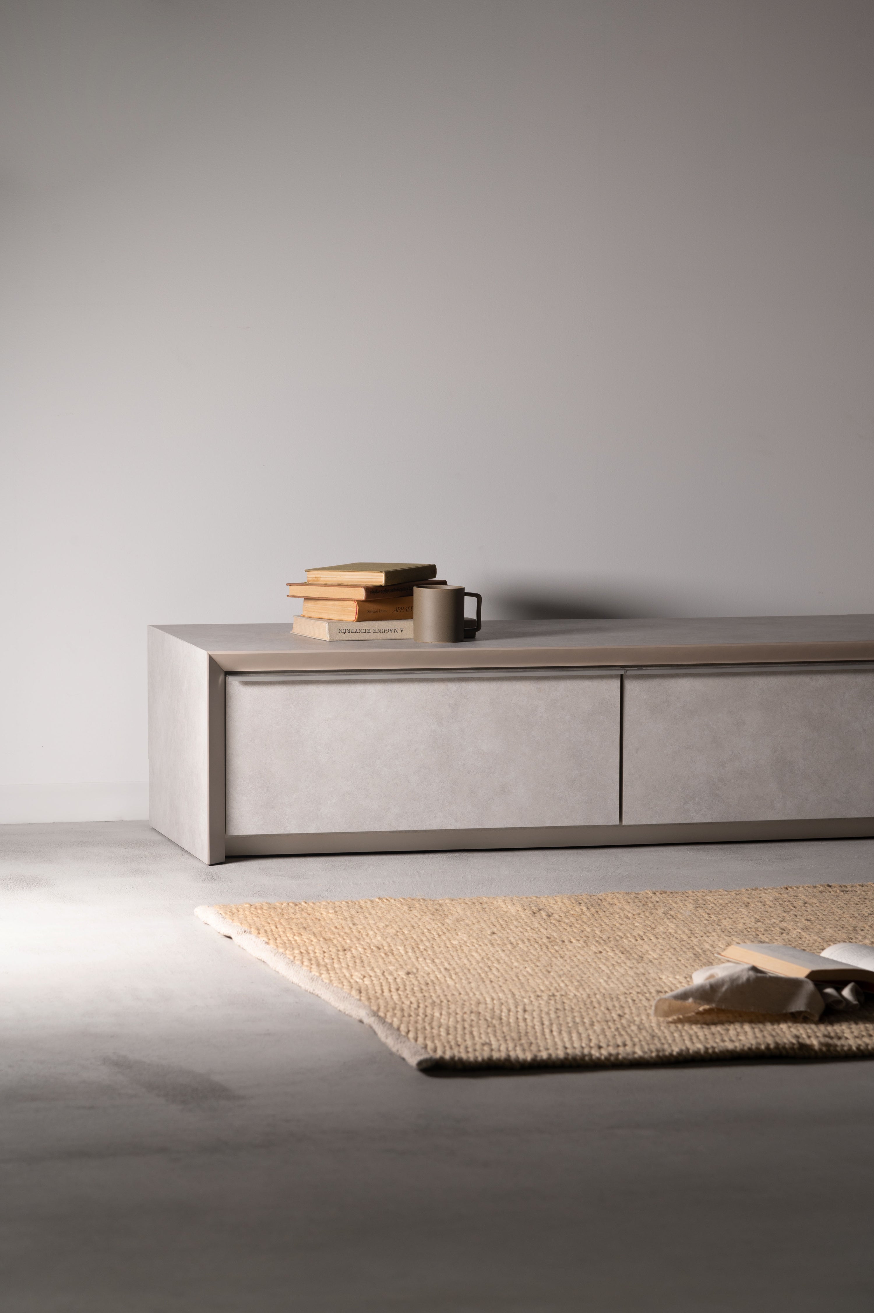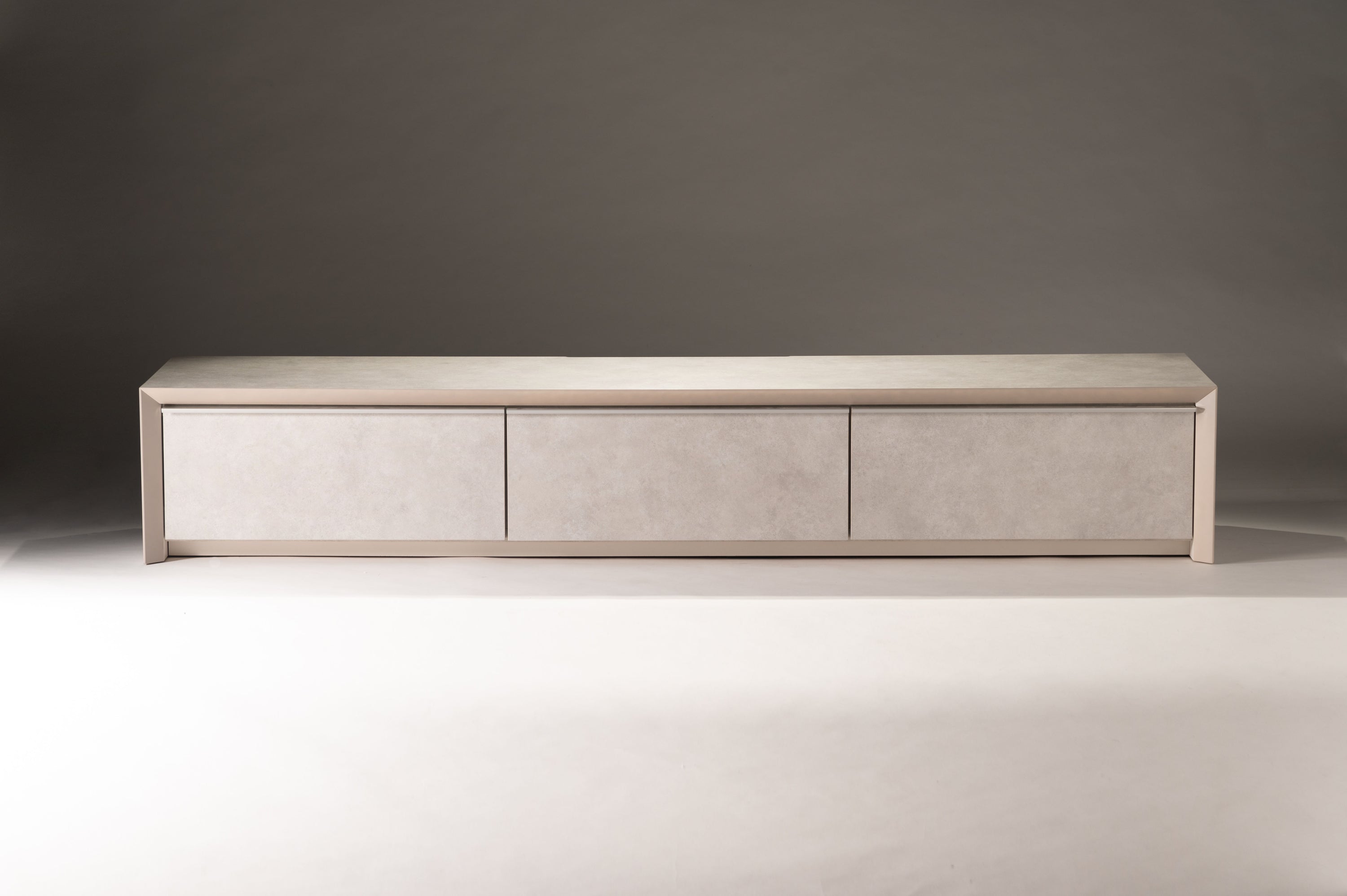 モルタル調の石目柄を施した高級感あふれるローボードです。前面に斜めのカット加工を施すことで陰影が生まれ、柄の見え方、表情に動きを与えます。引き出しとフラップ扉のとっても薄いプレートタイプにすることで、見える無駄をなくし洗練された重厚感のあるデザインに仕上がっています。