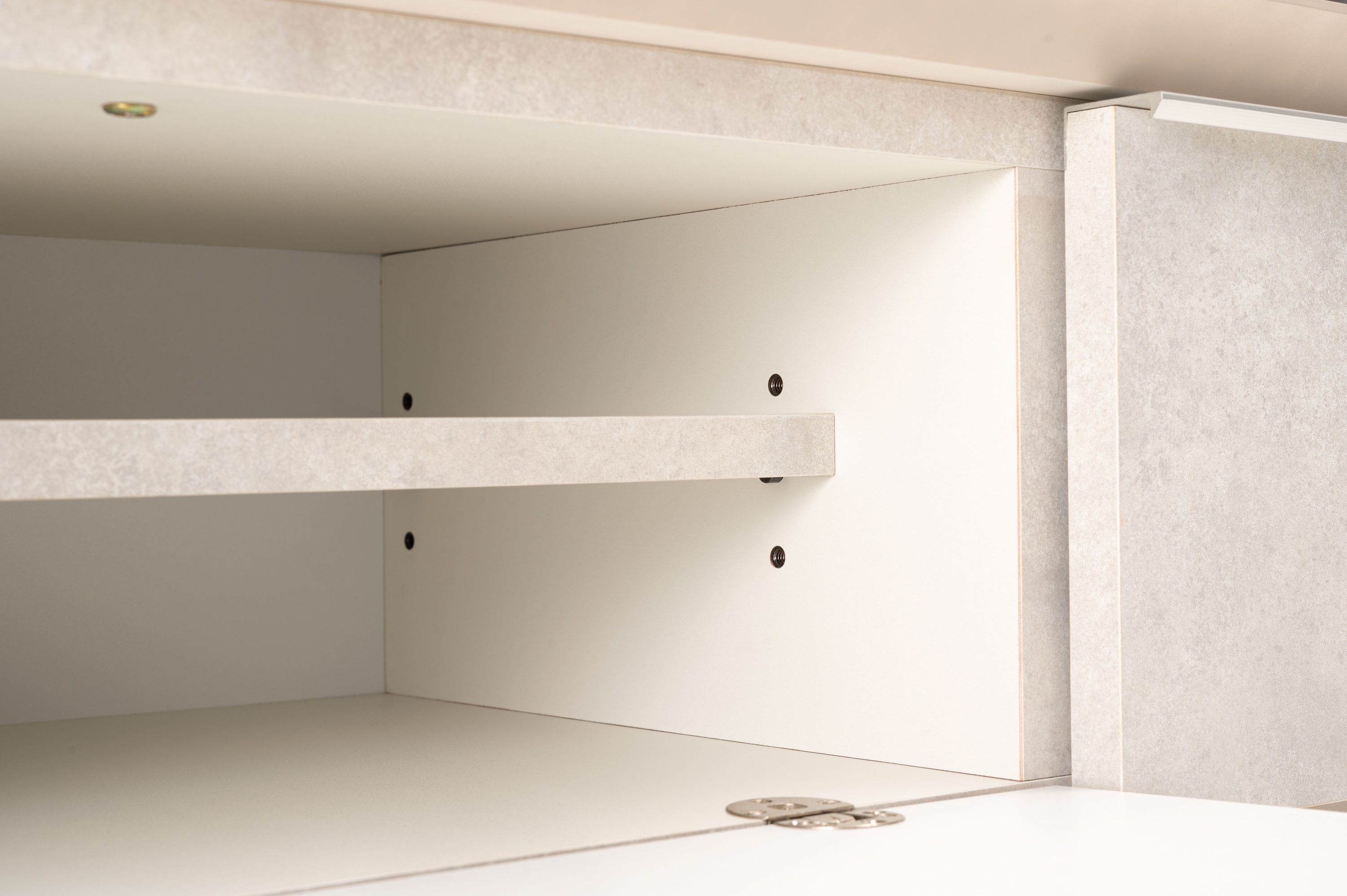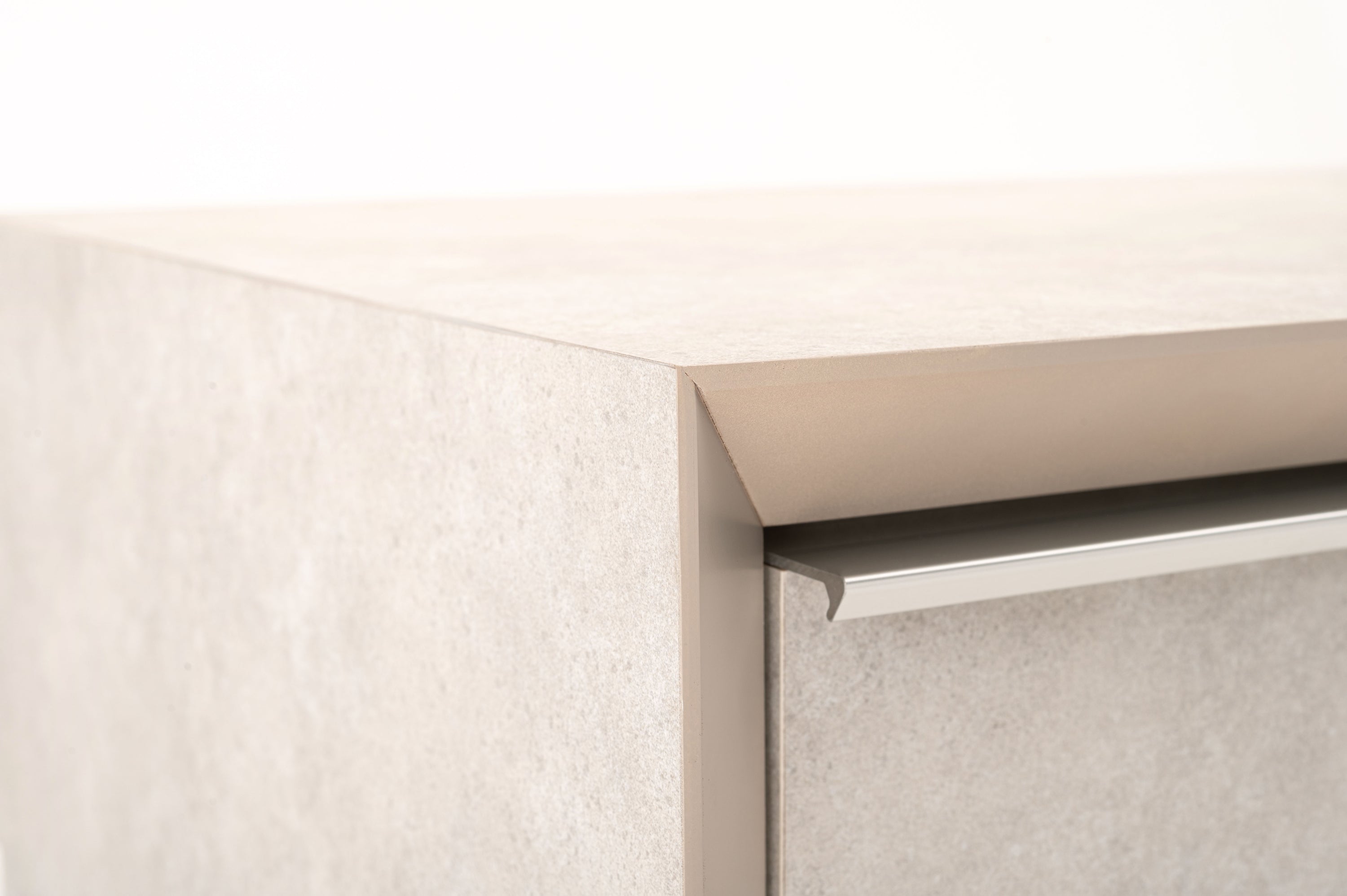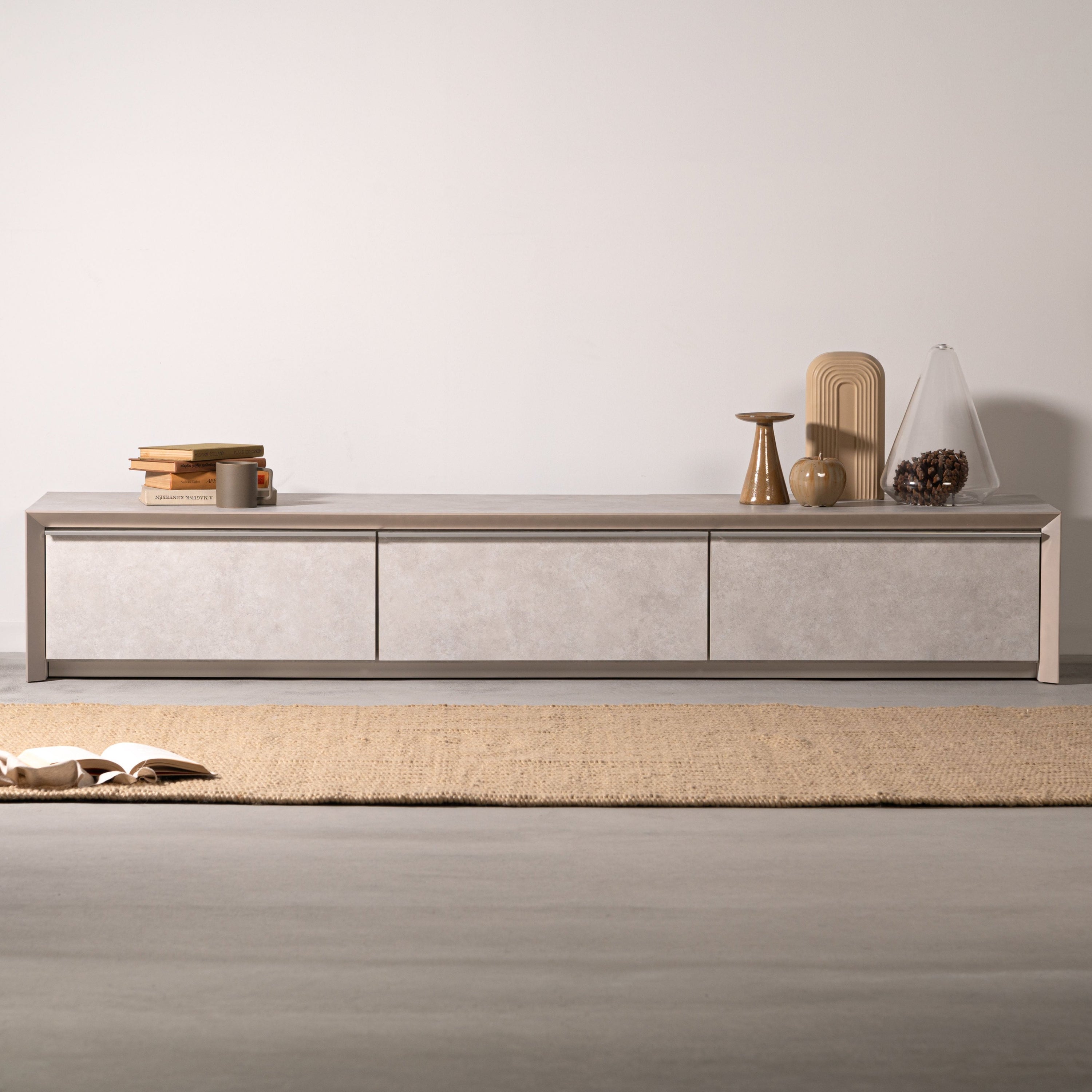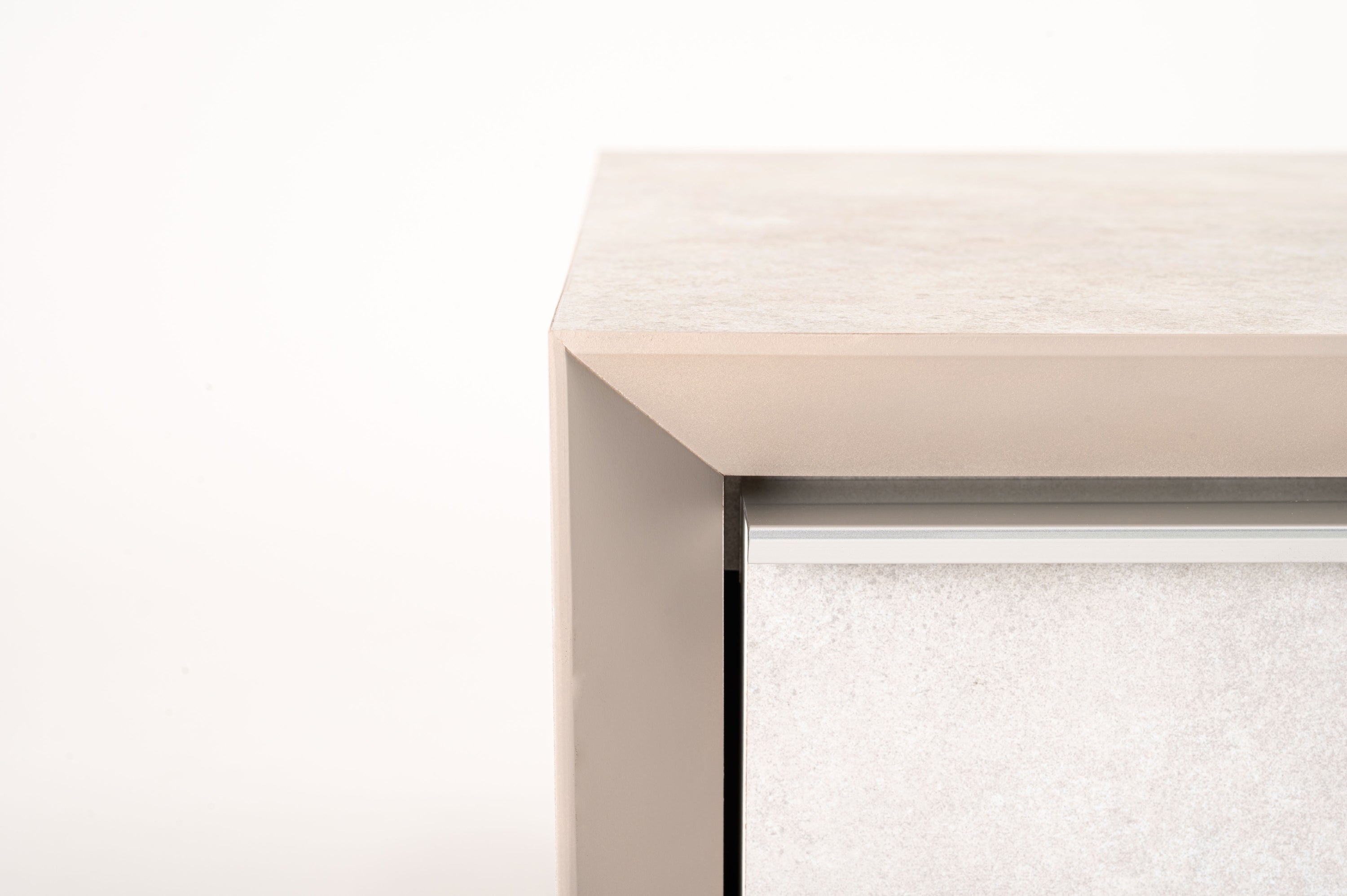モルタル調の石目柄を施した高級感あふれるローボードです。前面に斜めのカット加工を施すことで陰影が生まれ、柄の見え方、表情に動きを与えます。引き出しとフラップ扉のとっても薄いプレートタイプにすることで、見える無駄をなくし洗練された重厚感のあるデザインに仕上がっています。