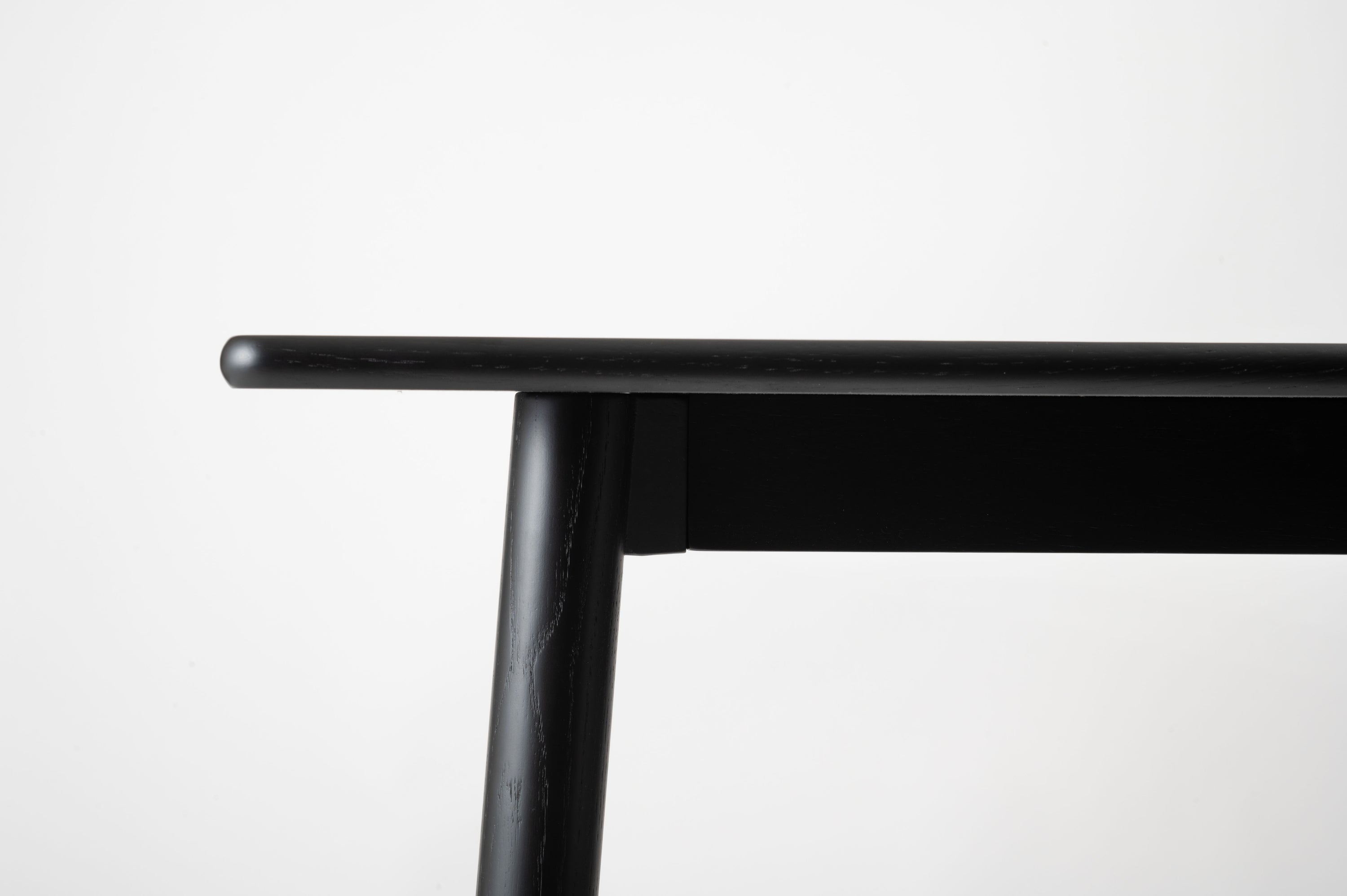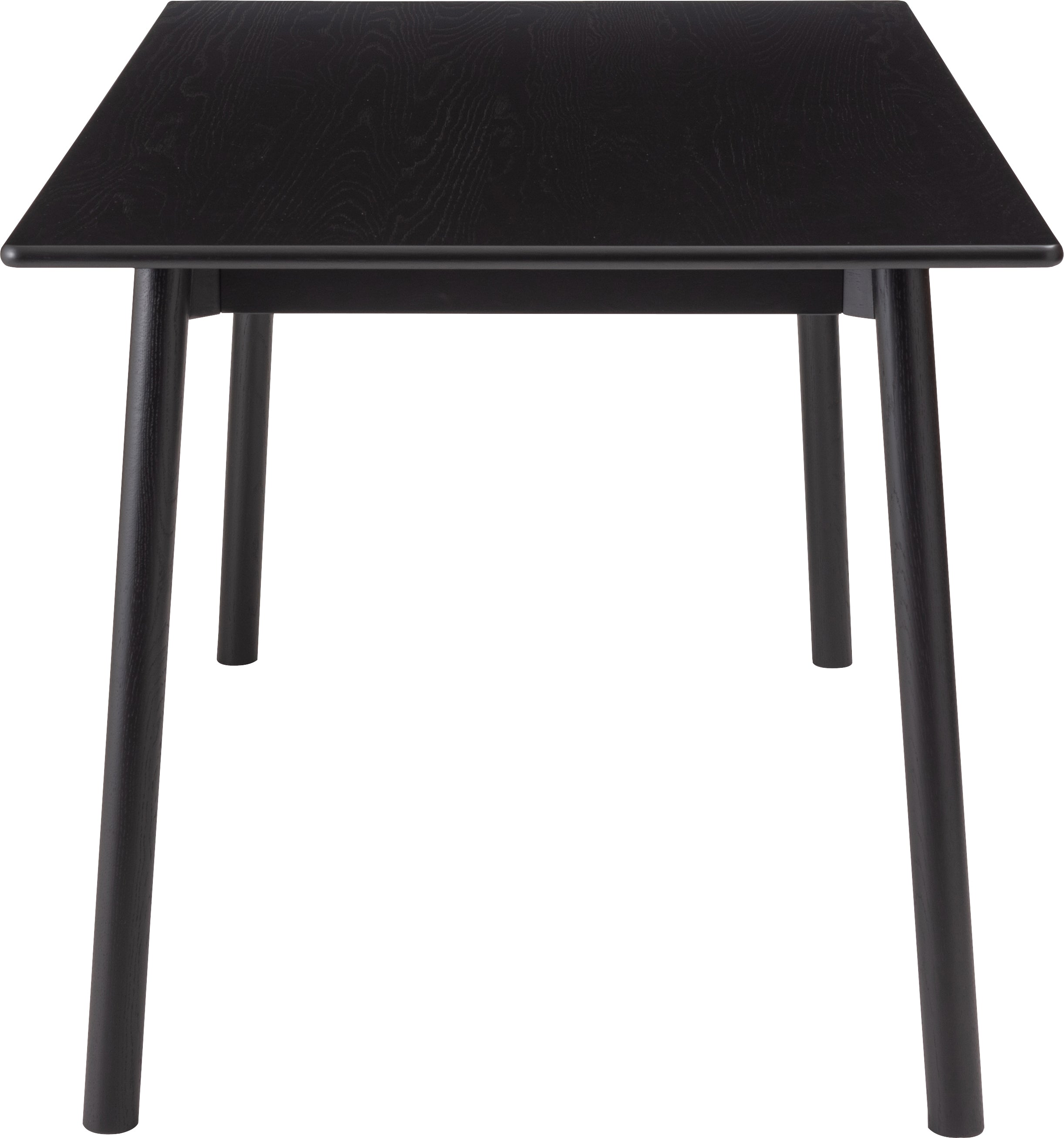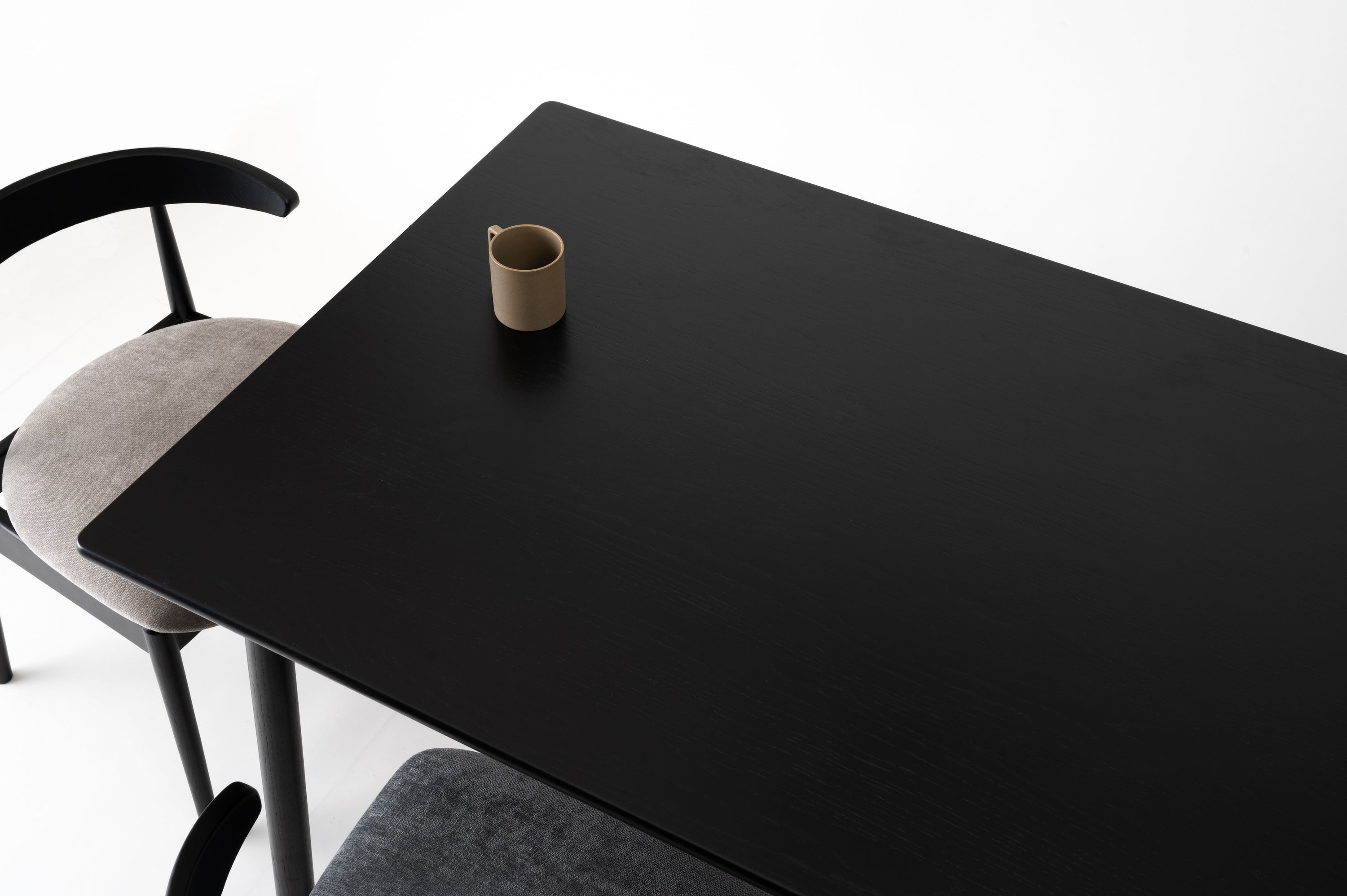 全体的に角をなくし、丸みを帯びたフォルムのダイニングテーブルです。幕板を少し内側に設置し、脚を外側に出すことで、すっきりとした印象と脚間を広く確保できるデザインになっています。少し角をつけて八の字に設計された脚は、垂直脚と比べ、ぐらつきを抑え安定した使い心地を実感することができます。